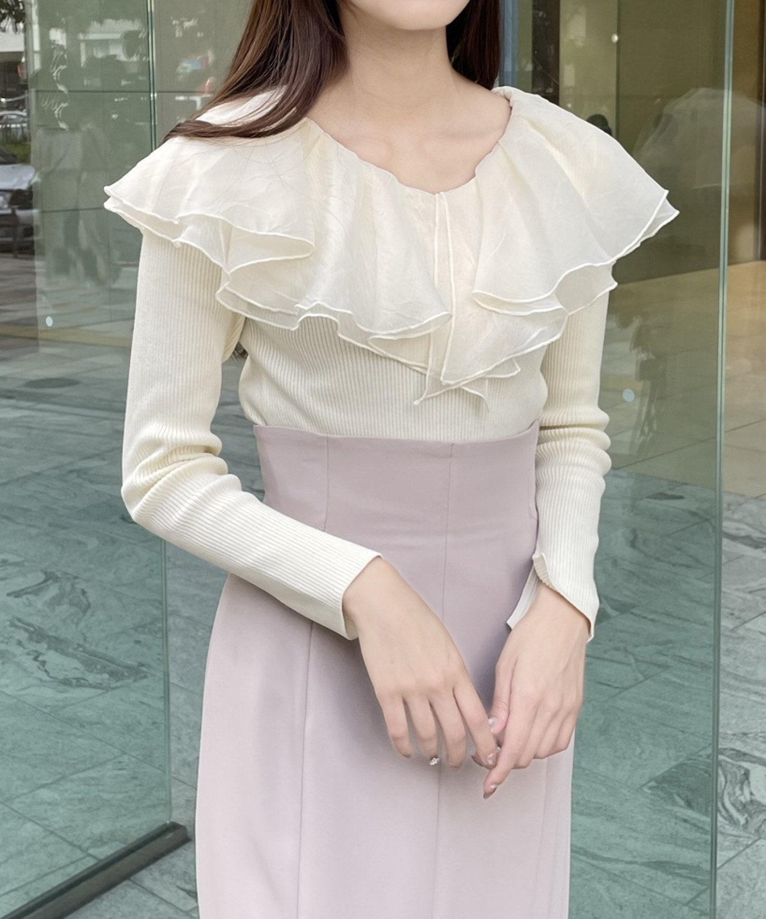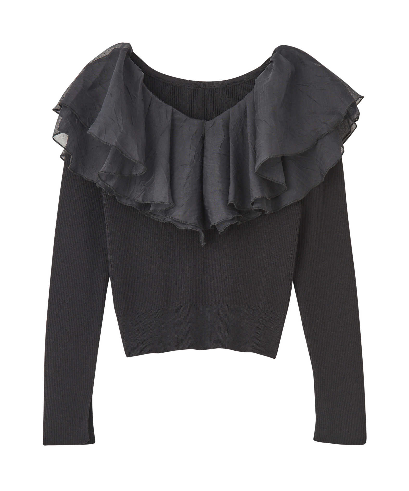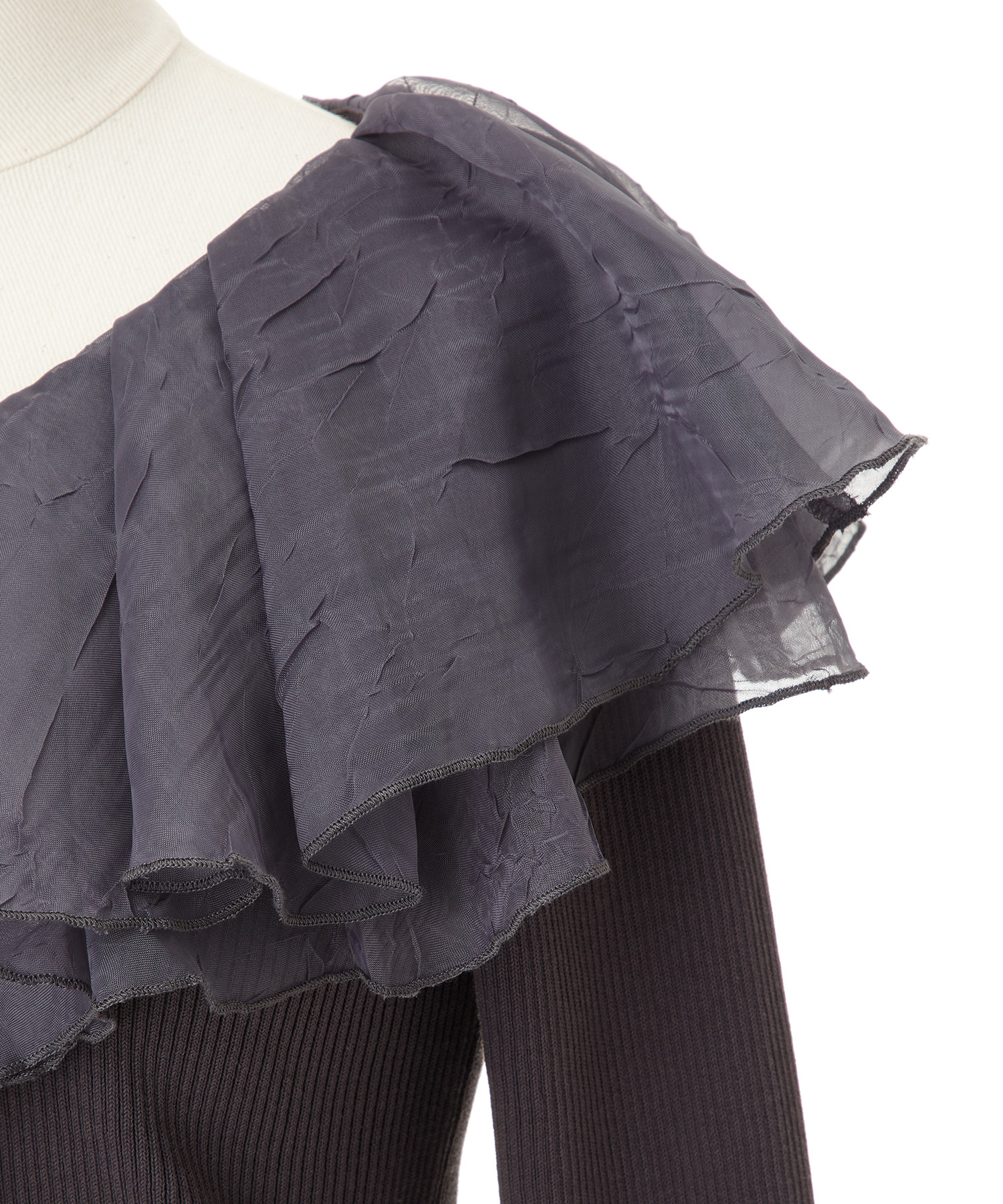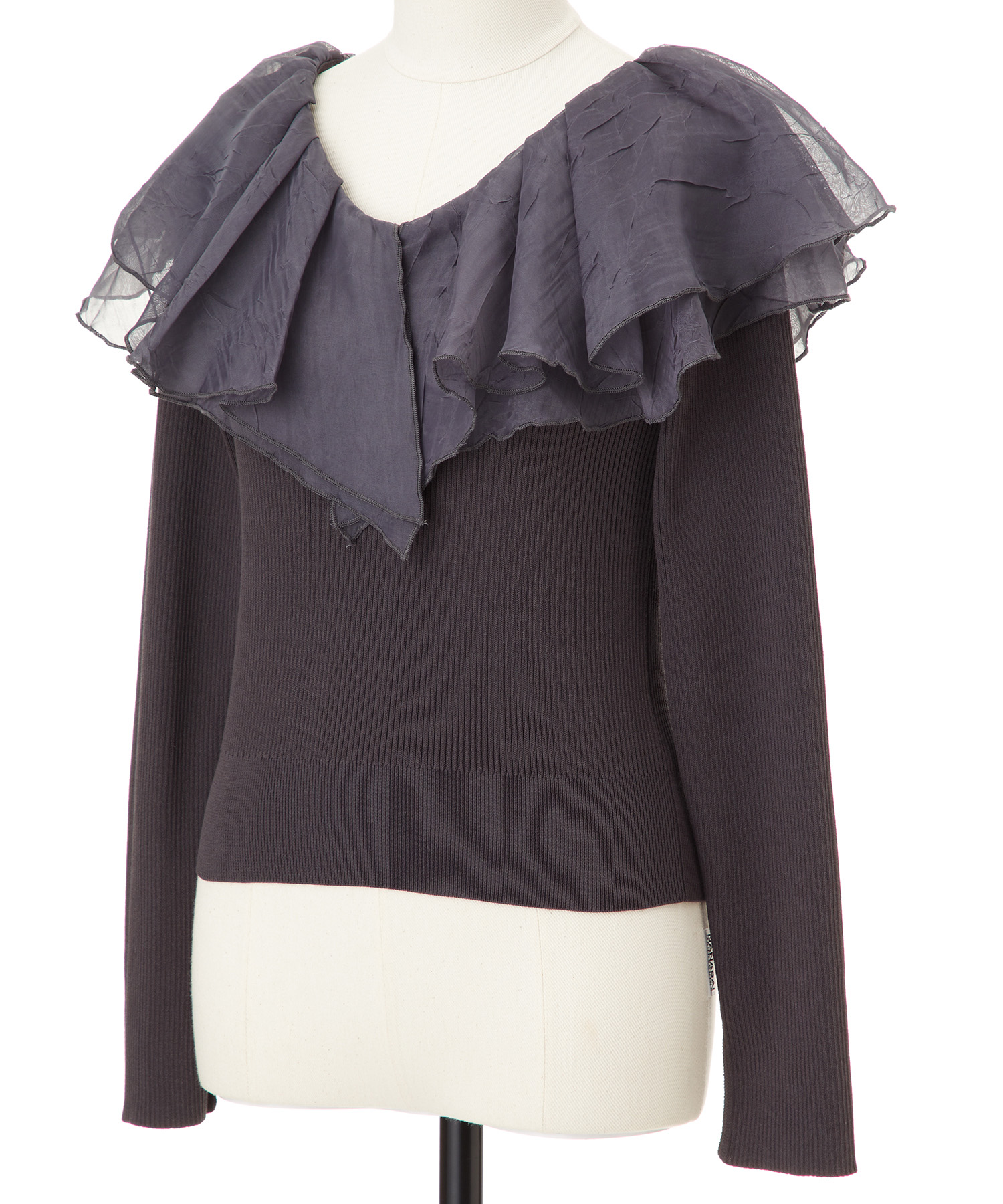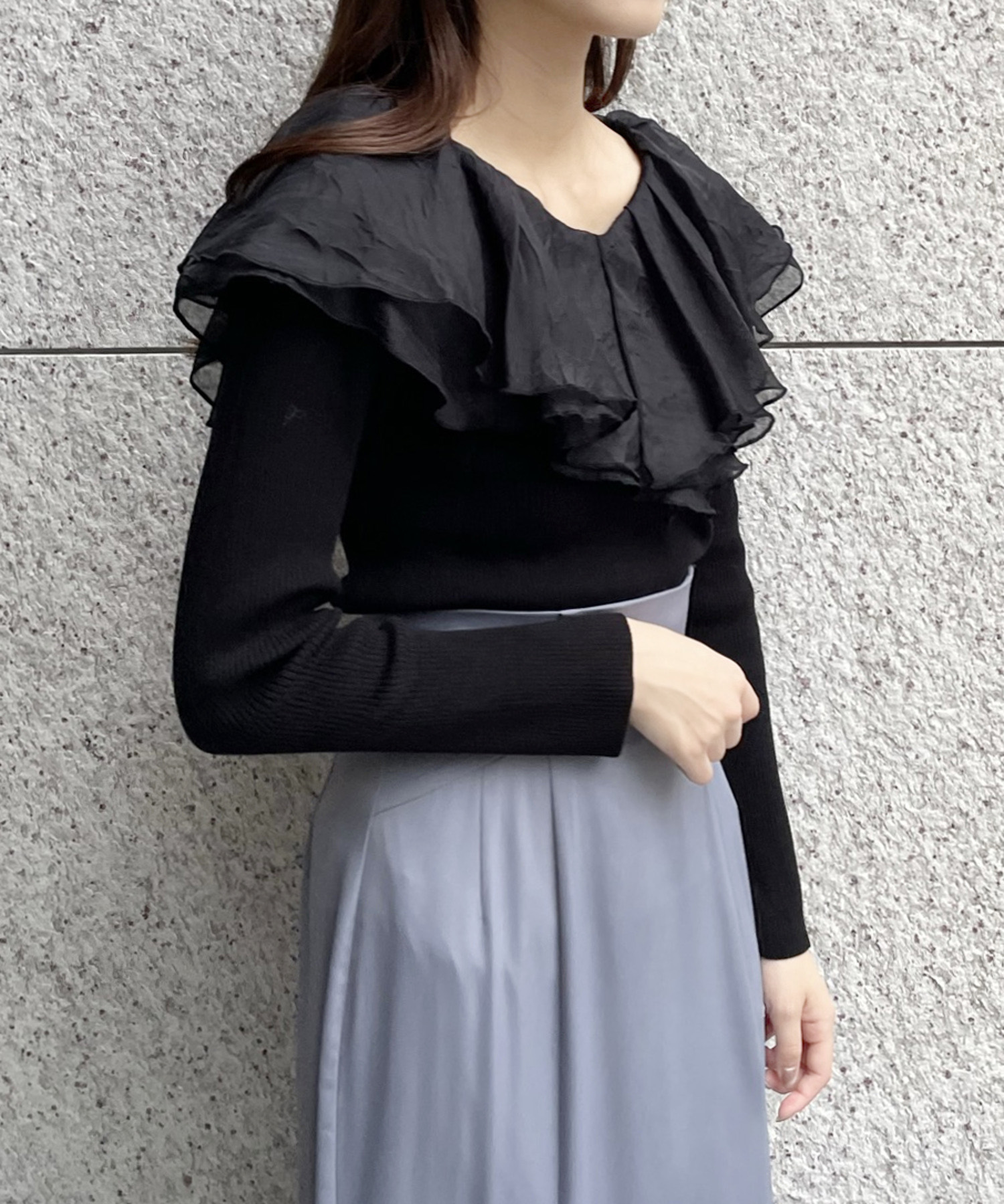 シアー感のある布帛フリルをドッキングしているブラウスライクなニットトップスです。オーガンジーのフリルを2層重ねてふんわりと動きのある衿に仕上げています。ニットは柔らかいリブ編みでフィット感がちょうど良く、ボディラインを細く見せるデザインになっています。短め丈でハイウエストボトムにタックインしてもすっきり着こなせます。 サイズ 総丈 肩幅 身幅 袖丈 48 32 35 38
