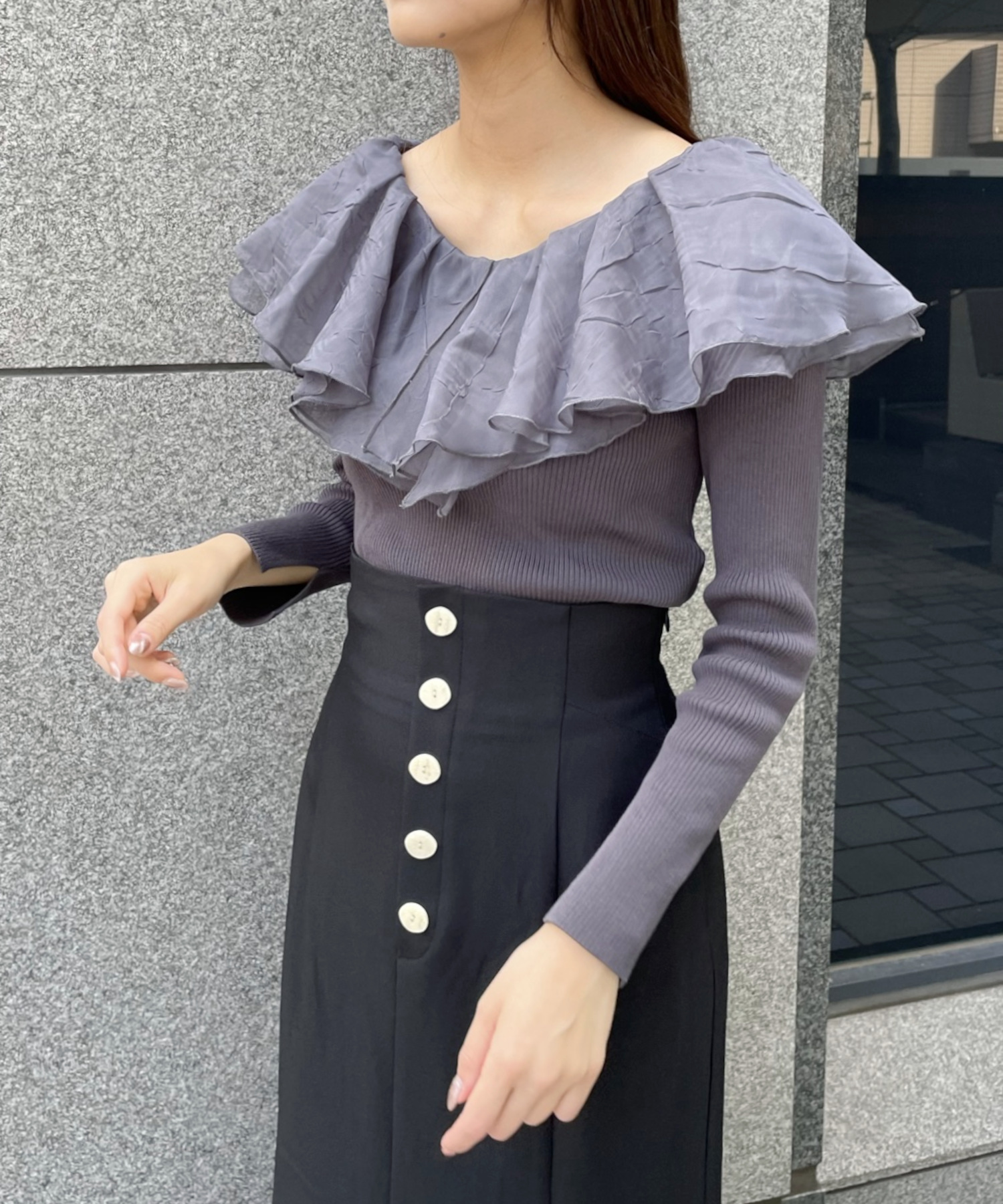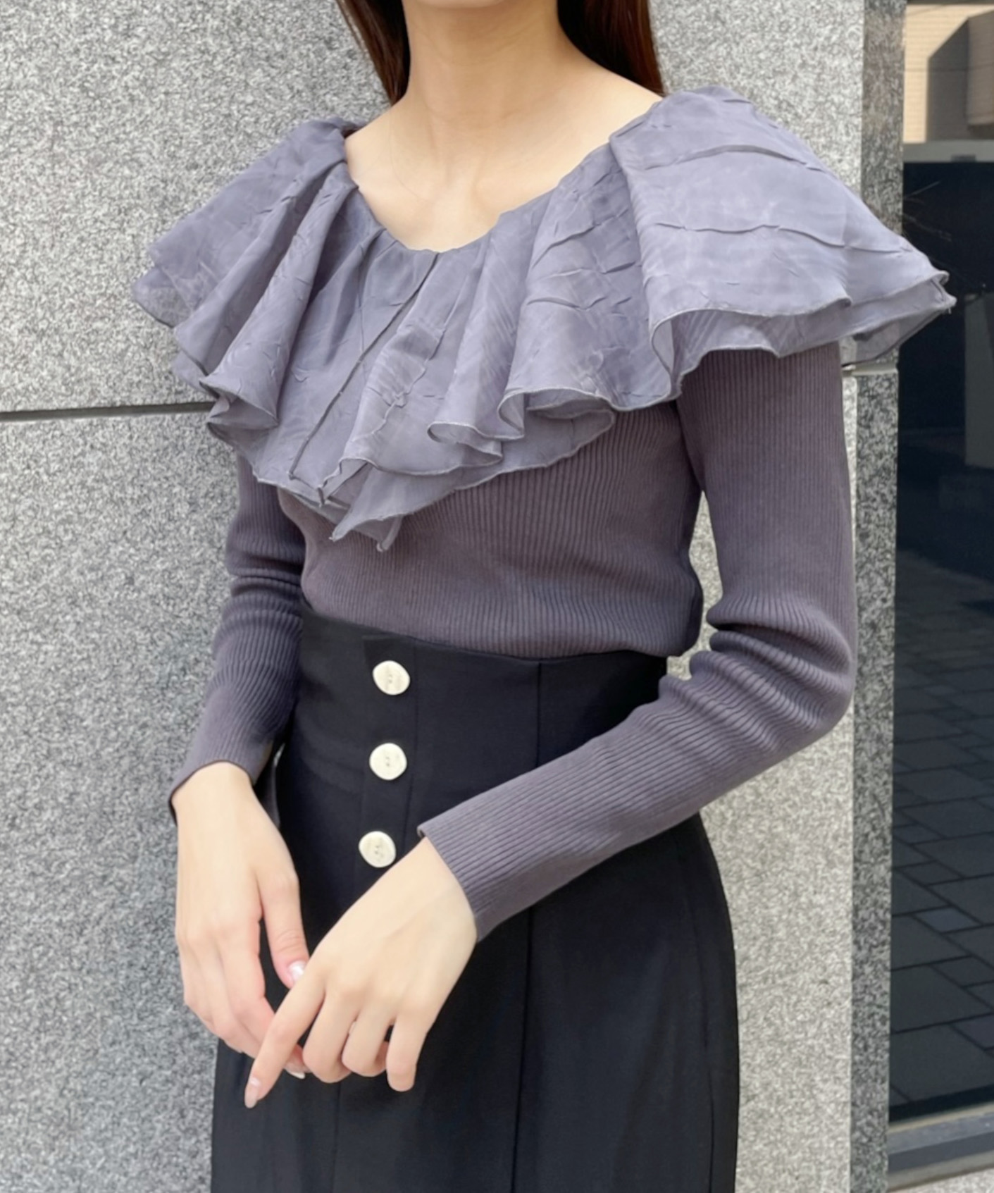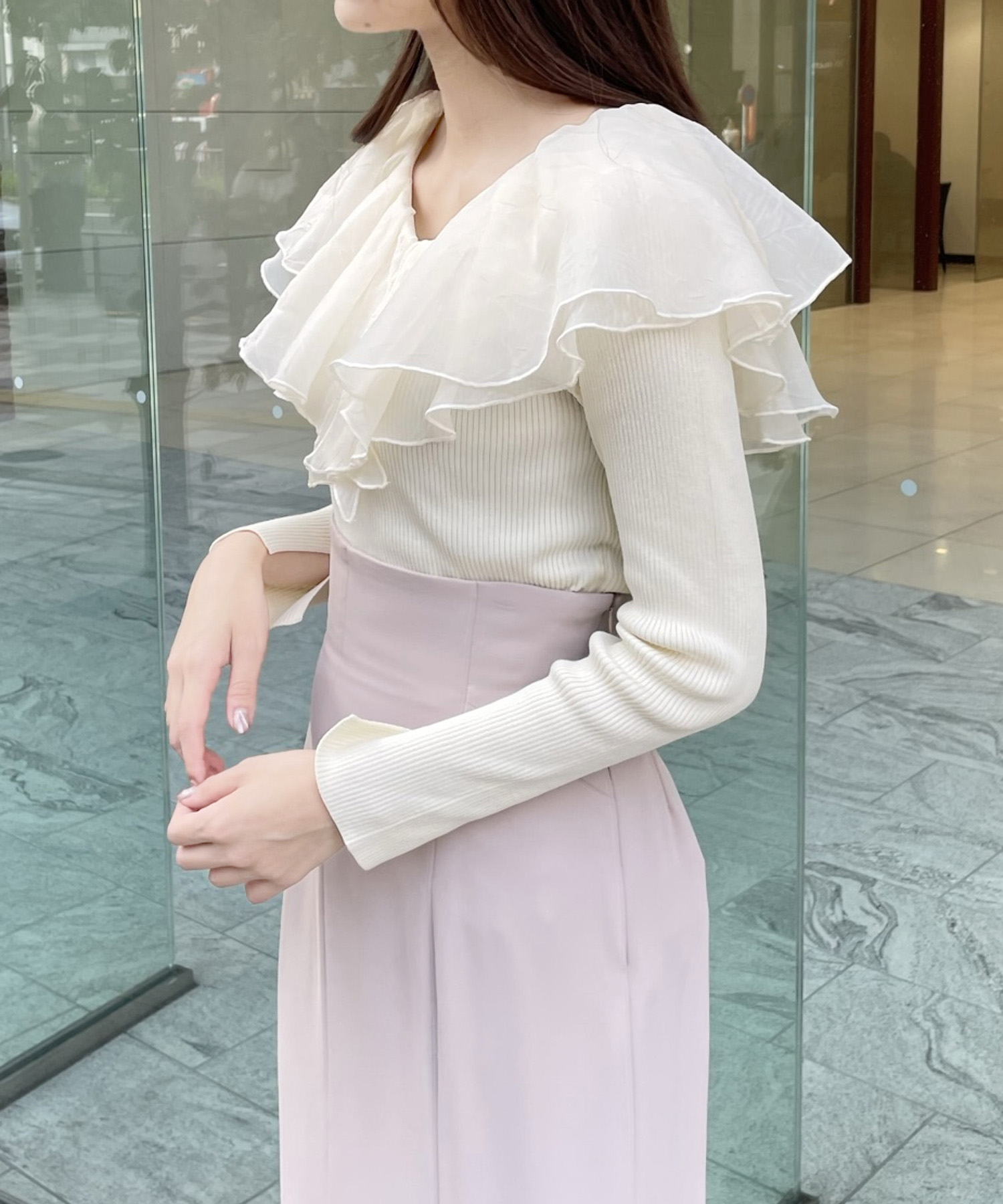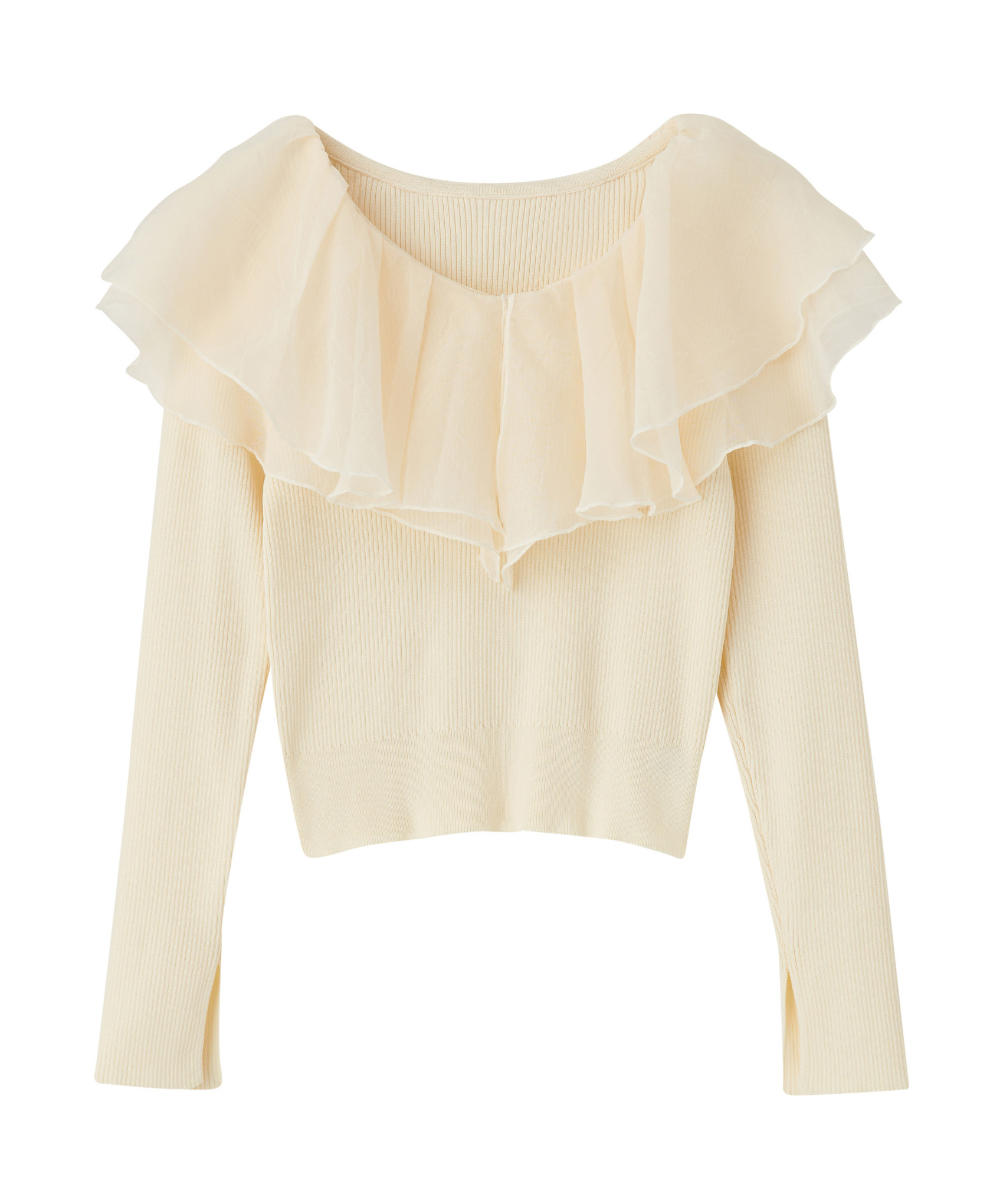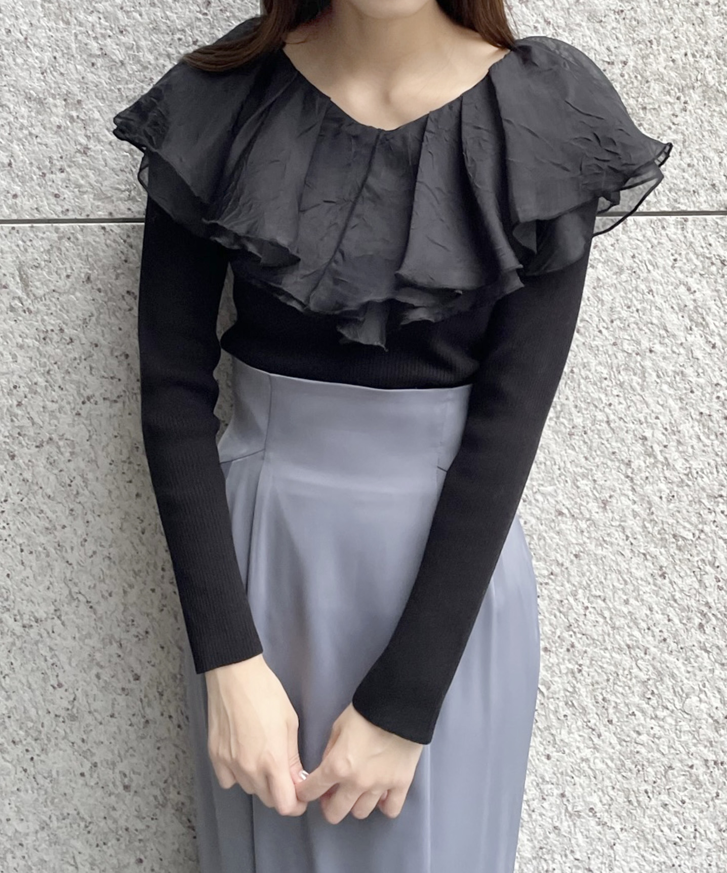 シアー感のある布帛フリルをドッキングしているブラウスライクなニットトップスです。オーガンジーのフリルを2層重ねてふんわりと動きのある衿に仕上げています。ニットは柔らかいリブ編みでフィット感がちょうど良く、ボディラインを細く見せるデザインになっています。短め丈でハイウエストボトムにタックインしてもすっきり着こなせます。 サイズ 総丈 肩幅 身幅 袖丈 48 32 35 38