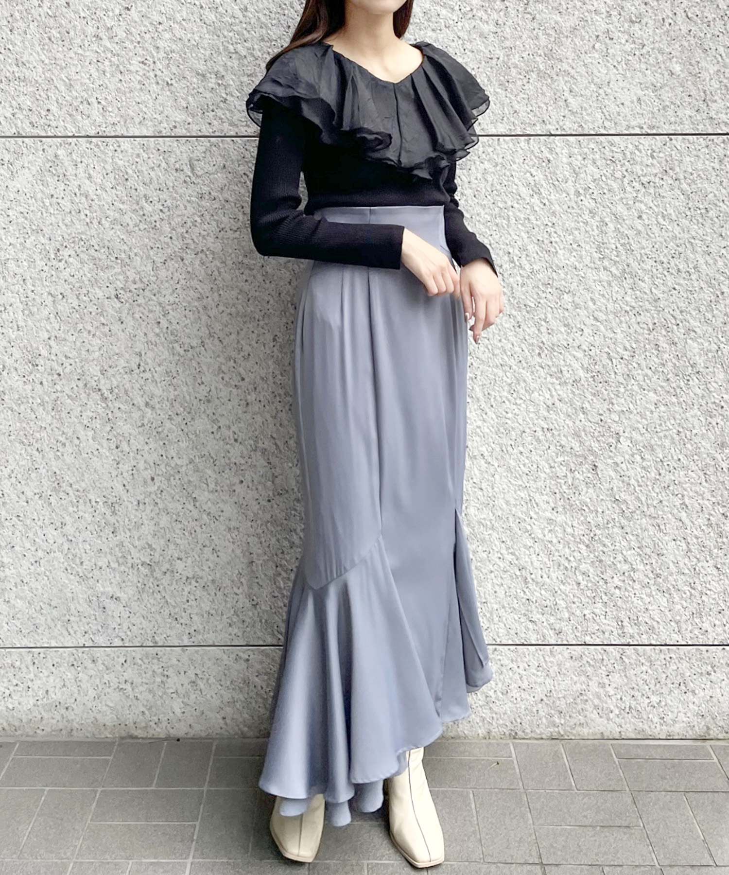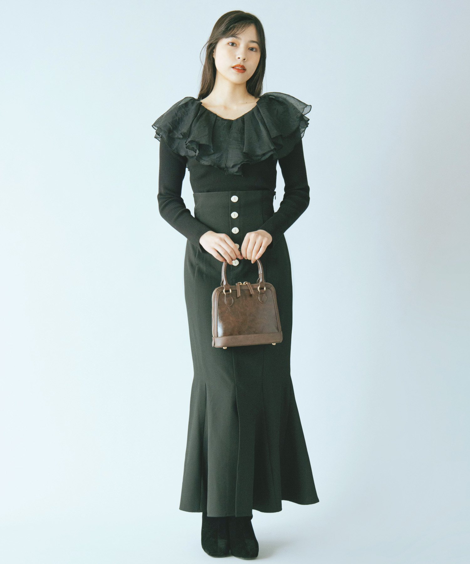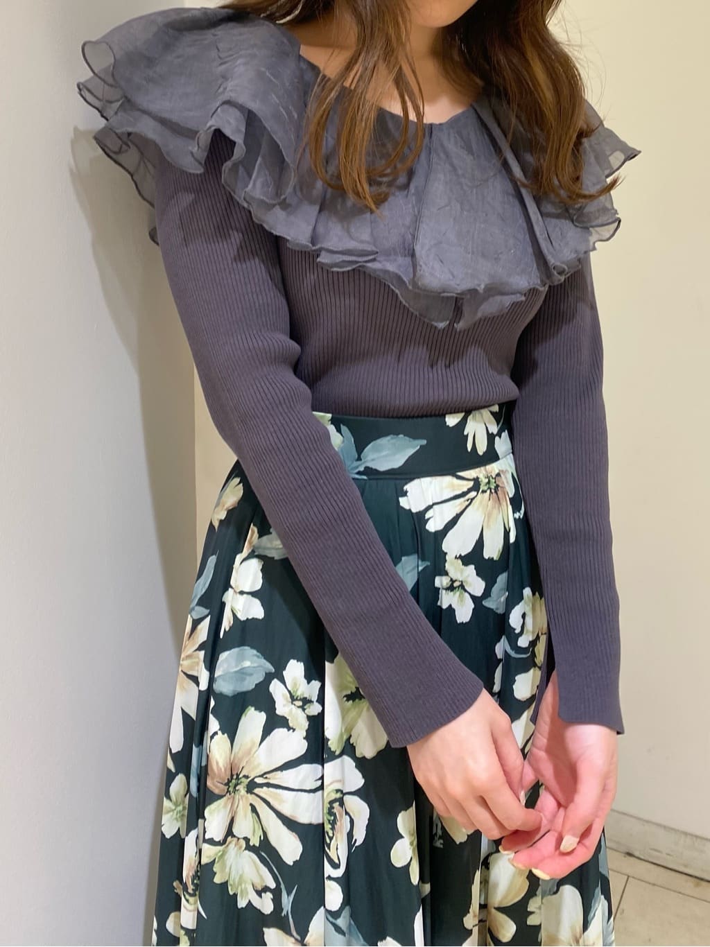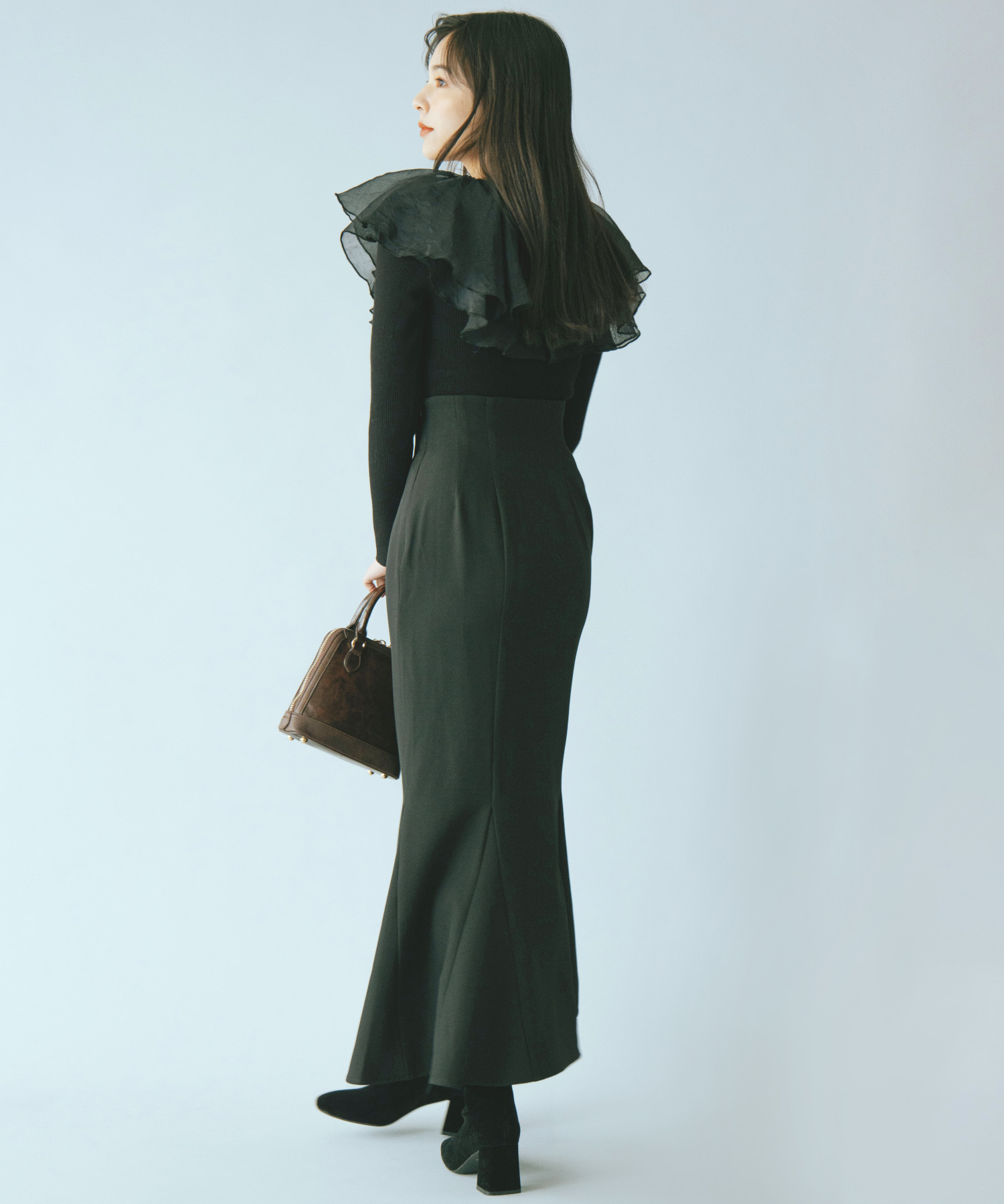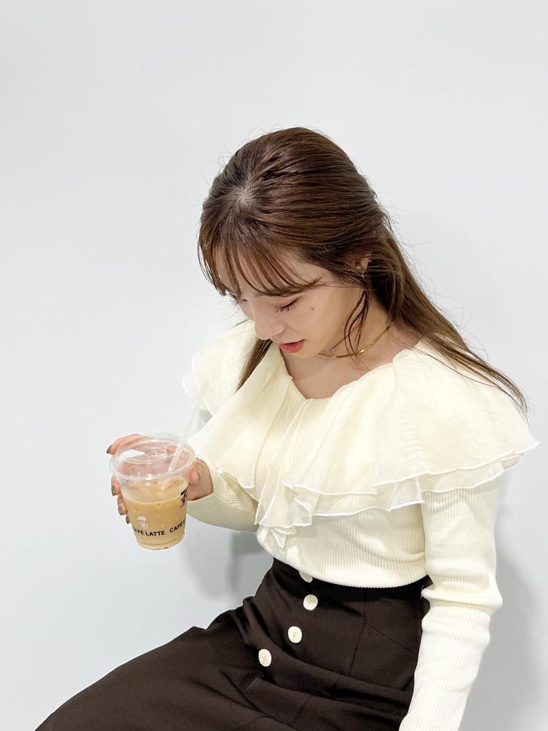 シアー感のある布帛フリルをドッキングしているブラウスライクなニットトップスです。オーガンジーのフリルを2層重ねてふんわりと動きのある衿に仕上げています。ニットは柔らかいリブ編みでフィット感がちょうど良く、ボディラインを細く見せるデザインになっています。短め丈でハイウエストボトムにタックインしてもすっきり着こなせます。 サイズ 総丈 肩幅 身幅 袖丈 48 32 35 38
