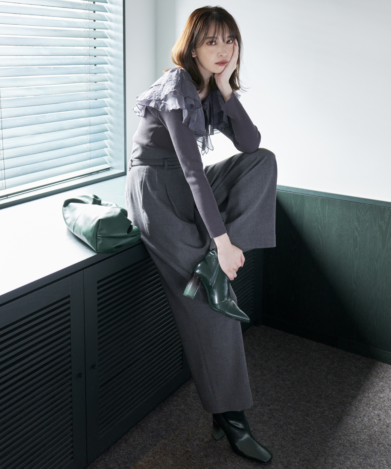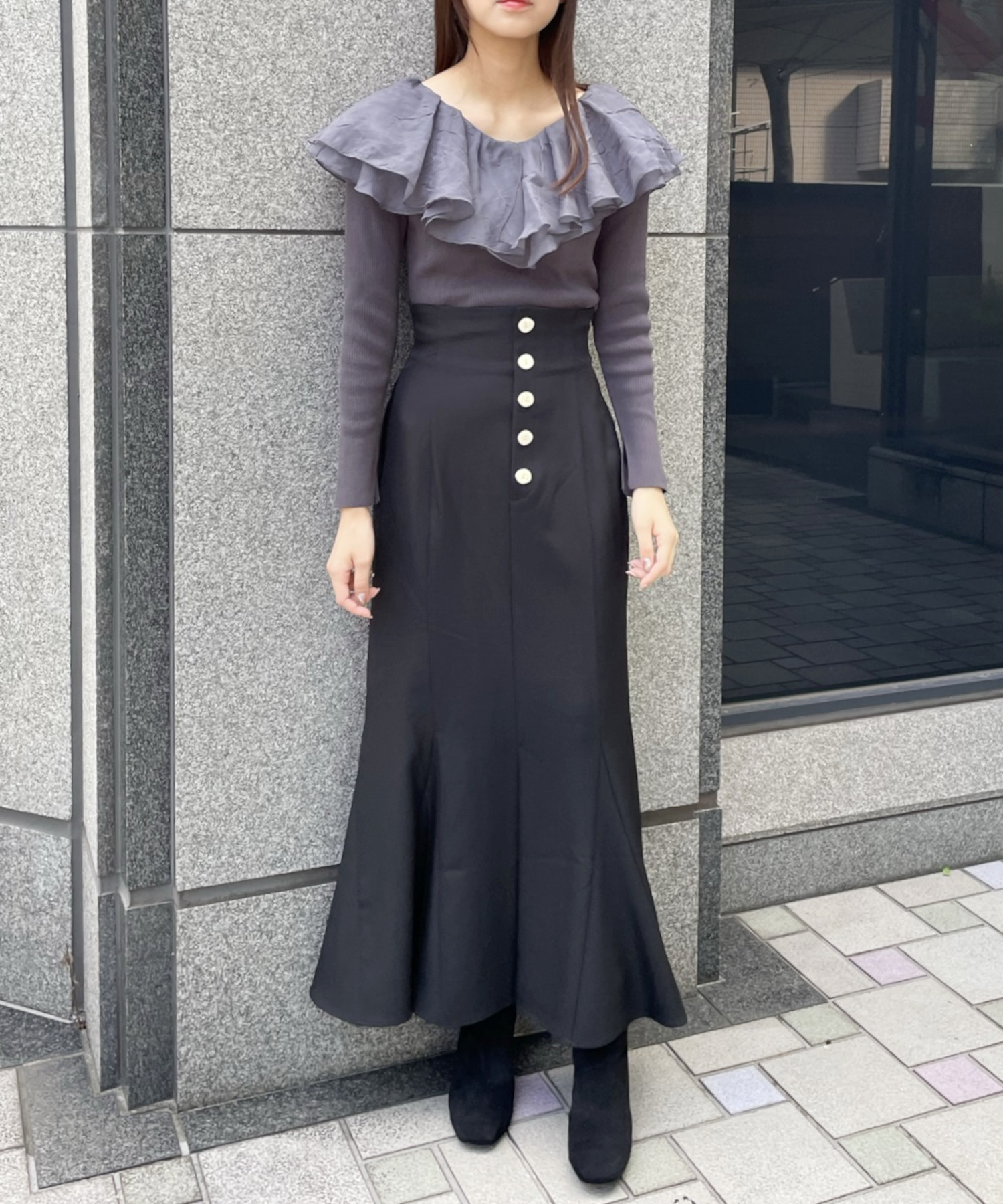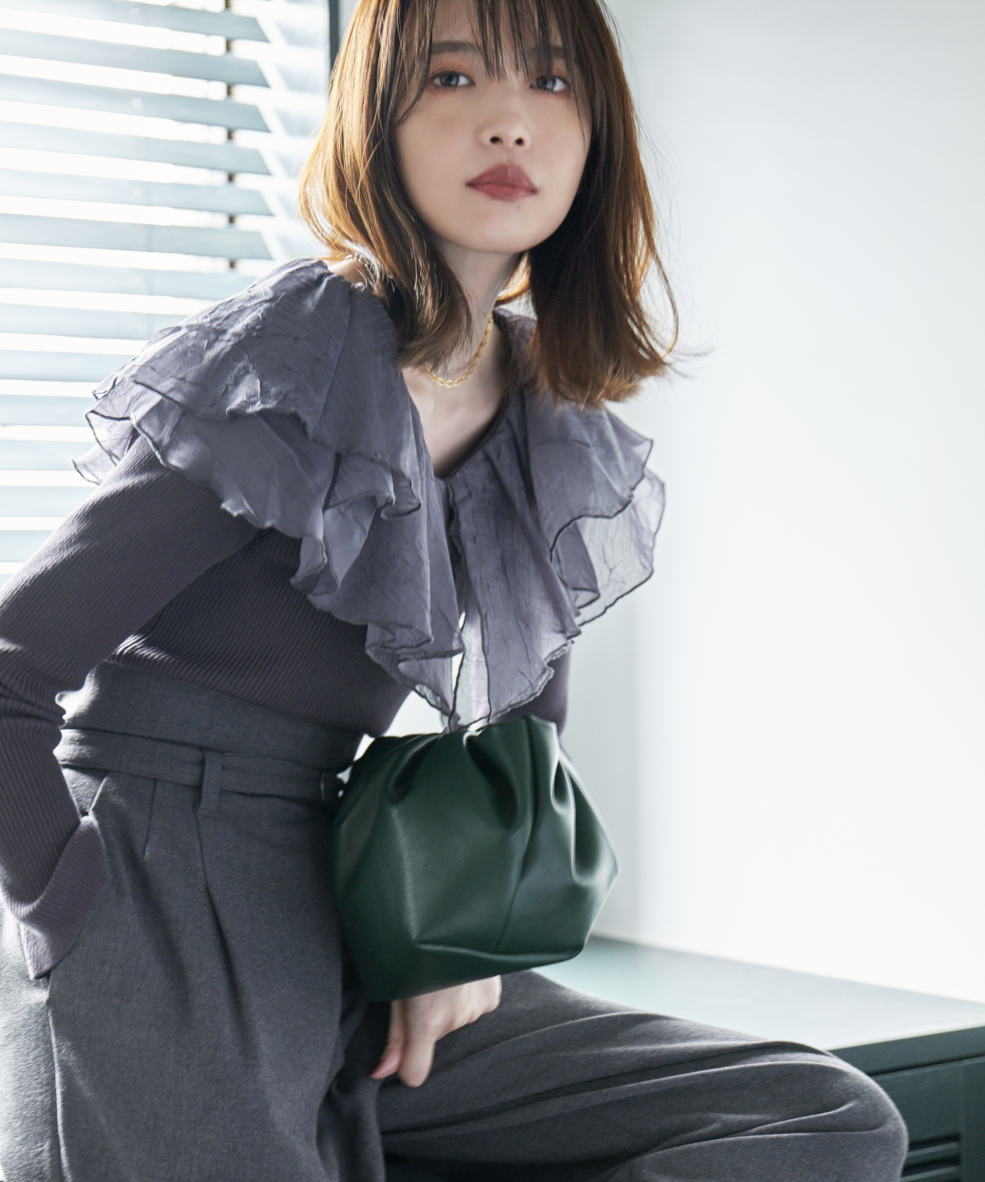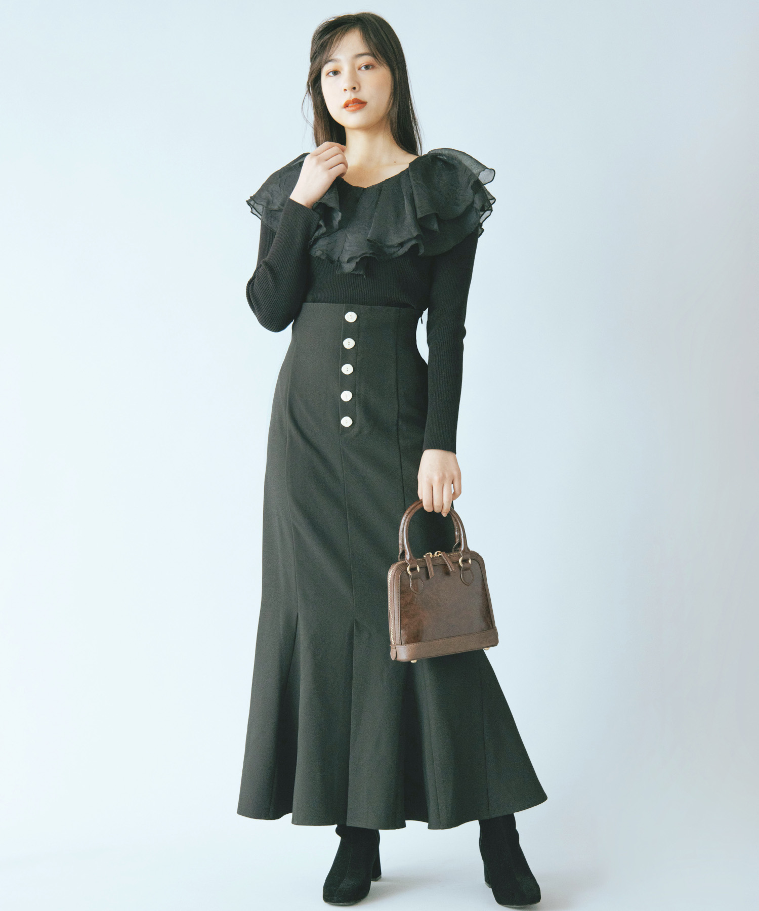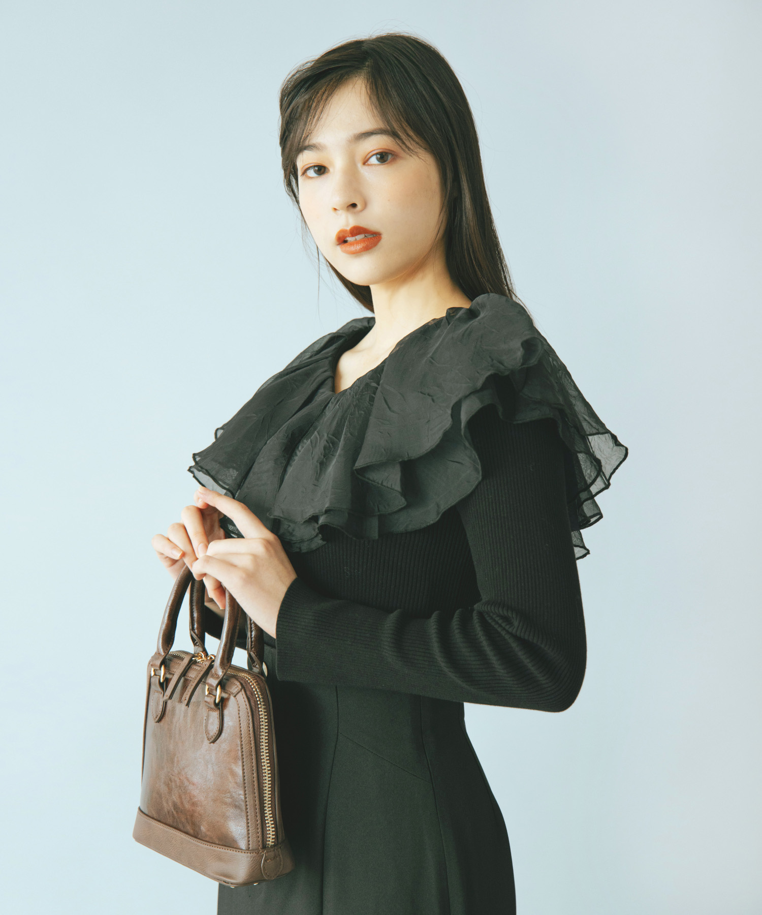 シアー感のある布帛フリルをドッキングしているブラウスライクなニットトップスです。オーガンジーのフリルを2層重ねてふんわりと動きのある衿に仕上げています。ニットは柔らかいリブ編みでフィット感がちょうど良く、ボディラインを細く見せるデザインになっています。短め丈でハイウエストボトムにタックインしてもすっきり着こなせます。 サイズ 総丈 肩幅 身幅 袖丈 48 32 35 38