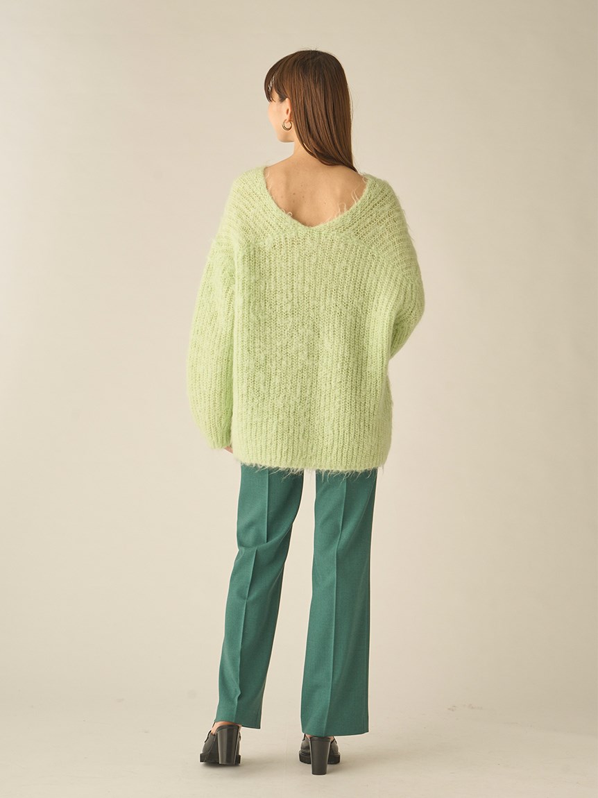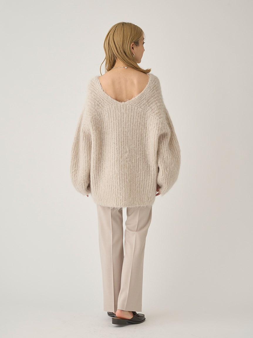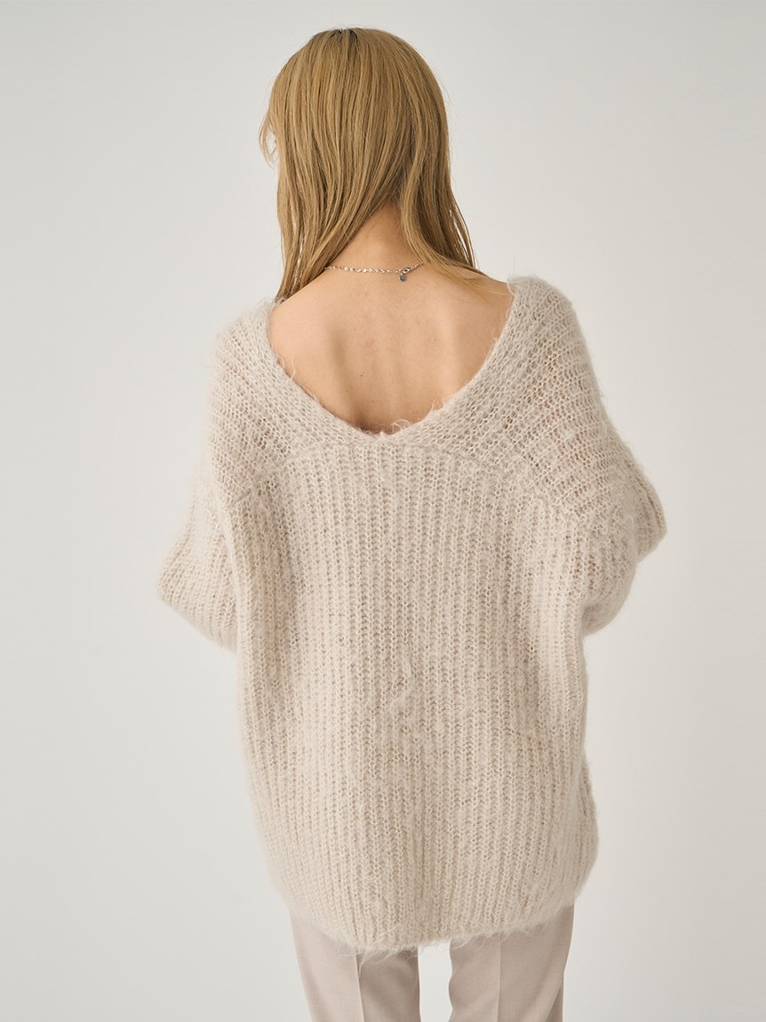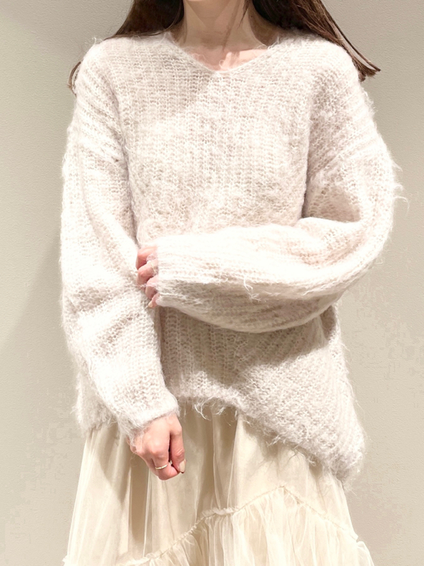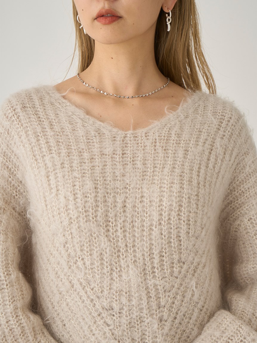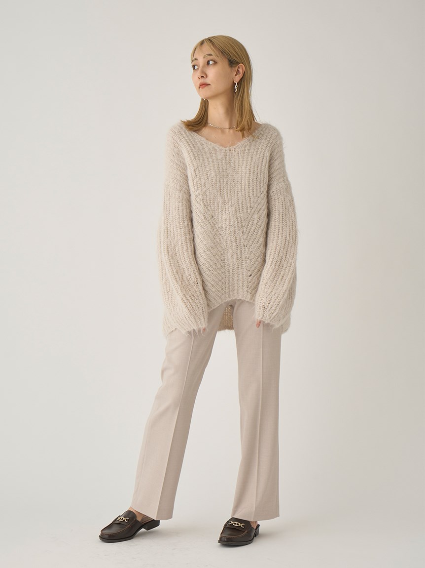 ふわふわとリッチな起毛感のあるニット素材用いた、シーズンムード溢れるVネックプルオーバー。身体を包み込むようなフォルムとやや丸みを持たせた袖で女性らしく仕上げました。前後V開きの広めに開いたネックラインが抜け感を与えるポイント。余計な装飾を抑えシンプルにまとめているので、着まわし力も抜群です。
