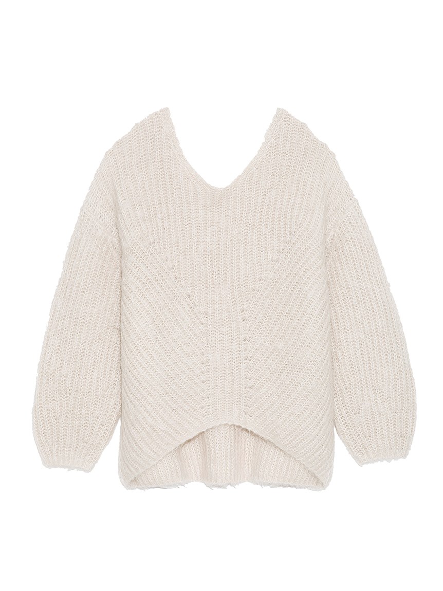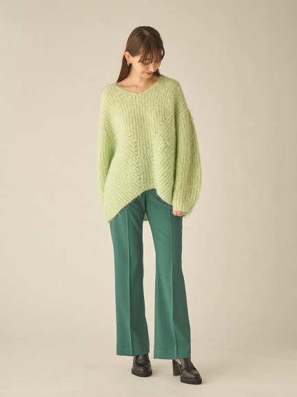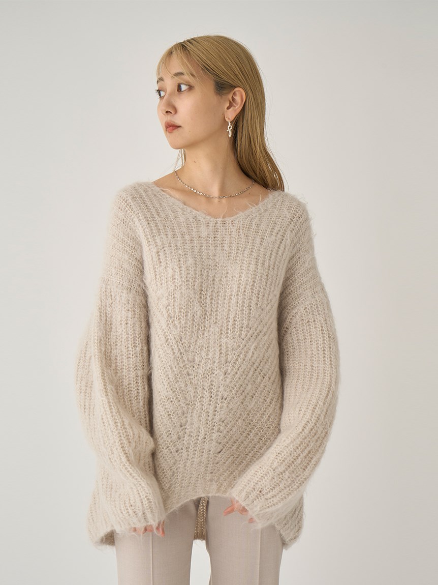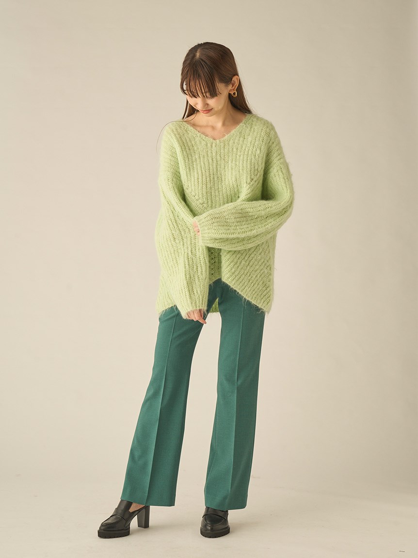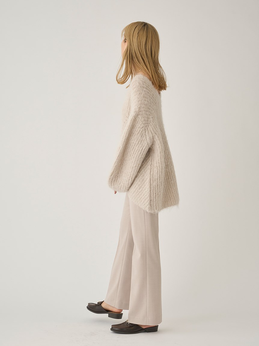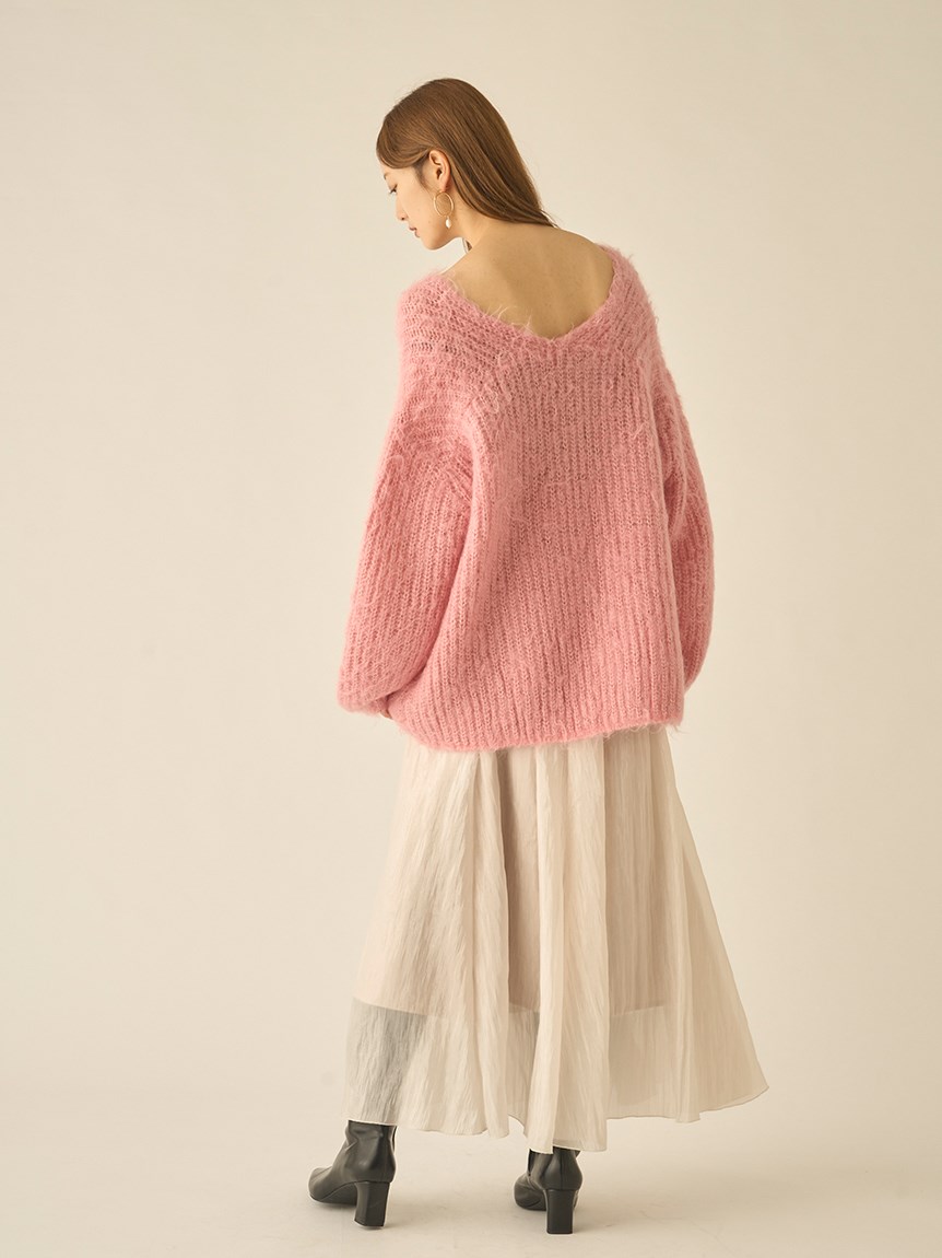 ふわふわとリッチな起毛感のあるニット素材用いた、シーズンムード溢れるVネックプルオーバー。身体を包み込むようなフォルムとやや丸みを持たせた袖で女性らしく仕上げました。前後V開きの広めに開いたネックラインが抜け感を与えるポイント。余計な装飾を抑えシンプルにまとめているので、着まわし力も抜群です。