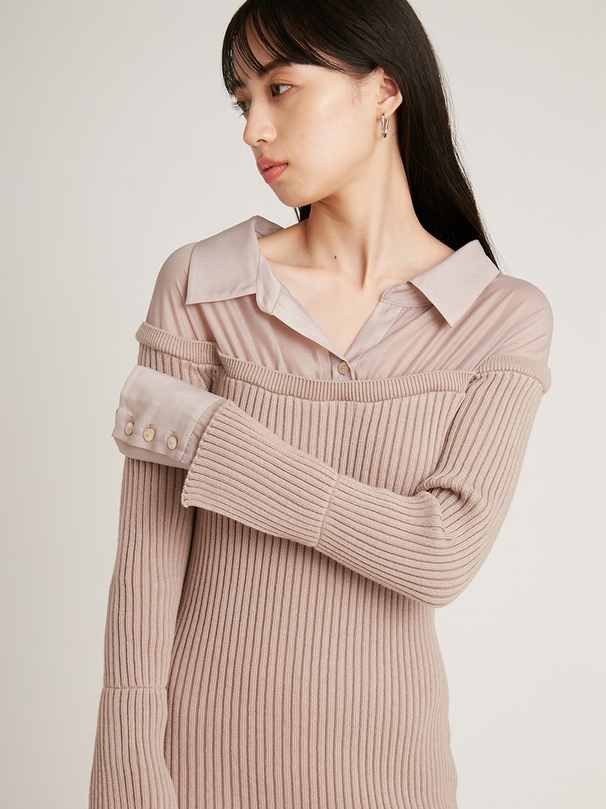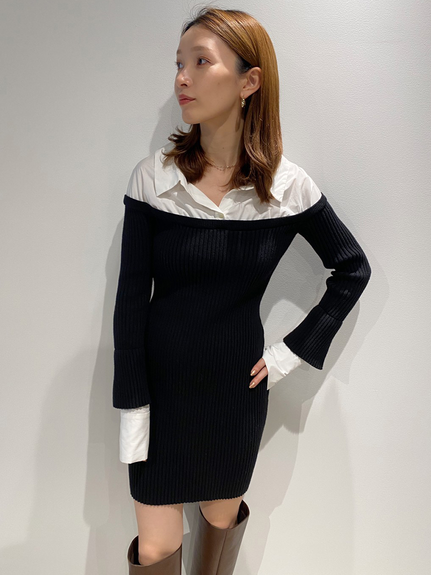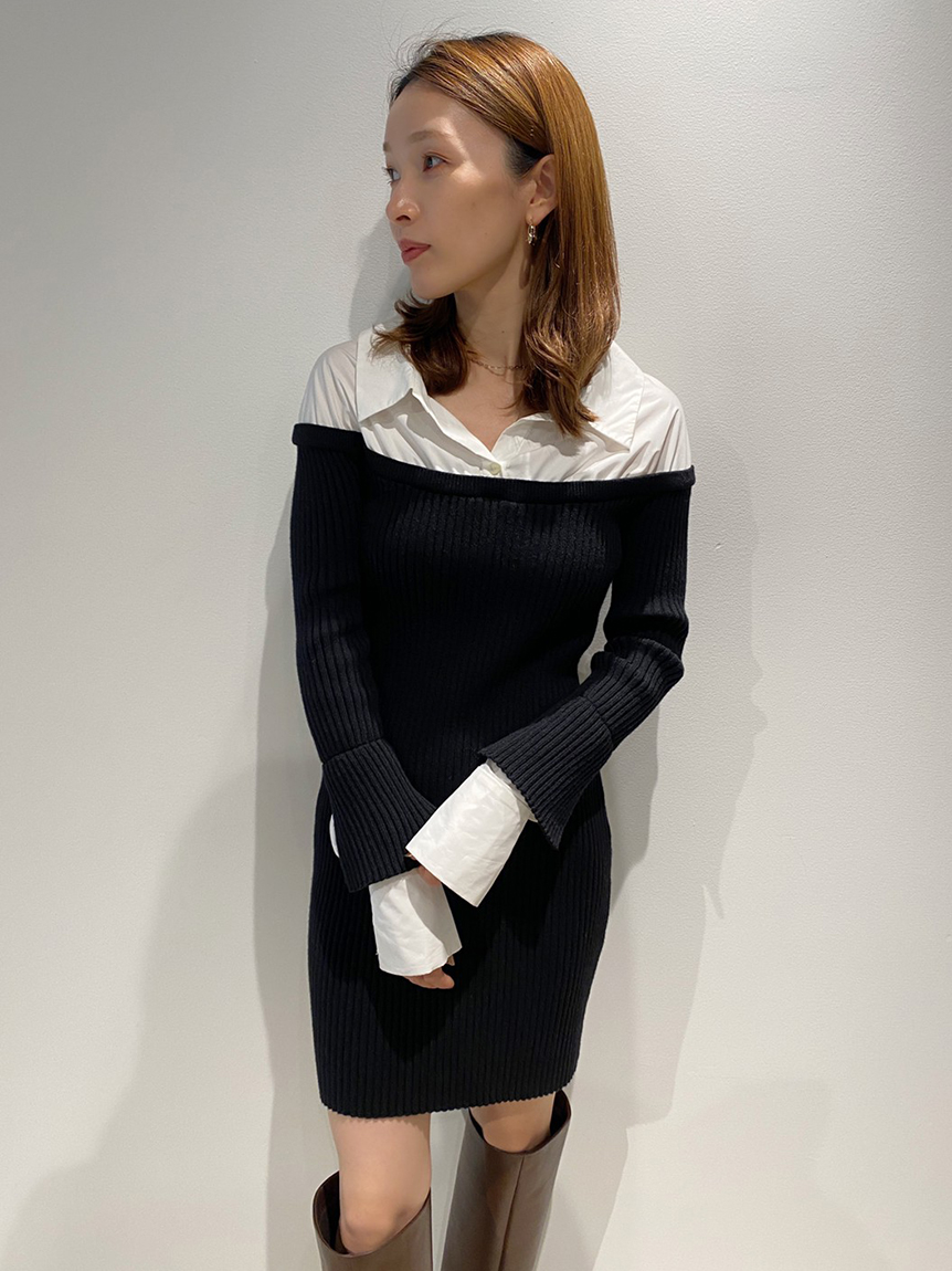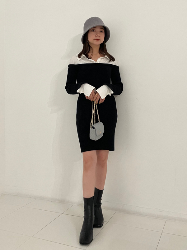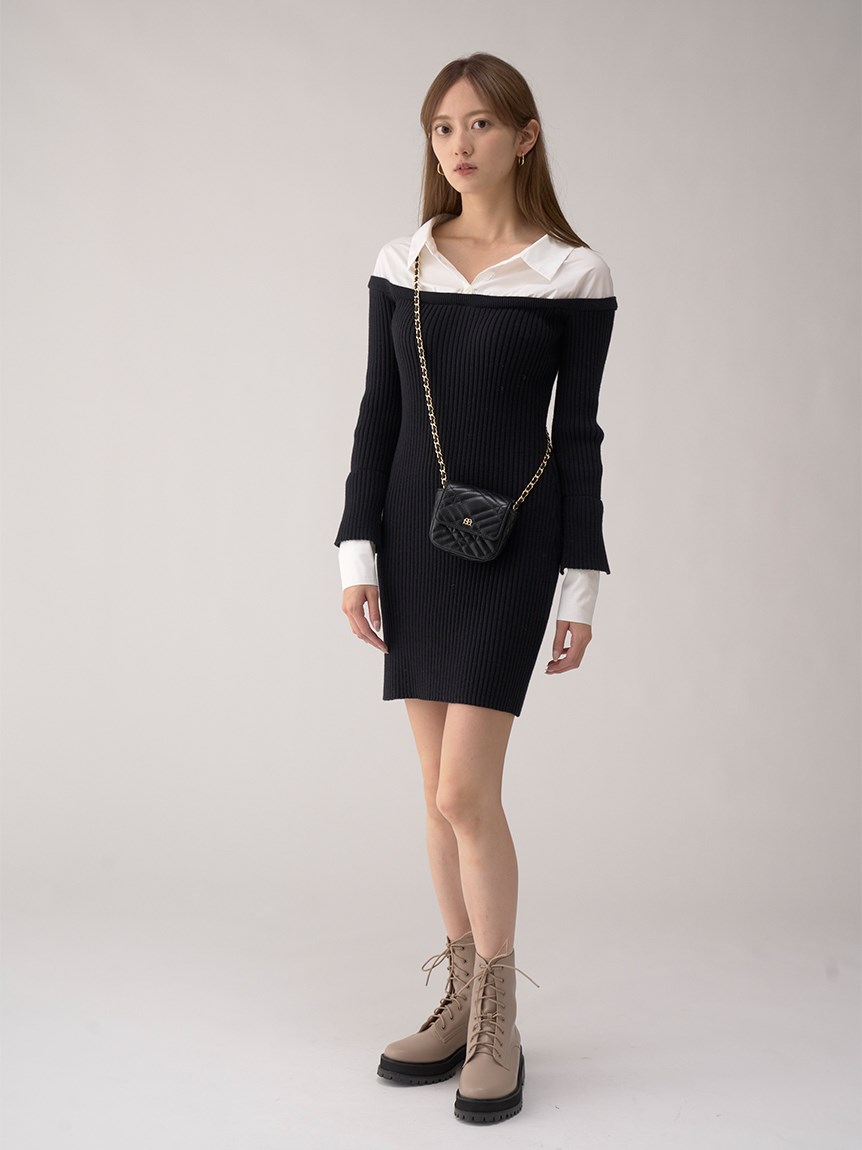 まるでシャツの上からオフショルニットワンピを重ねて着ているようなドッキングデザインのワンピース。シャツはきっちり着るのではなく後ろに抜いて着用するようなこなれ感のある設計に。抜け感を出すことでシャツが苦手な人でも着用しやすく、1枚でコーディネートが完成する万能なアイテムです。身頃部分は美しいボディラインを演出するタイトシルエットでスタイルアップ効果も期待できます。