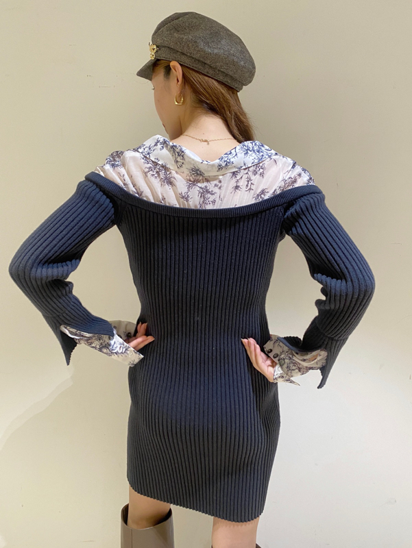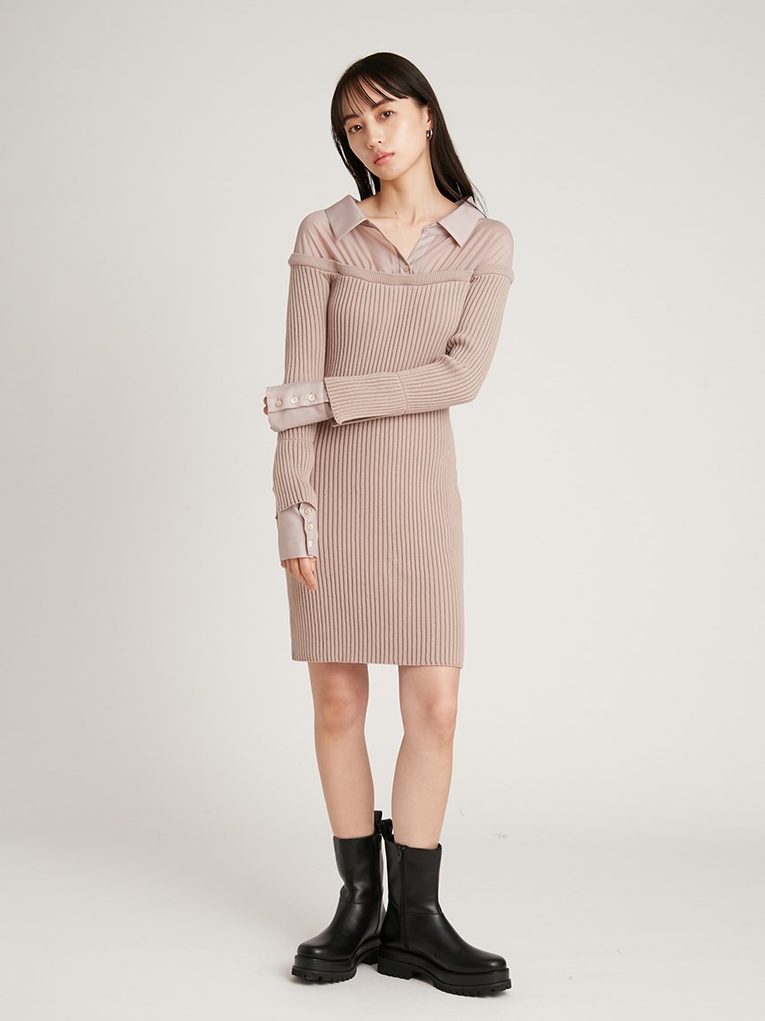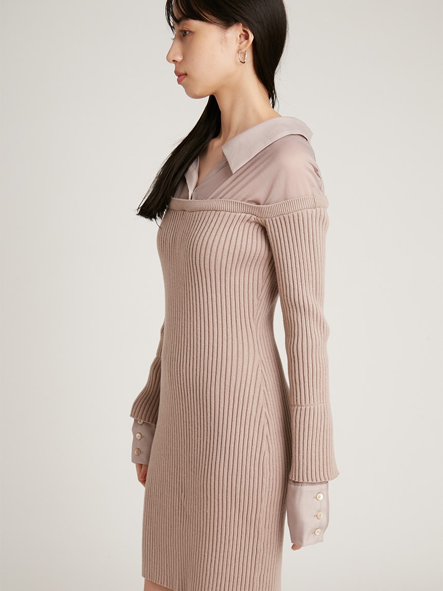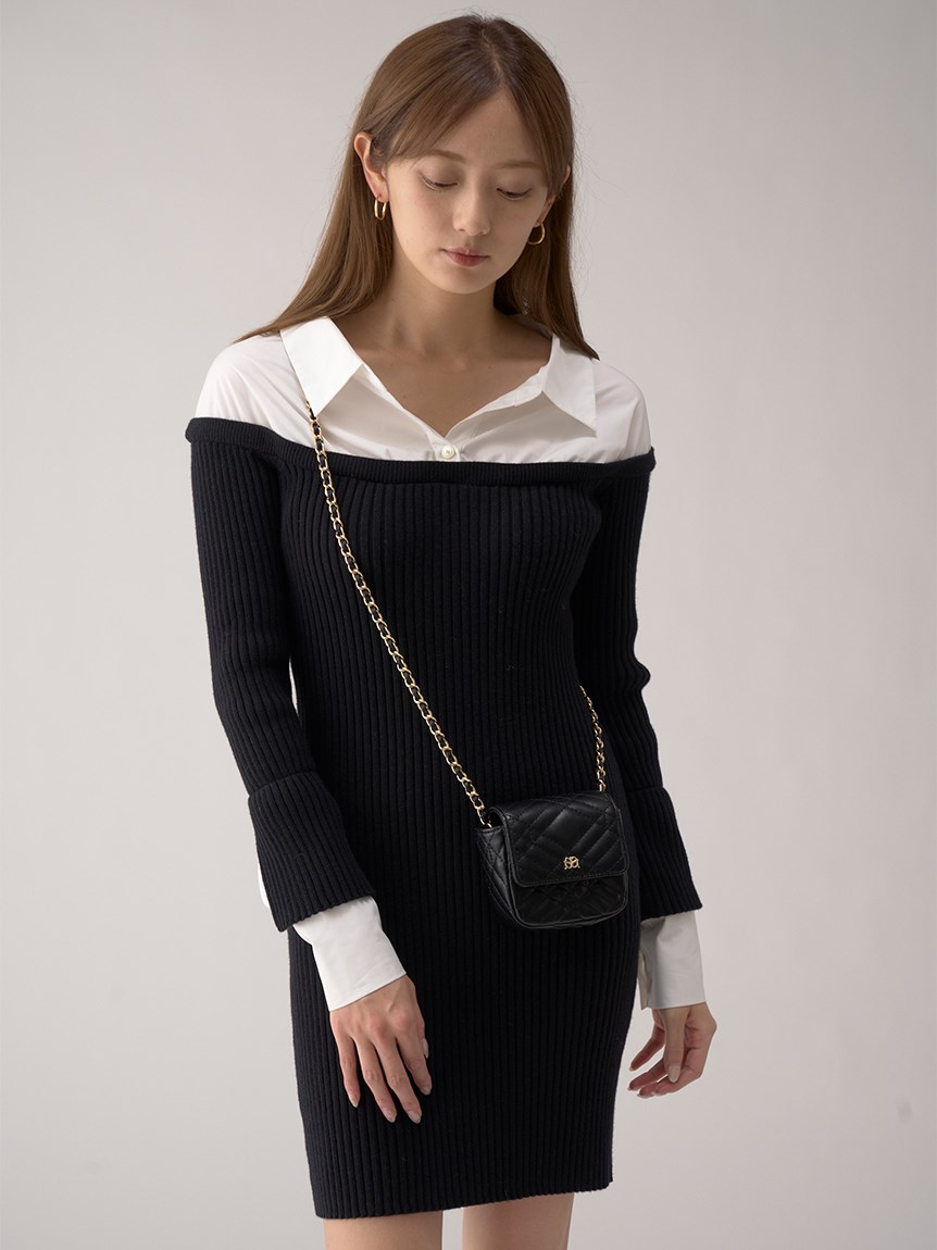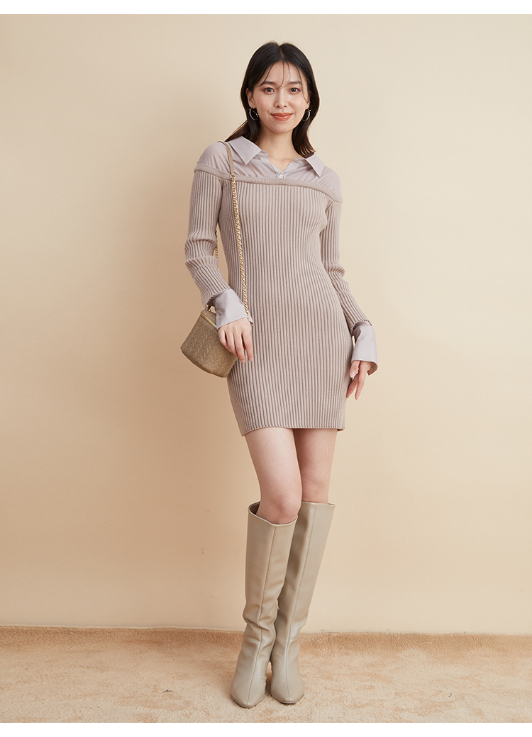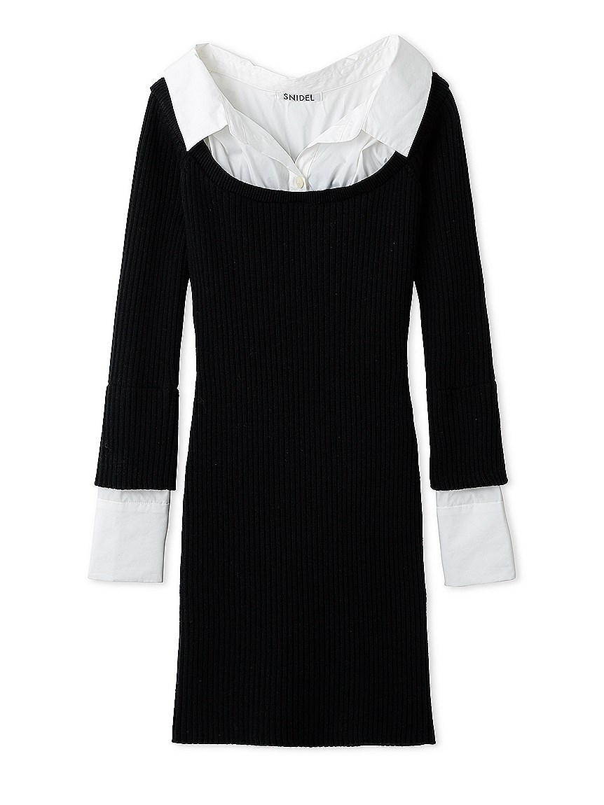 まるでシャツの上からオフショルニットワンピを重ねて着ているようなドッキングデザインのワンピース。シャツはきっちり着るのではなく後ろに抜いて着用するようなこなれ感のある設計に。抜け感を出すことでシャツが苦手な人でも着用しやすく、1枚でコーディネートが完成する万能なアイテムです。身頃部分は美しいボディラインを演出するタイトシルエットでスタイルアップ効果も期待できます。