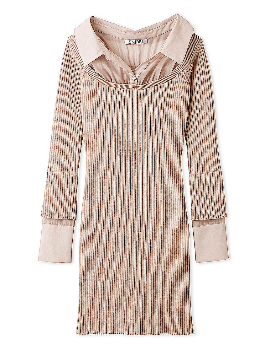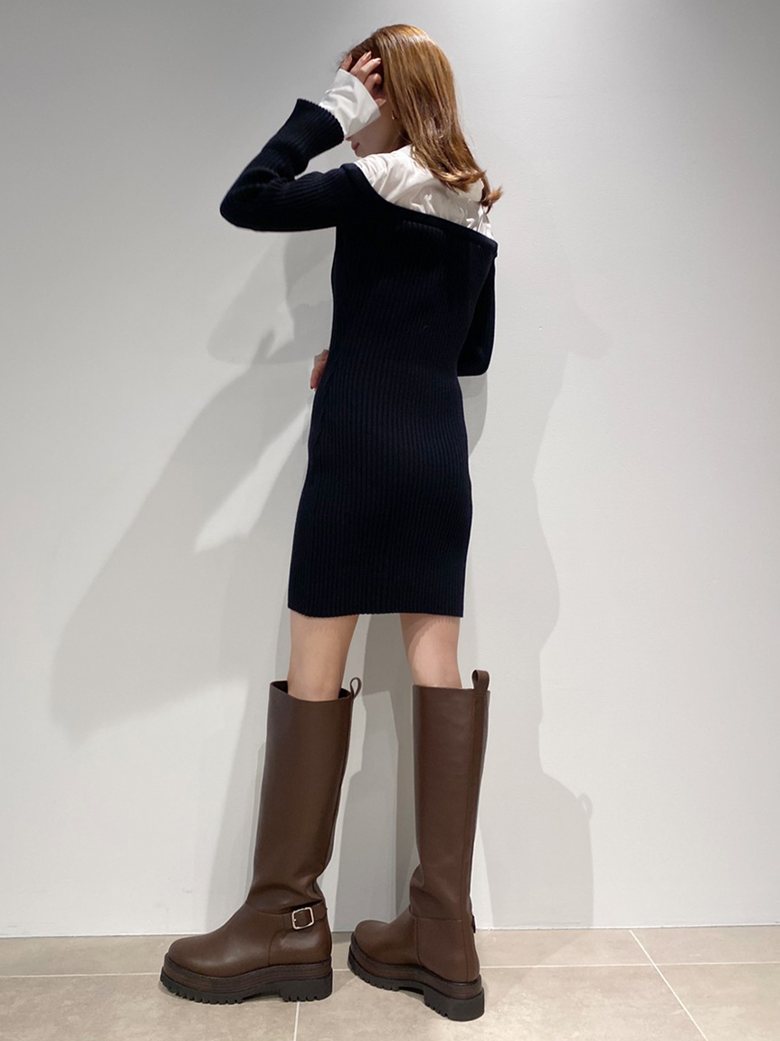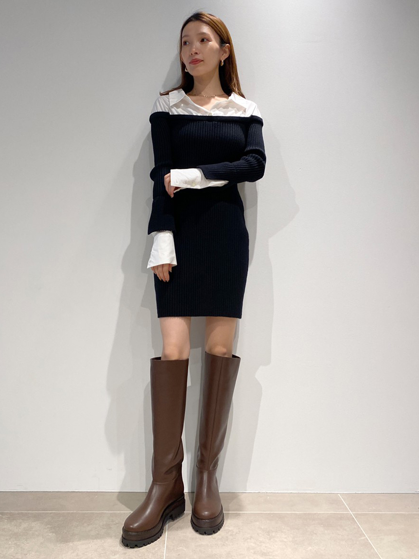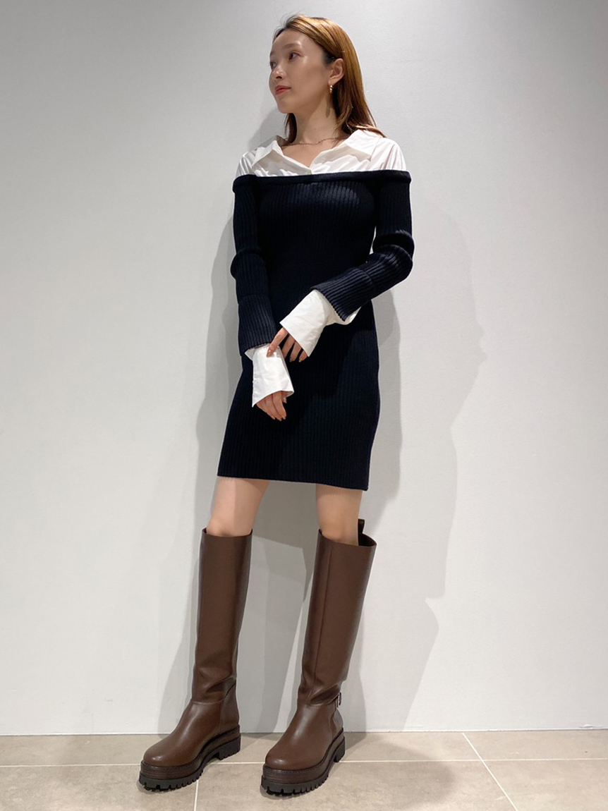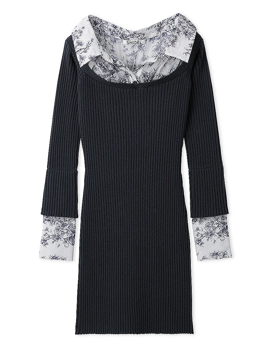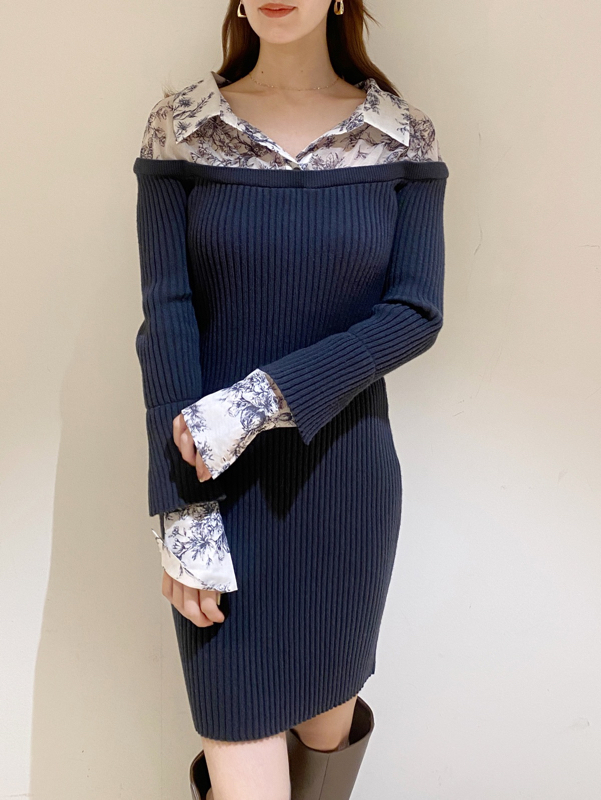 まるでシャツの上からオフショルニットワンピを重ねて着ているようなドッキングデザインのワンピース。シャツはきっちり着るのではなく後ろに抜いて着用するようなこなれ感のある設計に。抜け感を出すことでシャツが苦手な人でも着用しやすく、1枚でコーディネートが完成する万能なアイテムです。身頃部分は美しいボディラインを演出するタイトシルエットでスタイルアップ効果も期待できます。