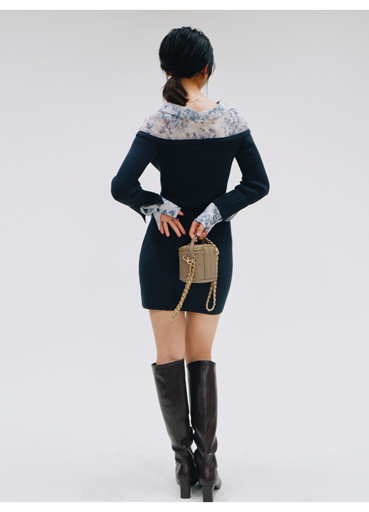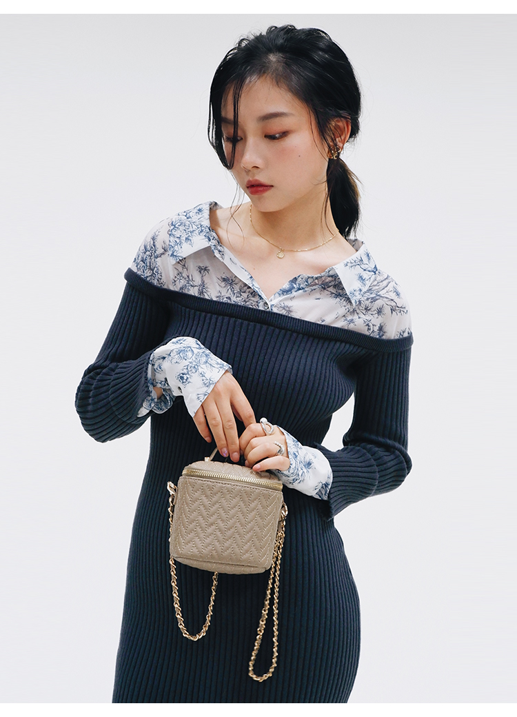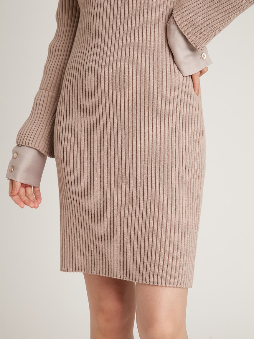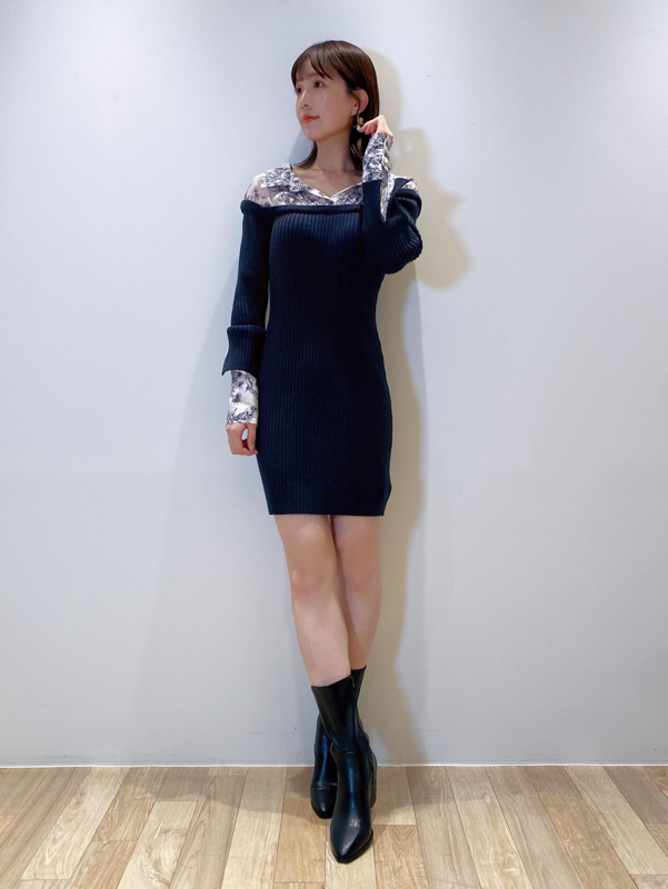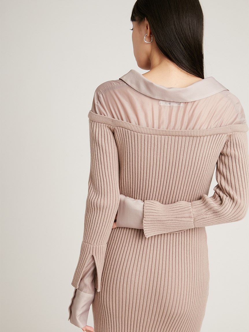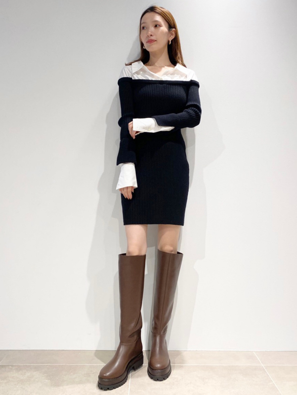 まるでシャツの上からオフショルニットワンピを重ねて着ているようなドッキングデザインのワンピース。シャツはきっちり着るのではなく後ろに抜いて着用するようなこなれ感のある設計に。抜け感を出すことでシャツが苦手な人でも着用しやすく、1枚でコーディネートが完成する万能なアイテムです。身頃部分は美しいボディラインを演出するタイトシルエットでスタイルアップ効果も期待できます。