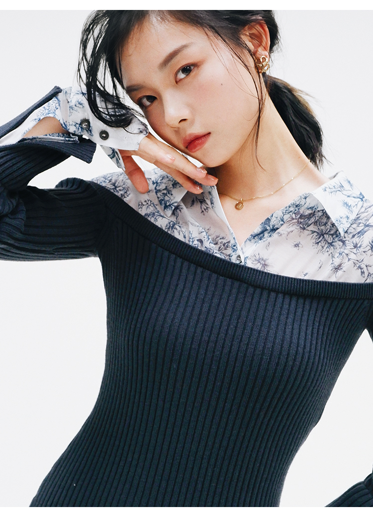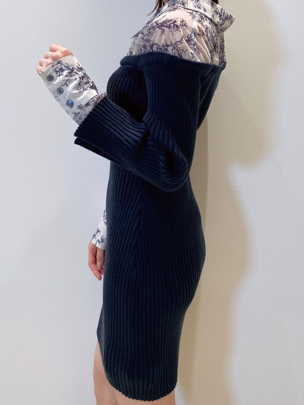 程よい厚みのあるリブニットとシャツ地をドッキングしました。バイカラーで切り替えたモードなブラック、全体を優しい色合いでまとめたピンクベージュ、プリントを取り入れたネイビーの3色をご用意。