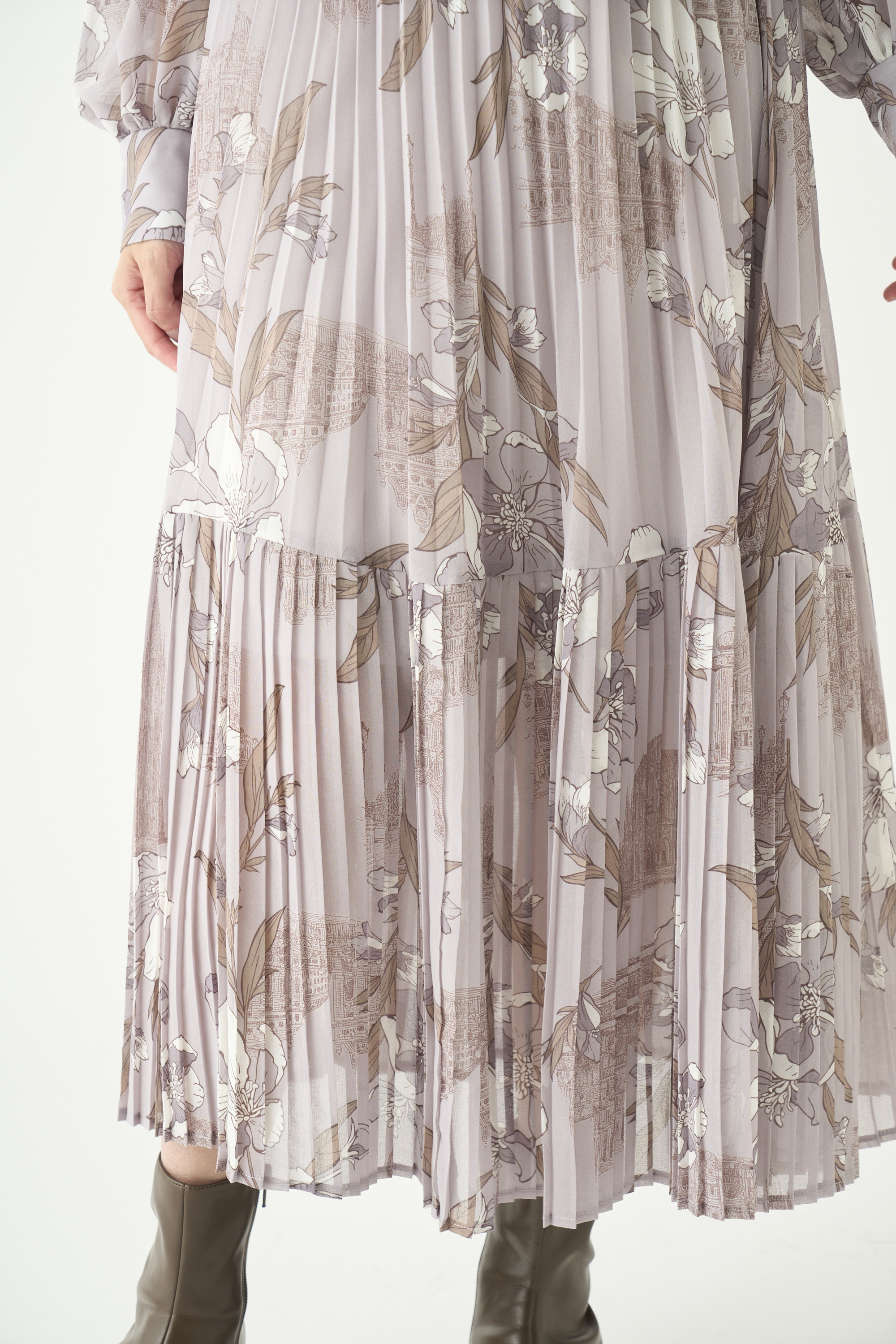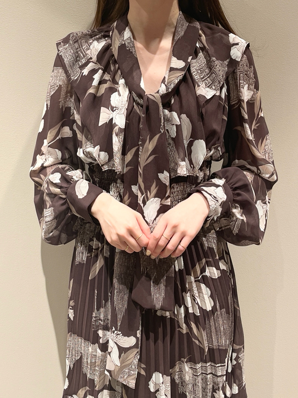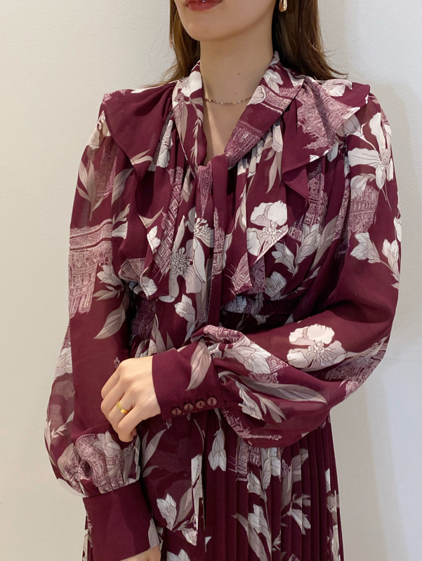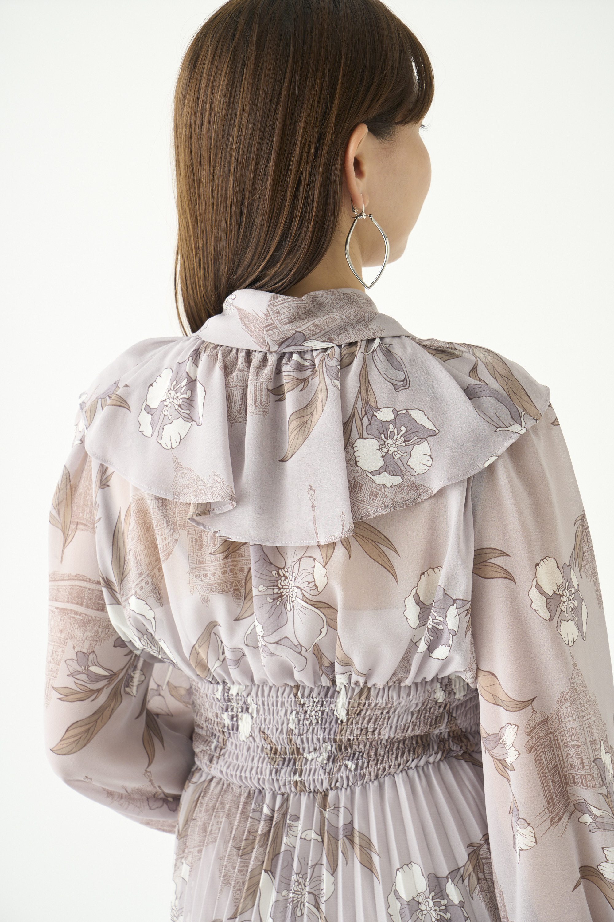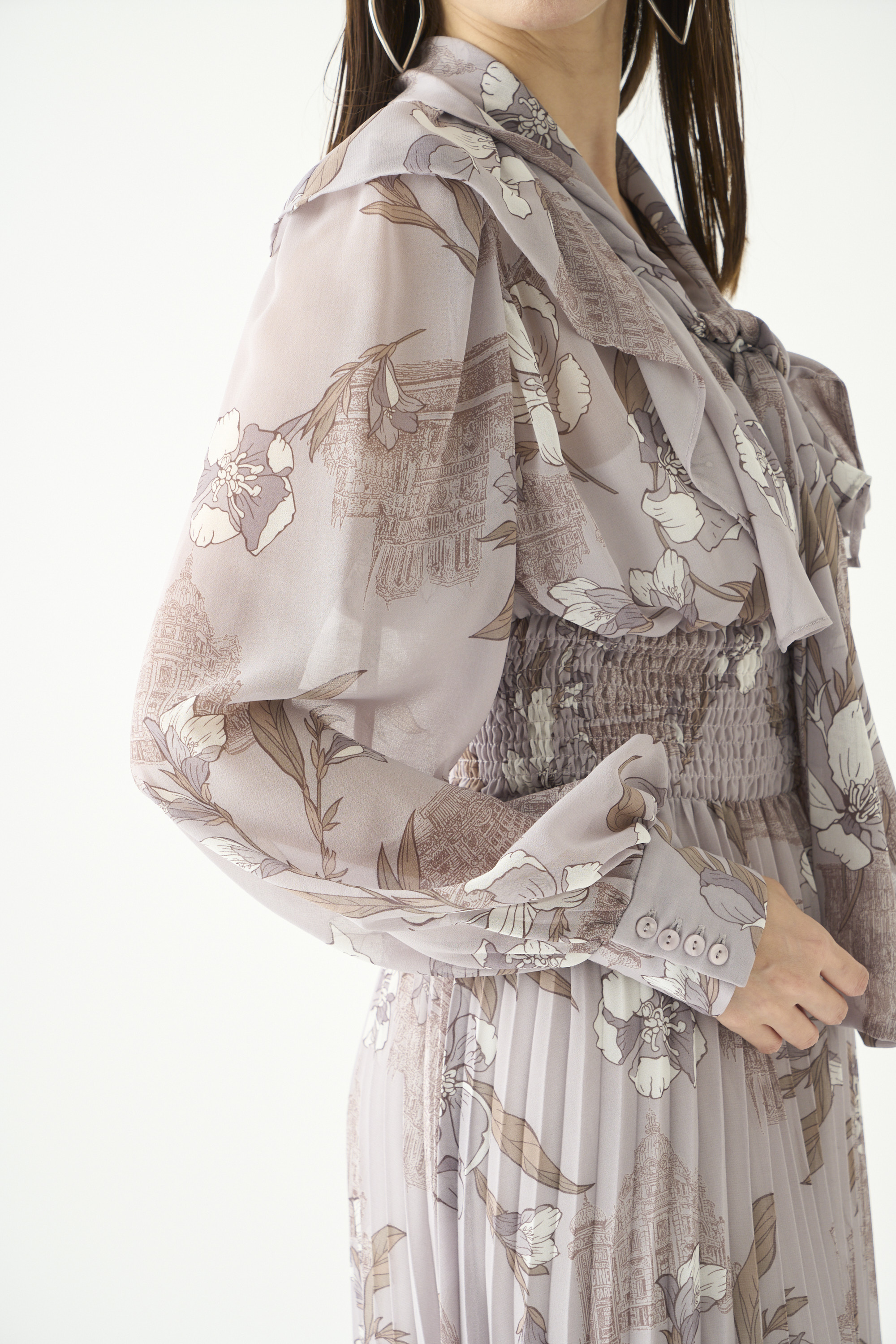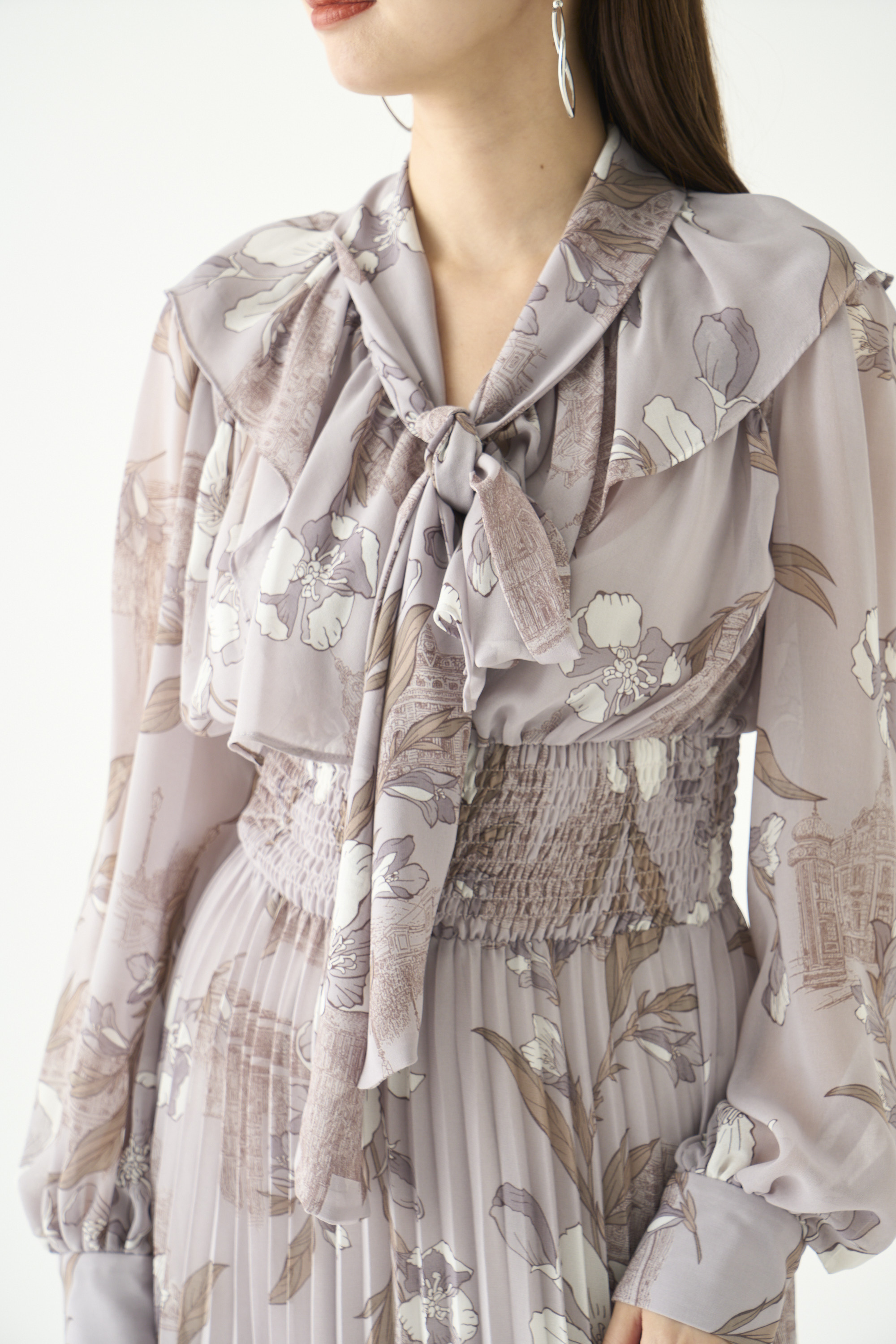 クラシカルな雰囲気の街並みを背景に花柄を組み合わせた新鮮なプリントが目を引くワンピース。ボウタイや大きめの襟、カフスなど、クラシカル要素を引き立てるディテールを詰め込みました。スカート部分には幅の異なる2種類のプリーツを効かせることで表情豊かな仕上がりに。ウエストにはゴムシャーリングを効かせているので伸縮性があり、ボディにフィットしながらも着心地は快適です。