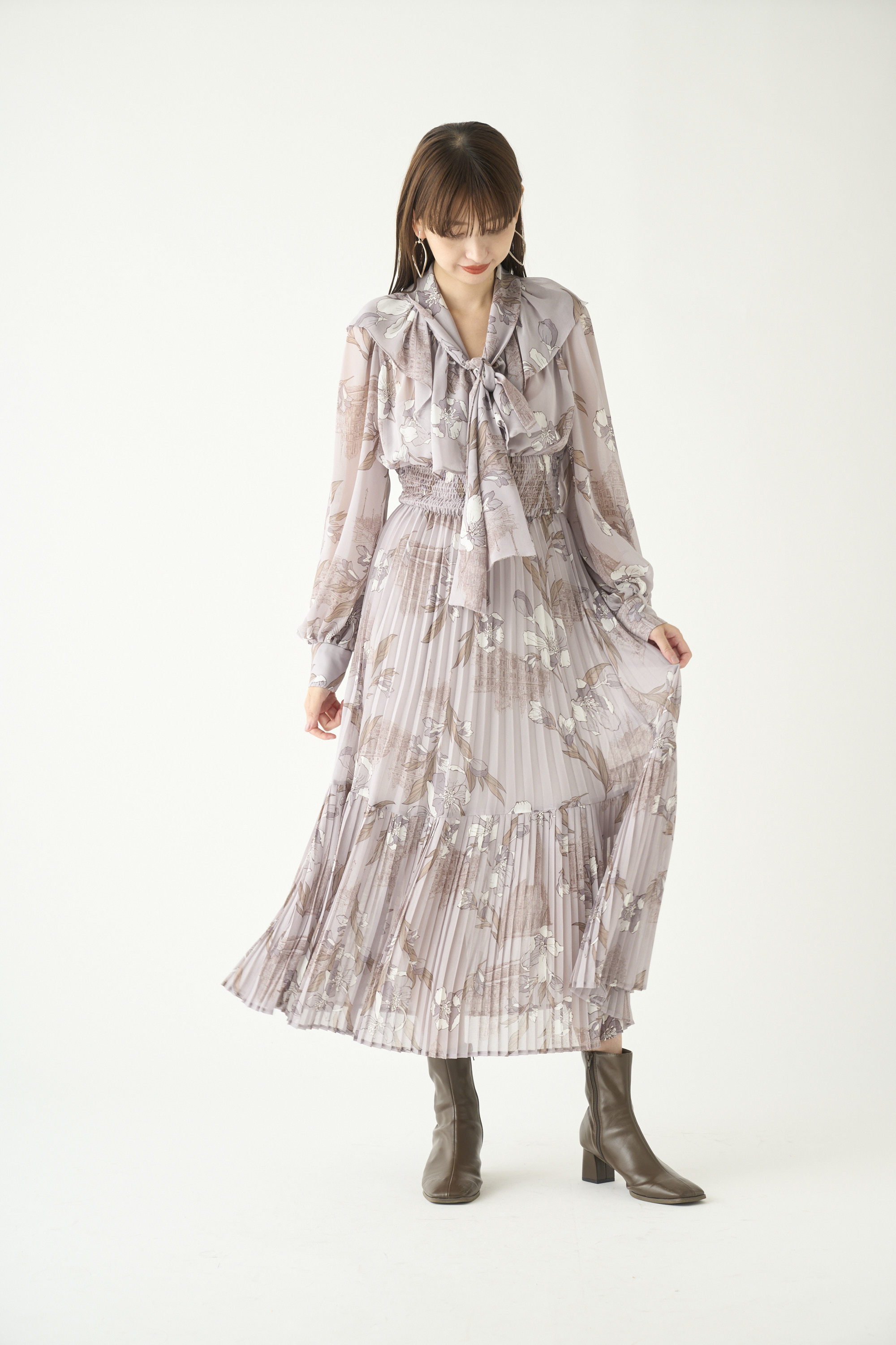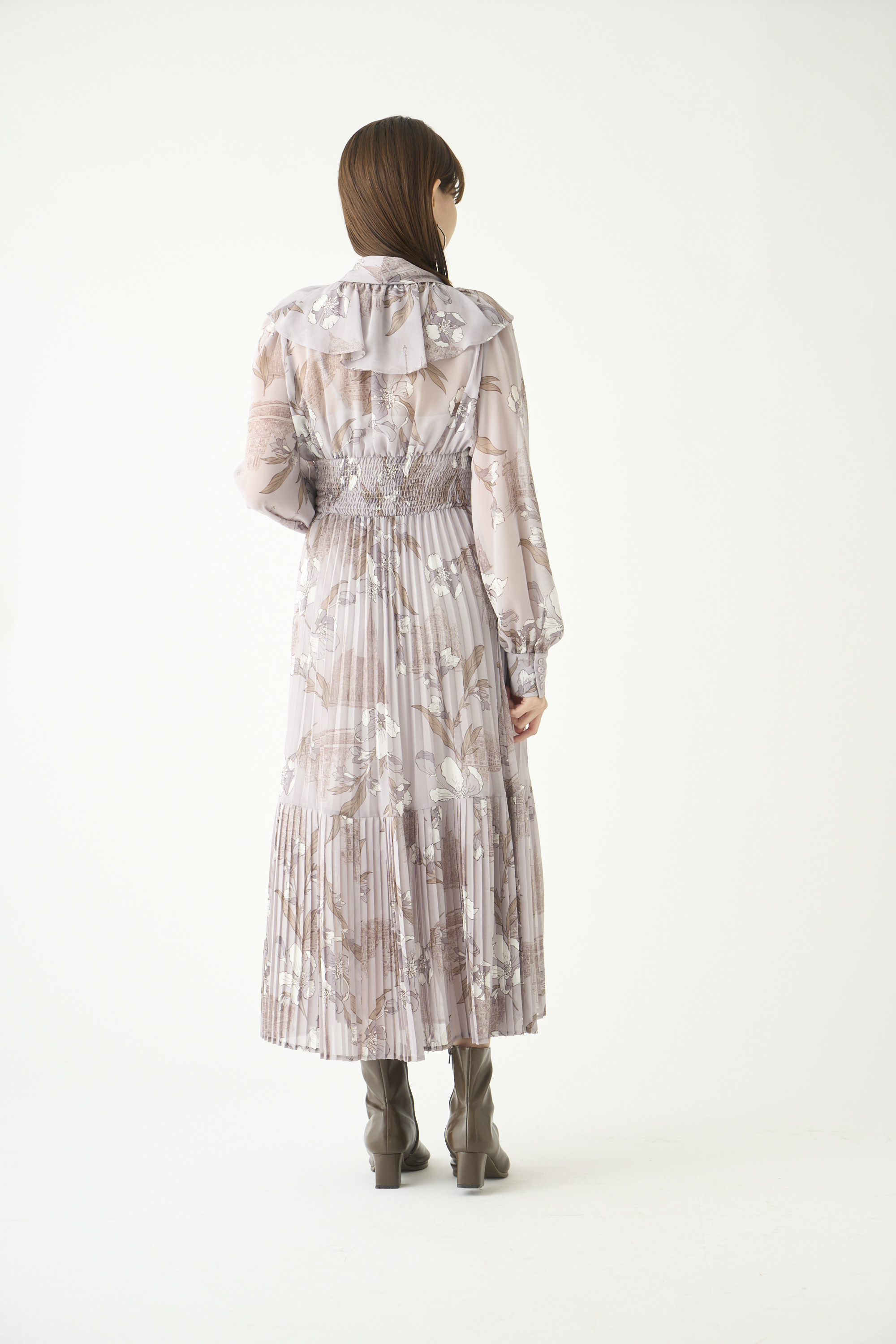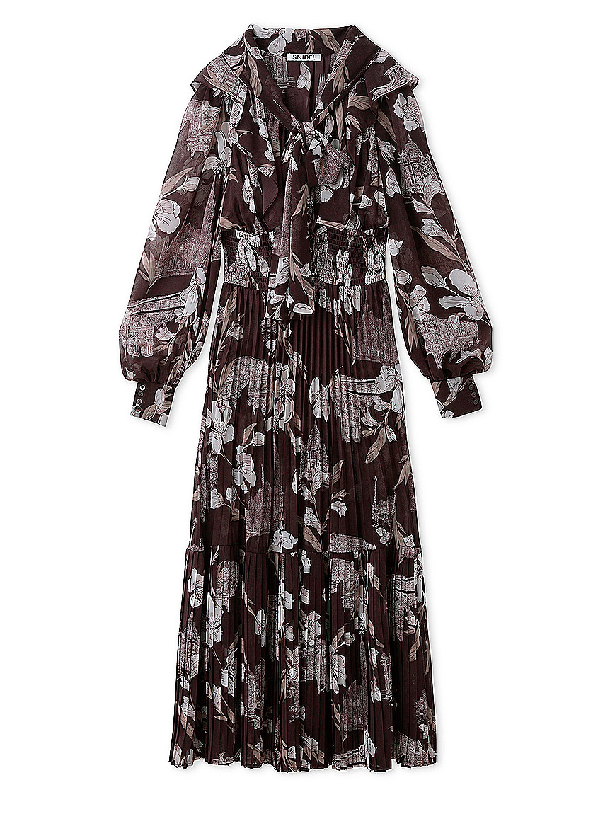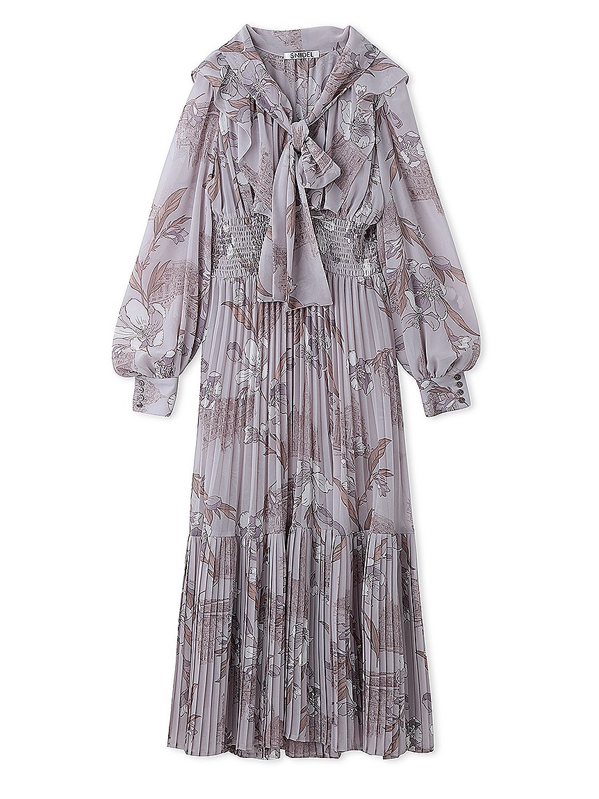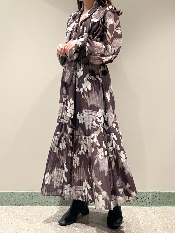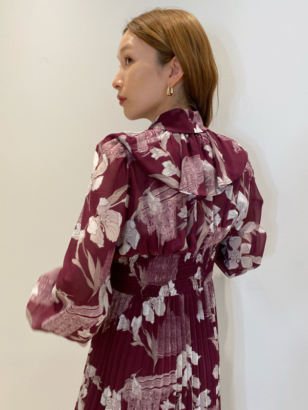 クラシカルな雰囲気の街並みを背景に花柄を組み合わせた新鮮なプリントが目を引くワンピース。ボウタイや大きめの襟、カフスなど、クラシカル要素を引き立てるディテールを詰め込みました。スカート部分には幅の異なる2種類のプリーツを効かせることで表情豊かな仕上がりに。ウエストにはゴムシャーリングを効かせているので伸縮性があり、ボディにフィットしながらも着心地は快適です。