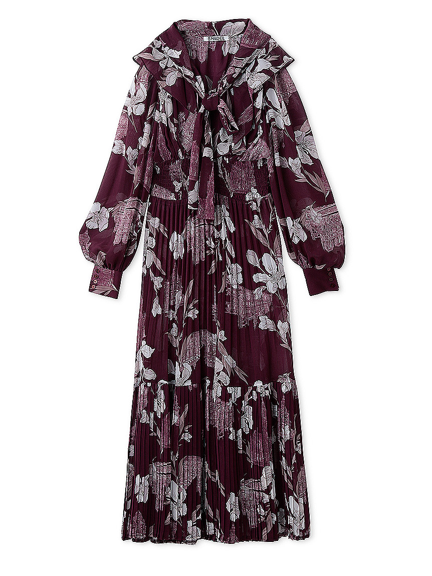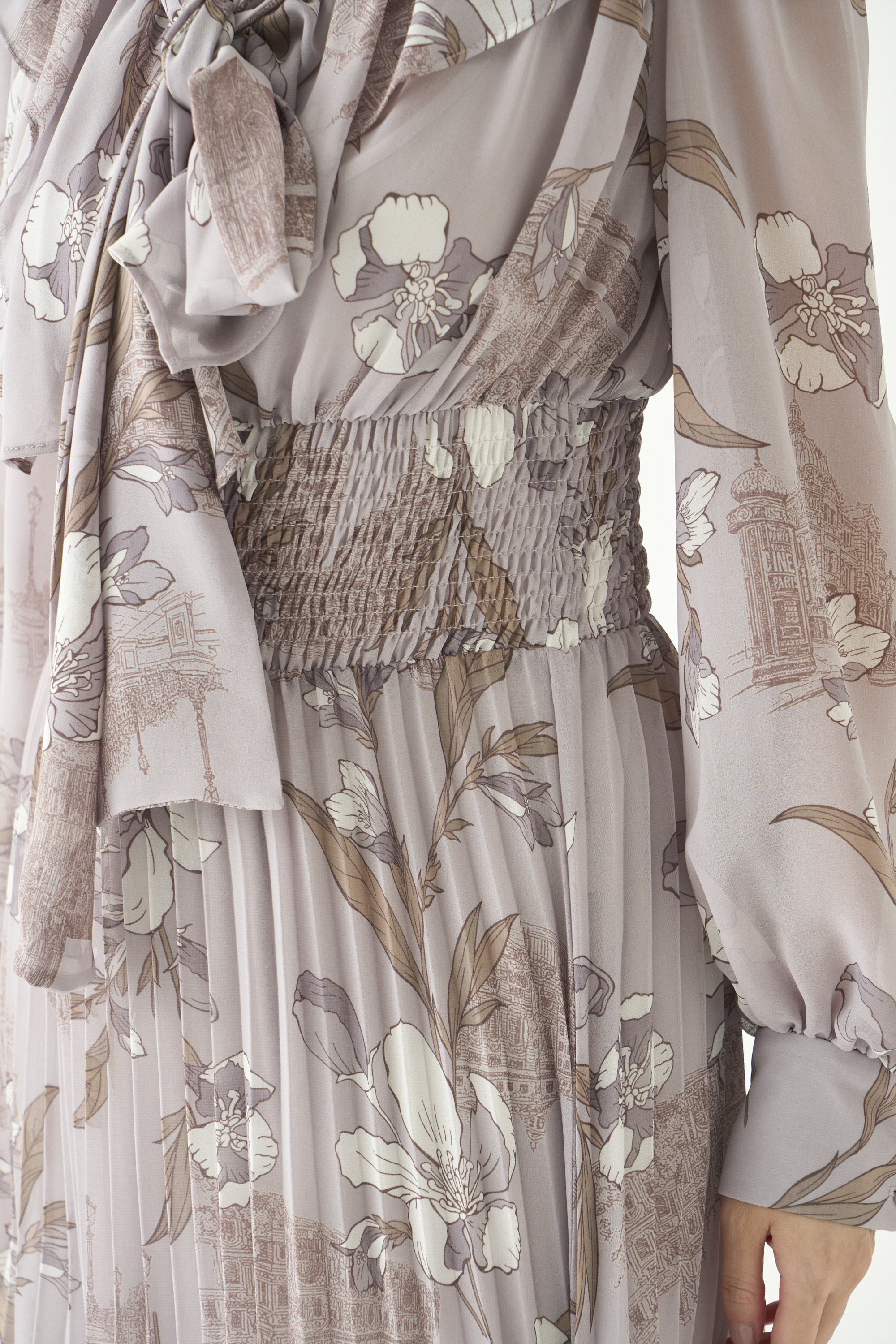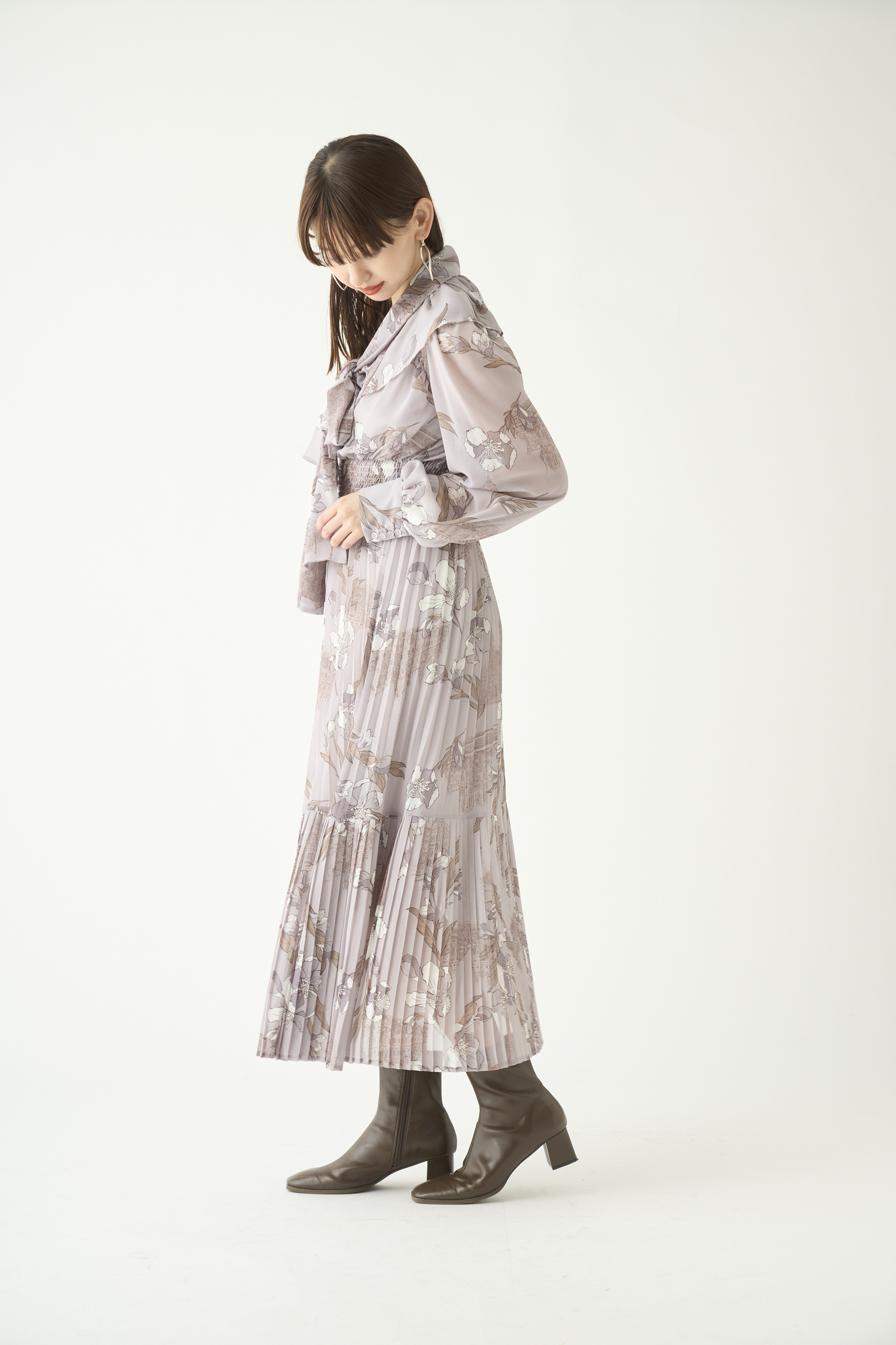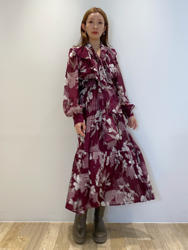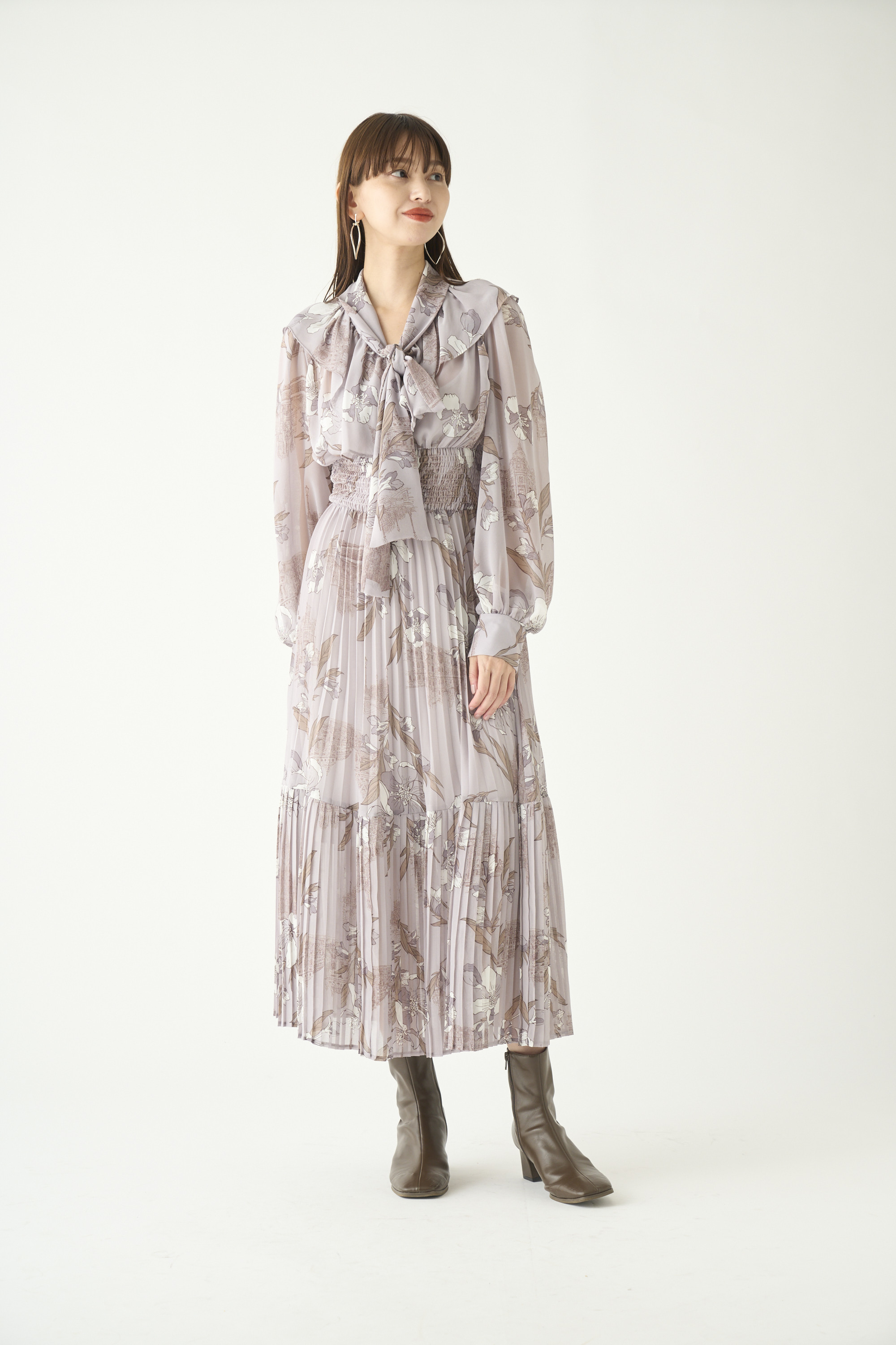 クラシカルな雰囲気の街並みを背景に花柄を組み合わせた新鮮なプリントが目を引くワンピース。ボウタイや大きめの襟、カフスなど、クラシカル要素を引き立てるディテールを詰め込みました。スカート部分には幅の異なる2種類のプリーツを効かせることで表情豊かな仕上がりに。ウエストにはゴムシャーリングを効かせているので伸縮性があり、ボディにフィットしながらも着心地は快適です。