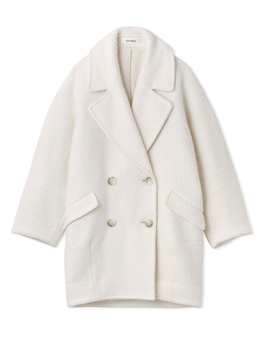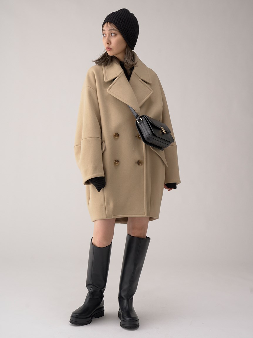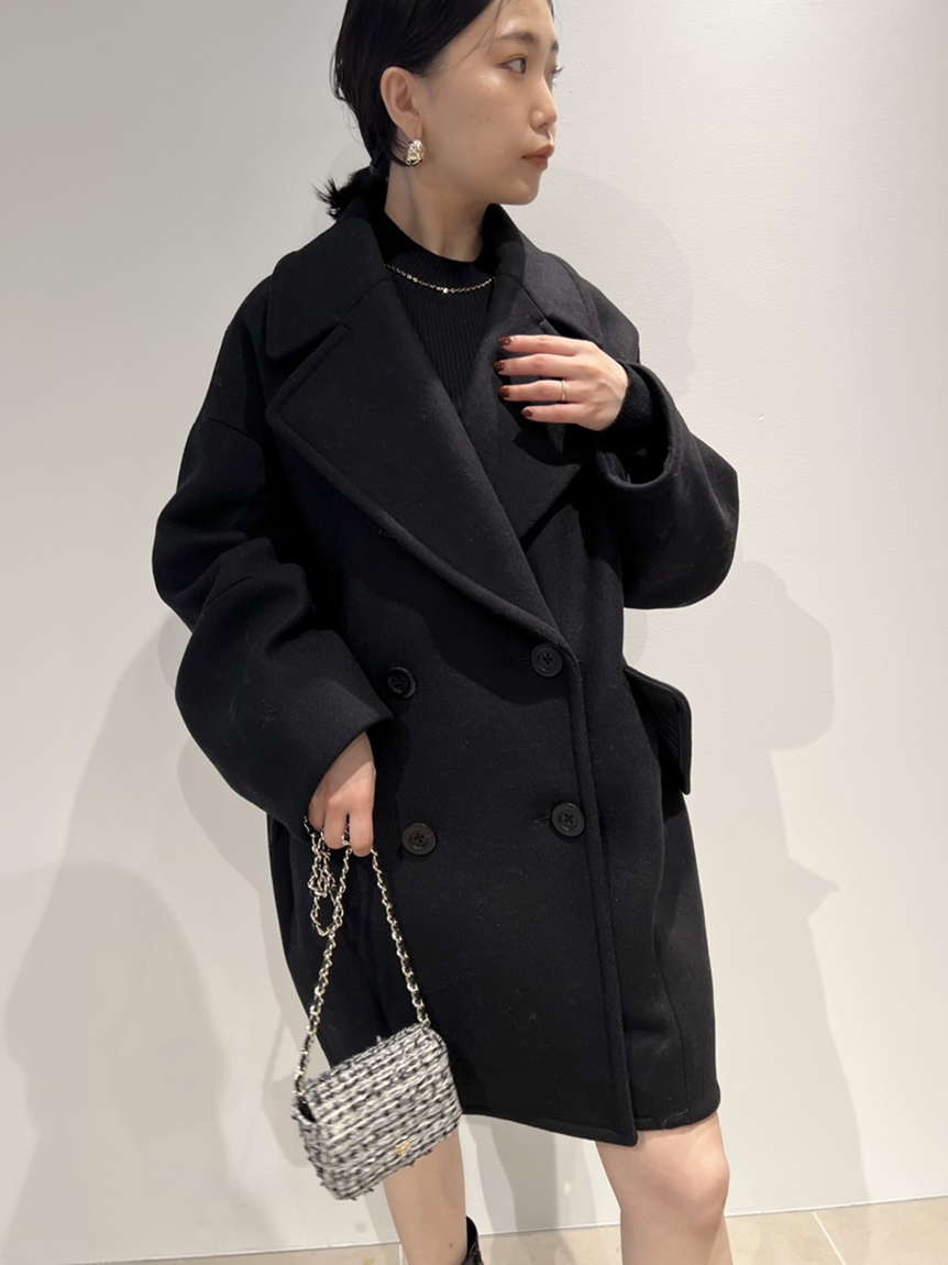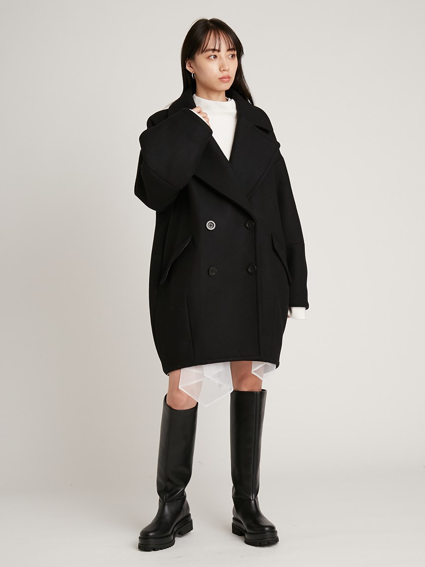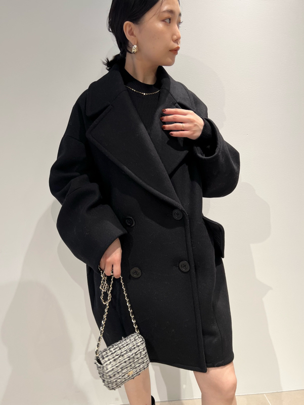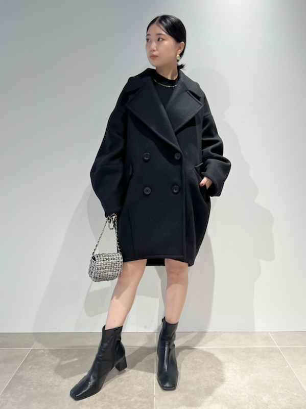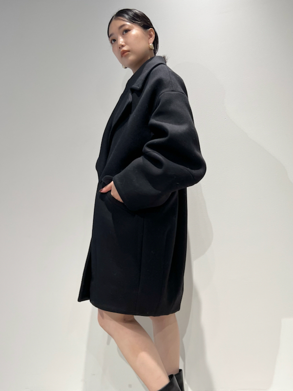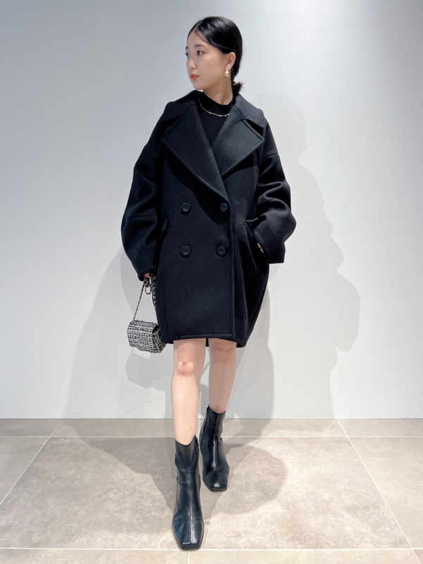 トレンドライクな構築的なシルエットが特徴的なミディ丈コート。フロントはハンサムなダブル仕様ながら、大ぶりな襟や丸みのあるシルエットが女性らしさを引き立てます。モード感はありつつも、着まわしやすいのも魅力。今年らしいミニ丈ボトムとロングブーツを合わせたトレンド感満載のスタイリングや裾からフレアやっぷりのスカートを覗かせるのもオススメです。