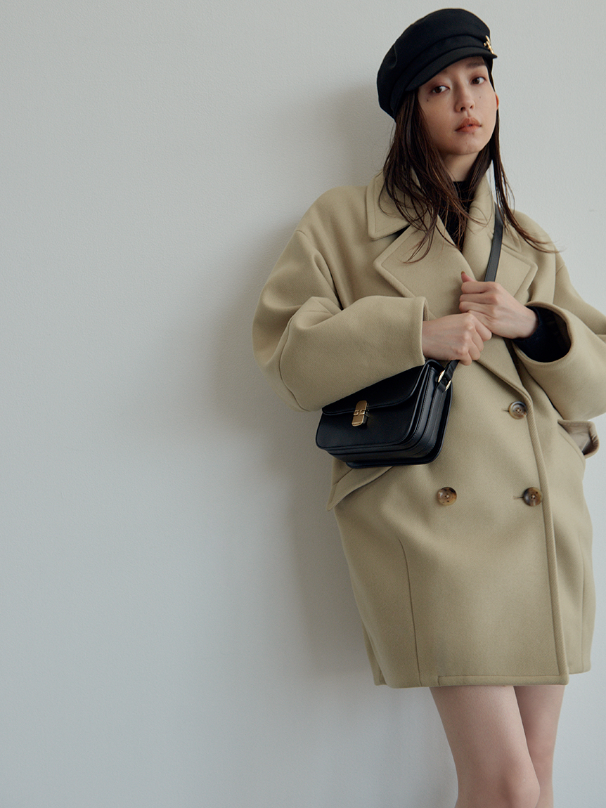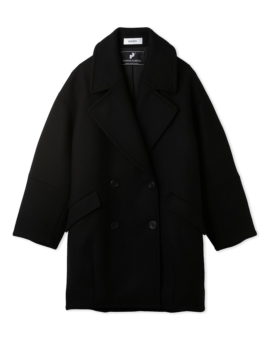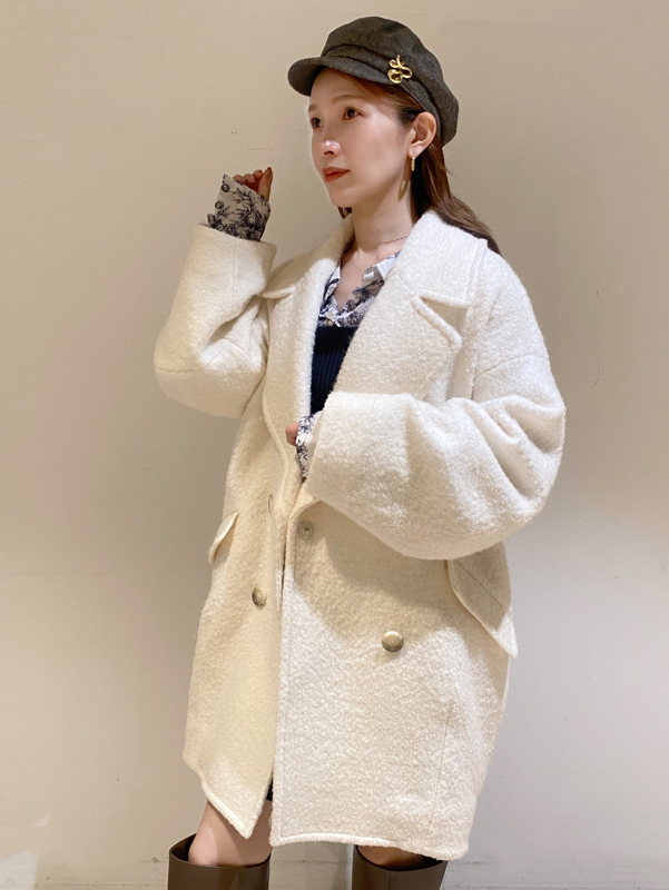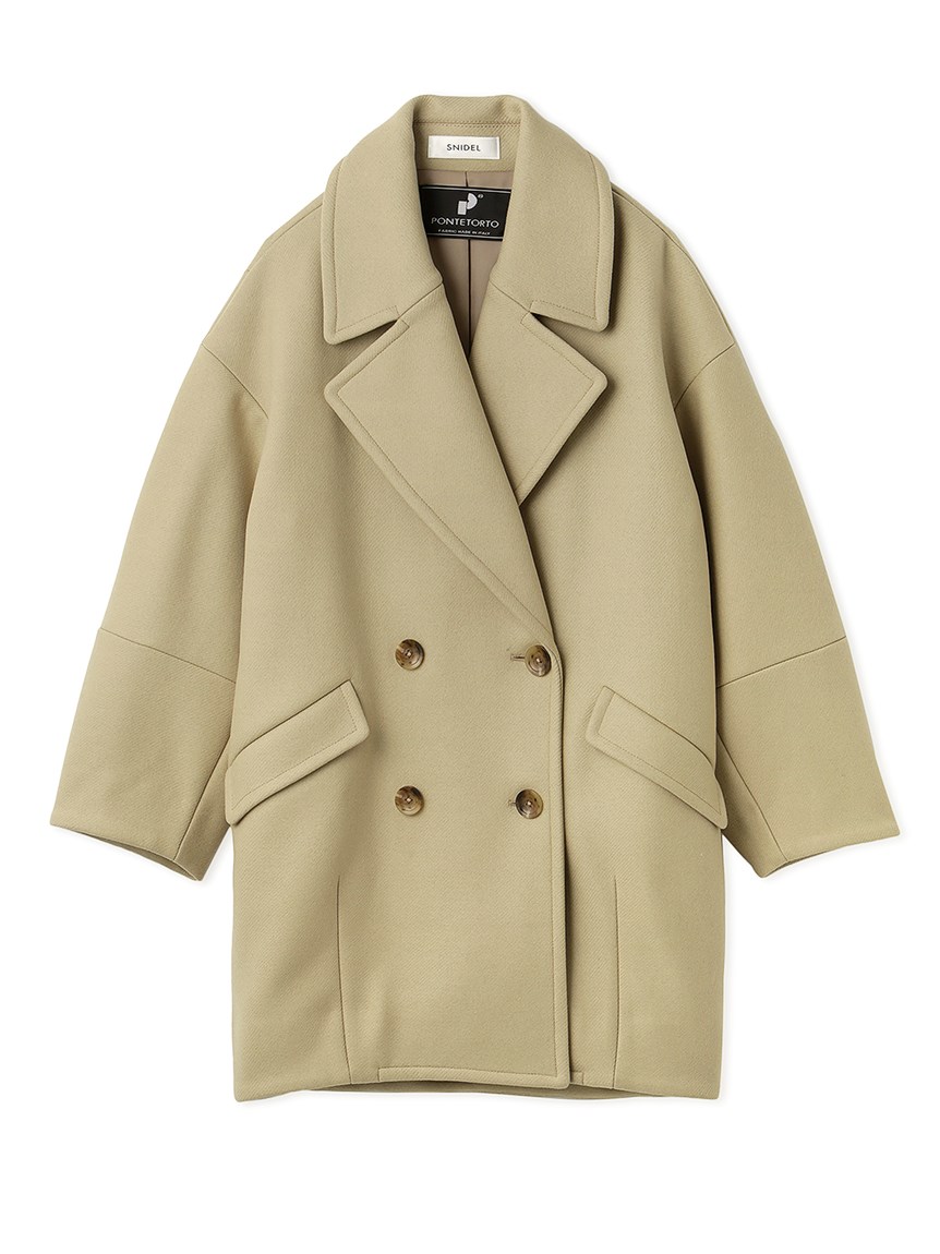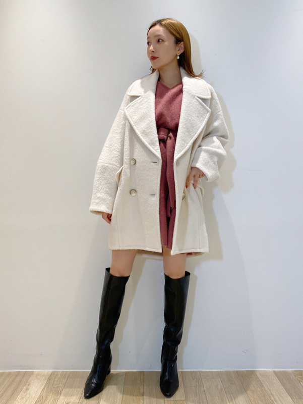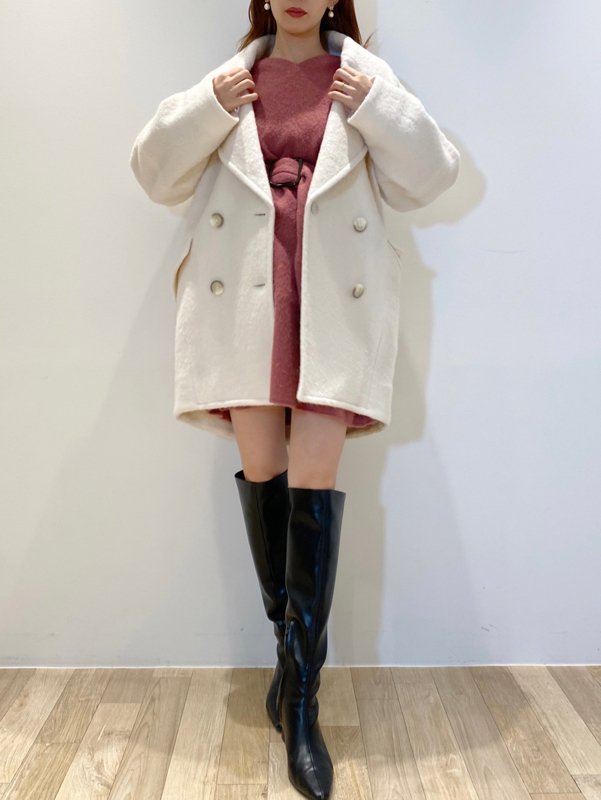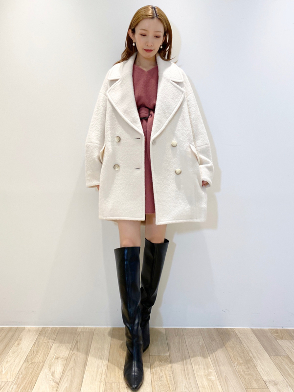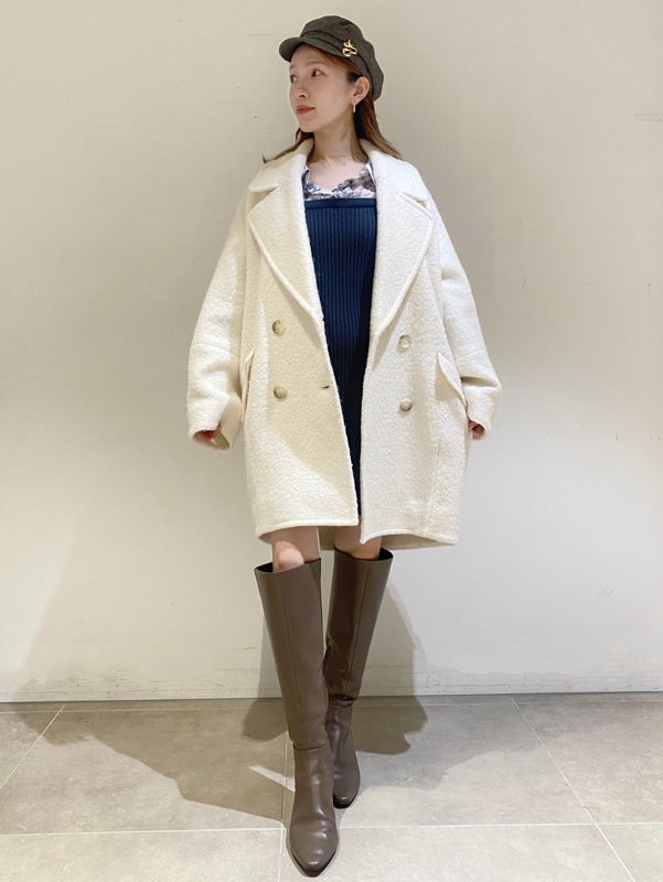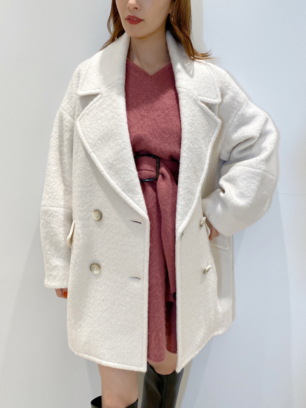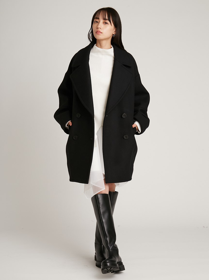 トレンドライクな構築的なシルエットが特徴的なミディ丈コート。フロントはハンサムなダブル仕様ながら、大ぶりな襟や丸みのあるシルエットが女性らしさを引き立てます。モード感はありつつも、着まわしやすいのも魅力。今年らしいミニ丈ボトムとロングブーツを合わせたトレンド感満載のスタイリングや裾からフレアやっぷりのスカートを覗かせるのもオススメです。