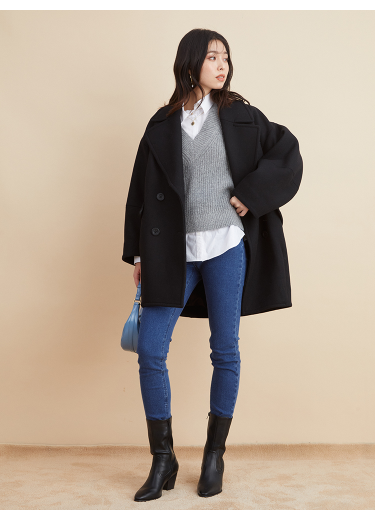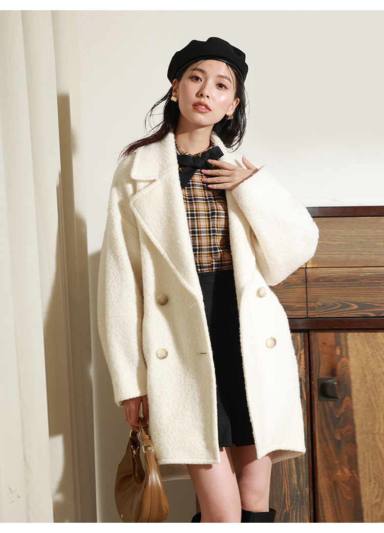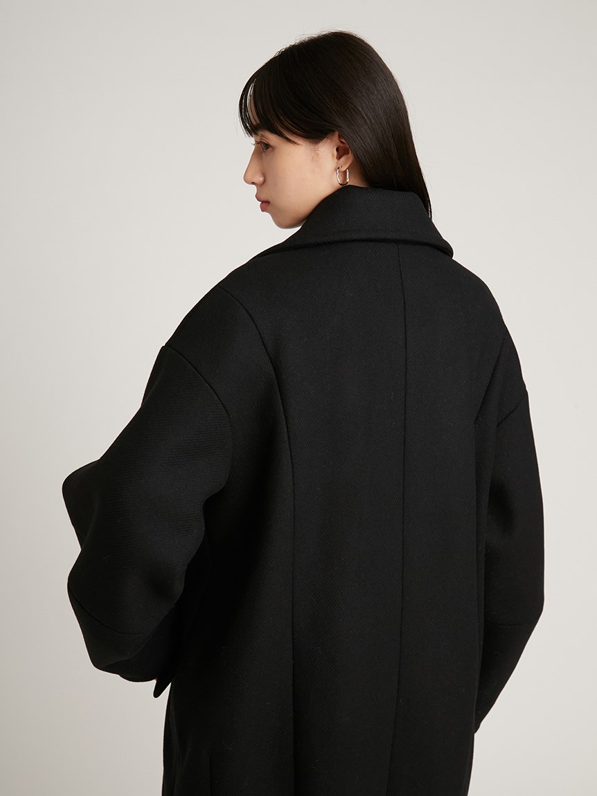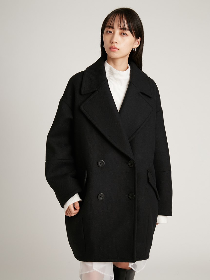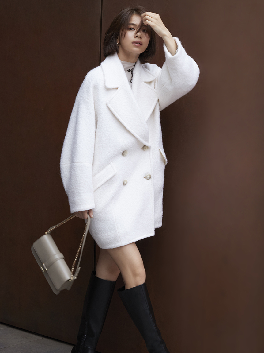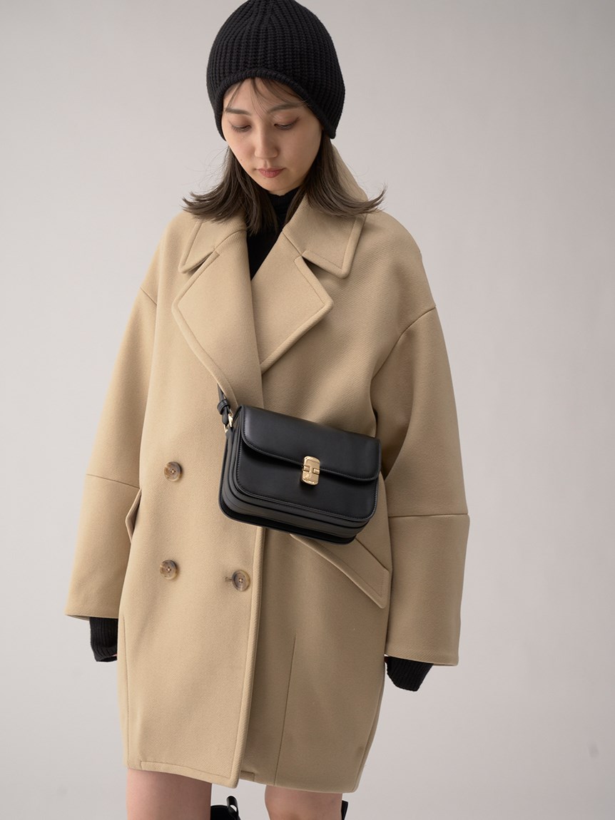 トレンドライクな構築的なシルエットが特徴的なミディ丈コート。フロントはハンサムなダブル仕様ながら、大ぶりな襟や丸みのあるシルエットが女性らしさを引き立てます。モード感はありつつも、着まわしやすいのも魅力。今年らしいミニ丈ボトムとロングブーツを合わせたトレンド感満載のスタイリングや裾からフレアやっぷりのスカートを覗かせるのもオススメです。