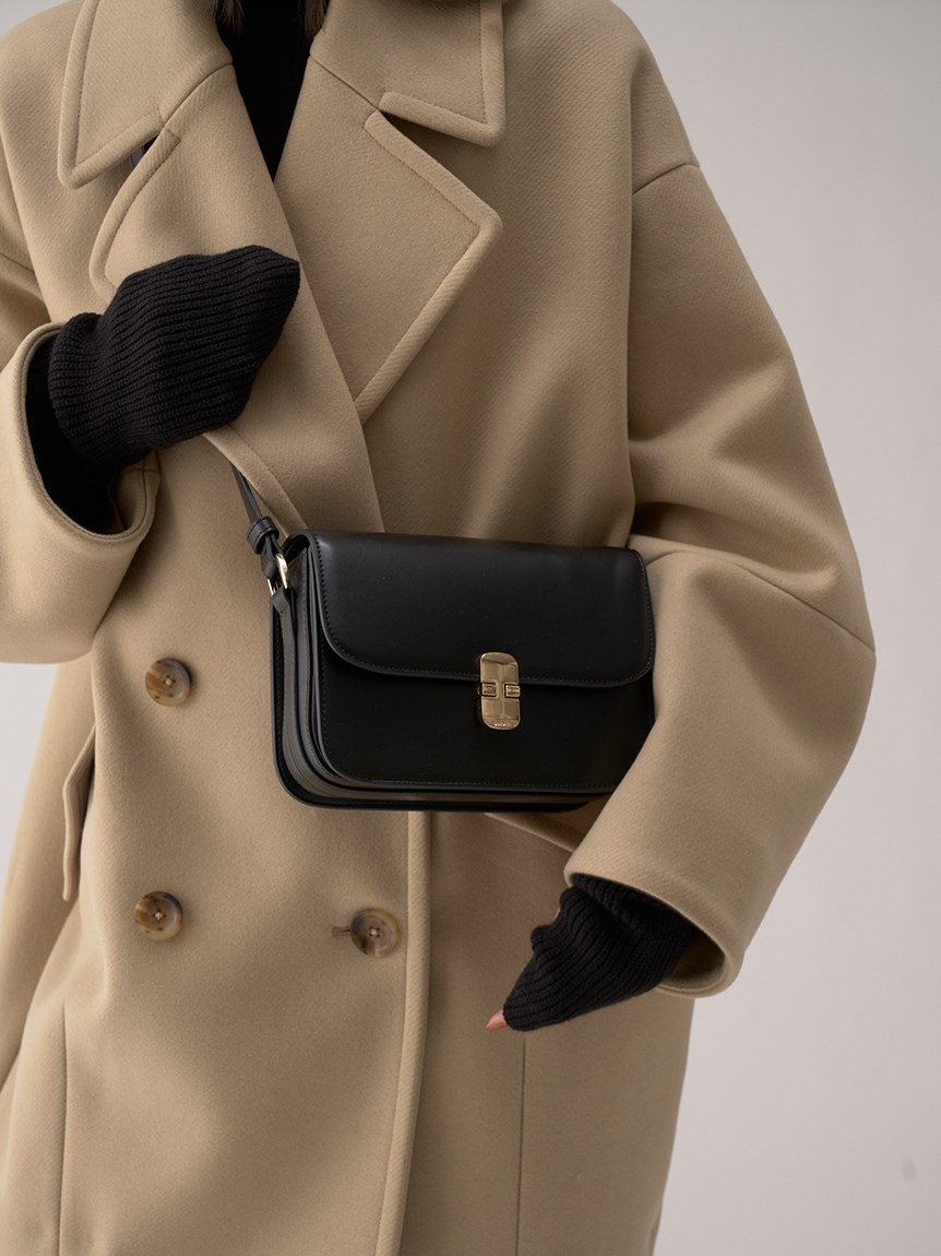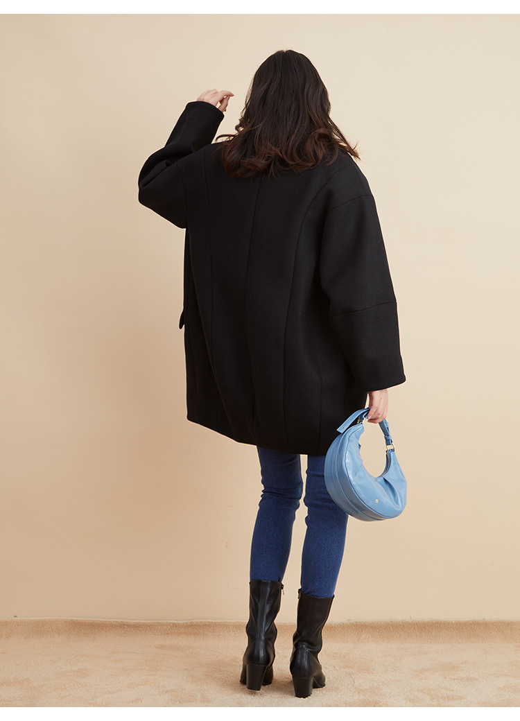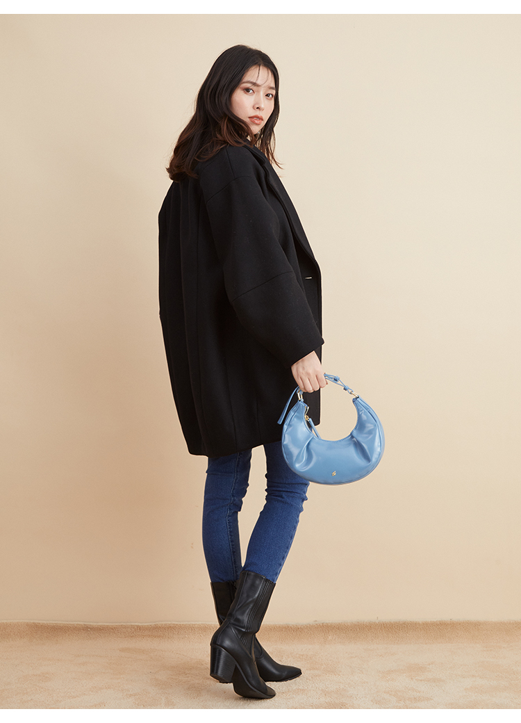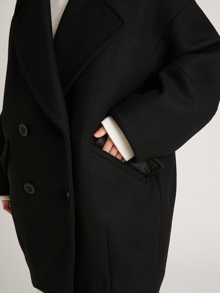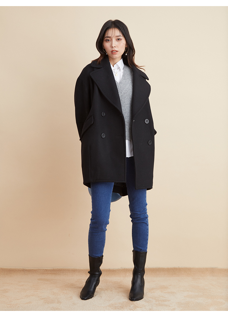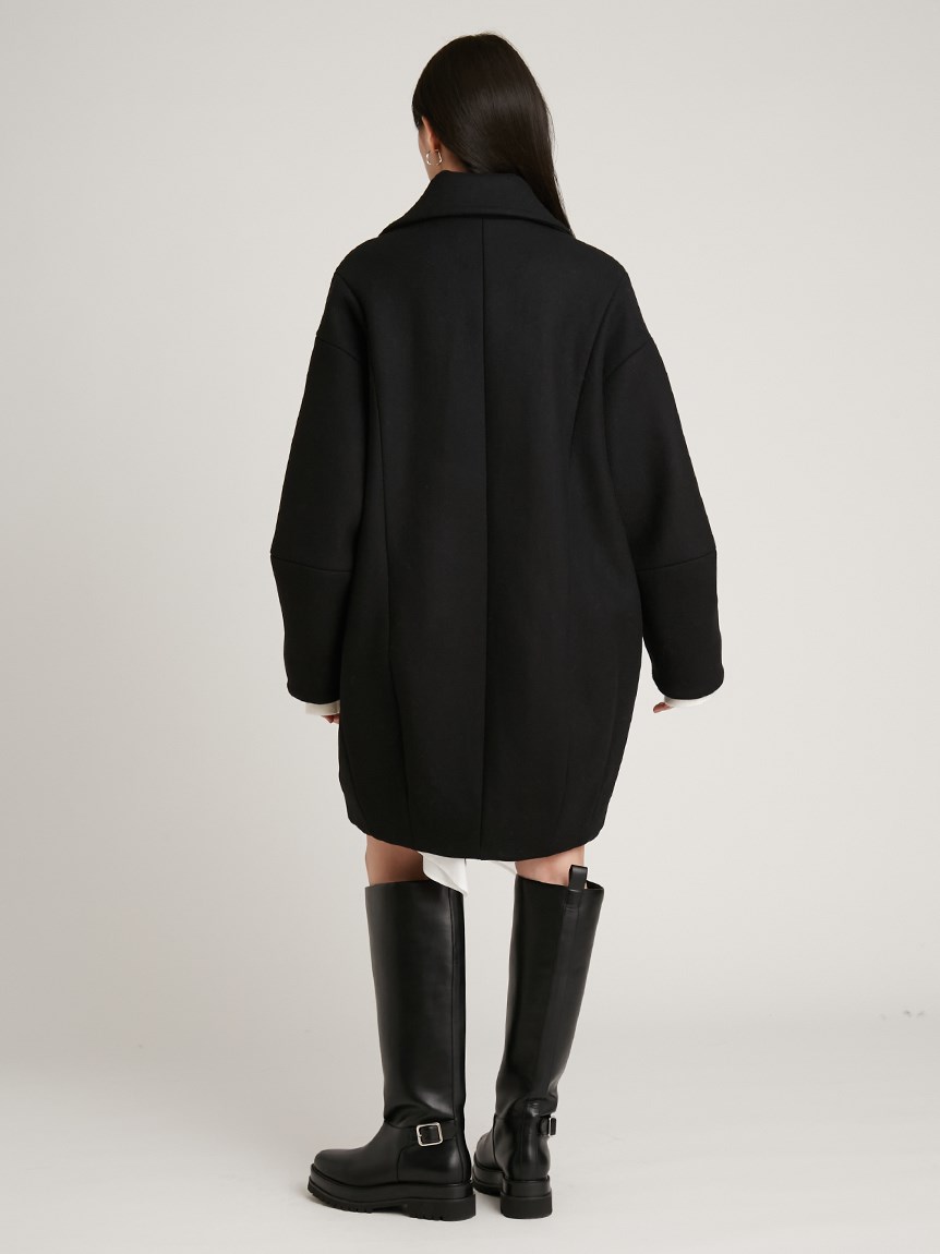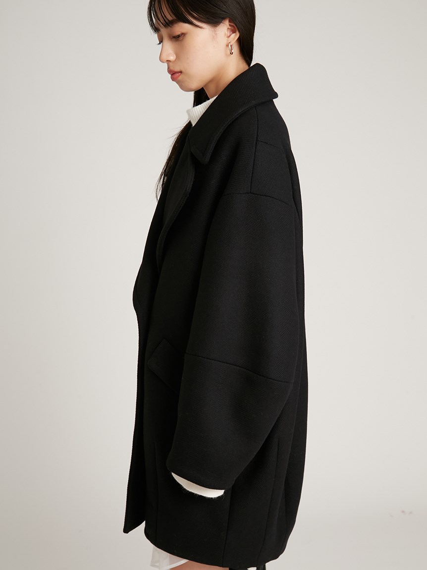 トレンドライクな構築的なシルエットが特徴的なミディ丈コート。フロントはハンサムなダブル仕様ながら、大ぶりな襟や丸みのあるシルエットが女性らしさを引き立てます。モード感はありつつも、着まわしやすいのも魅力。今年らしいミニ丈ボトムとロングブーツを合わせたトレンド感満載のスタイリングや裾からフレアやっぷりのスカートを覗かせるのもオススメです。