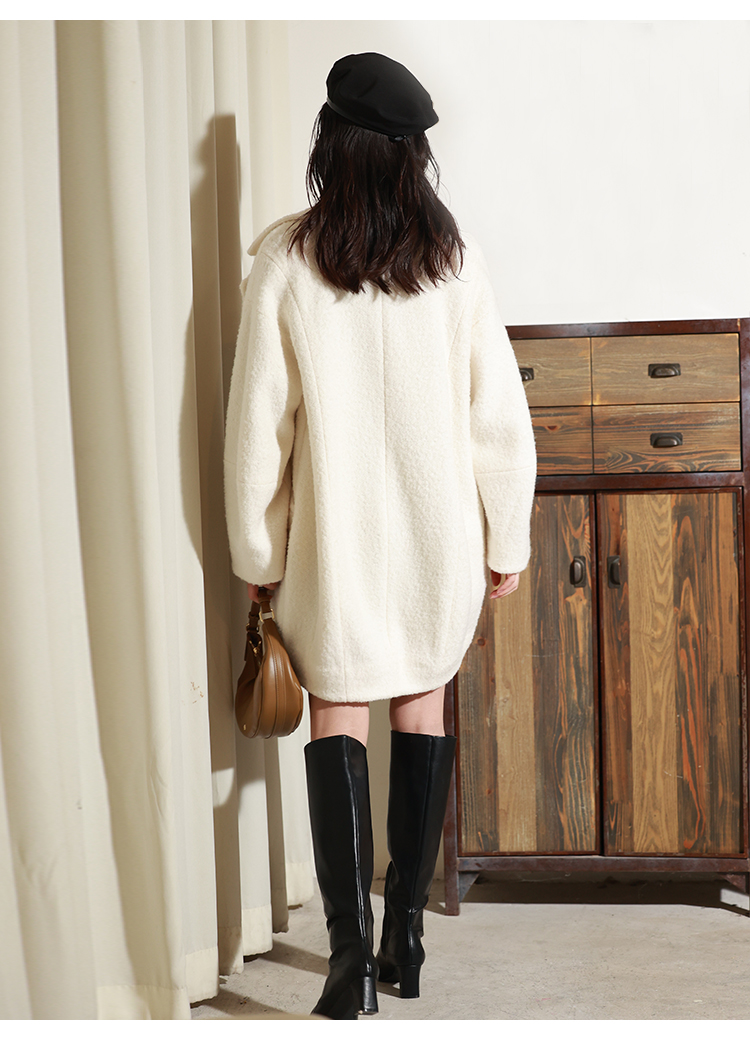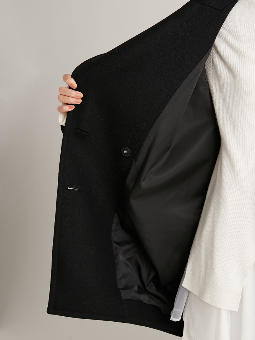 重厚感とハリ感のあるポンテトルト社のウールベースのイタリー生地を使用したブラックとイエロー、ボア調の表情感のある素材を使用したアイボリーの3色展開。さらにブラックは再生ウール原料のサステナブル素材を使用しています。