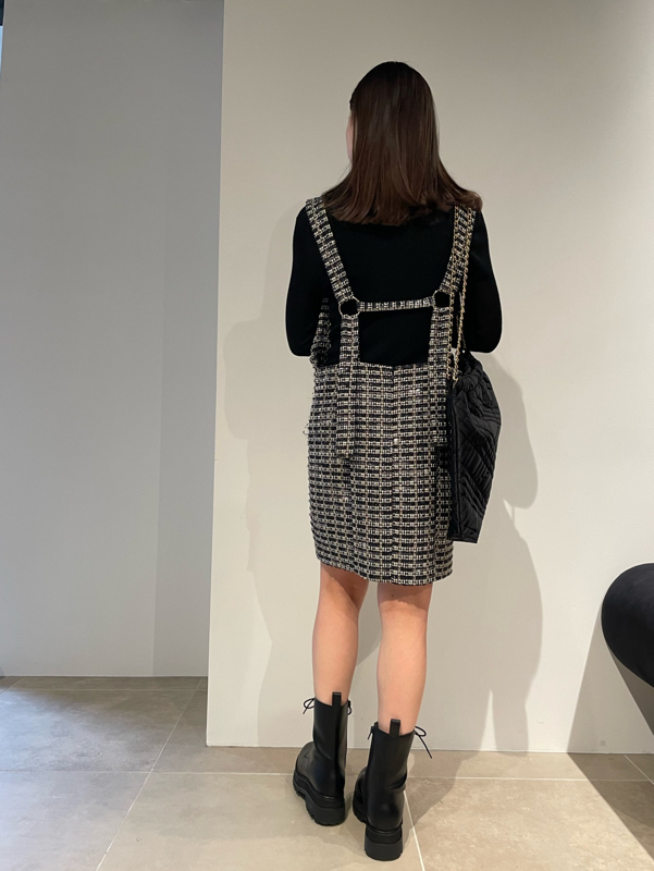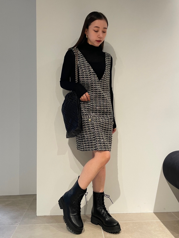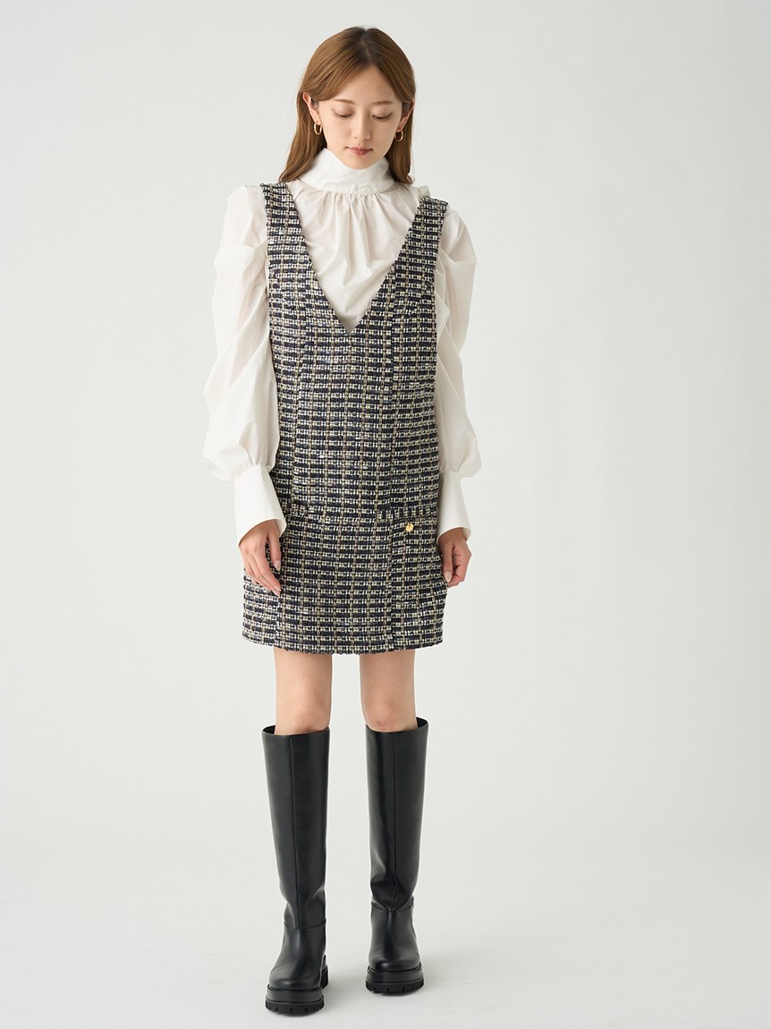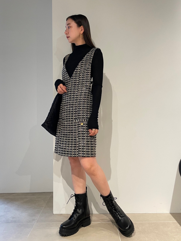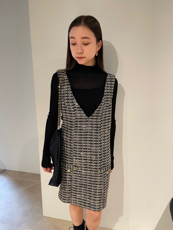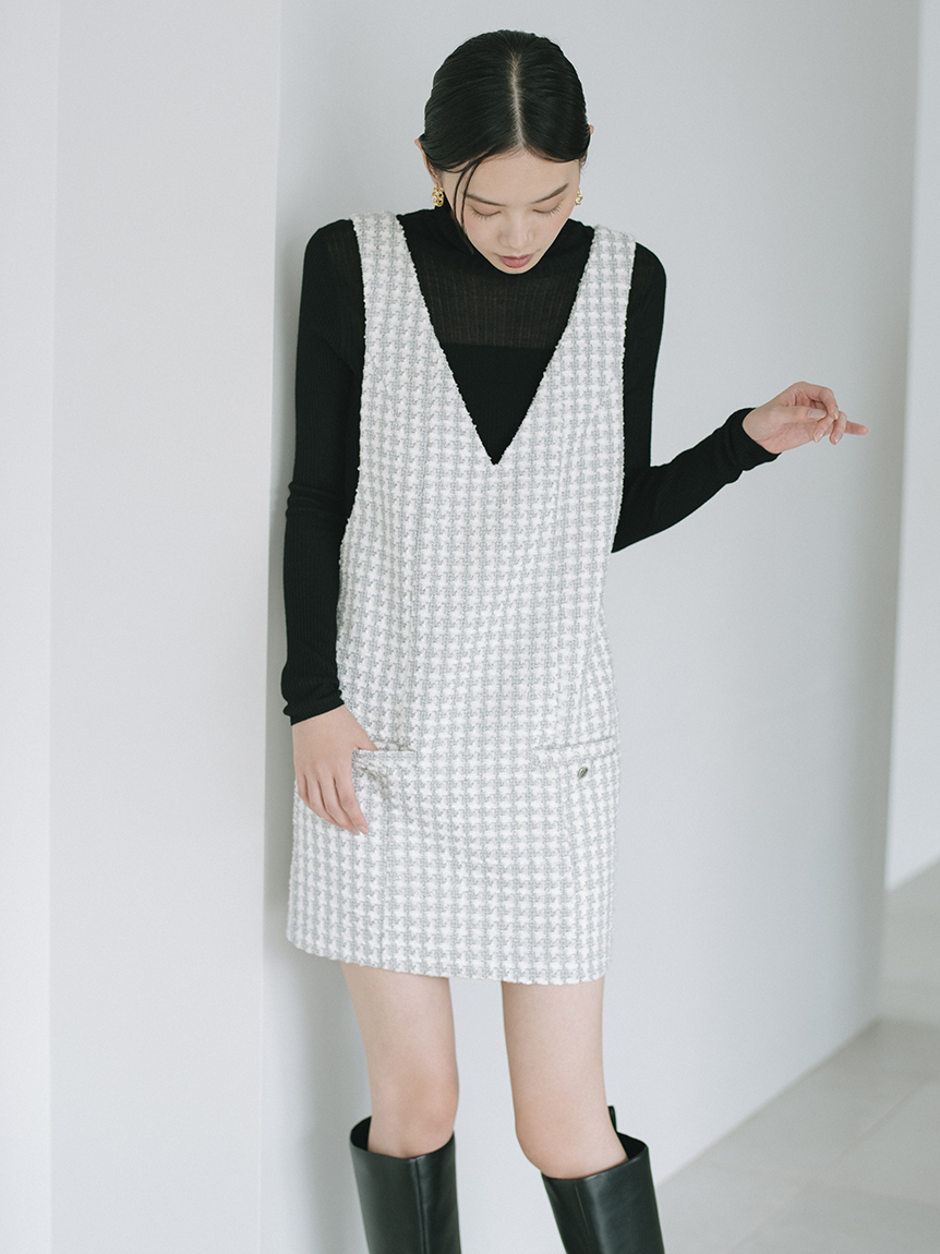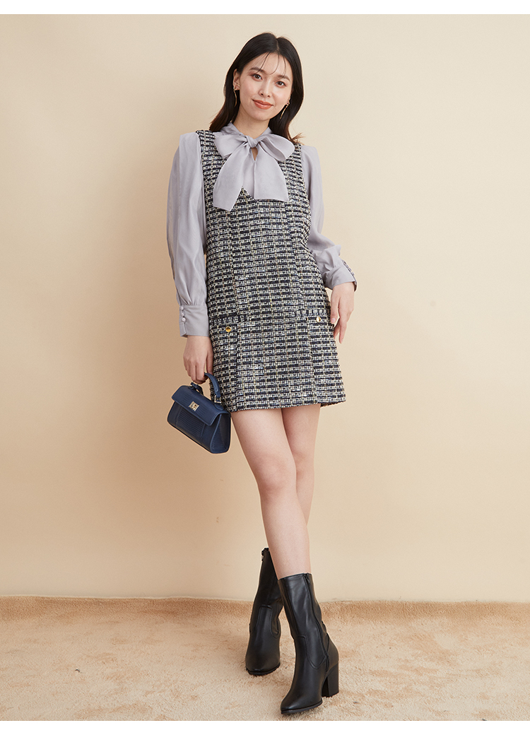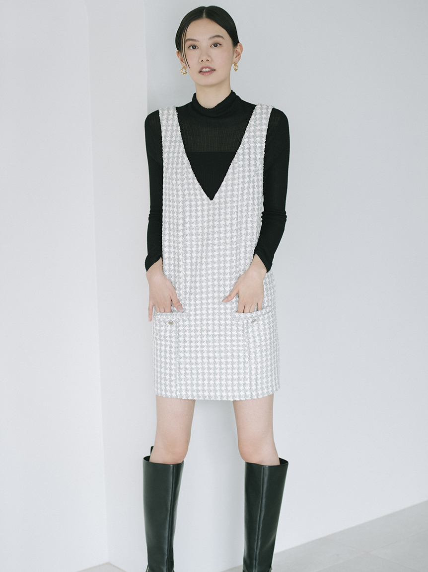 クラシカルなムードが漂うミニワンピースは、重ね着に最適な深いVネックが特徴。今季らしいボックスシルエットは切り替えディテールでシルエットを構築しています。合わせるインナーによってカジュアルにもきれいめにも着られる万能なデザイン。ストラップの長さを変えて丈の調節も可能なので、幅広い層にご着用いただける1着です。