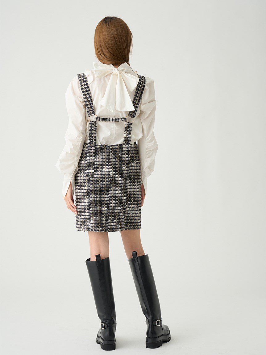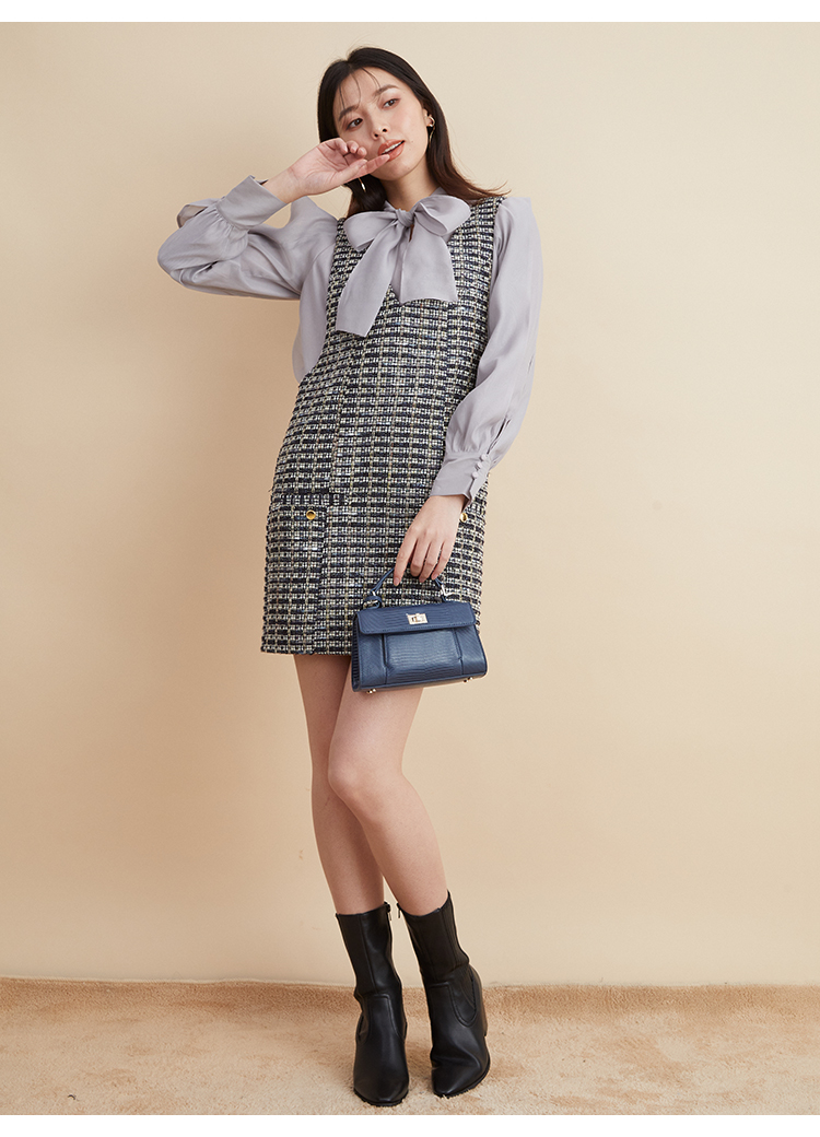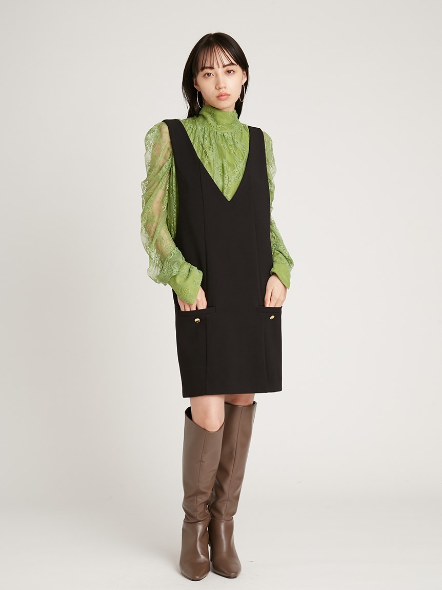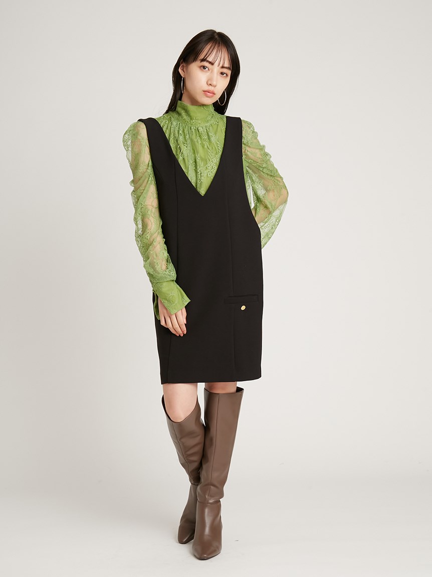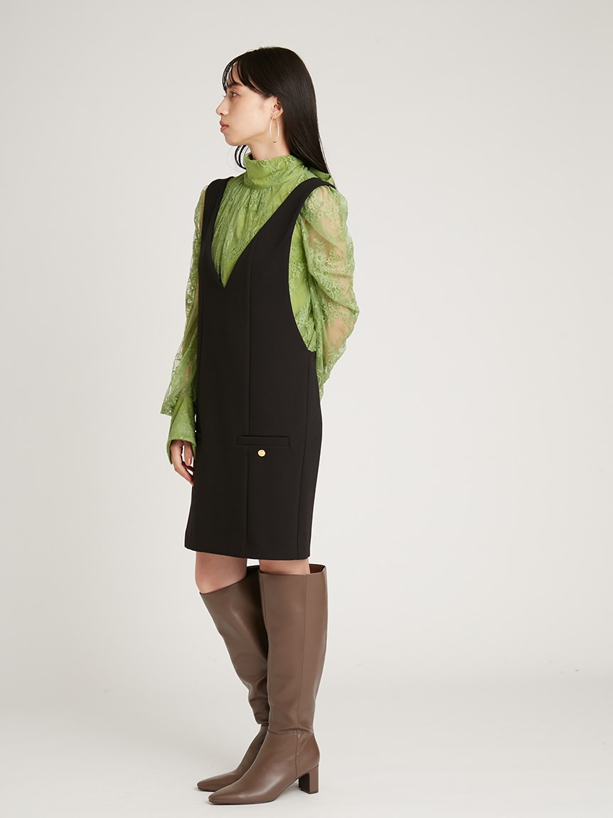 クラシカルなムードが漂うミニワンピースは、重ね着に最適な深いVネックが特徴。今季らしいボックスシルエットは切り替えディテールでシルエットを構築しています。合わせるインナーによってカジュアルにもきれいめにも着られる万能なデザイン。ストラップの長さを変えて丈の調節も可能なので、幅広い層にご着用いただける1着です。