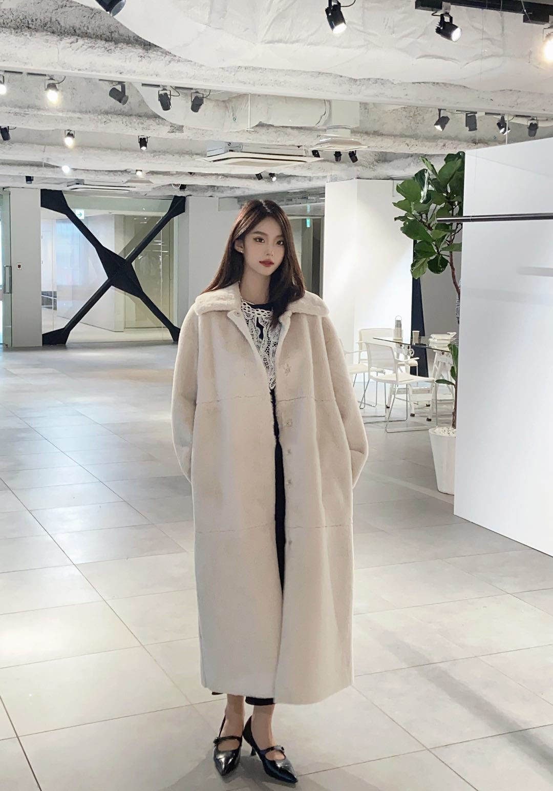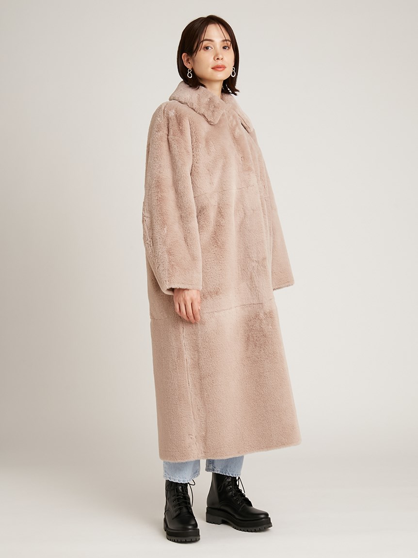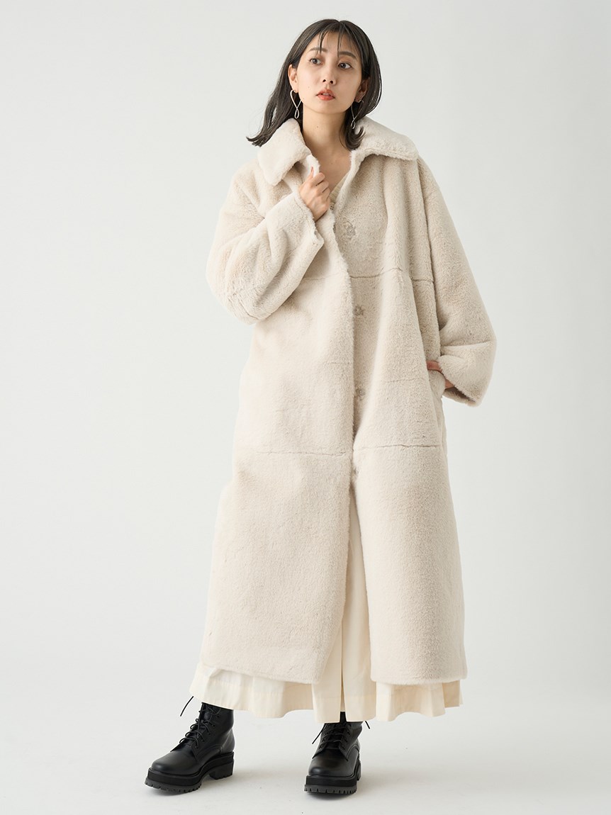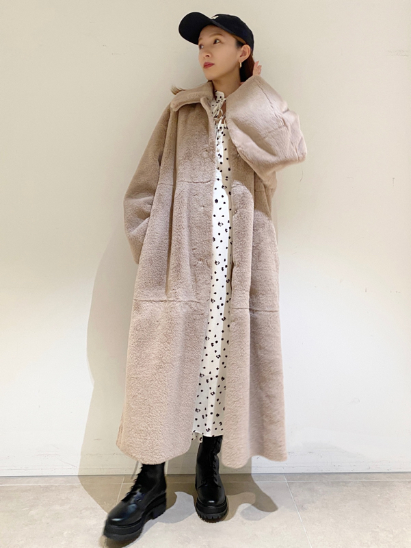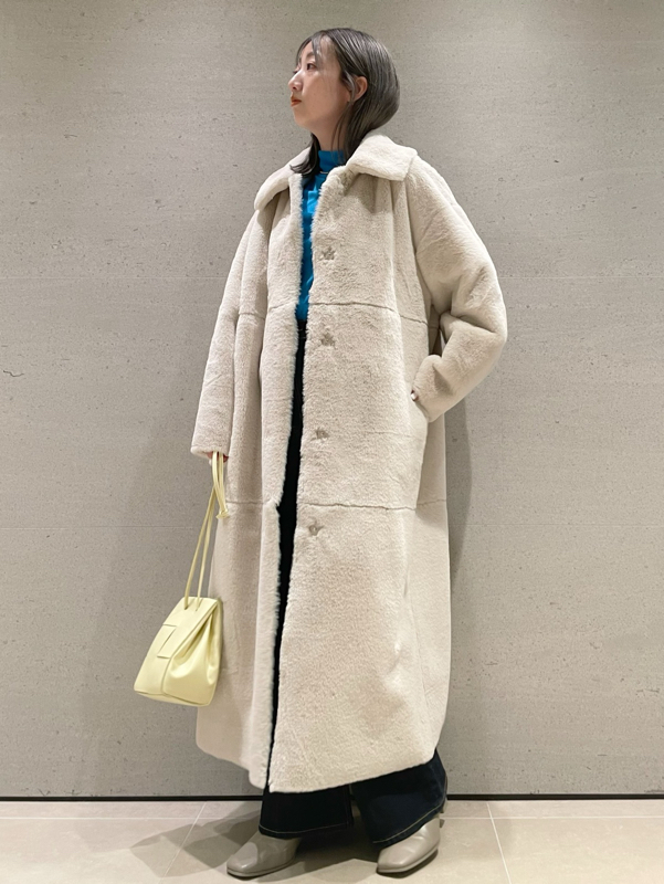 表地のファーはリサイクルポリエステル100%使用。裏地にフェイクスエードを張り合わせ、軽い着心地に仕立てました。優しい色合いで着まわしやすいアイボリー、ピンクベージュに、鮮やかな色合いで差し色にぴったりなブルーを加えた3色をご用意。
