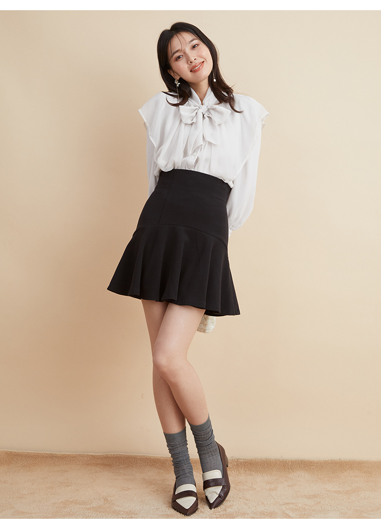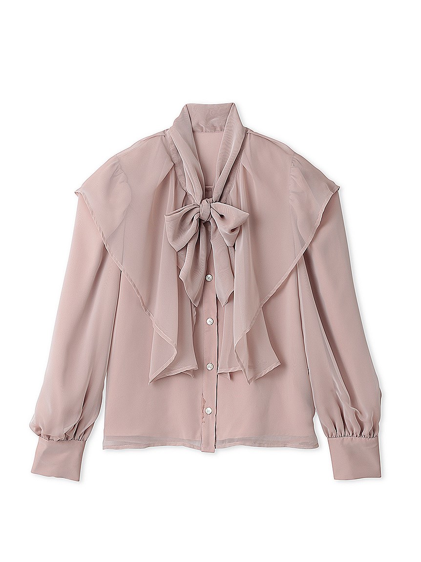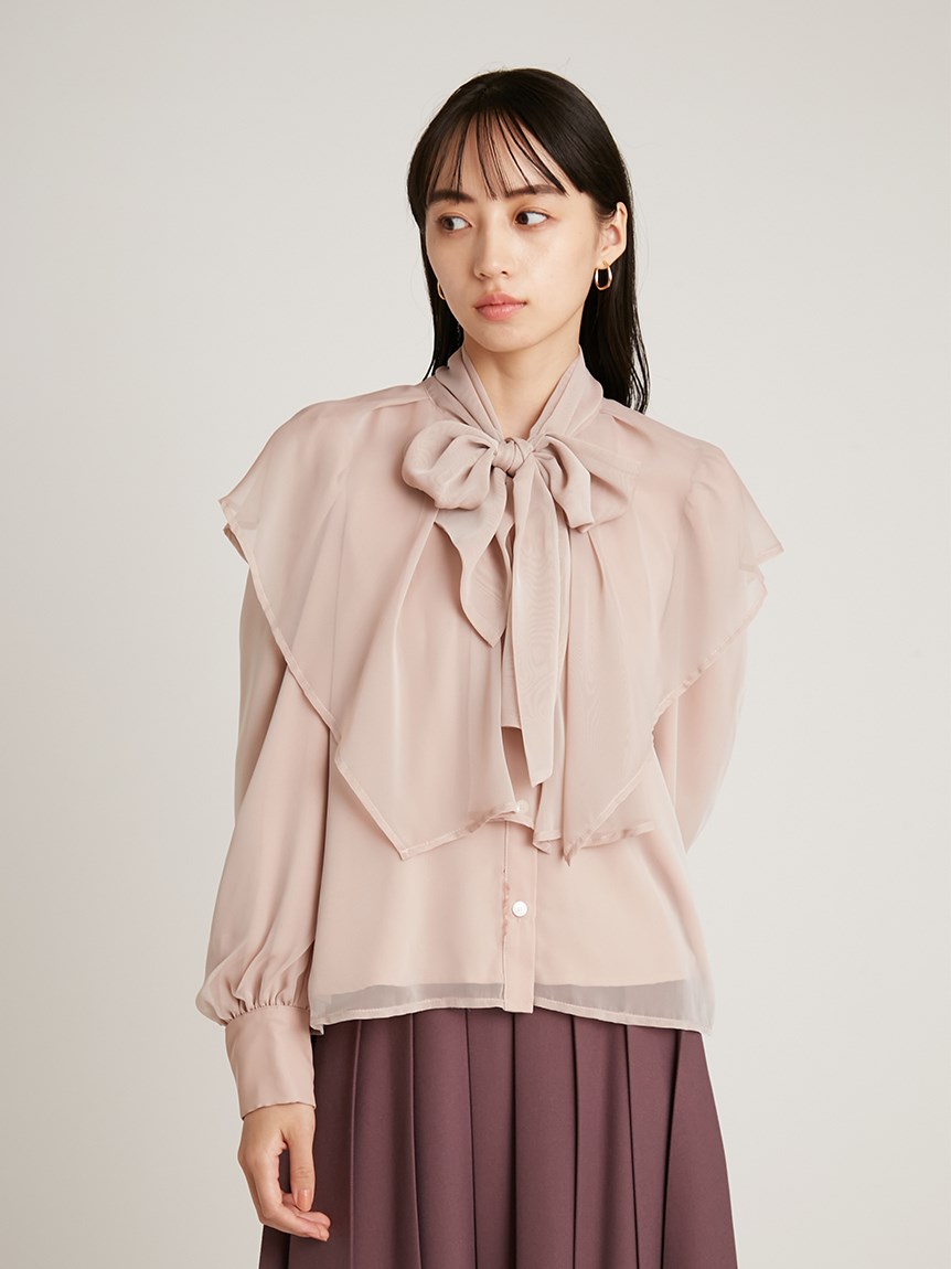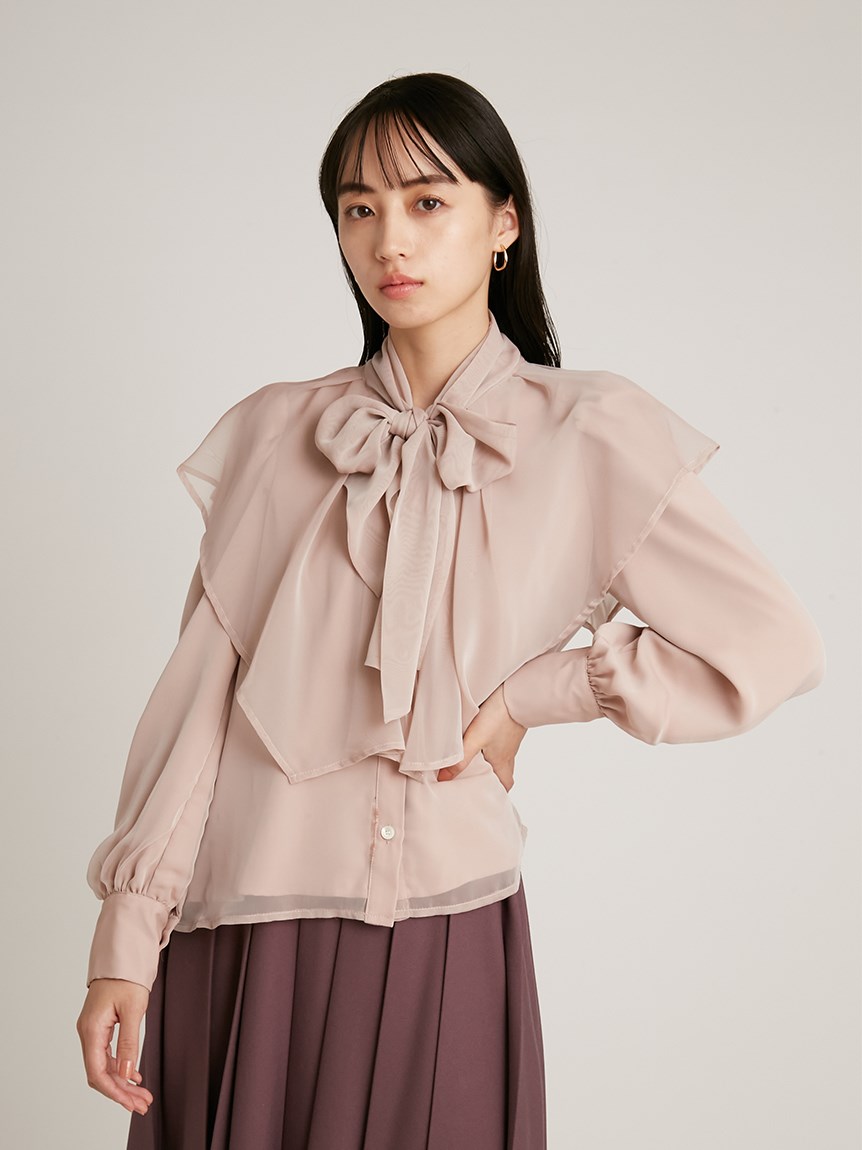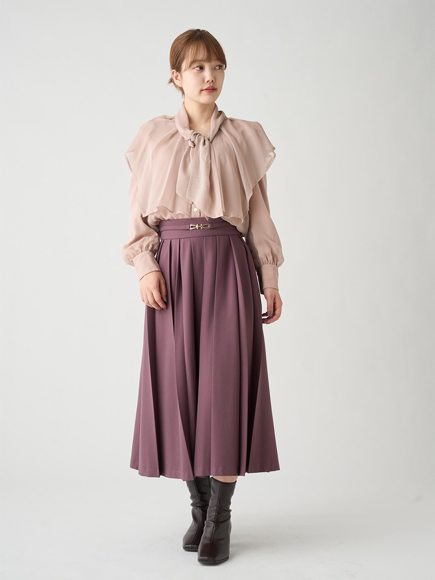 エレガントに波打つ大きめのデザインカラーが印象的なブラウス。首元から垂らしたボウタイも相まって、女性らしさを高めてくれる上品な1着です。軽やかな素材感ながら総裏仕様なので1枚でも着用可能。ビット付きプリーツスカート(SWFS225140)と合わせた王道クラシカルなスタイリングがオススメです。