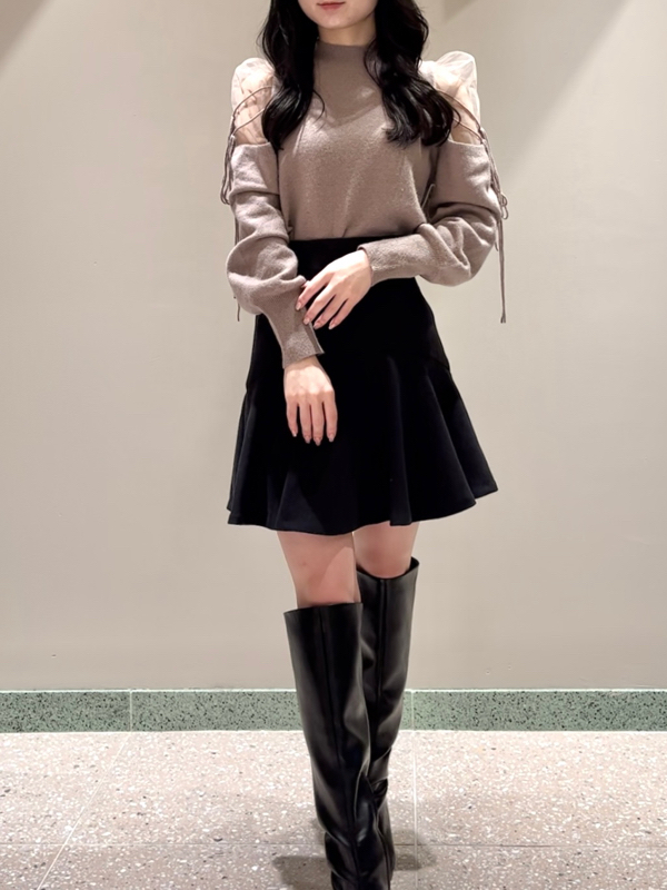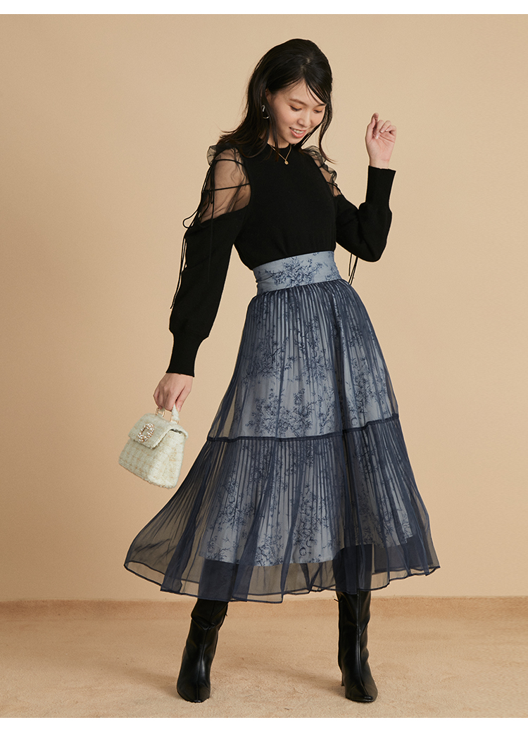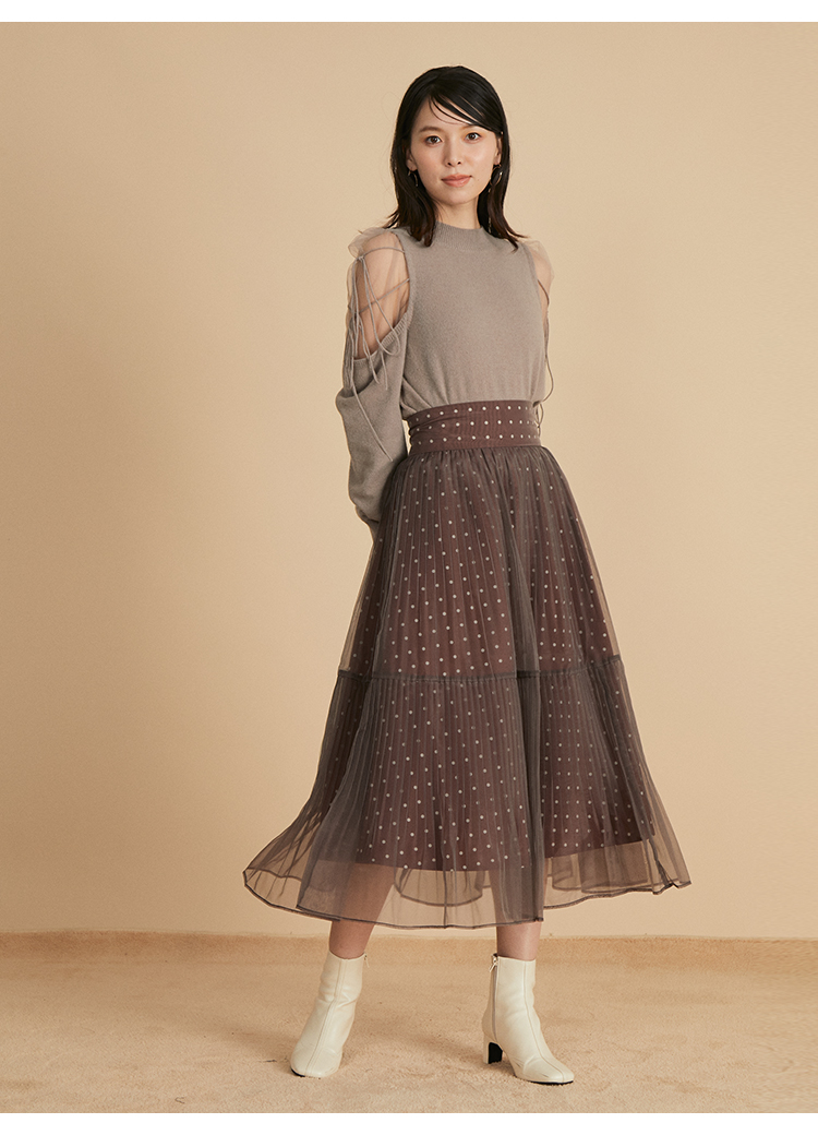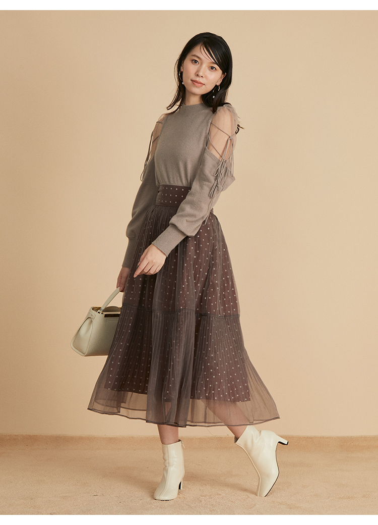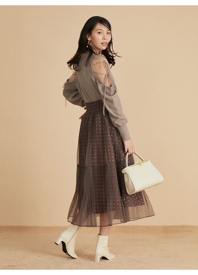 リサイクルナイロンを用いたサステナブルなニットとシアーなオーガンジーを組み合わせました。アイボリー、ブラック、モカの着まわしやすいベーシックなカラー展開でお届けします。