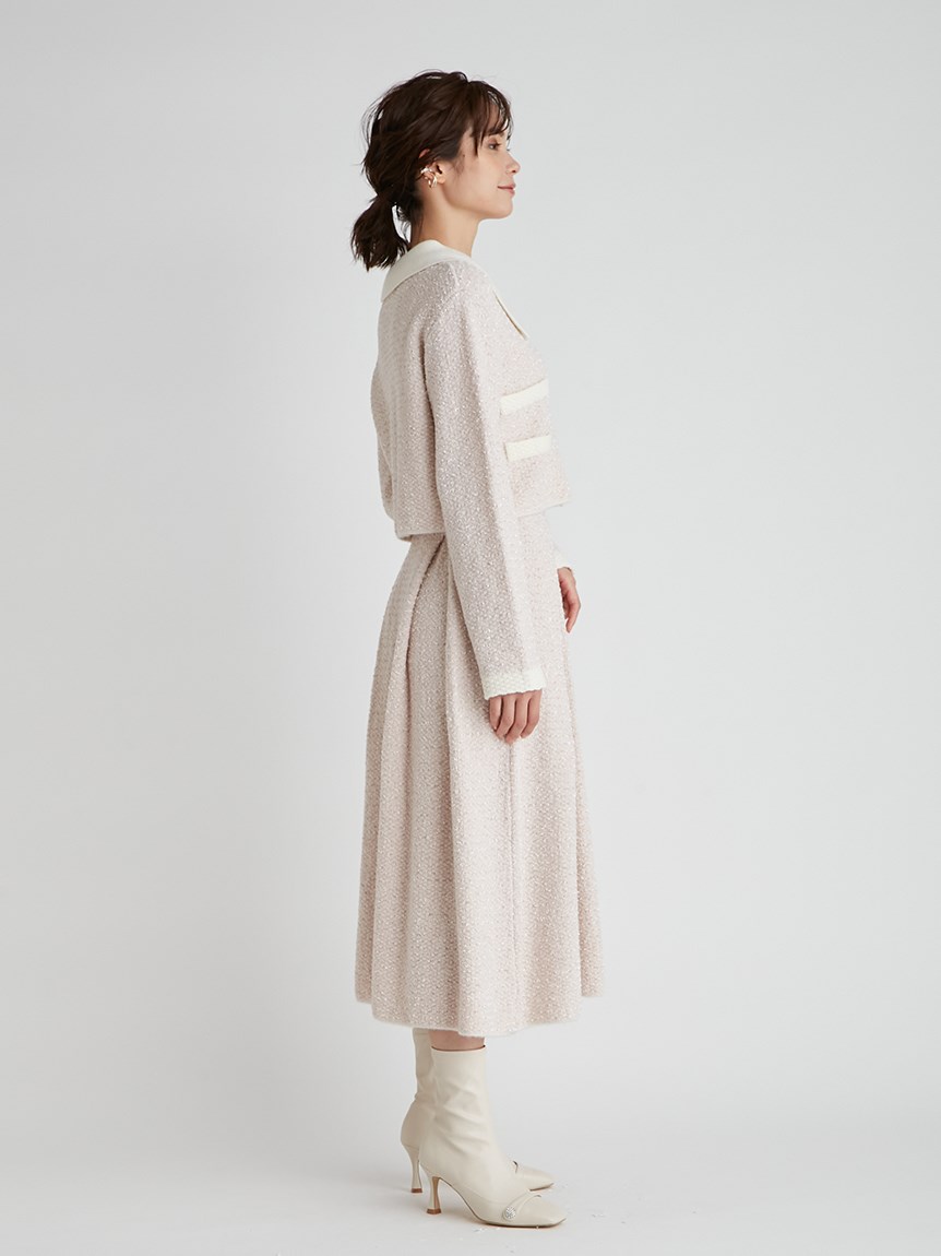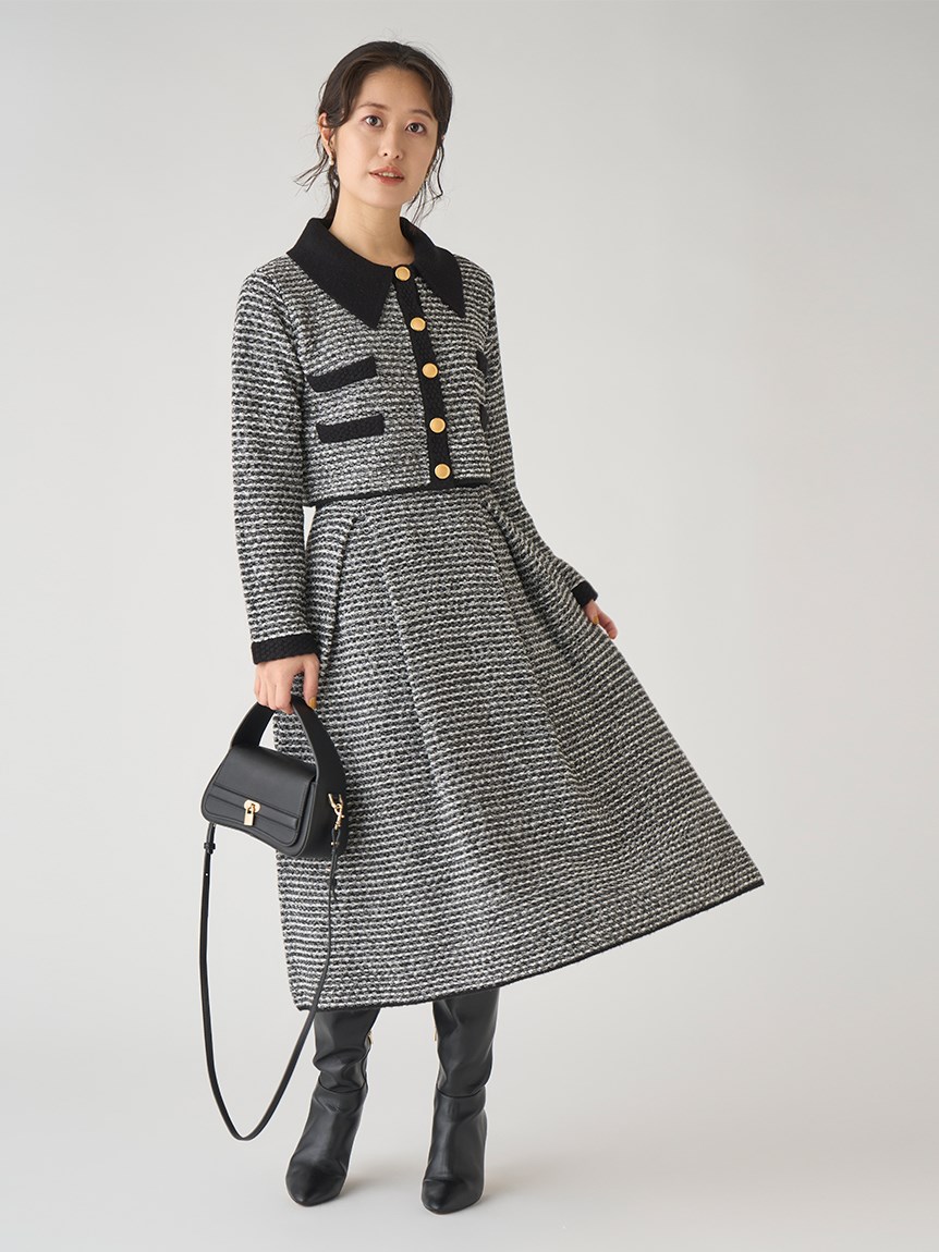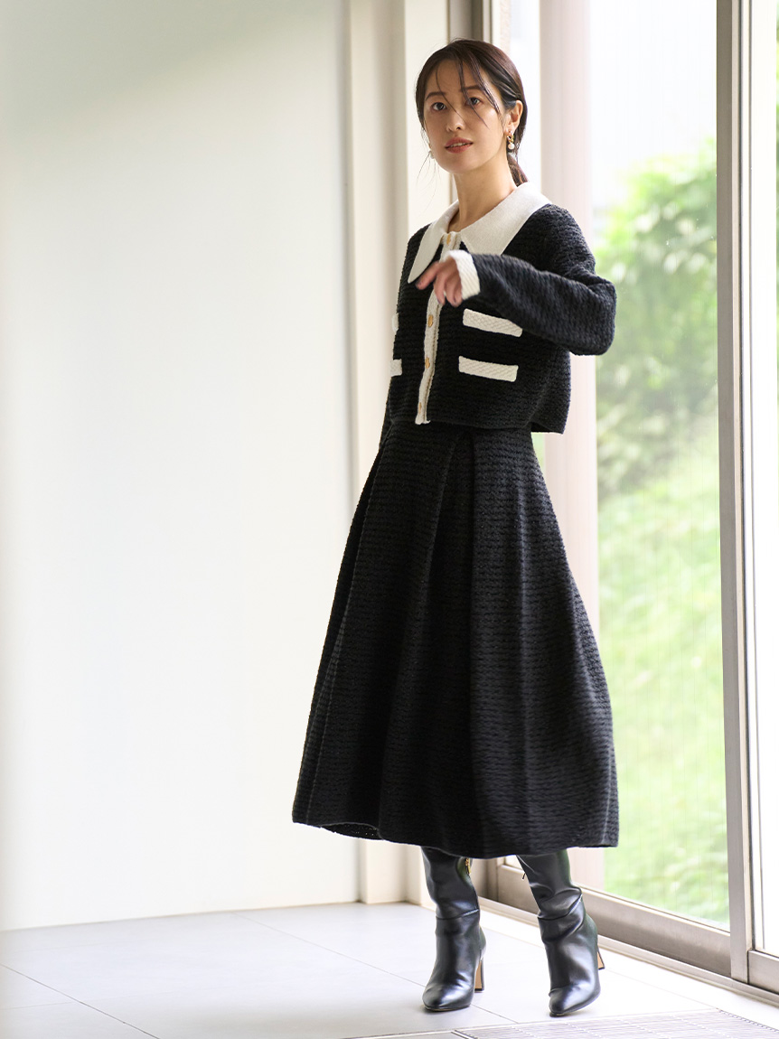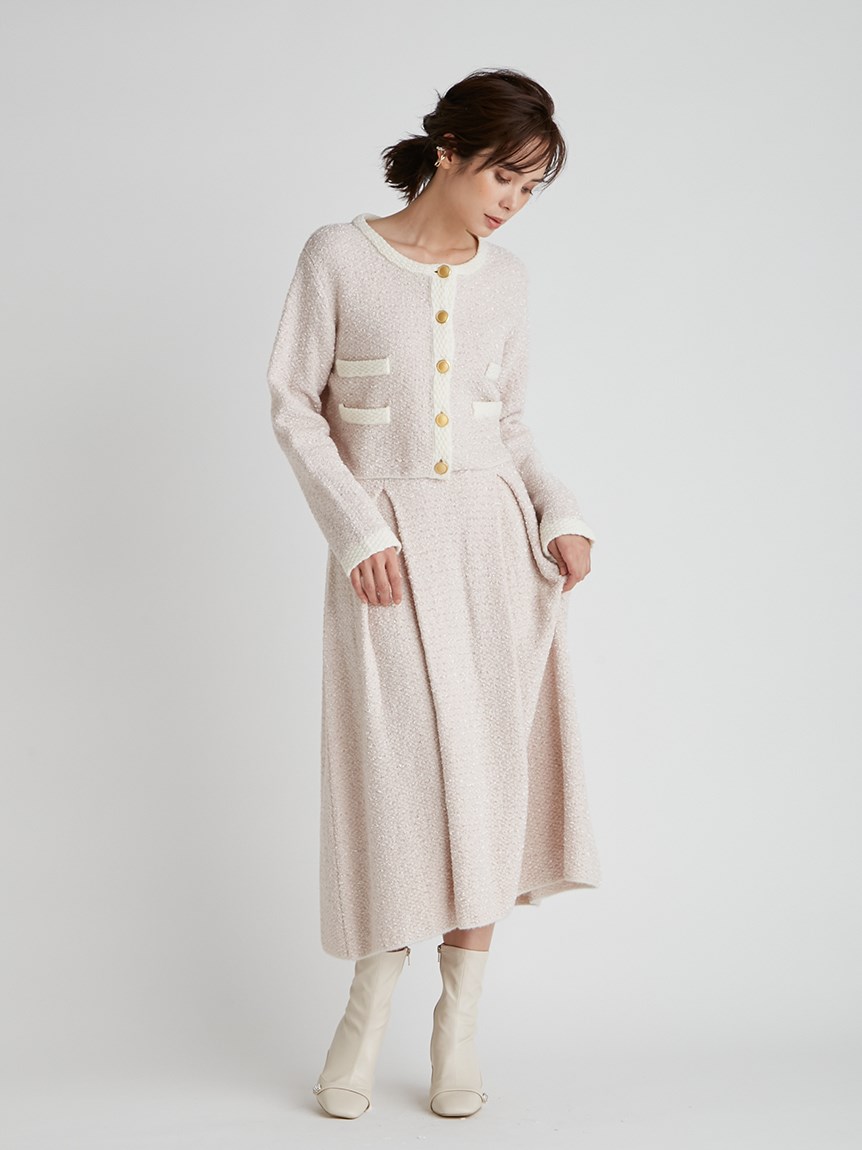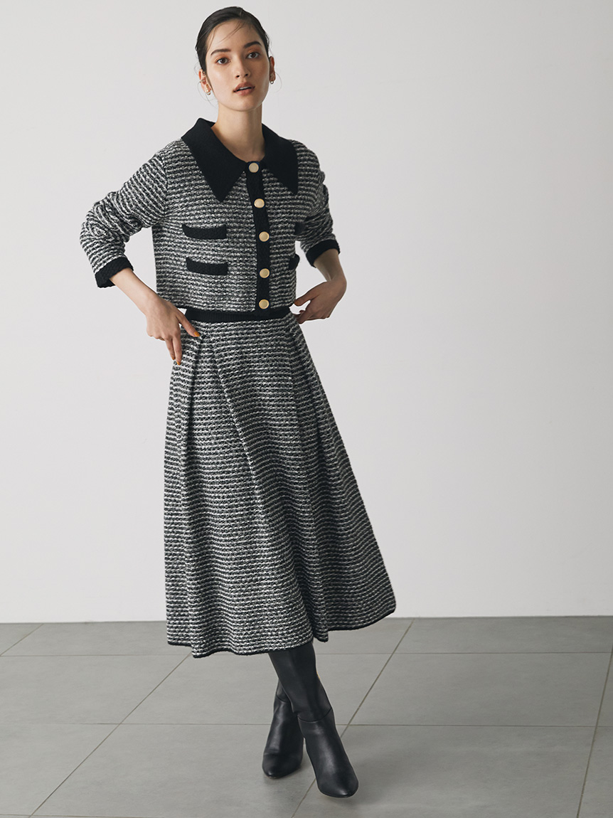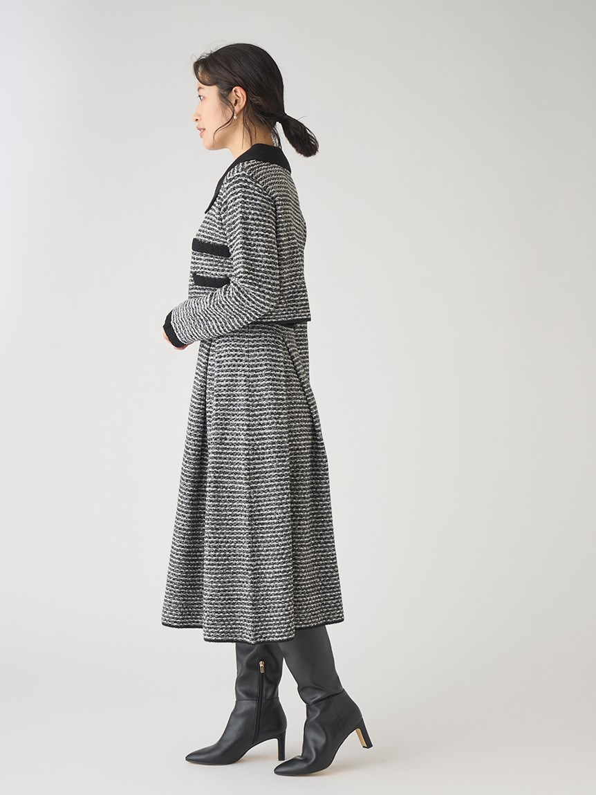 ツイードジャケットとツイードスカートをニットで表現しました。3種類の糸を使用しています。ウール混なので温かくリボンヤーンは表面に凹凸を出し体型のカバーにもなります。衿は取り外し可能になっていてノーカラーのツイードカーディガンとしても使用できます。鹿の子編みで作ったフェイクポケットと衿は全て配色です。スカートはウエスト部分は4cmのゴムを通して着心地の良さとホールド感をだしました。ウエストから前後ろ2本ずつボックスタックを入れていておなか回りが気にならないようにしつつも2cm間中綴じをすることで着ぶくれずすっきりみえるよう作りました。