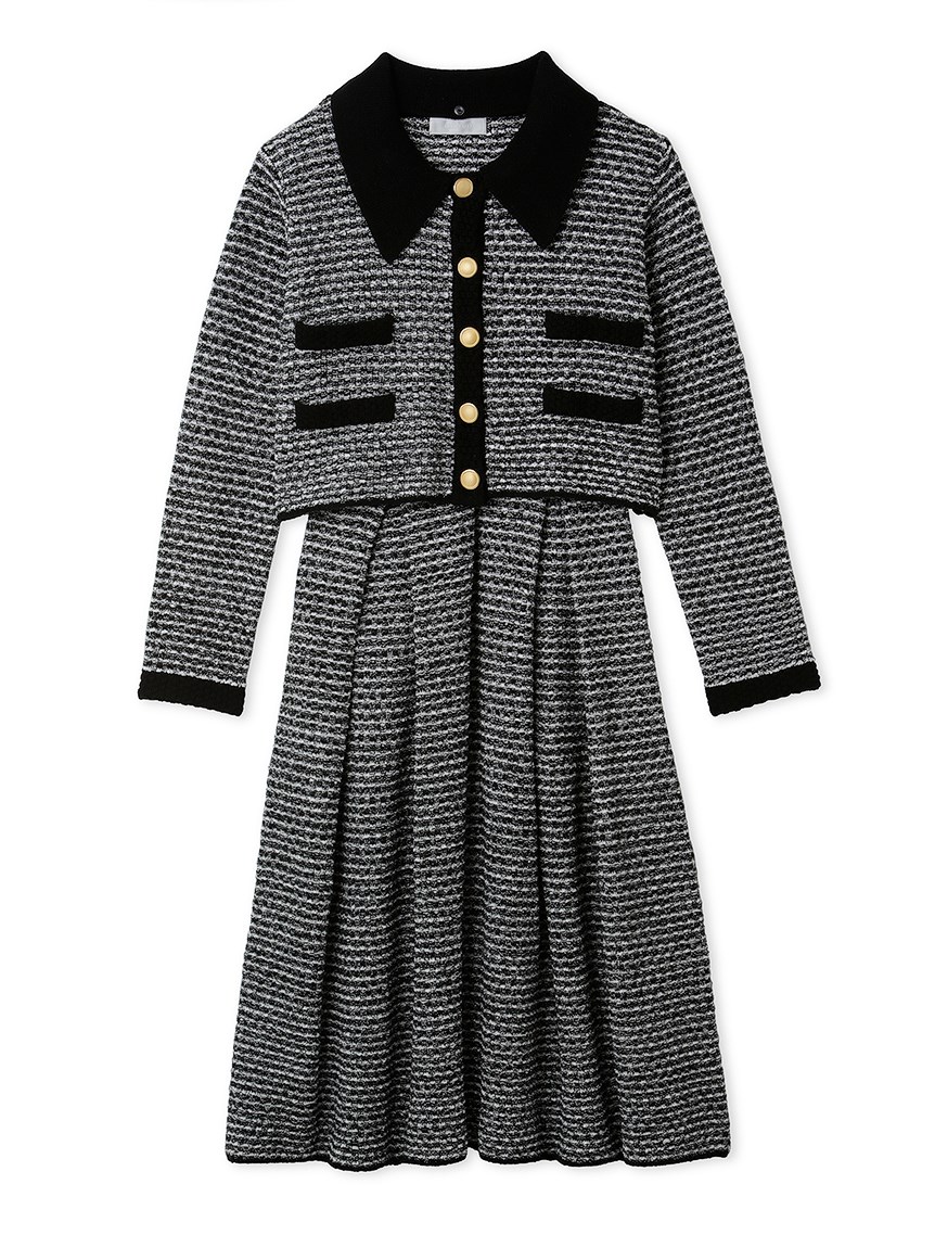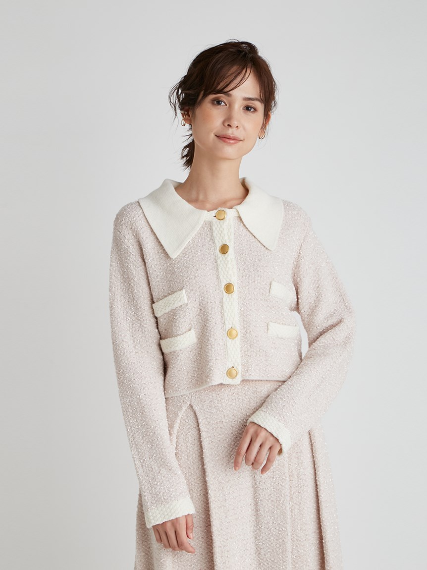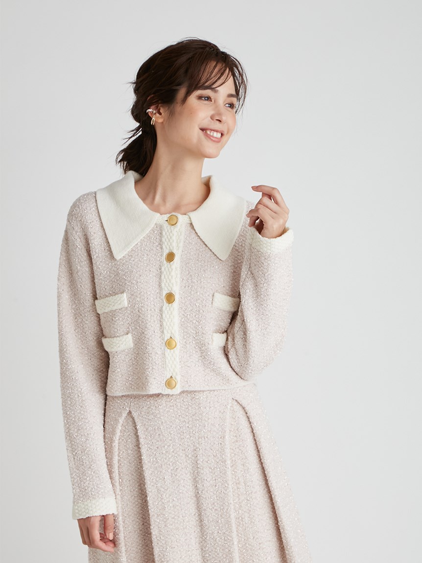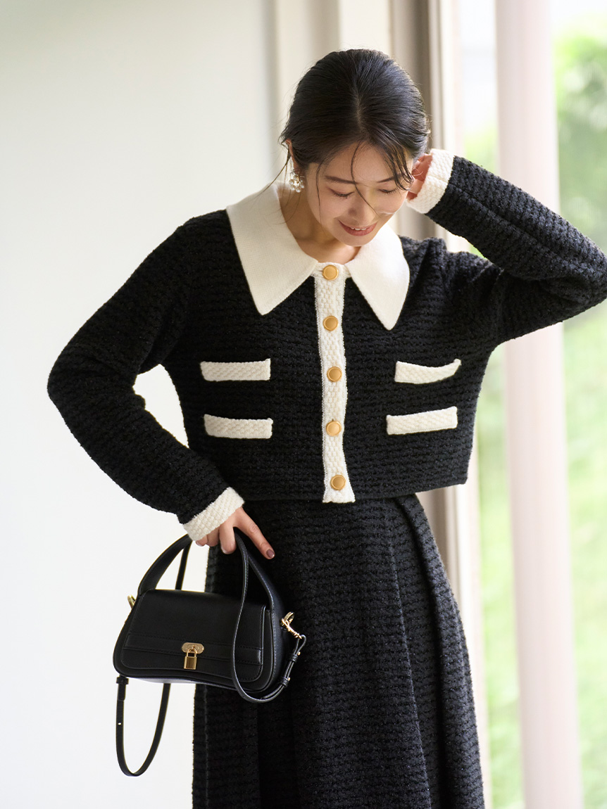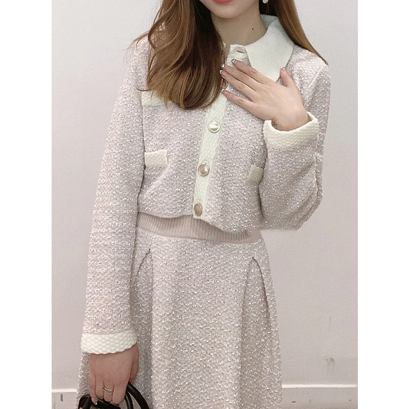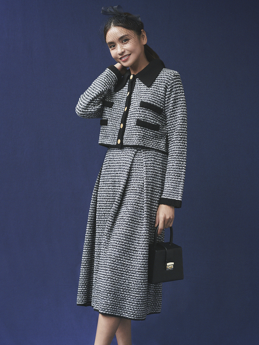 ツイードジャケットとツイードスカートをニットで表現しました。3種類の糸を使用しています。ウール混なので温かくリボンヤーンは表面に凹凸を出し体型のカバーにもなります。衿は取り外し可能になっていてノーカラーのツイードカーディガンとしても使用できます。鹿の子編みで作ったフェイクポケットと衿は全て配色です。スカートはウエスト部分は4cmのゴムを通して着心地の良さとホールド感をだしました。ウエストから前後ろ2本ずつボックスタックを入れていておなか回りが気にならないようにしつつも2cm間中綴じをすることで着ぶくれずすっきりみえるよう作りました。