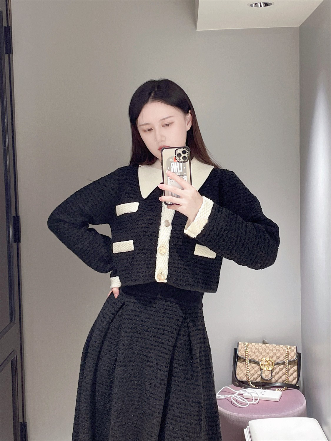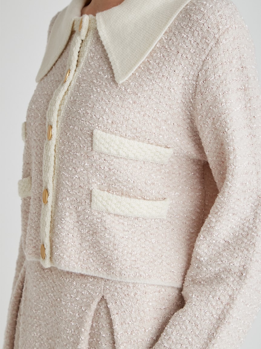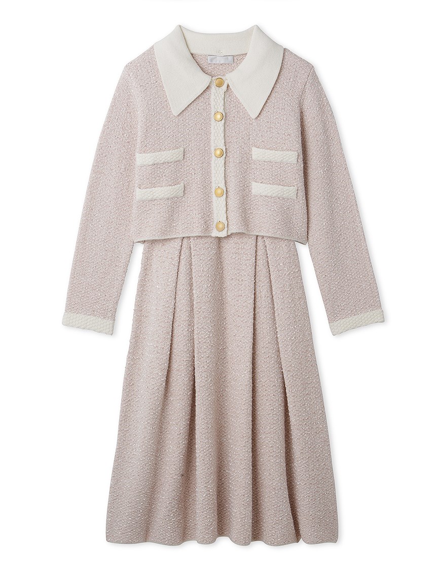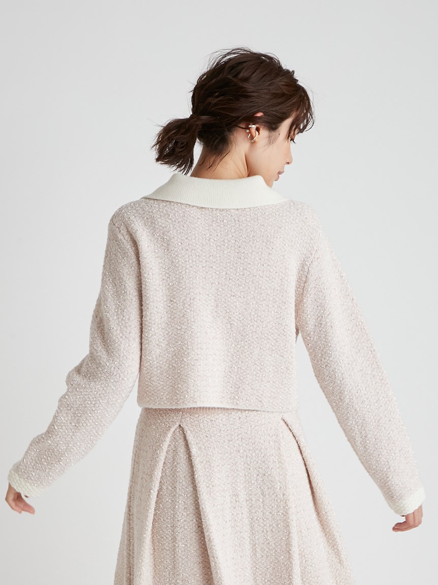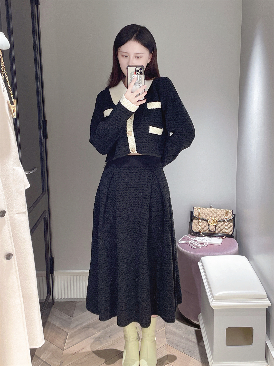 ツイードジャケットとツイードスカートをニットで表現しました。3種類の糸を使用しています。ウール混なので温かくリボンヤーンは表面に凹凸を出し体型のカバーにもなります。衿は取り外し可能になっていてノーカラーのツイードカーディガンとしても使用できます。鹿の子編みで作ったフェイクポケットと衿は全て配色です。スカートはウエスト部分は4cmのゴムを通して着心地の良さとホールド感をだしました。ウエストから前後ろ2本ずつボックスタックを入れていておなか回りが気にならないようにしつつも2cm間中綴じをすることで着ぶくれずすっきりみえるよう作りました。