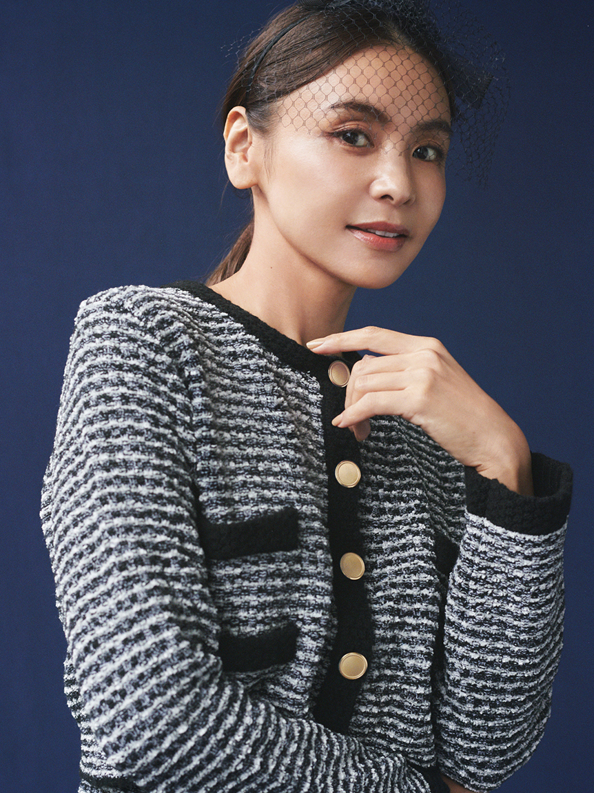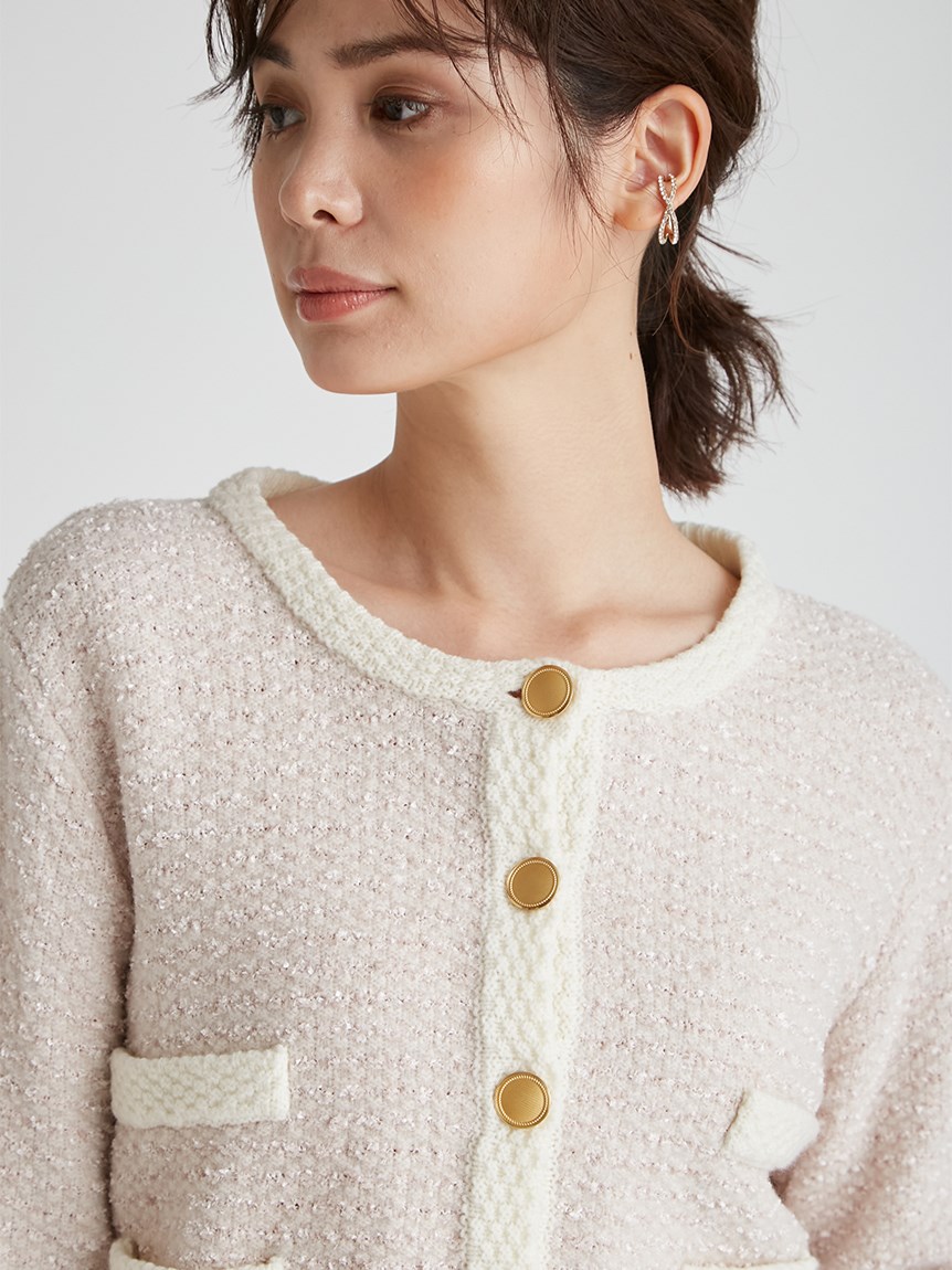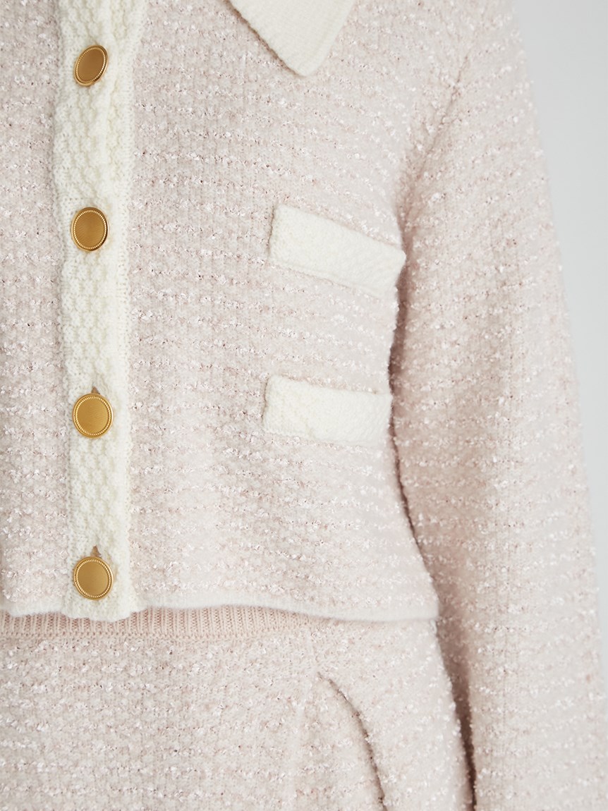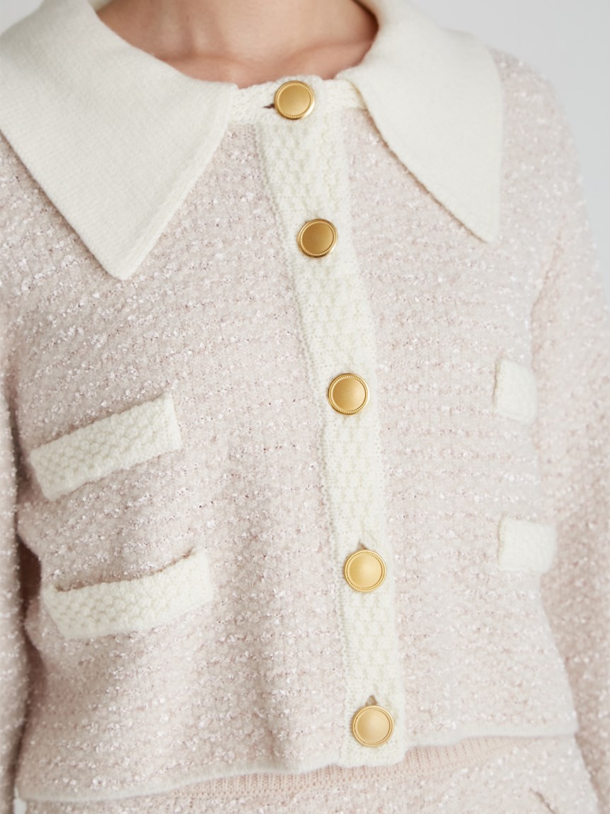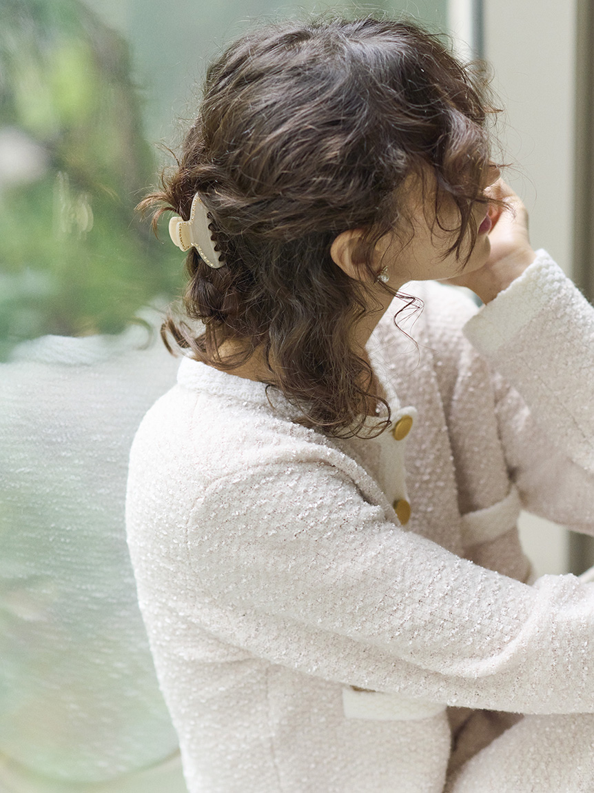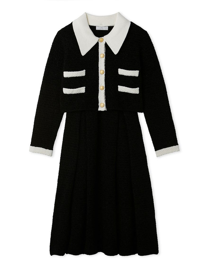 ツイードジャケットとツイードスカートをニットで表現しました。3種類の糸を使用しています。ウール混なので温かくリボンヤーンは表面に凹凸を出し体型のカバーにもなります。衿は取り外し可能になっていてノーカラーのツイードカーディガンとしても使用できます。鹿の子編みで作ったフェイクポケットと衿は全て配色です。スカートはウエスト部分は4cmのゴムを通して着心地の良さとホールド感をだしました。ウエストから前後ろ2本ずつボックスタックを入れていておなか回りが気にならないようにしつつも2cm間中綴じをすることで着ぶくれずすっきりみえるよう作りました。