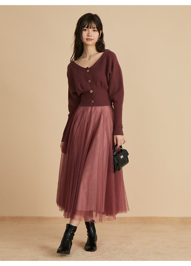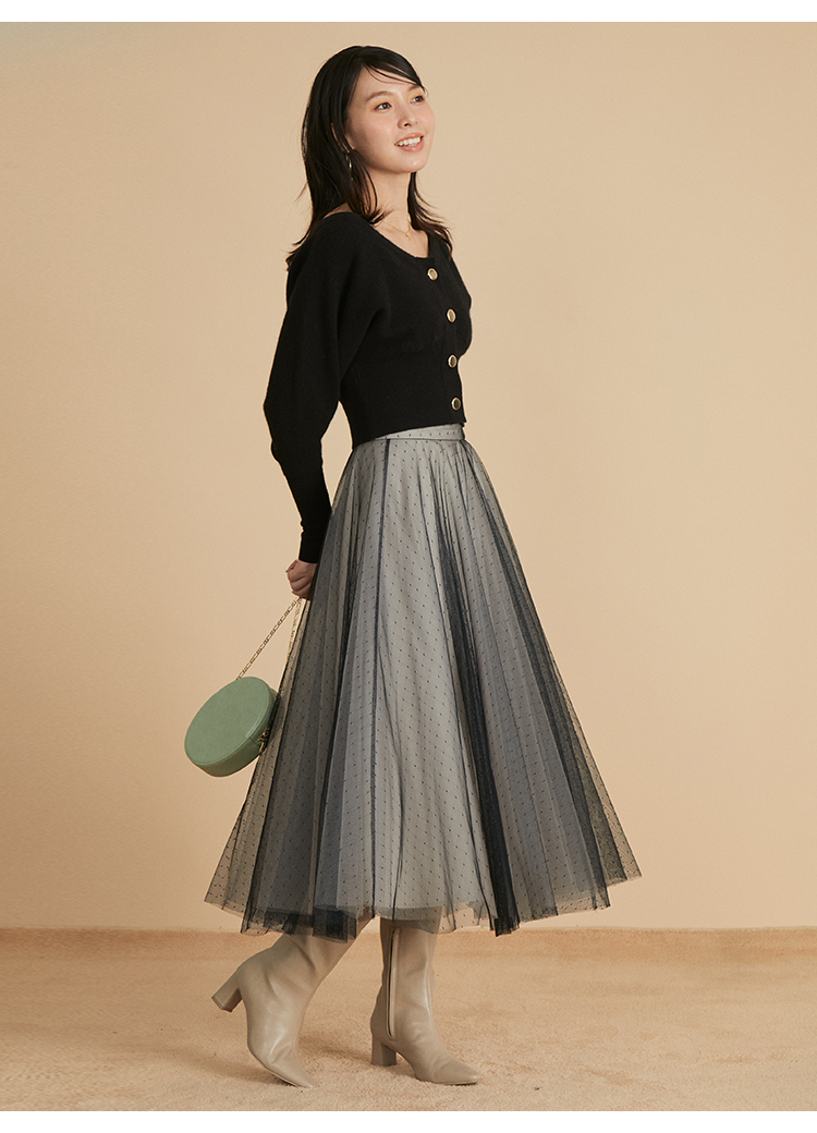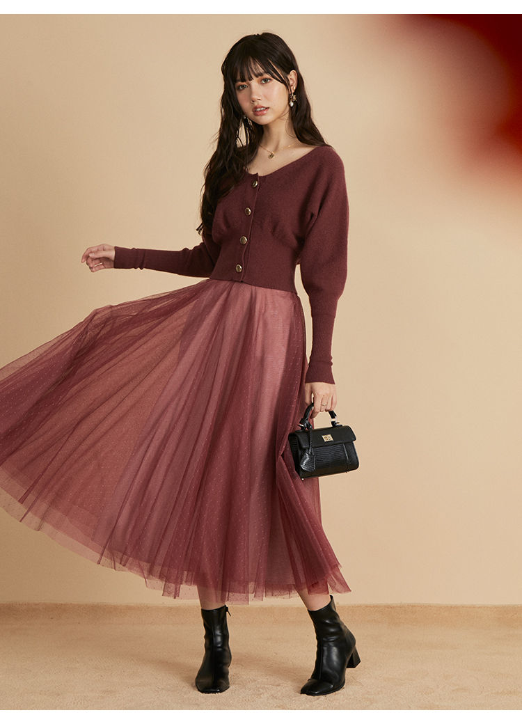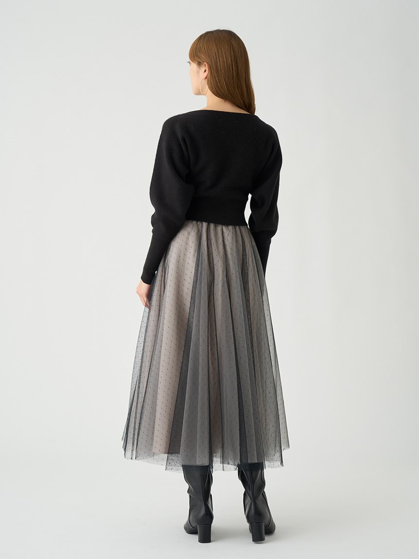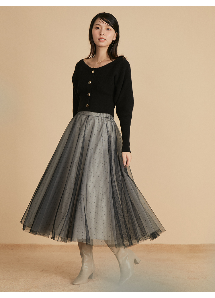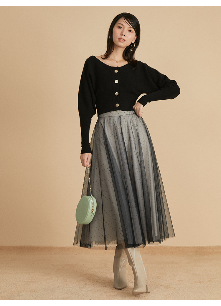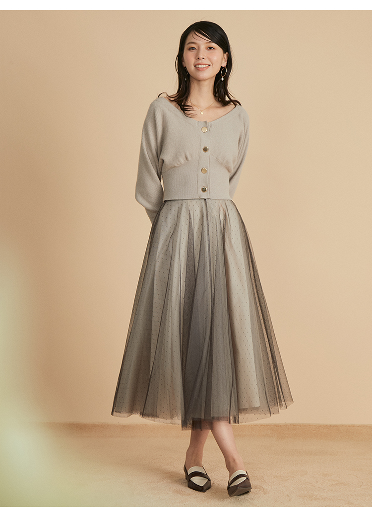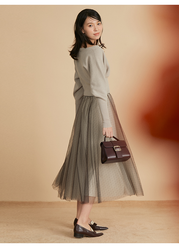 きれいめな質感のニットとドット模様が浮かぶシアーなチュール素材を組み合わせました。落ち着いた印象を与えるブラック、淡い色合いが女性らしいライトベージュ、華やかな雰囲気のバーガンディの3色展開でお届けします。