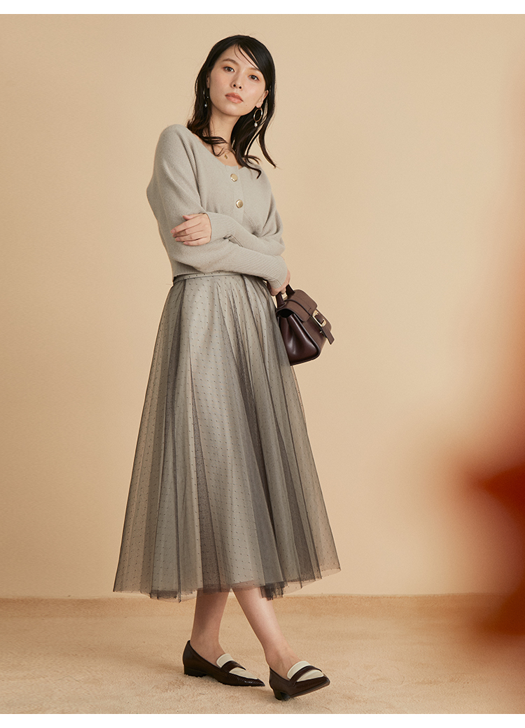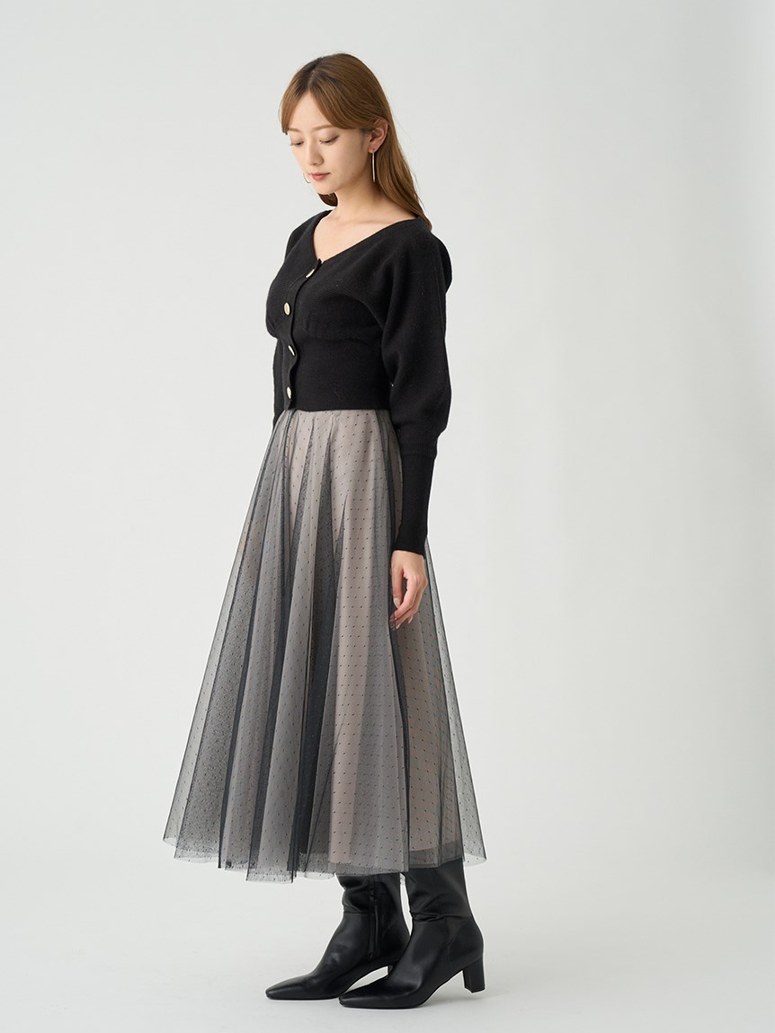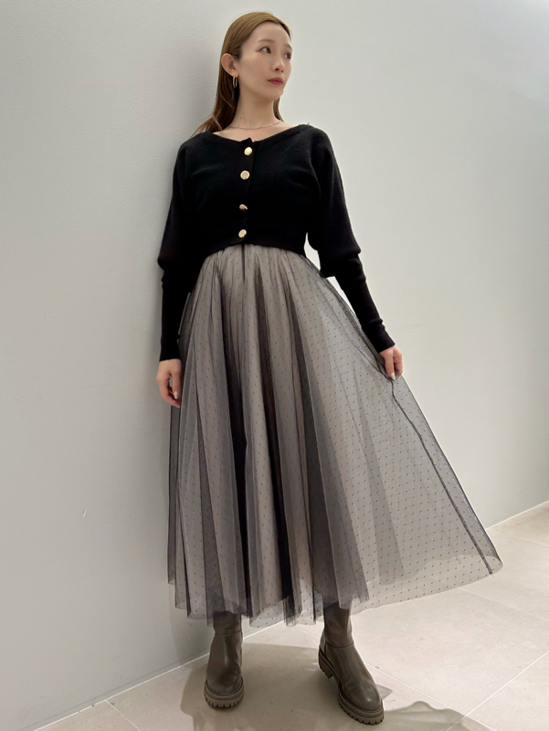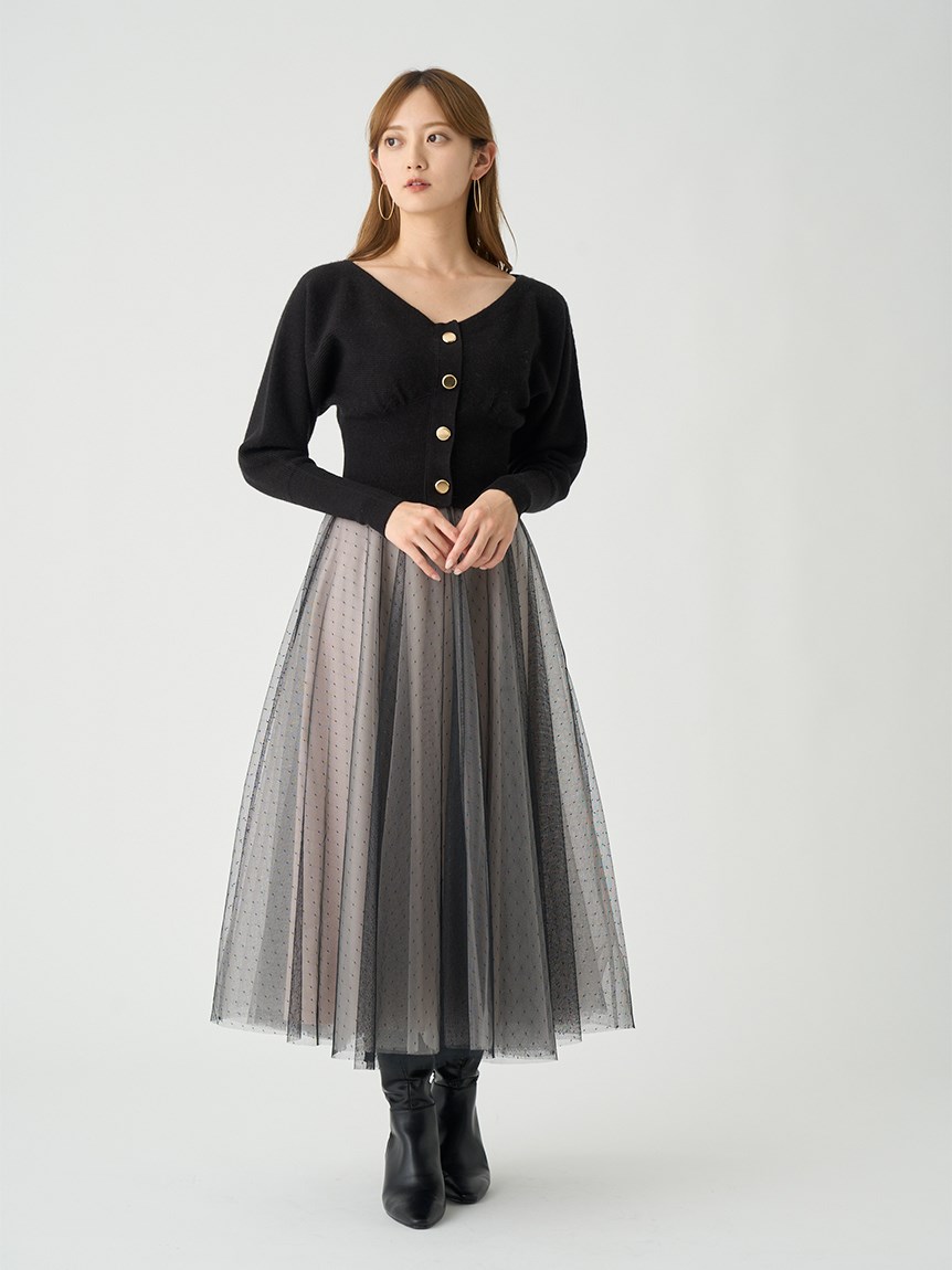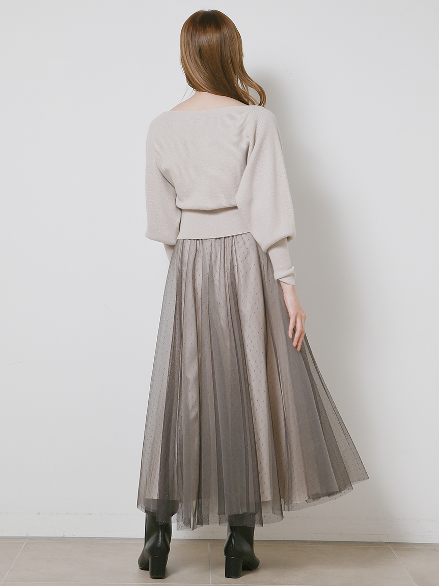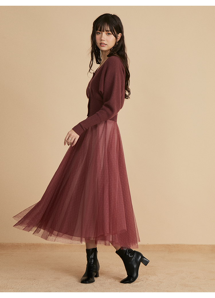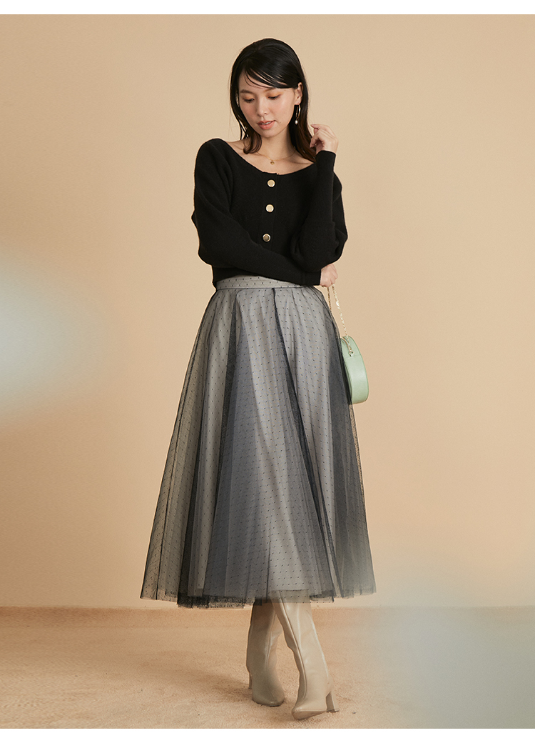 きれいめな質感のニットとドット模様が浮かぶシアーなチュール素材を組み合わせました。落ち着いた印象を与えるブラック、淡い色合いが女性らしいライトベージュ、華やかな雰囲気のバーガンディの3色展開でお届けします。
