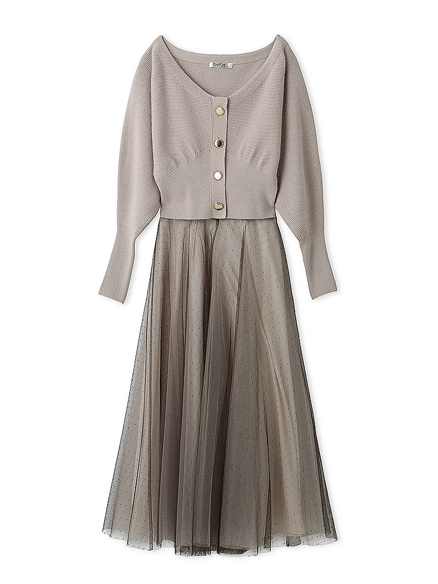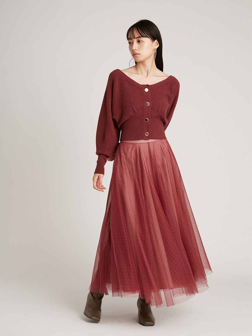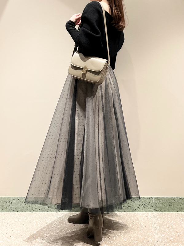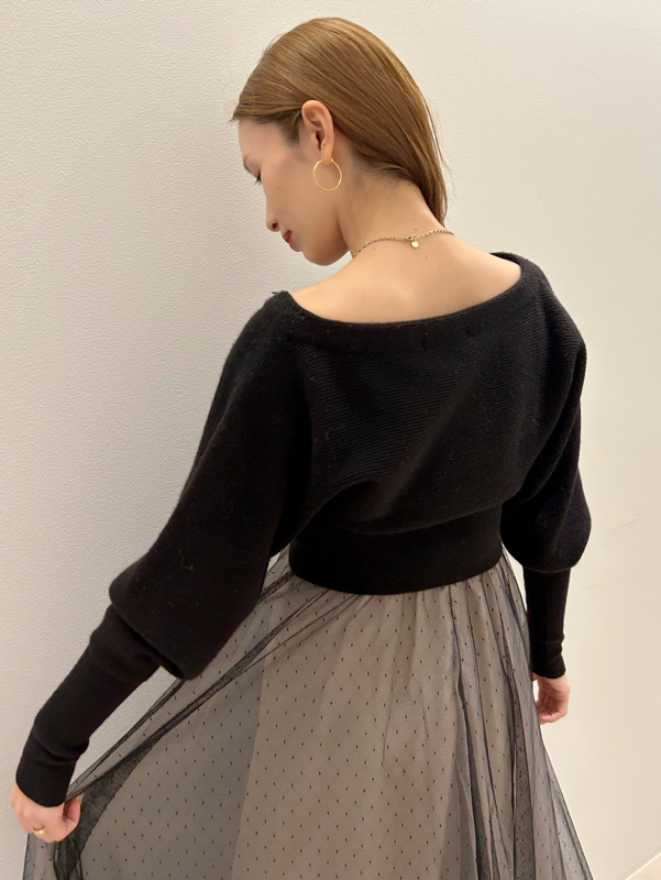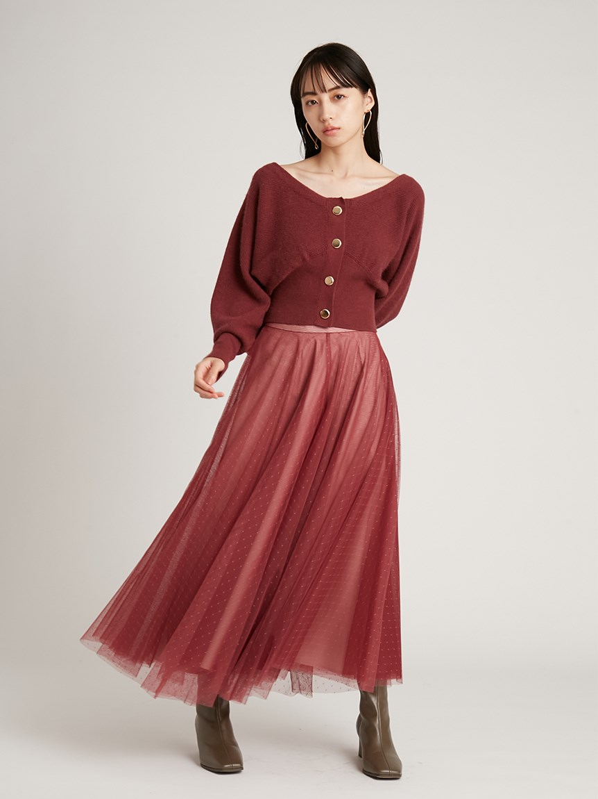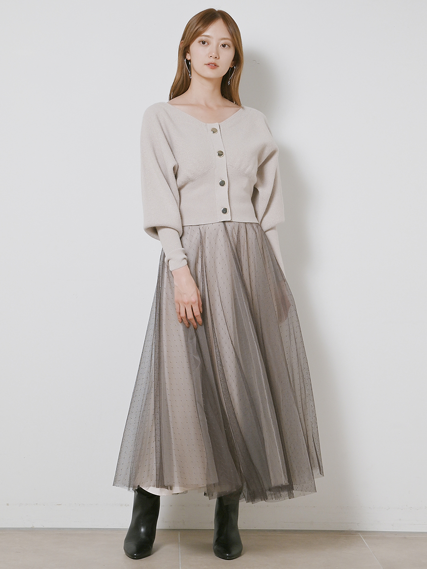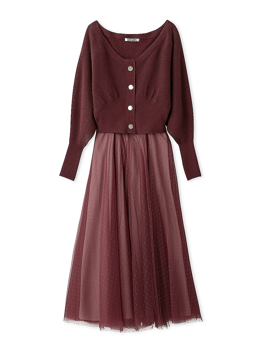 きれいめな質感のニットとドット模様が浮かぶシアーなチュール素材を組み合わせました。落ち着いた印象を与えるブラック、淡い色合いが女性らしいライトベージュ、華やかな雰囲気のバーガンディの3色展開でお届けします。