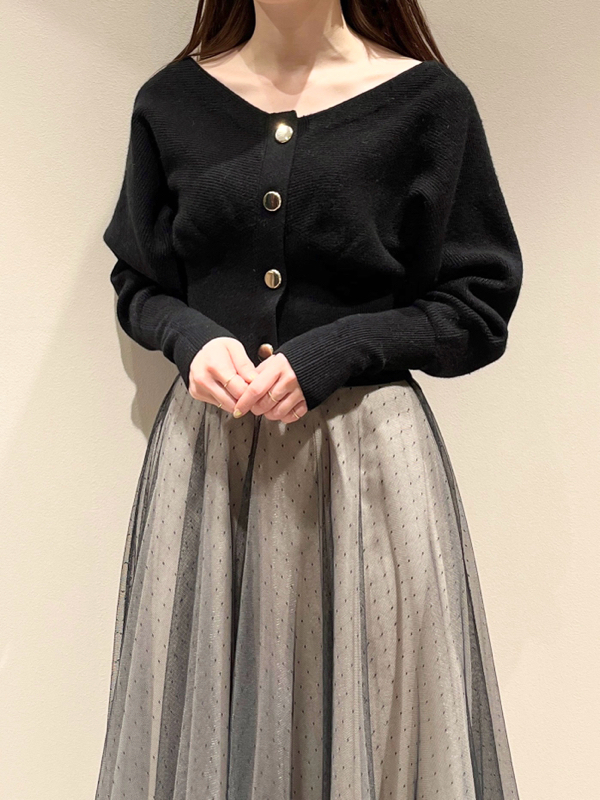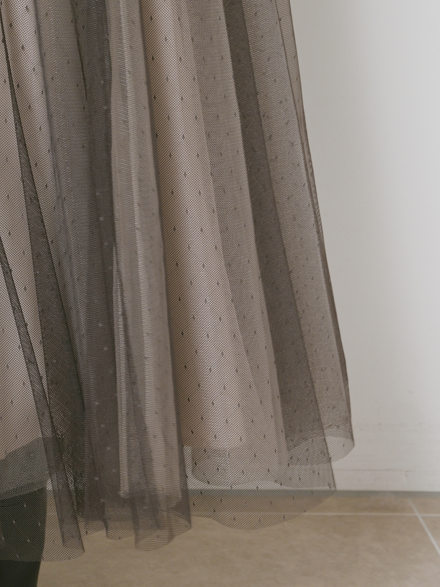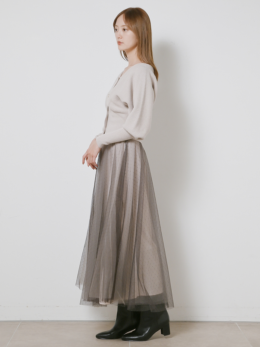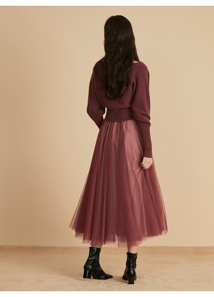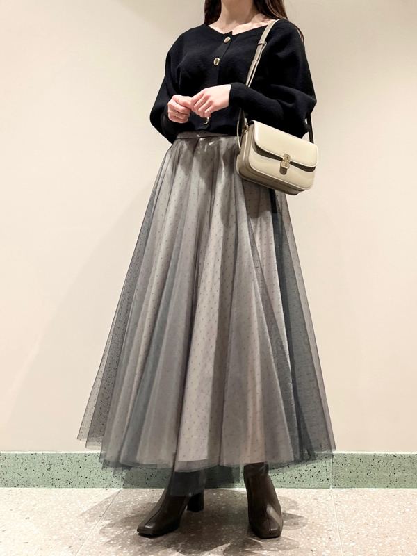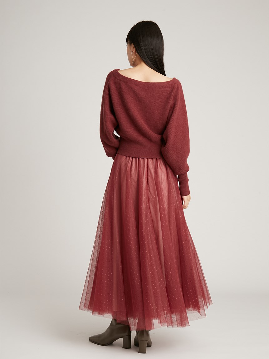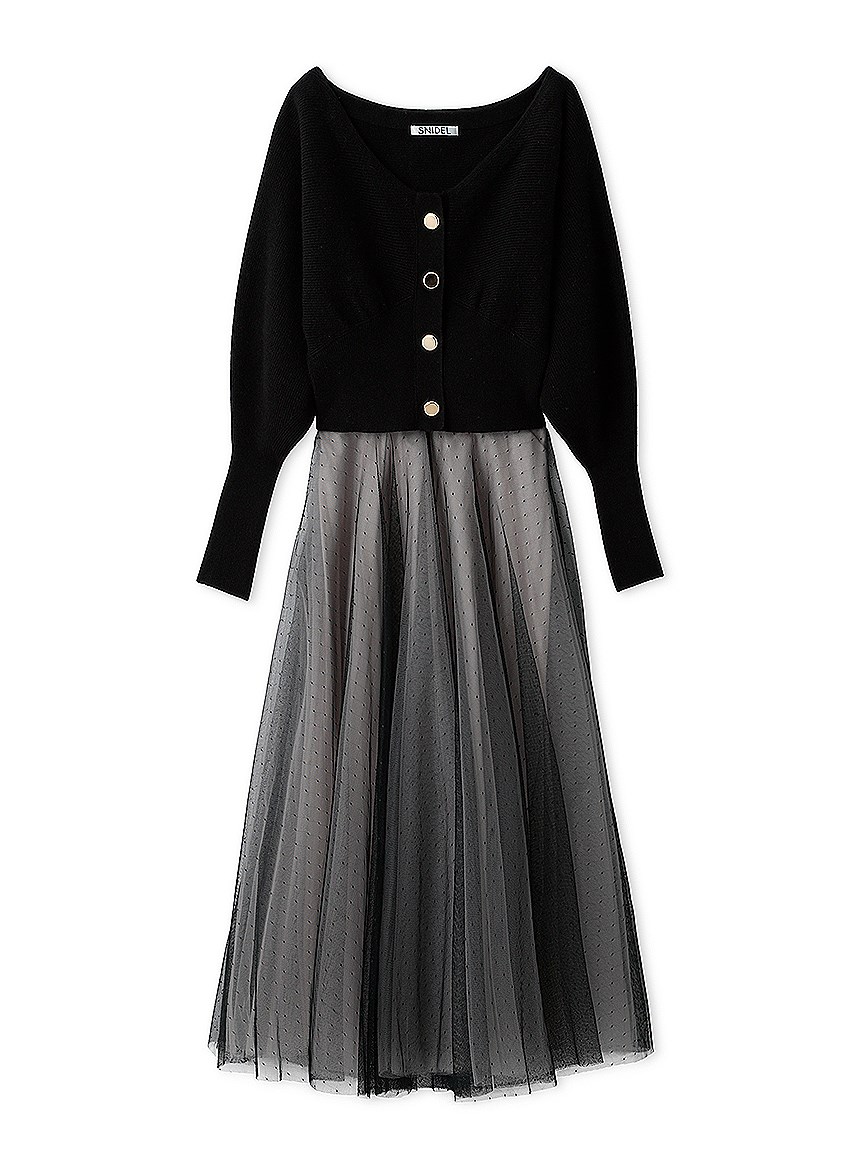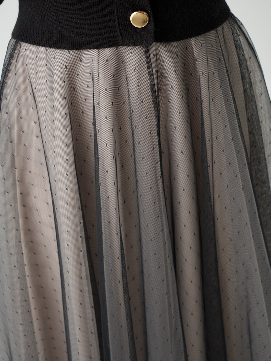 きれいめな質感のニットとドット模様が浮かぶシアーなチュール素材を組み合わせました。落ち着いた印象を与えるブラック、淡い色合いが女性らしいライトベージュ、華やかな雰囲気のバーガンディの3色展開でお届けします。