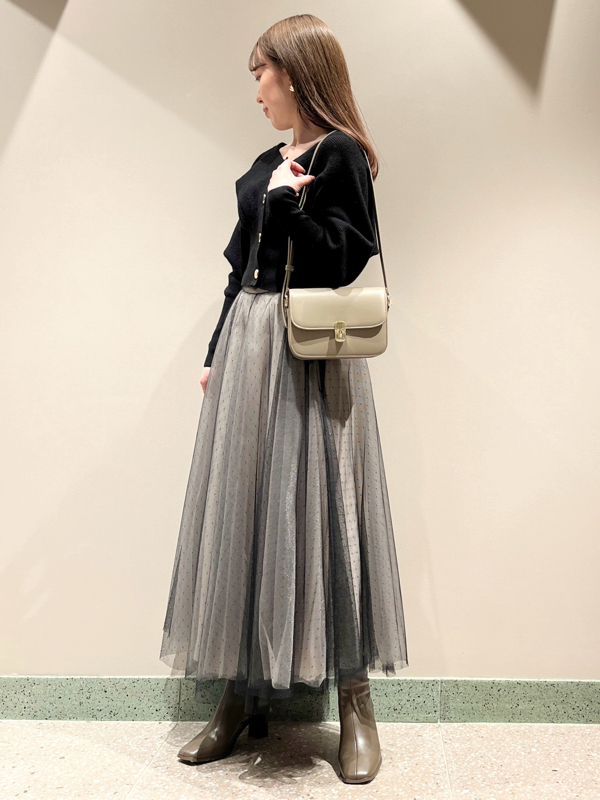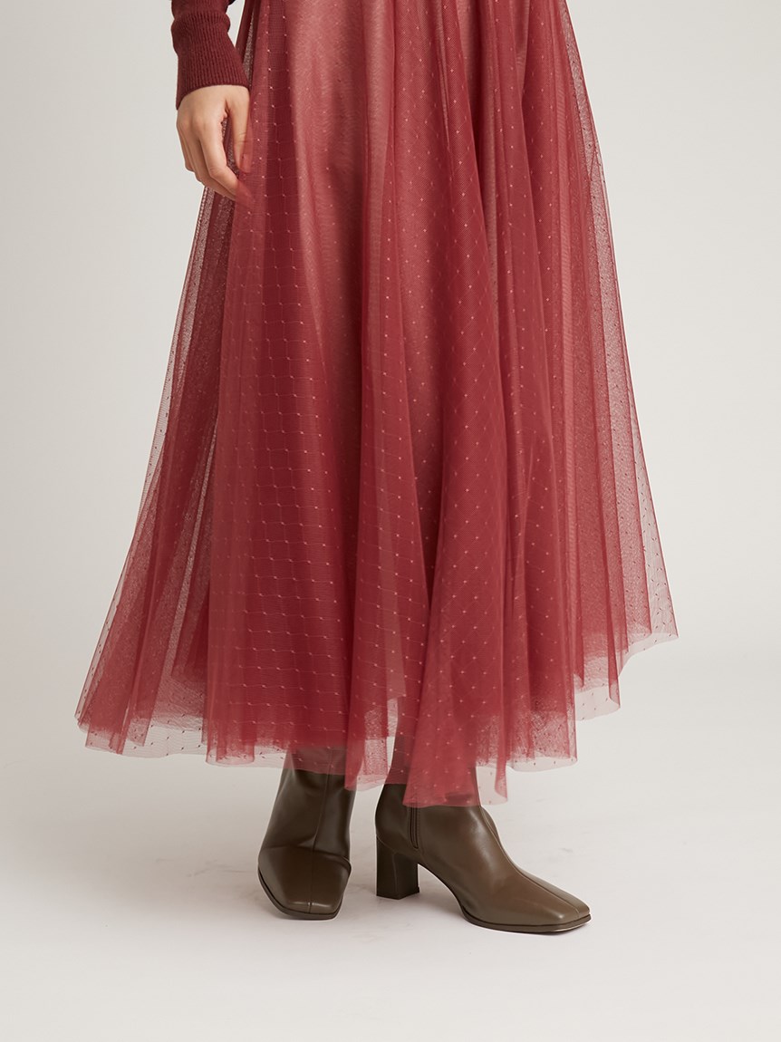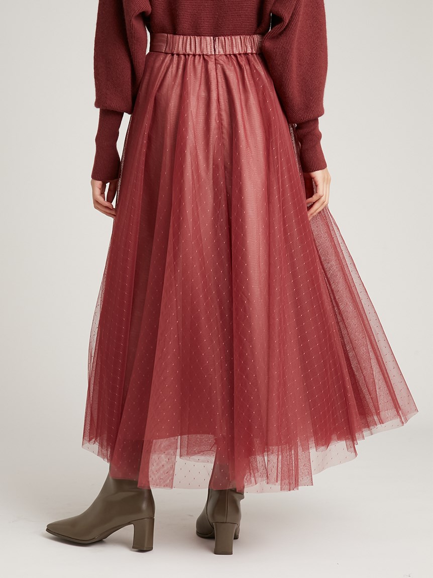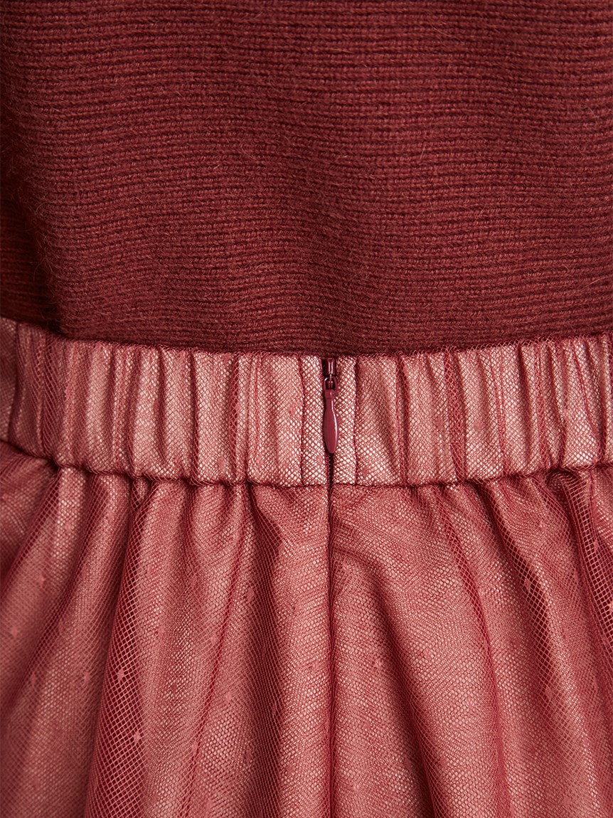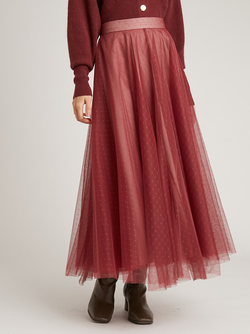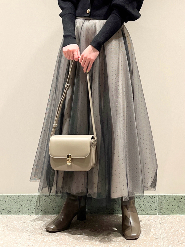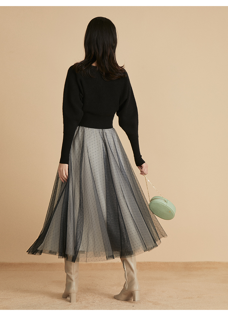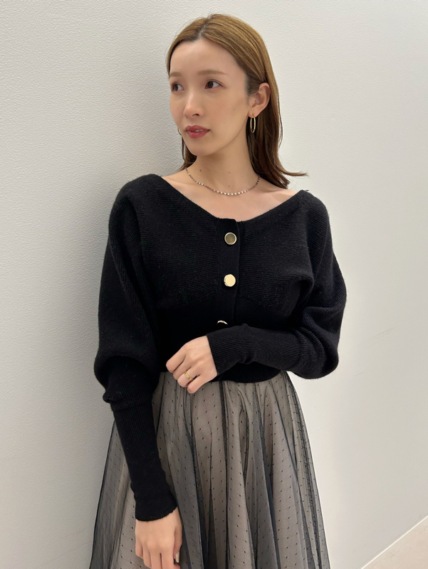 きれいめな質感のニットとドット模様が浮かぶシアーなチュール素材を組み合わせました。落ち着いた印象を与えるブラック、淡い色合いが女性らしいライトベージュ、華やかな雰囲気のバーガンディの3色展開でお届けします。