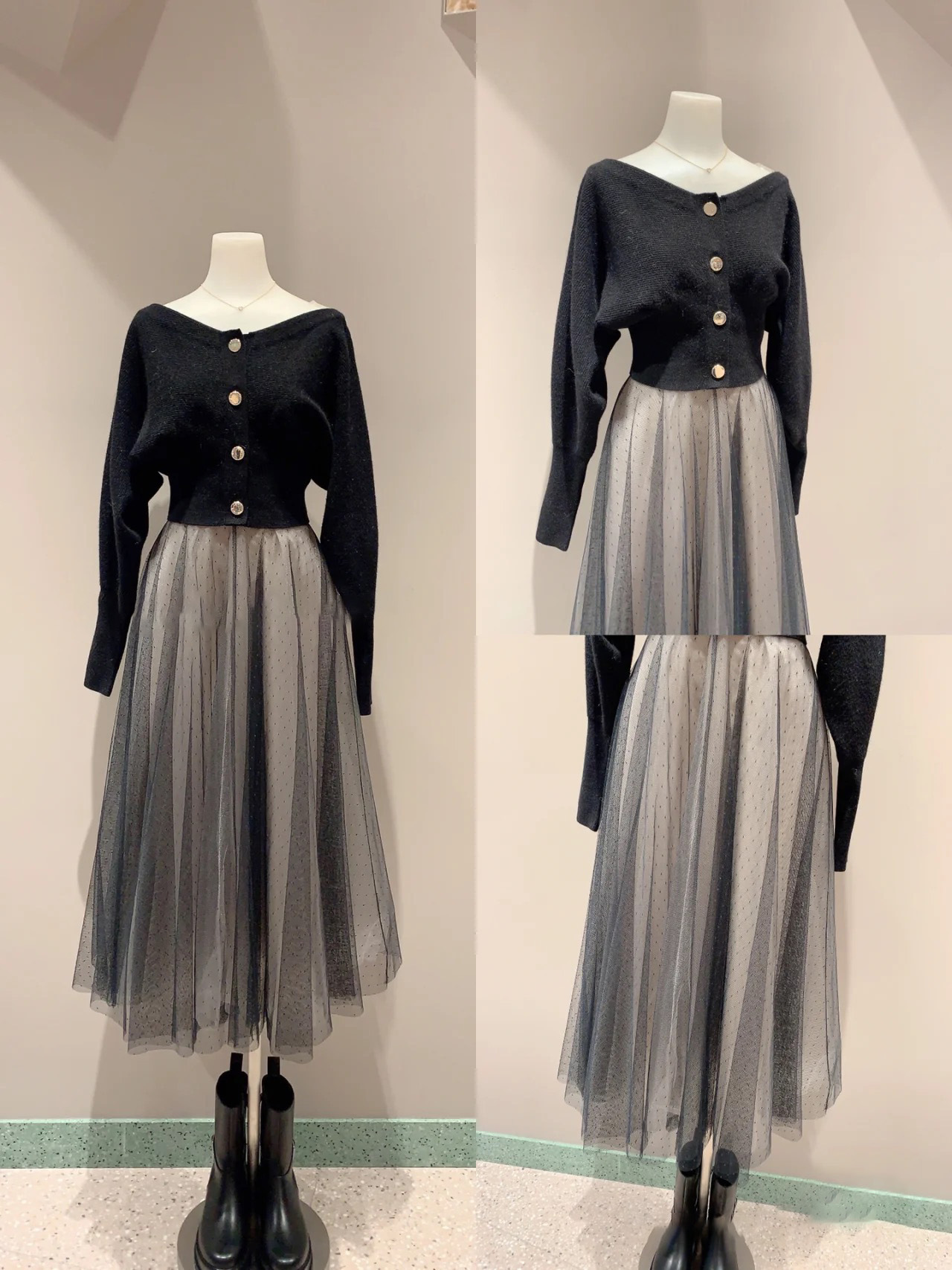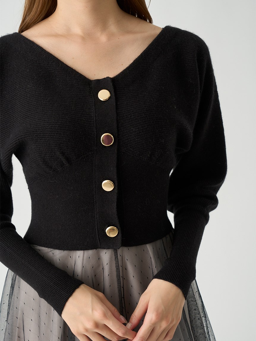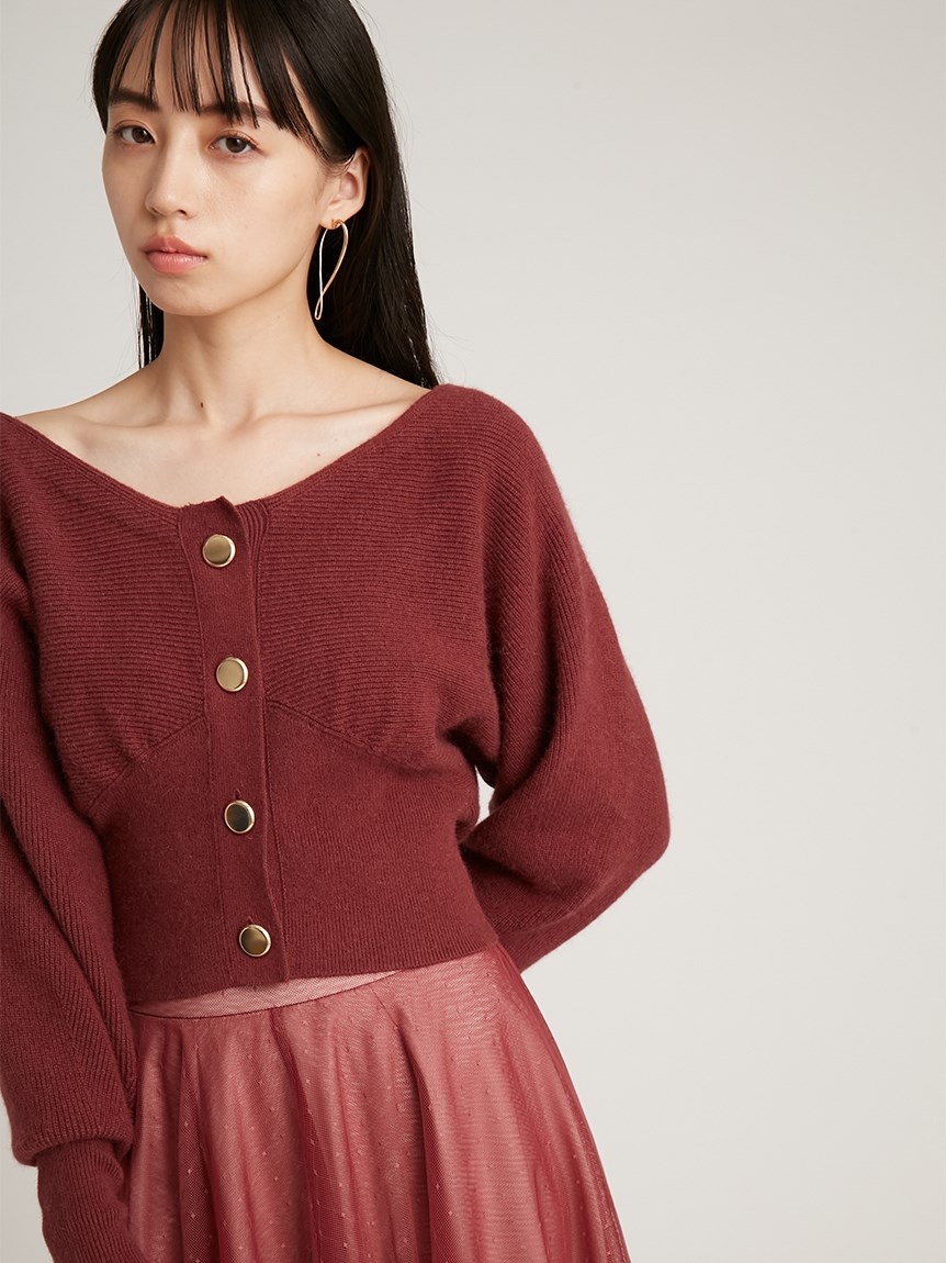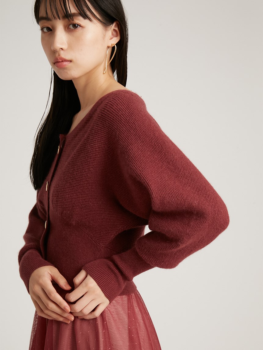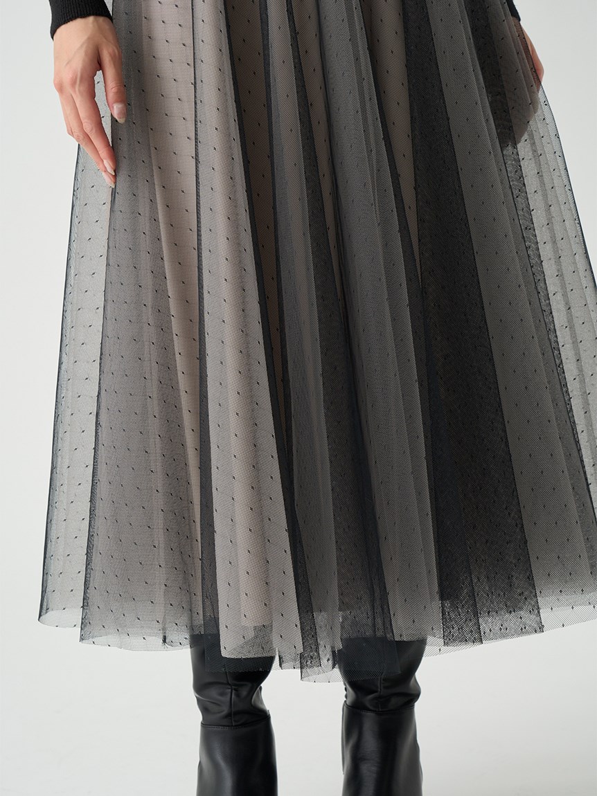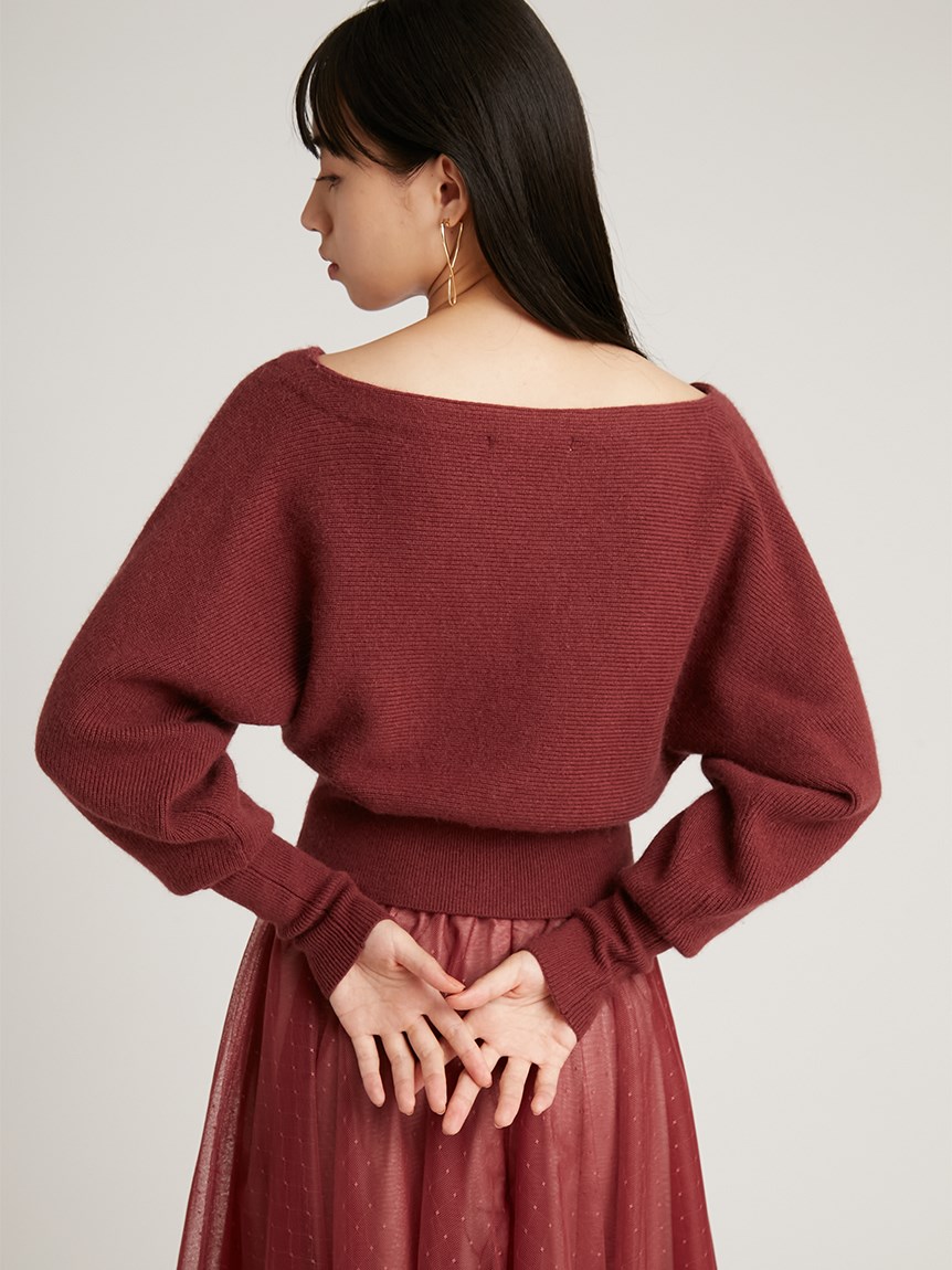 きれいめな質感のニットとドット模様が浮かぶシアーなチュール素材を組み合わせました。落ち着いた印象を与えるブラック、淡い色合いが女性らしいライトベージュ、華やかな雰囲気のバーガンディの3色展開でお届けします。