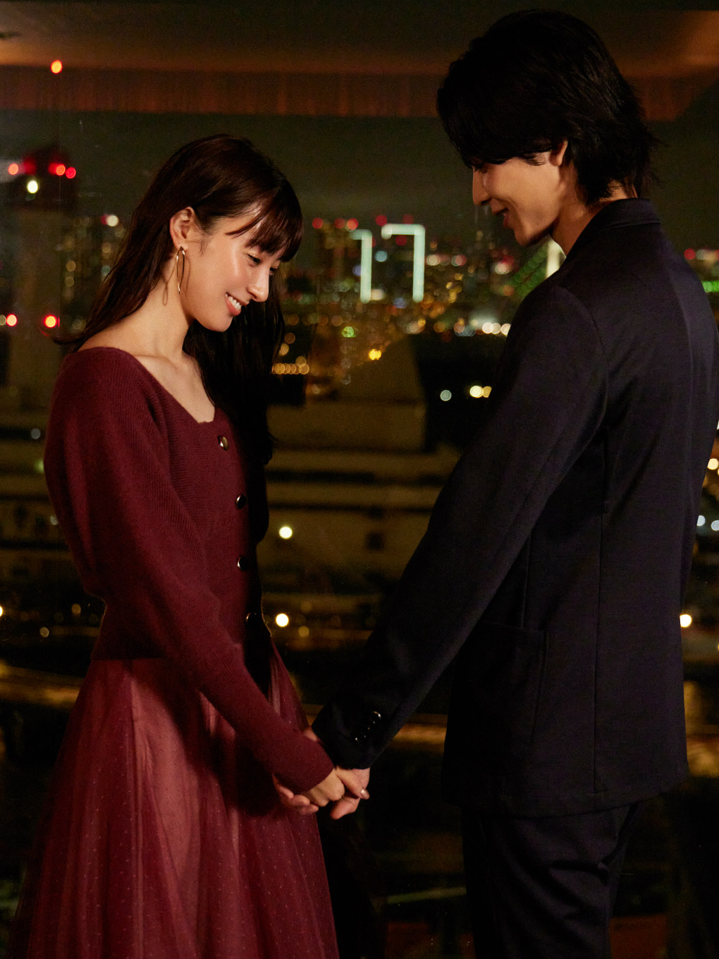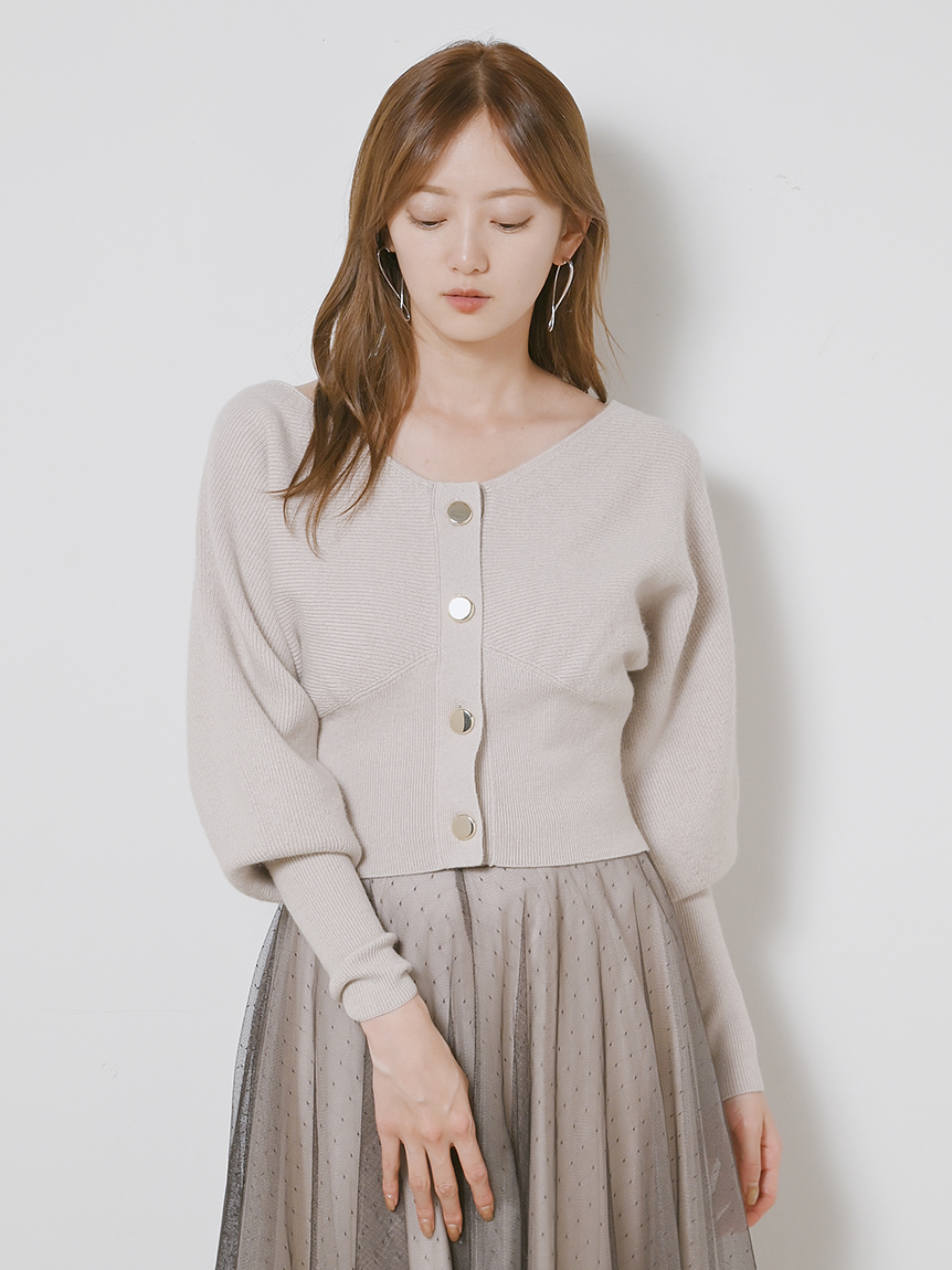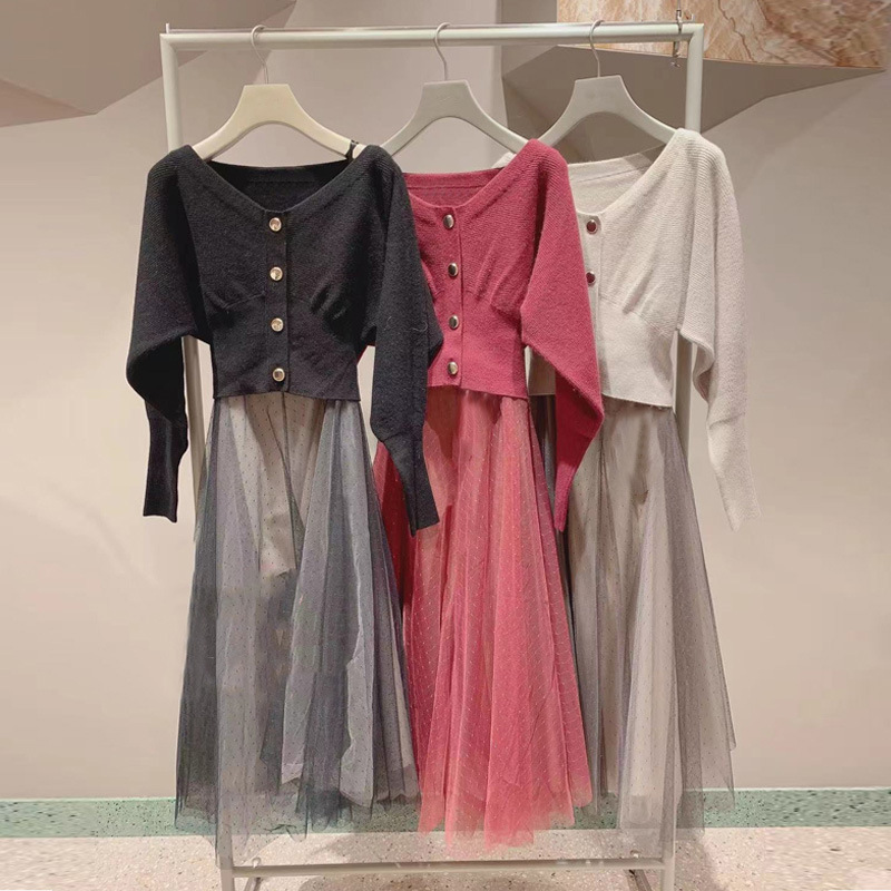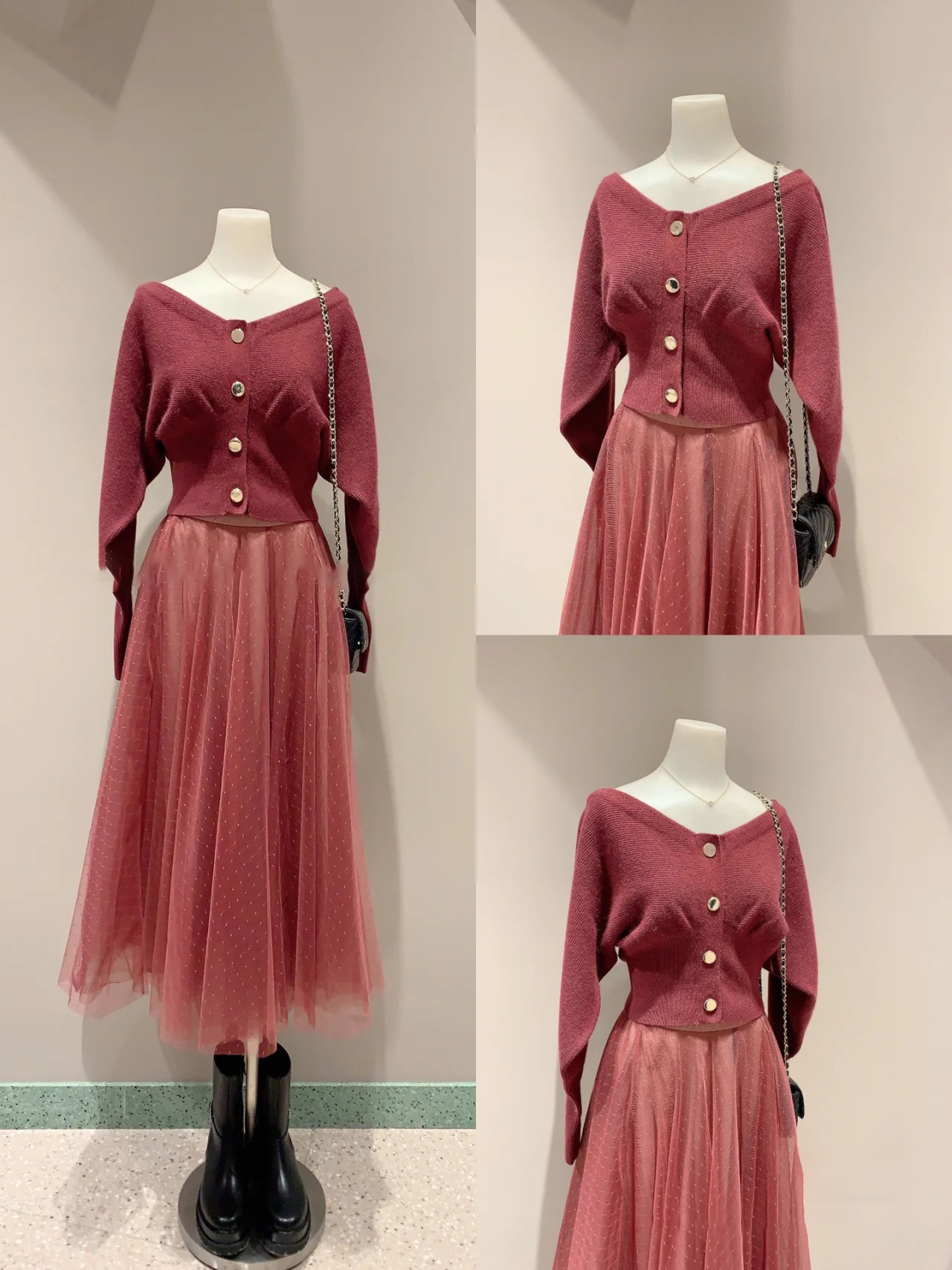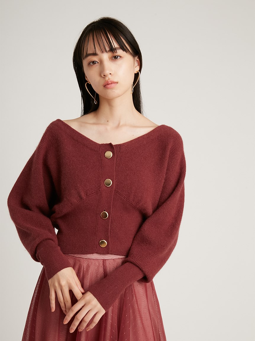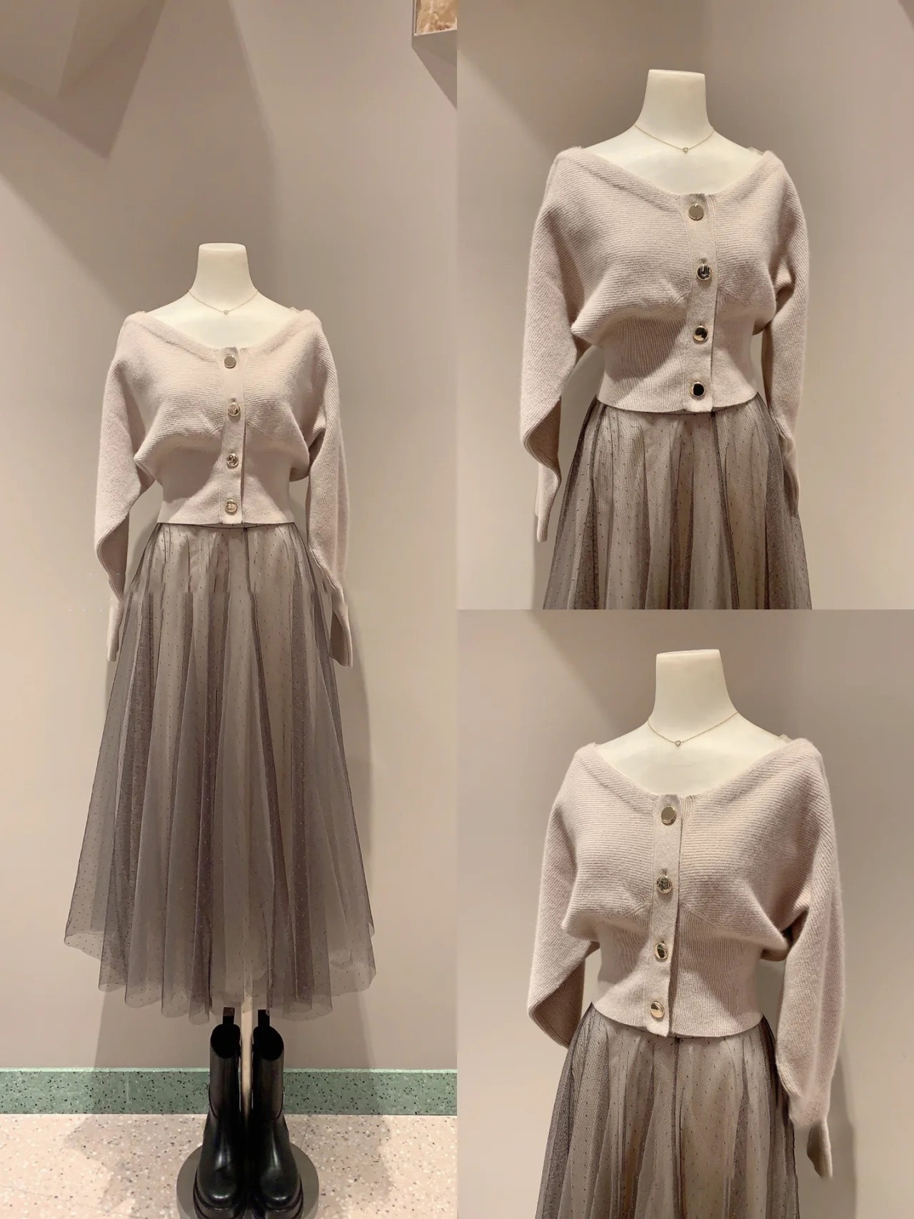 きれいめな質感のニットとドット模様が浮かぶシアーなチュール素材を組み合わせました。落ち着いた印象を与えるブラック、淡い色合いが女性らしいライトベージュ、華やかな雰囲気のバーガンディの3色展開でお届けします。