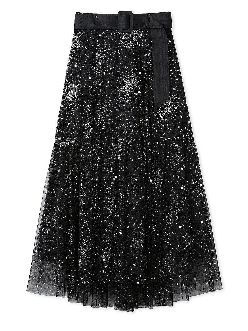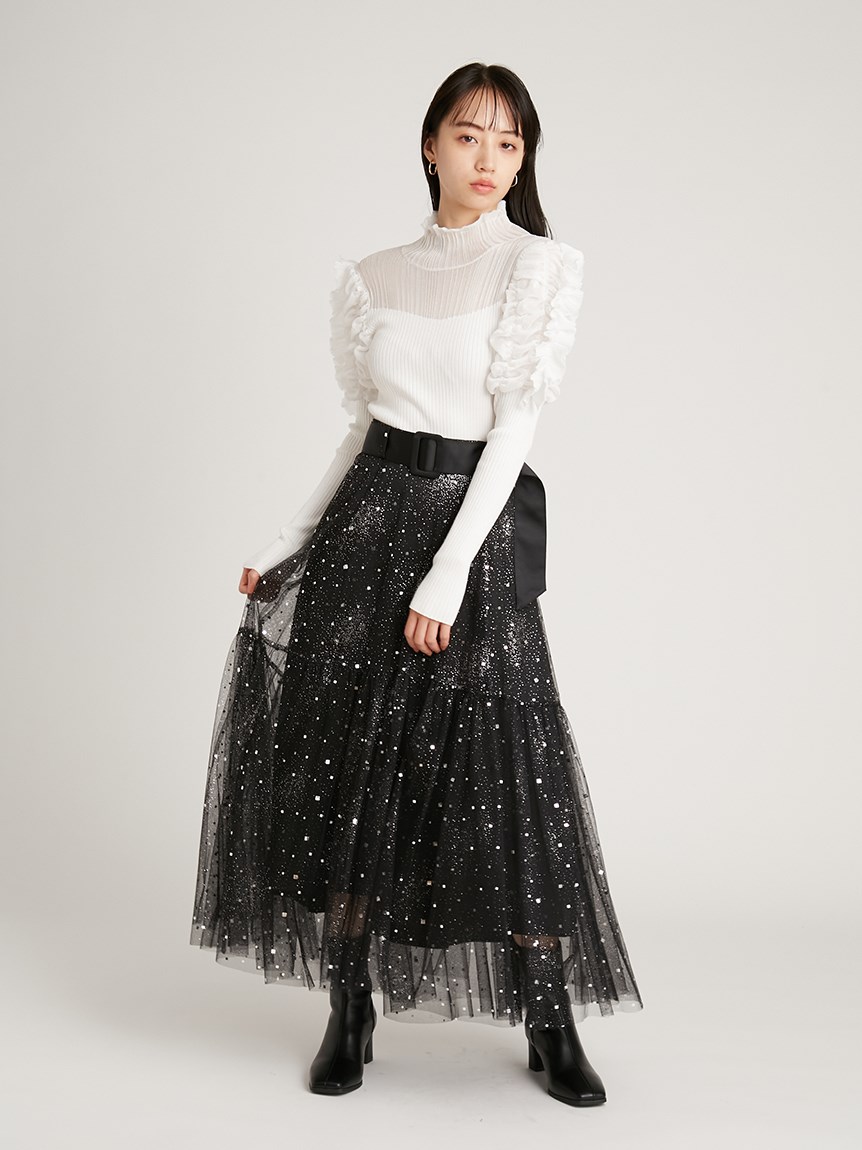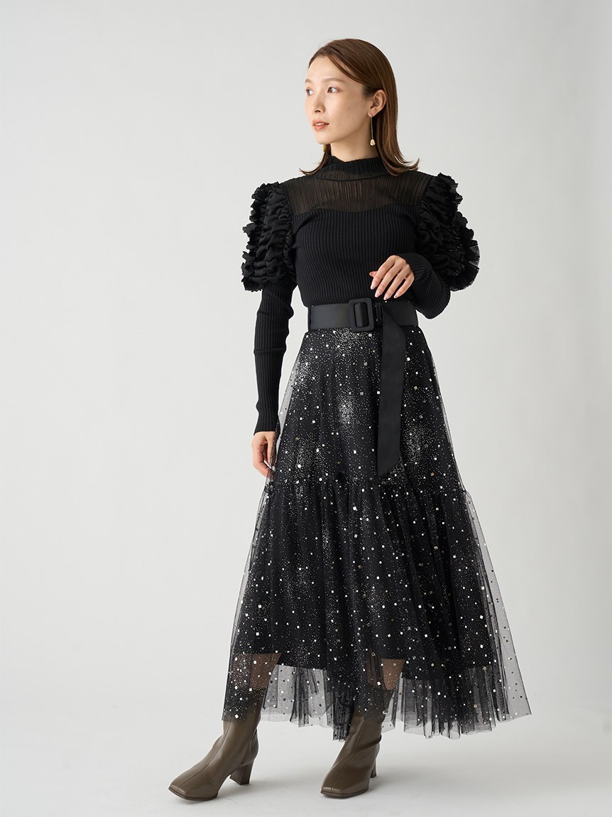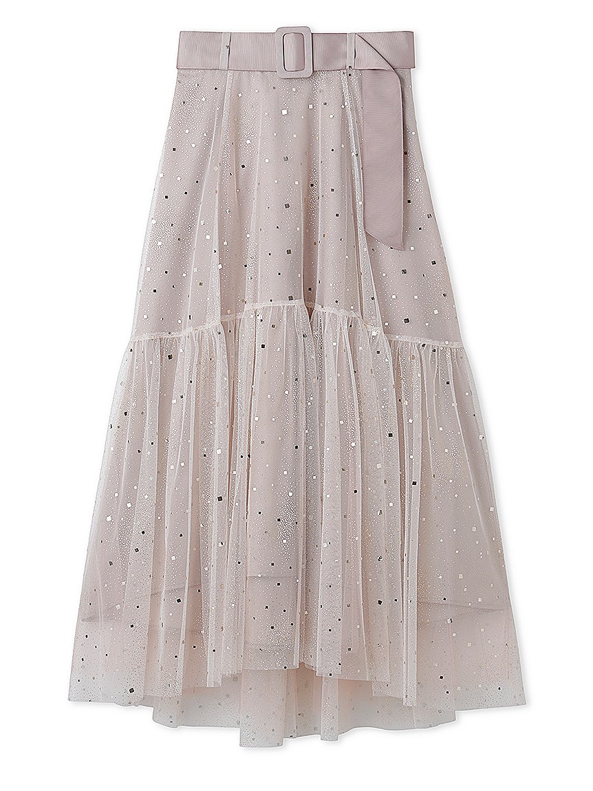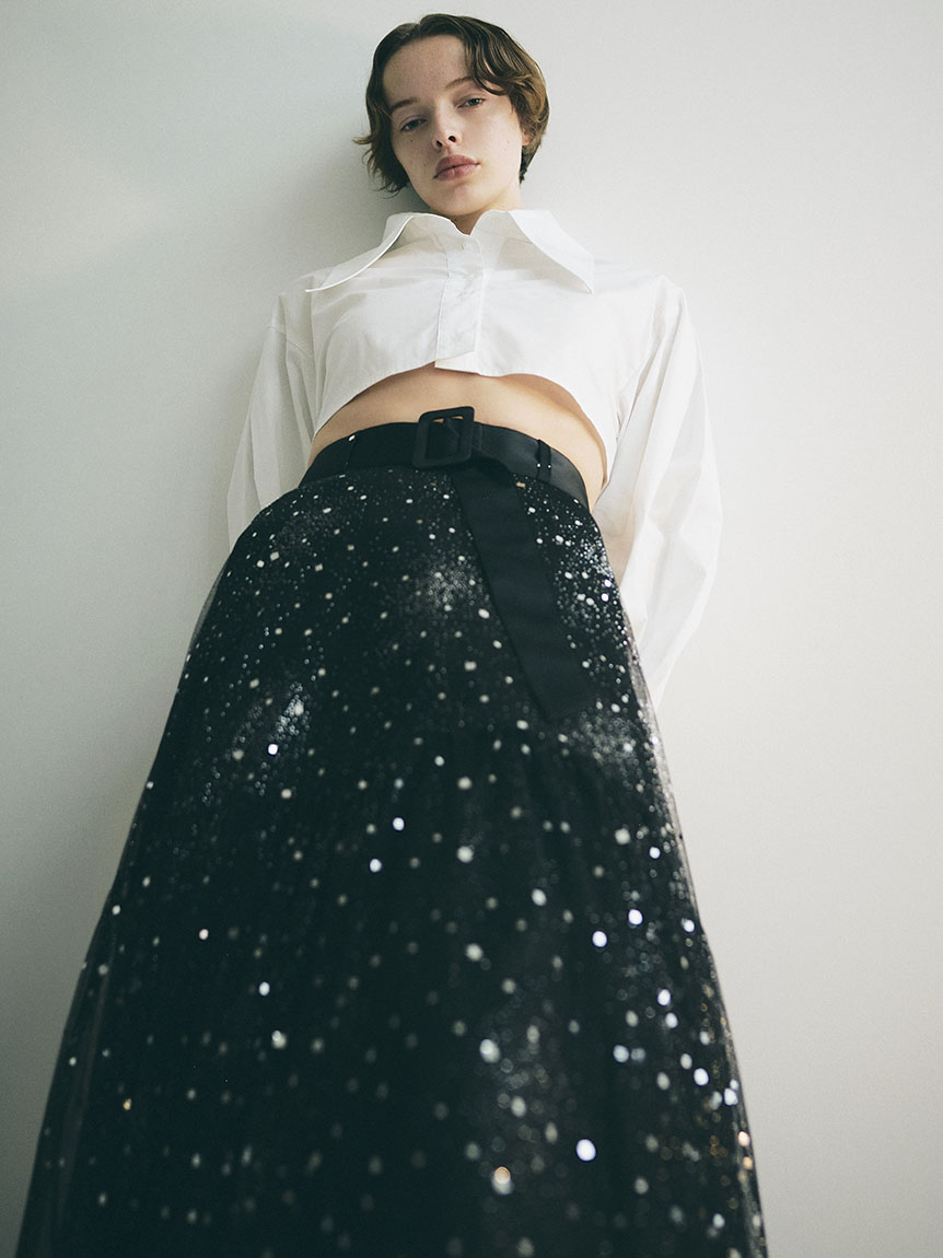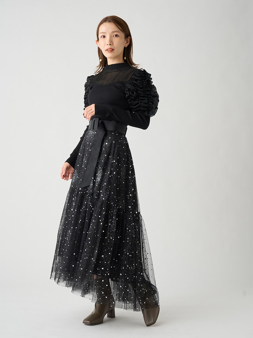 全体に煌めきのある箔プリントに更にスパンコールプリントをのせた、主役級の存在感を放つ華やかなチュールスカート。腰回りはすっきりとしたシルエットに仕上げ、裾にたっぷりとギャザーを入れボリュームのあるフレアラインに。シアーなチュール素材で軽やかなのでボリューミーながらも重くなりすぎない1着です。セットになったグログラン素材のベルトでウエストをマークすればメリハリのあるスタイリングに。ドレッシーなトップスを合わせてオンスタイルにもぴったりのアイテムです。