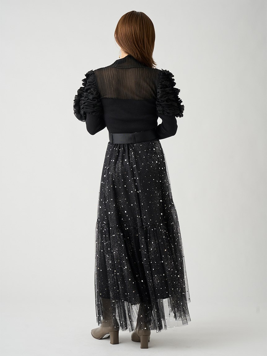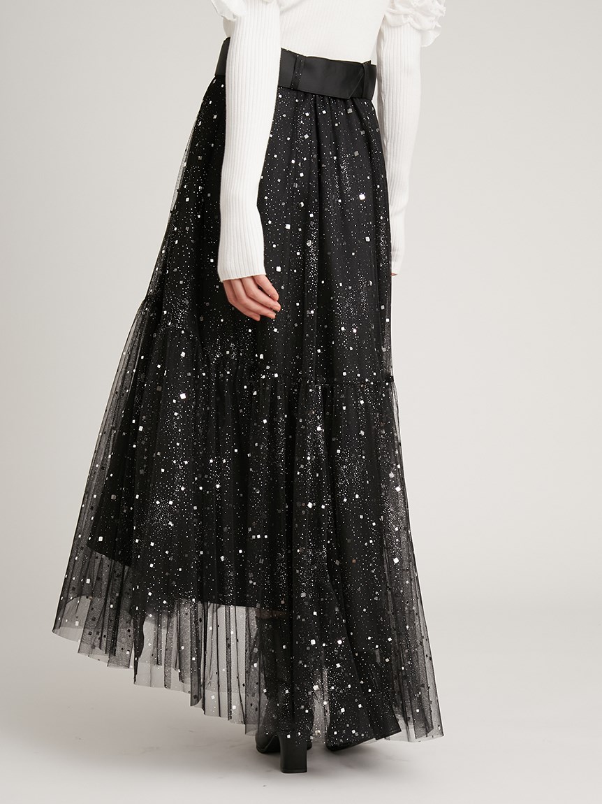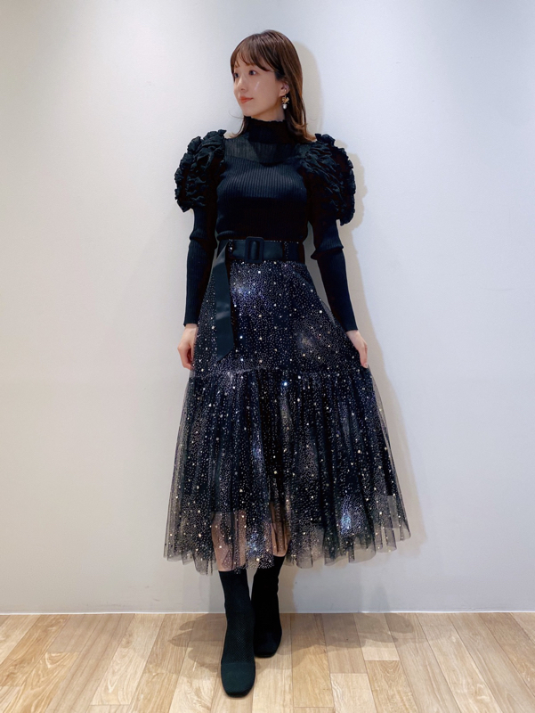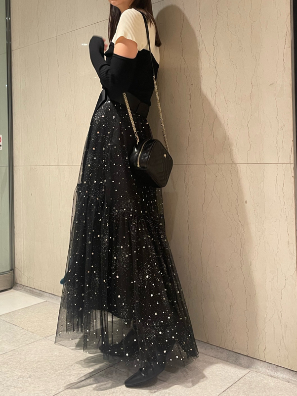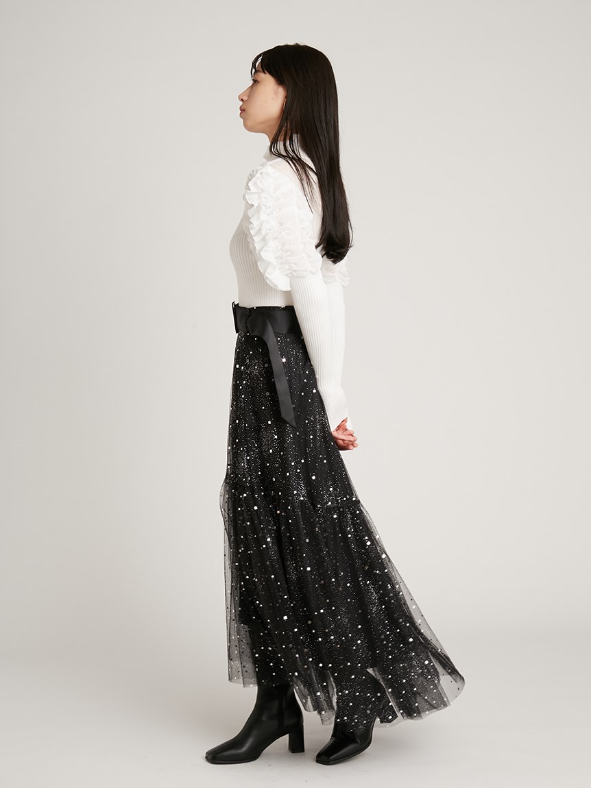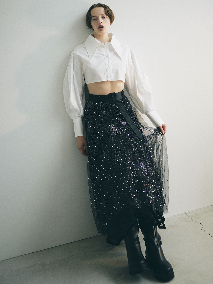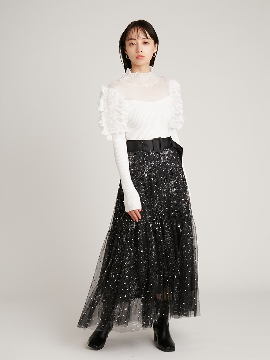 全体に煌めきのある箔プリントに更にスパンコールプリントをのせた、主役級の存在感を放つ華やかなチュールスカート。腰回りはすっきりとしたシルエットに仕上げ、裾にたっぷりとギャザーを入れボリュームのあるフレアラインに。シアーなチュール素材で軽やかなのでボリューミーながらも重くなりすぎない1着です。セットになったグログラン素材のベルトでウエストをマークすればメリハリのあるスタイリングに。ドレッシーなトップスを合わせてオンスタイルにもぴったりのアイテムです。