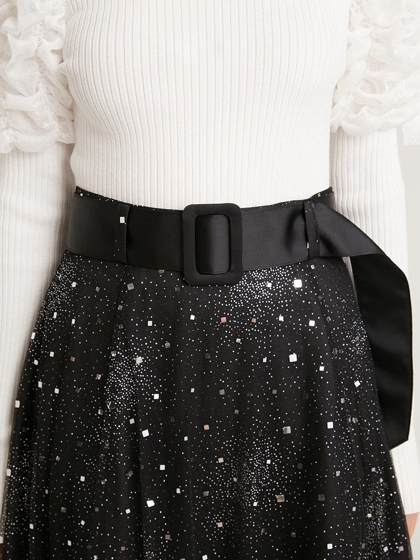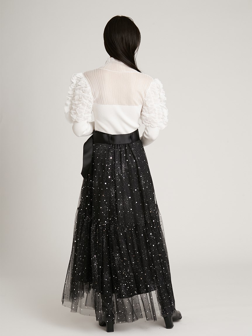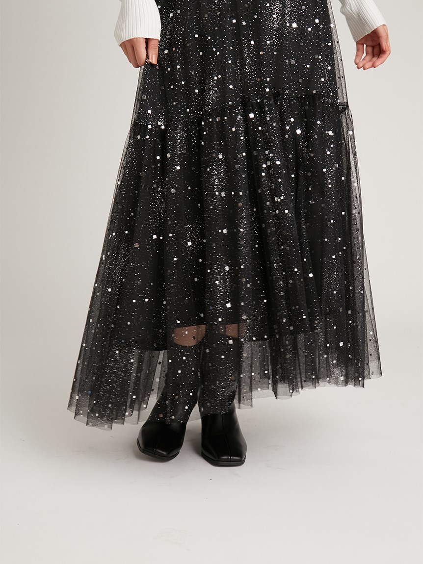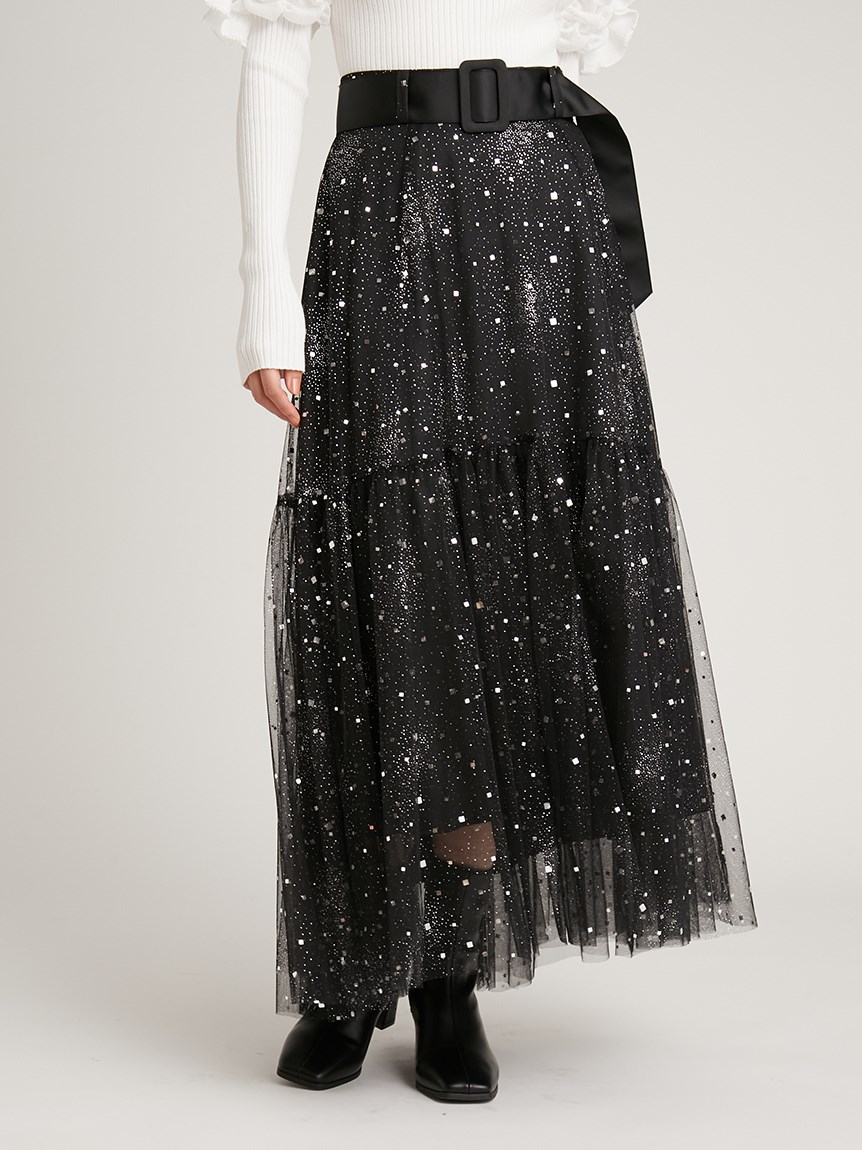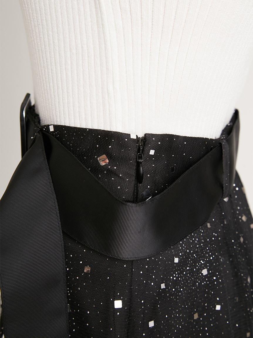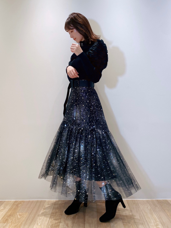 全体に煌めきのある箔プリントに更にスパンコールプリントをのせた、主役級の存在感を放つ華やかなチュールスカート。腰回りはすっきりとしたシルエットに仕上げ、裾にたっぷりとギャザーを入れボリュームのあるフレアラインに。シアーなチュール素材で軽やかなのでボリューミーながらも重くなりすぎない1着です。セットになったグログラン素材のベルトでウエストをマークすればメリハリのあるスタイリングに。ドレッシーなトップスを合わせてオンスタイルにもぴったりのアイテムです。