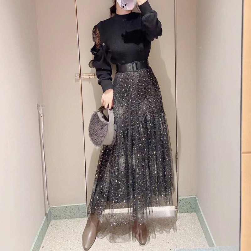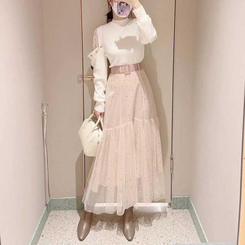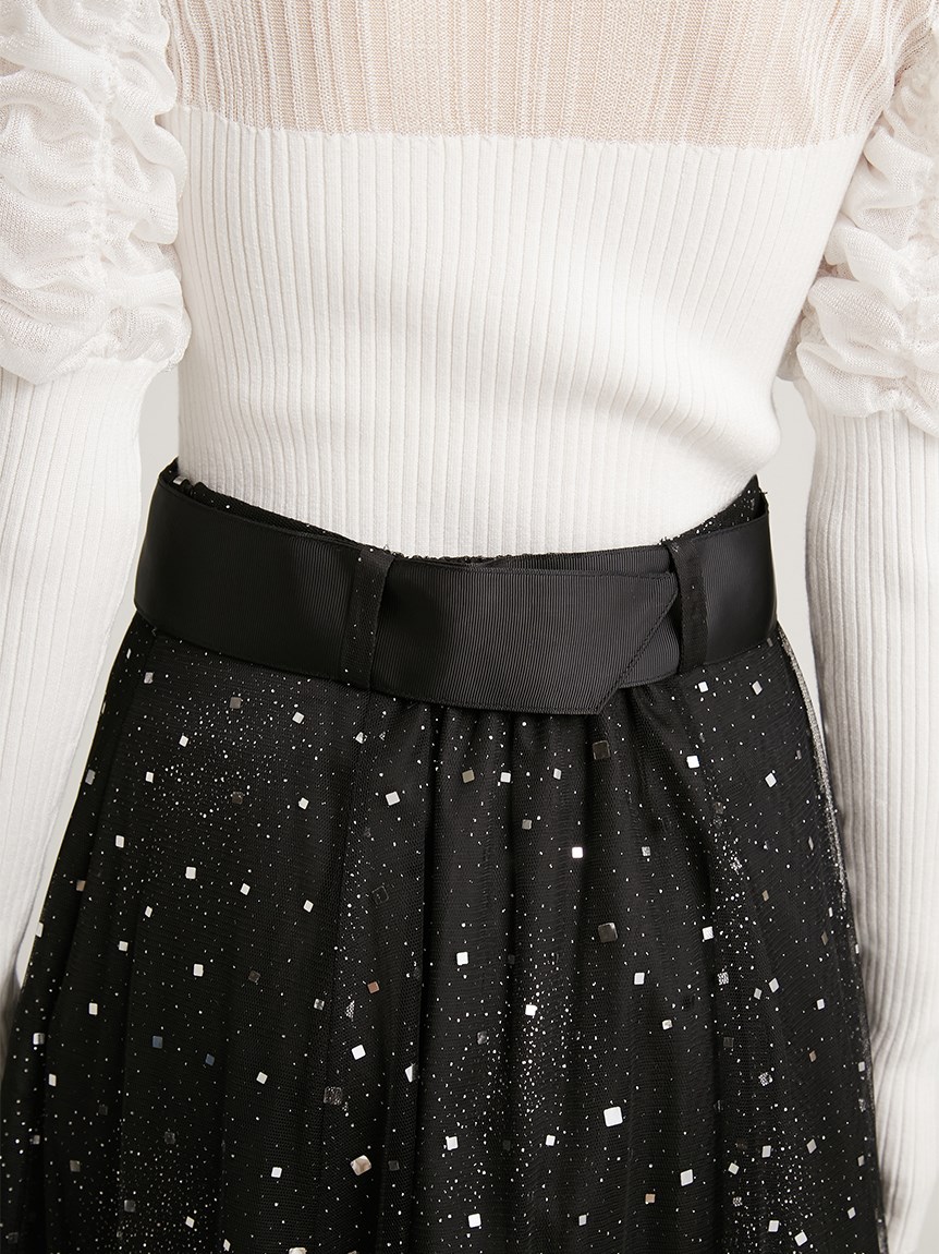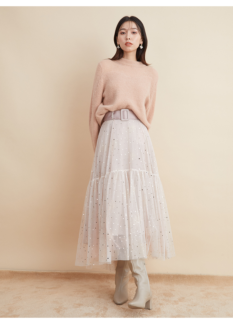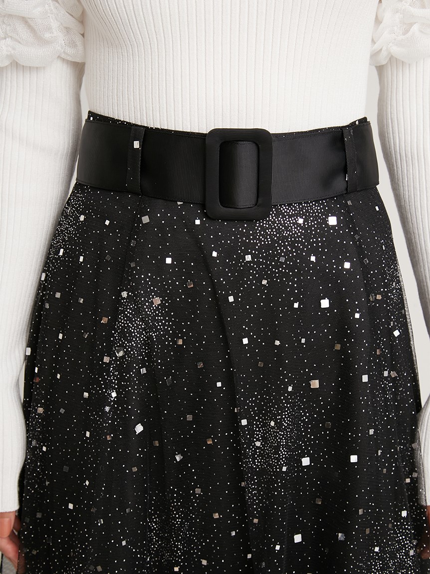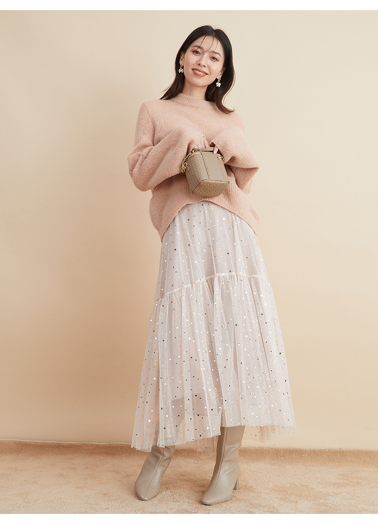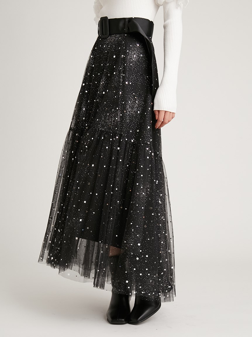 全体に煌めきのある箔プリントに更にスパンコールプリントをのせた、主役級の存在感を放つ華やかなチュールスカート。腰回りはすっきりとしたシルエットに仕上げ、裾にたっぷりとギャザーを入れボリュームのあるフレアラインに。シアーなチュール素材で軽やかなのでボリューミーながらも重くなりすぎない1着です。セットになったグログラン素材のベルトでウエストをマークすればメリハリのあるスタイリングに。ドレッシーなトップスを合わせてオンスタイルにもぴったりのアイテムです。