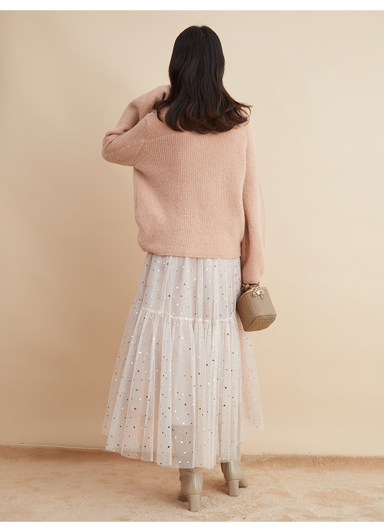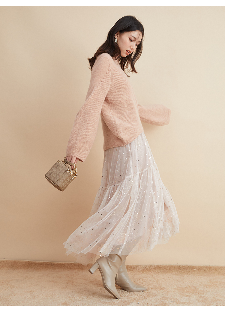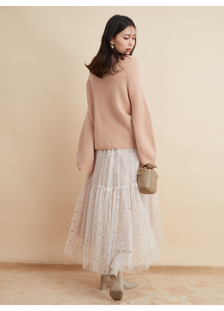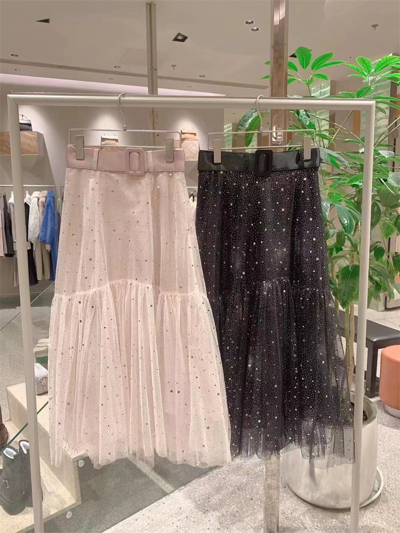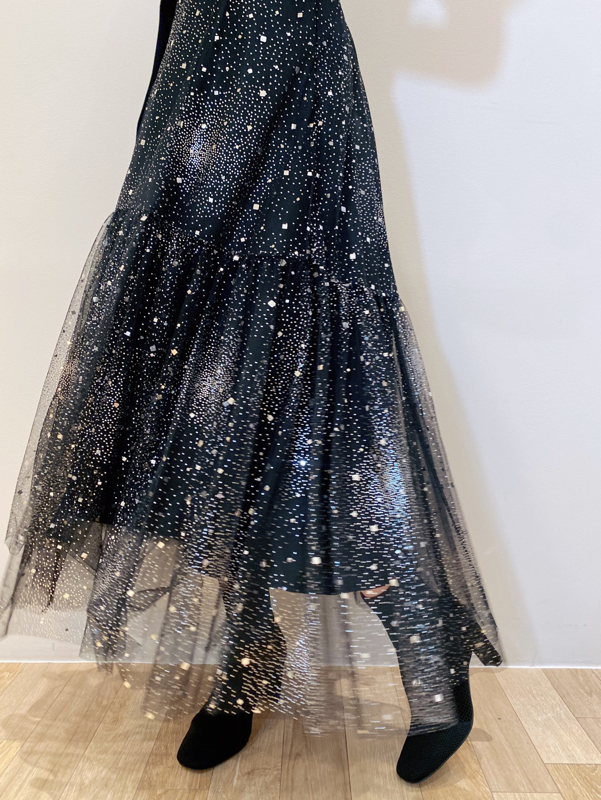 シアーで繊細なチュールにシャイニーな箔プリントとスパンコールプリントを施しました。大人っぽい印象を与えるブラック、優しい色合いのピンクベージュの2色展開でお届けします。