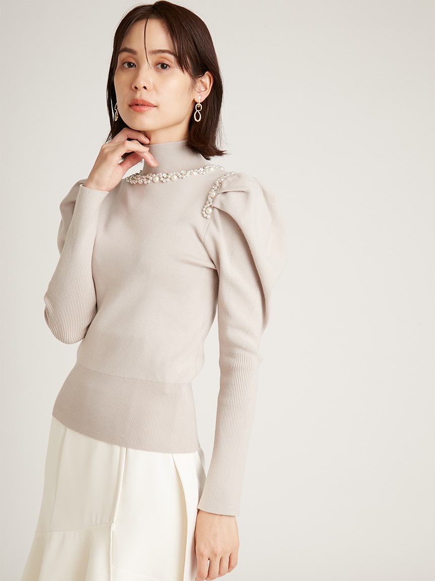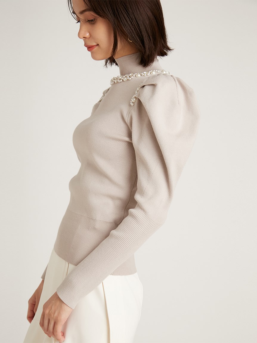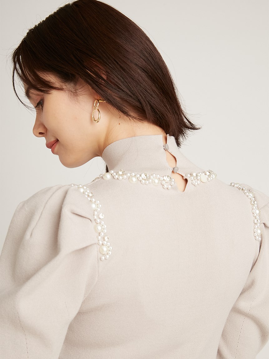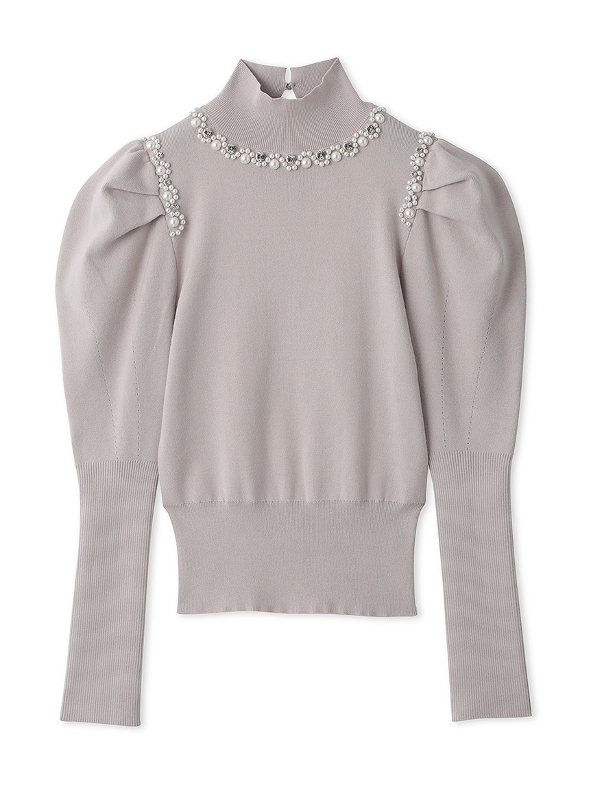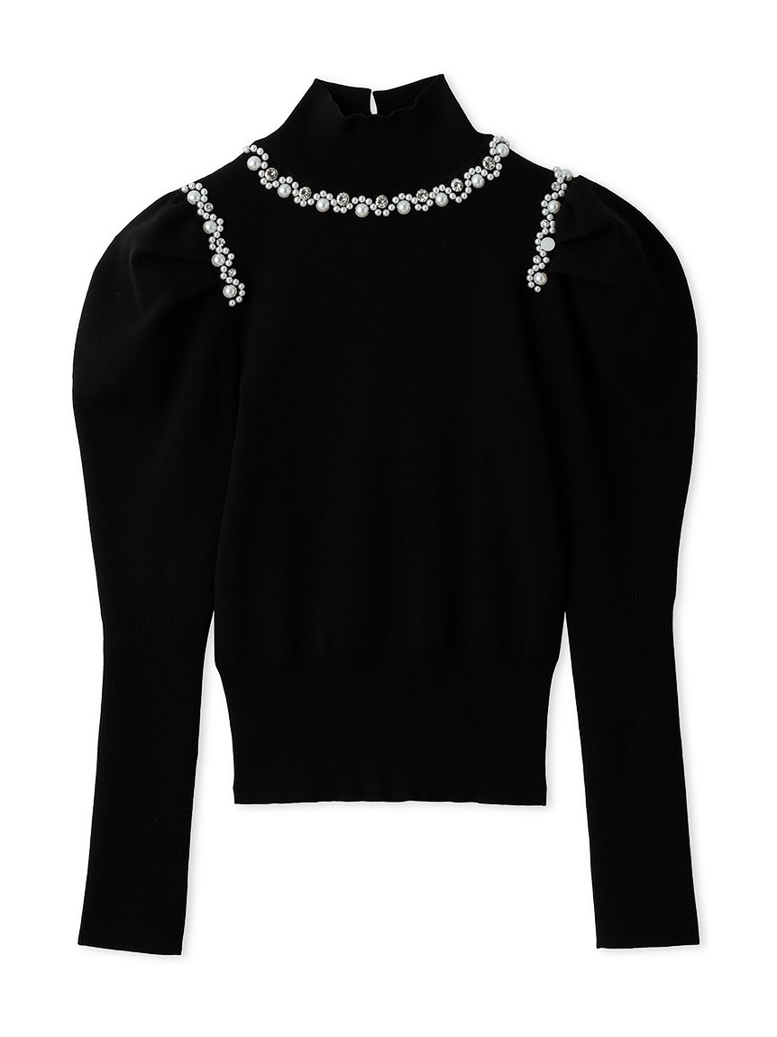ふんだんにあしらわれたパールやビジューの装飾が目を引く、華やかなニットプルオーバー。敢えてビジューを派手に施すことで、どこか懐かしさを感じさせる今っぽい雰囲気を演出しました。たっぷりとタックを効かせた構築的なフォルムのボリュームスリーブがモードなアクセントに。身頃部分はタイトなシルエットなのでパンツともスカートとも合わせやすく、幅広いコーディネートに活躍してくれます。