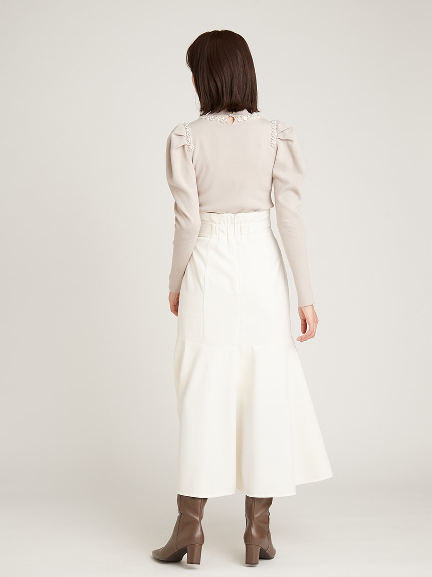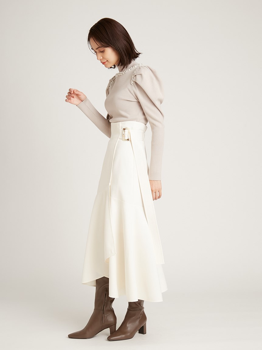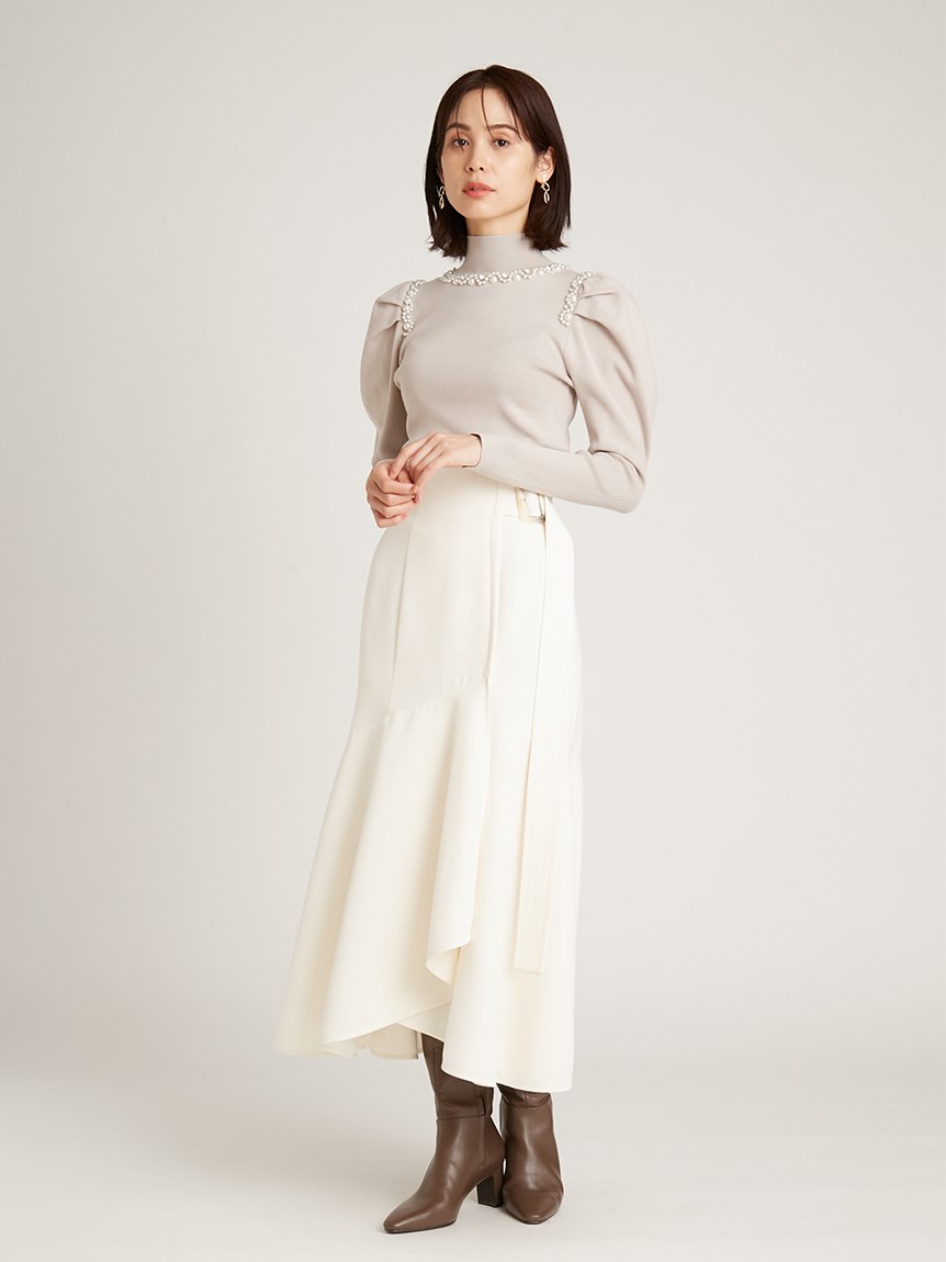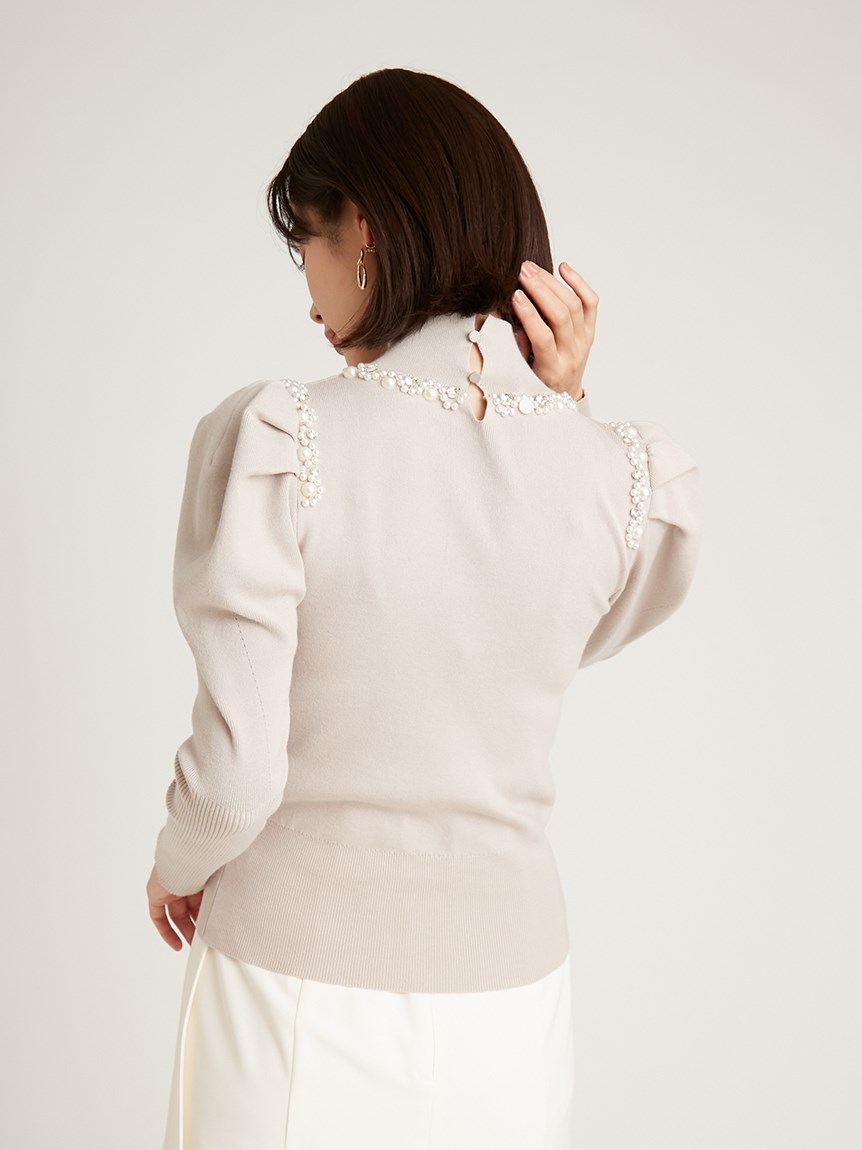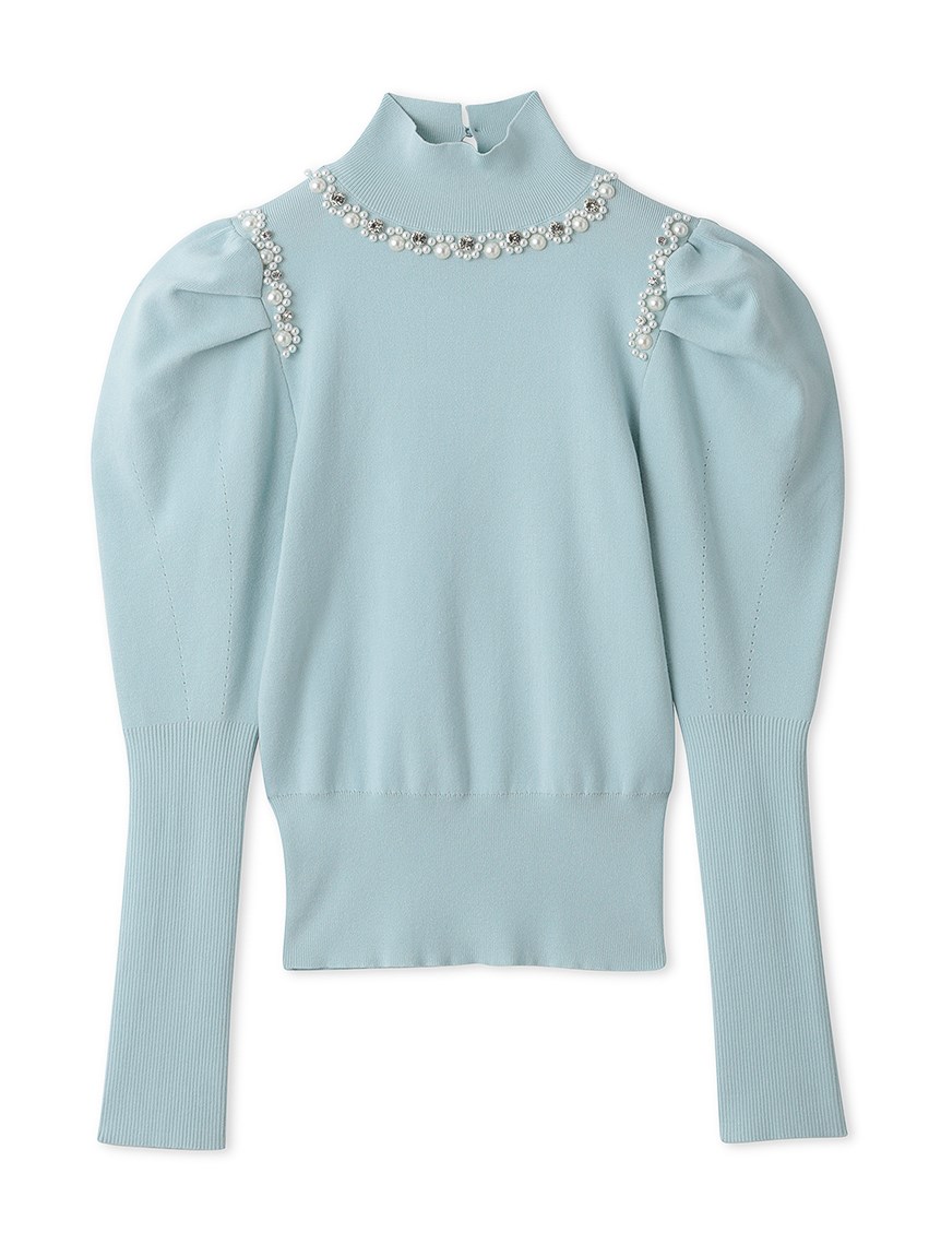 ふんだんにあしらわれたパールやビジューの装飾が目を引く、華やかなニットプルオーバー。敢えてビジューを派手に施すことで、どこか懐かしさを感じさせる今っぽい雰囲気を演出しました。たっぷりとタックを効かせた構築的なフォルムのボリュームスリーブがモードなアクセントに。身頃部分はタイトなシルエットなのでパンツともスカートとも合わせやすく、幅広いコーディネートに活躍してくれます。