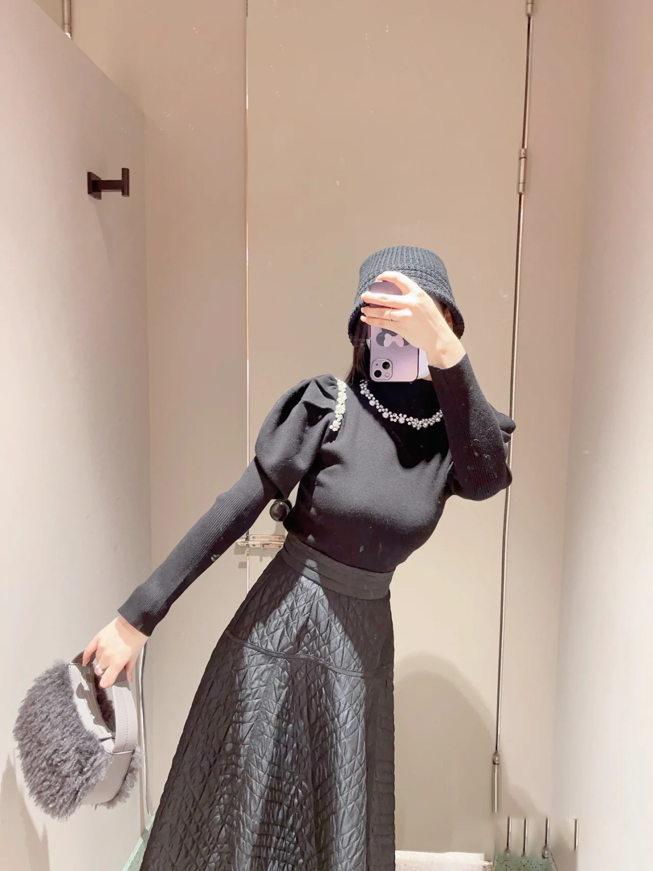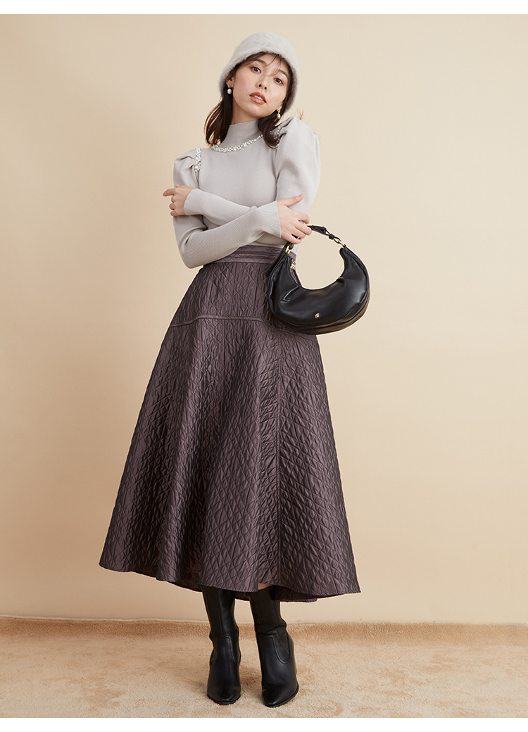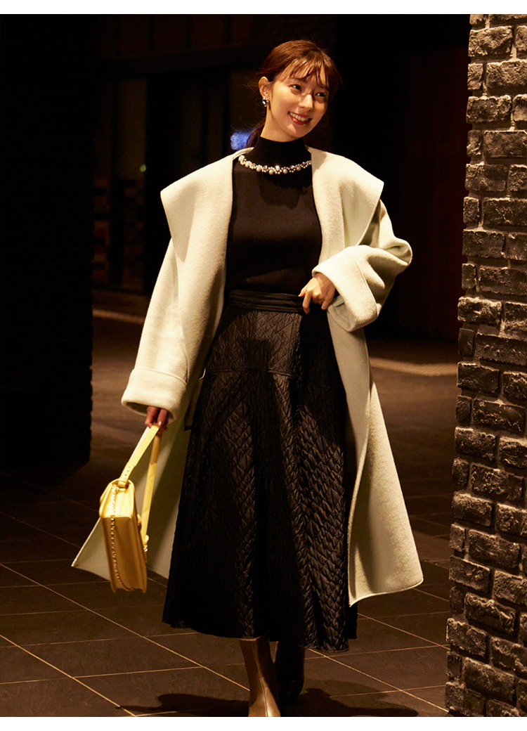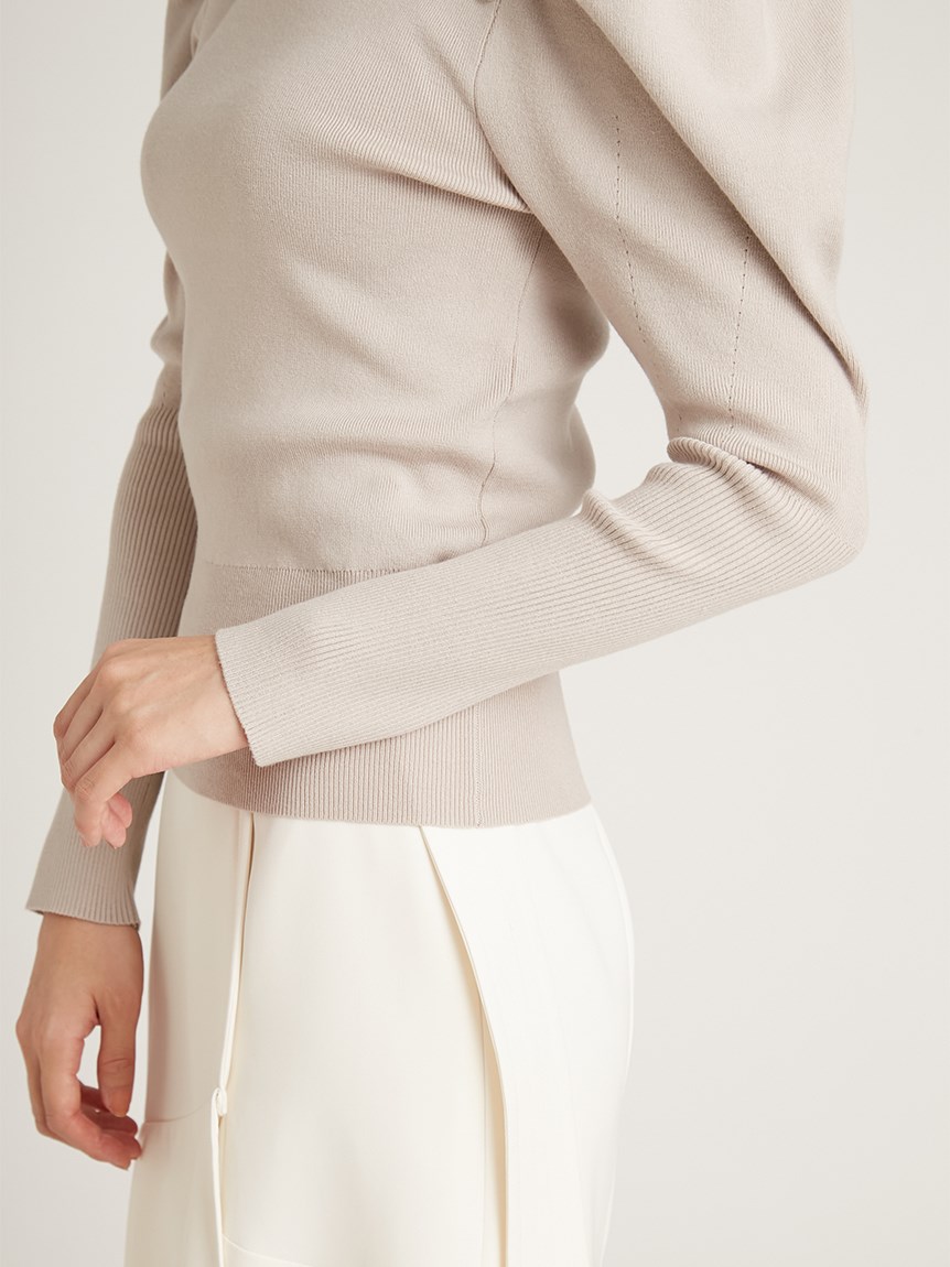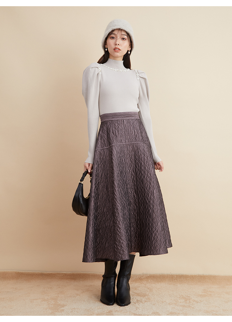 ふんだんにあしらわれたパールやビジューの装飾が目を引く、華やかなニットプルオーバー。敢えてビジューを派手に施すことで、どこか懐かしさを感じさせる今っぽい雰囲気を演出しました。たっぷりとタックを効かせた構築的なフォルムのボリュームスリーブがモードなアクセントに。身頃部分はタイトなシルエットなのでパンツともスカートとも合わせやすく、幅広いコーディネートに活躍してくれます。