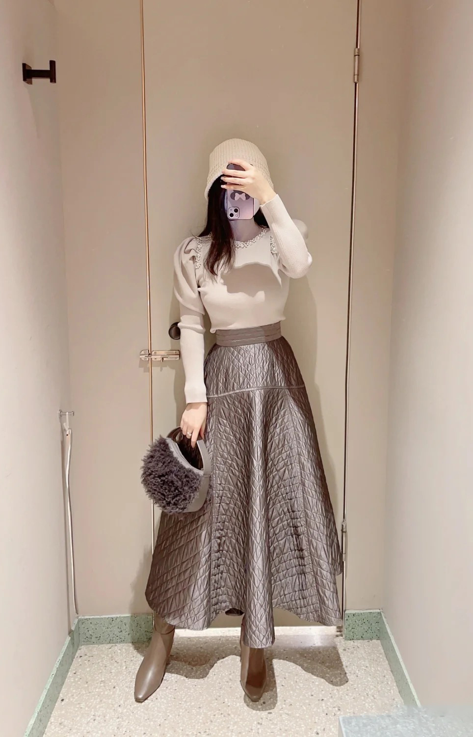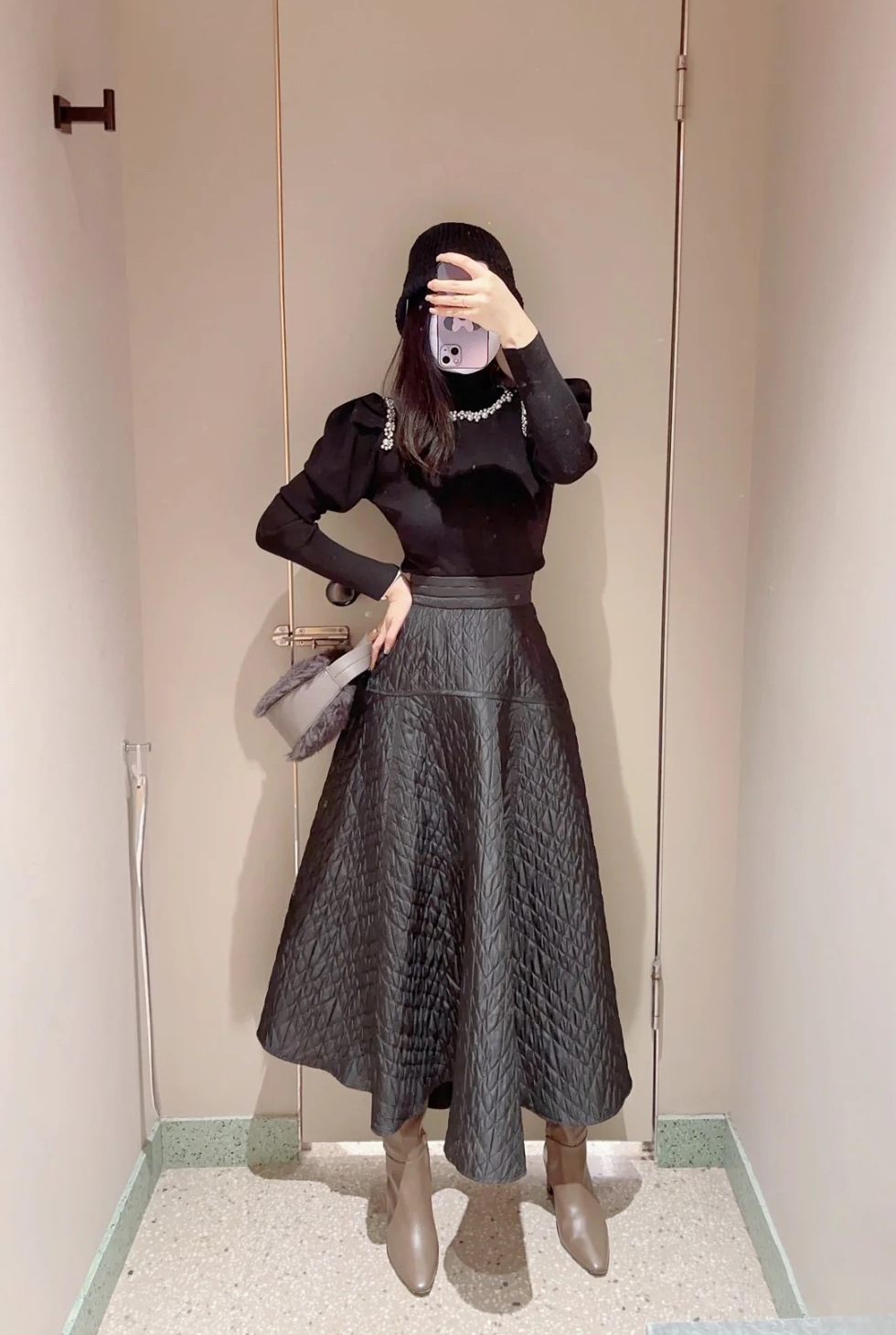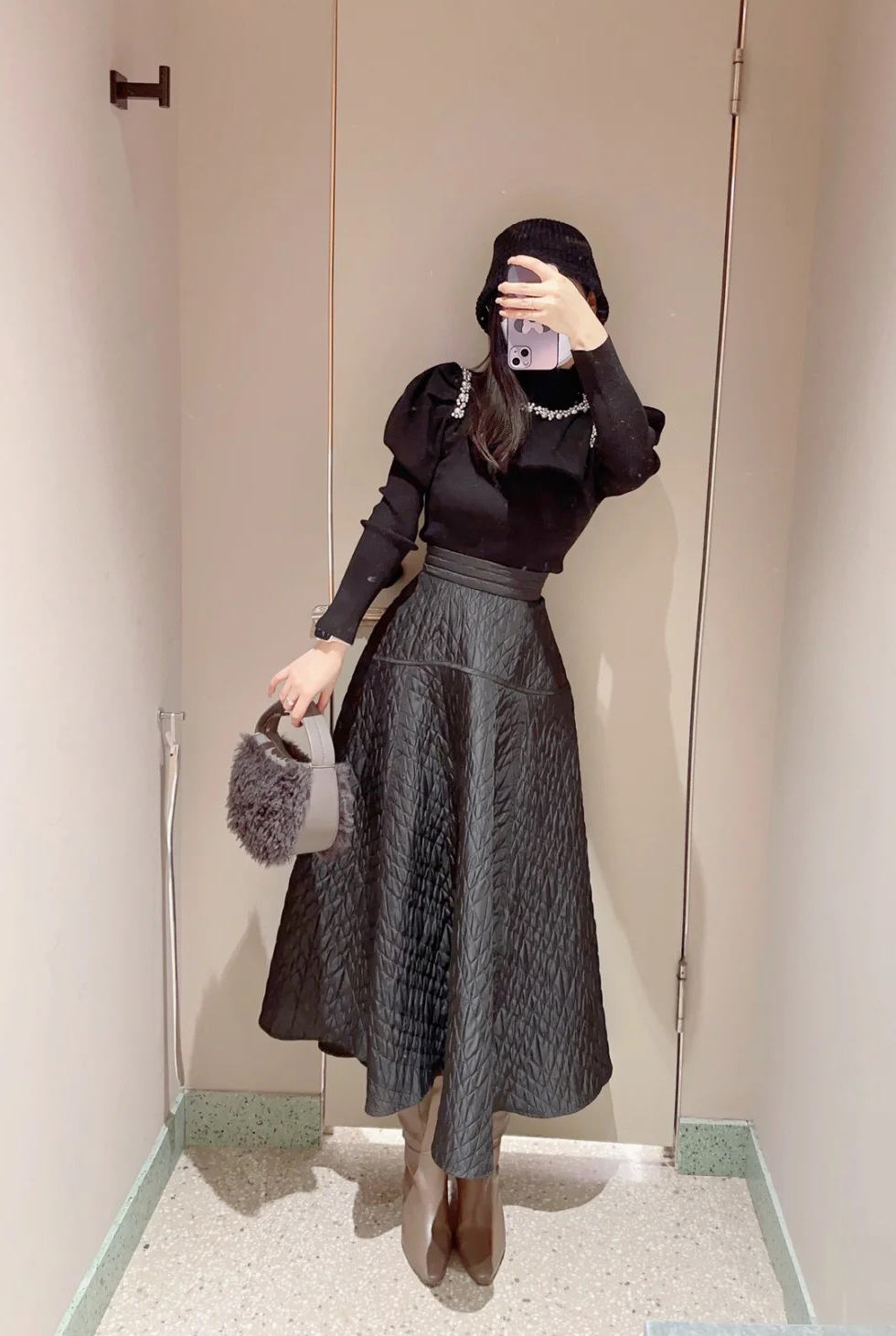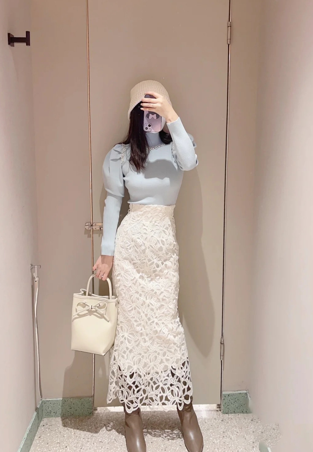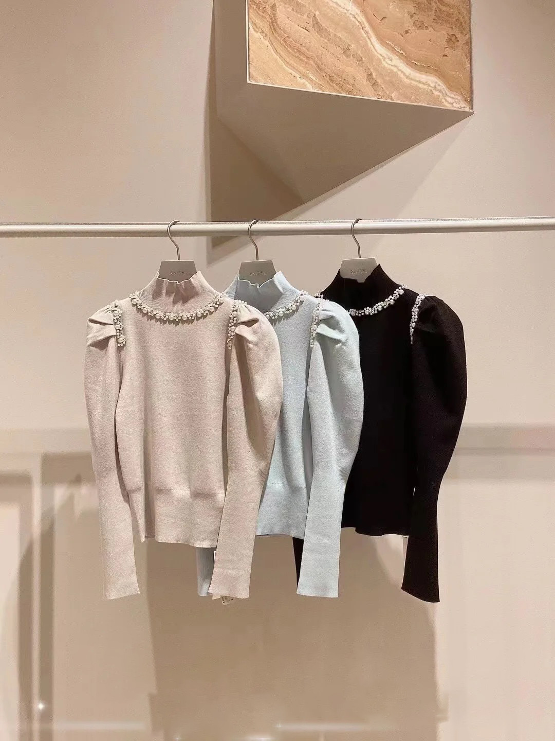 きれいめな印象を与えるハイゲージのサステナブルなニット素材を使用。シックな雰囲気のブラック、馴染みの良い優しい色合いのグレーベージュ、明るめの色合いが華やかなライトブルーの3色をご用意しました。