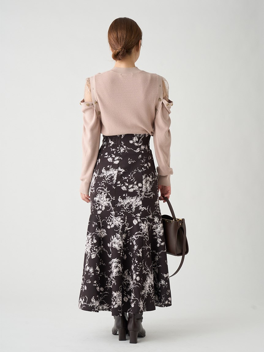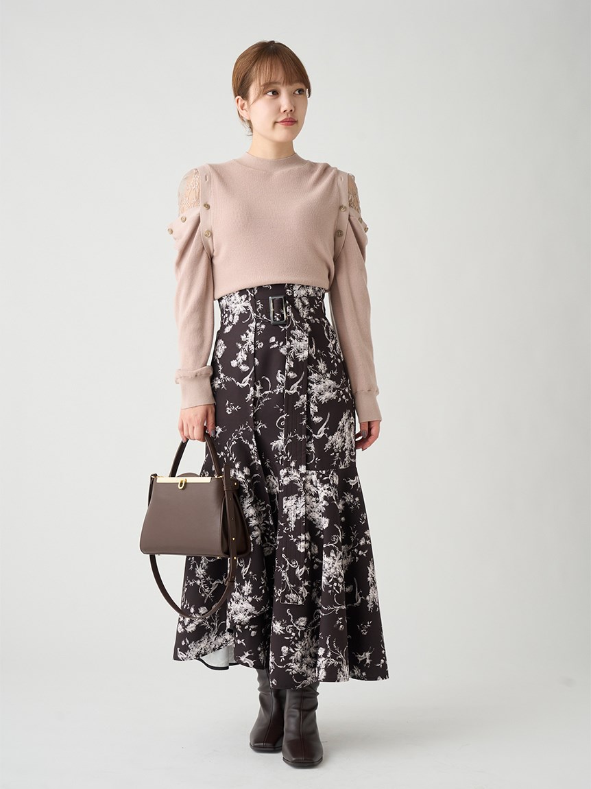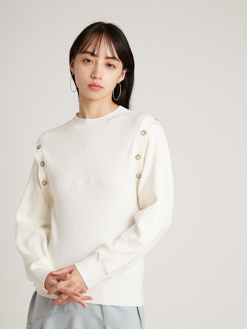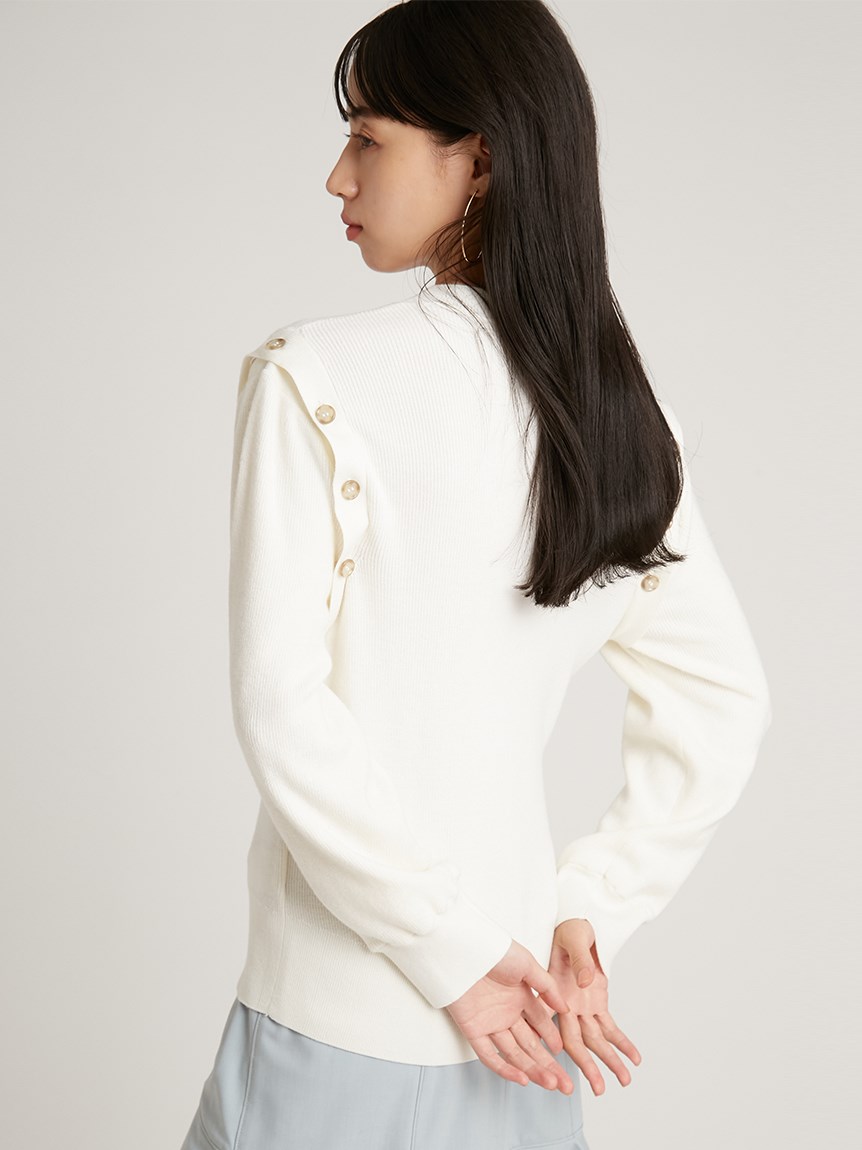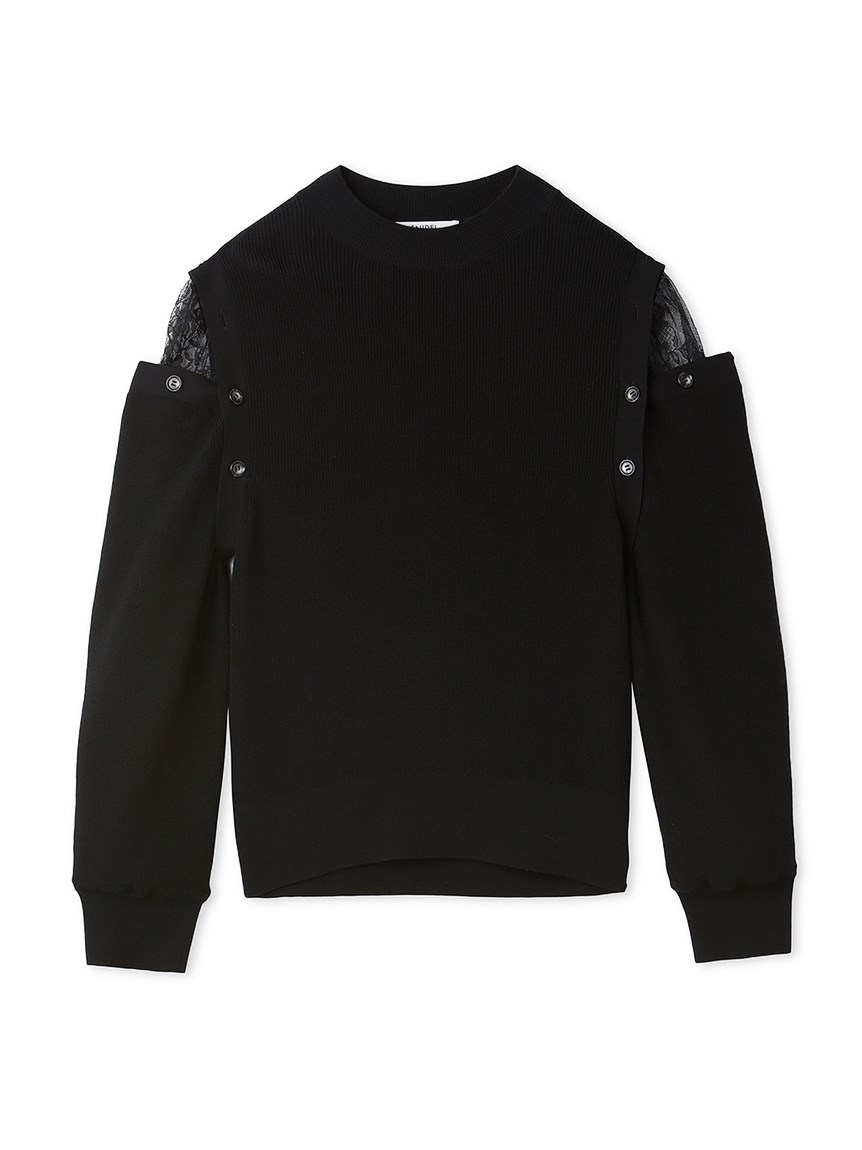 繊細なレースで切り替えたショルダーデザインが特徴的な、センシュアルな肌見せで女性らしさを高めるニットプルオーバー。アームホール部分にあしらわれたボタンをすべて留めるとシンプルなトップスとしても着られる2WAY仕様で、スタイリングや気分に合わせてアレンジできる万能な1着です。身頃部分はすっきりとミニマムに仕上げることで品の良いルックスに。ジャストシルエットなのでパンツともスカートとも合わせやすく、幅広いコーディネートに重宝します。