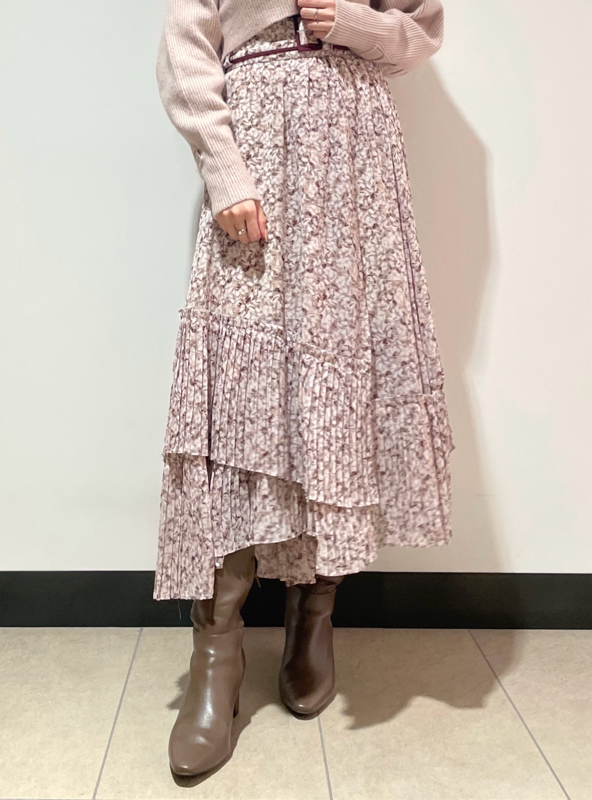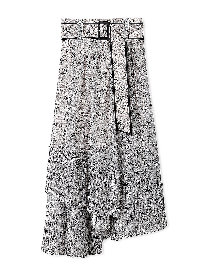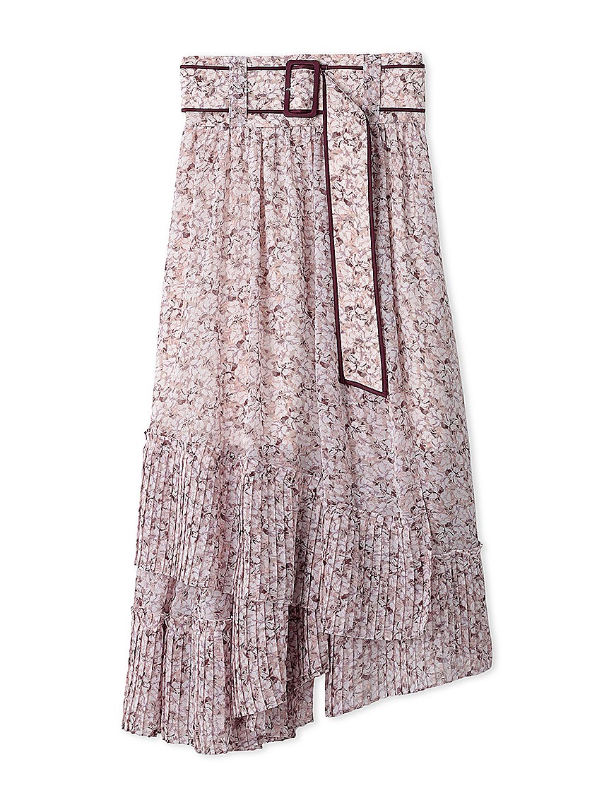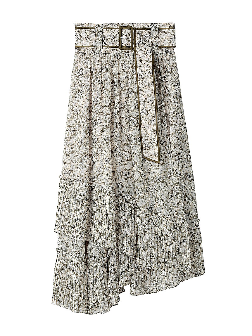 一面に浮かべたオリジナルのフラワープリントが印象的な、春らしいムードを感じさせるスカート。裾にプリーツをふんだんに施したイレギュラーヘムが歩くたびになびき、女性らしく軽やかな表情を演出しています。パイピングでアクセントを付けた同素材のベルトでウエストマークすれば引き締まった印象に。トップスはウエストにインしてすっきりとまとめるのがスタイルアップの秘訣です。