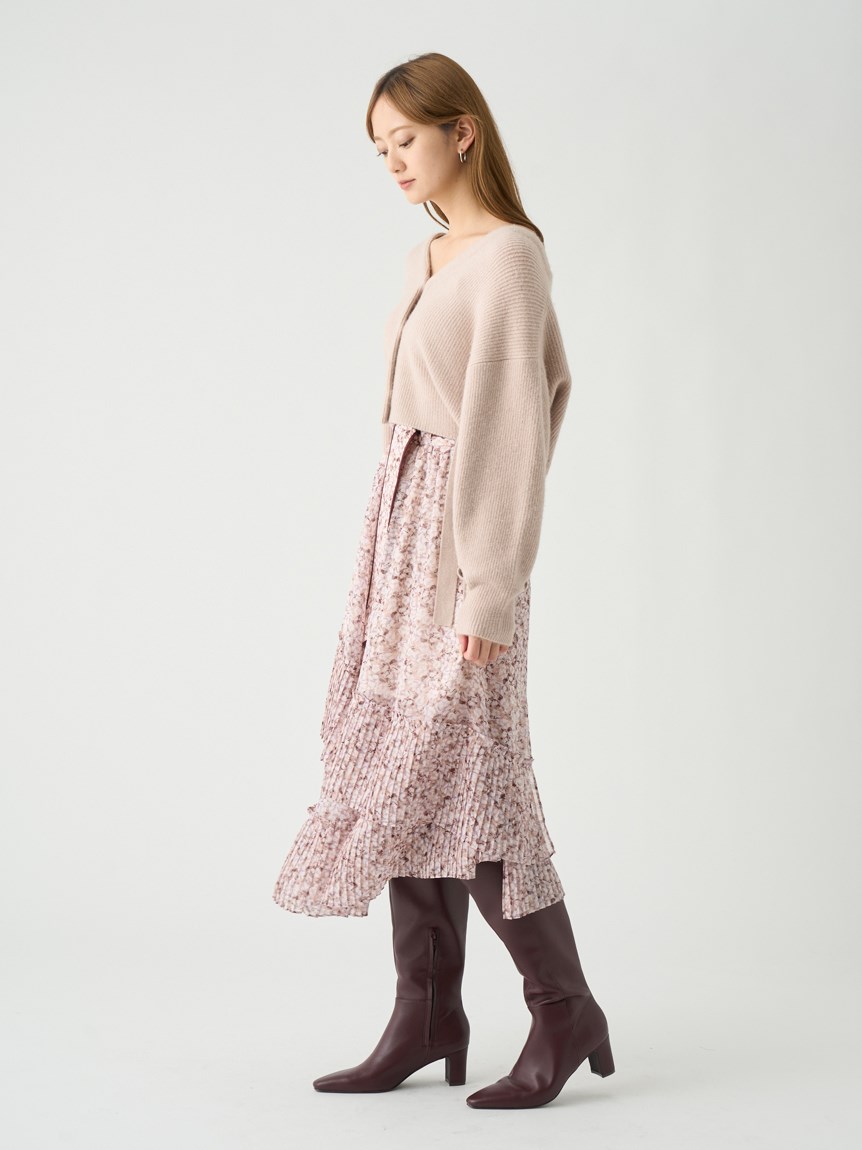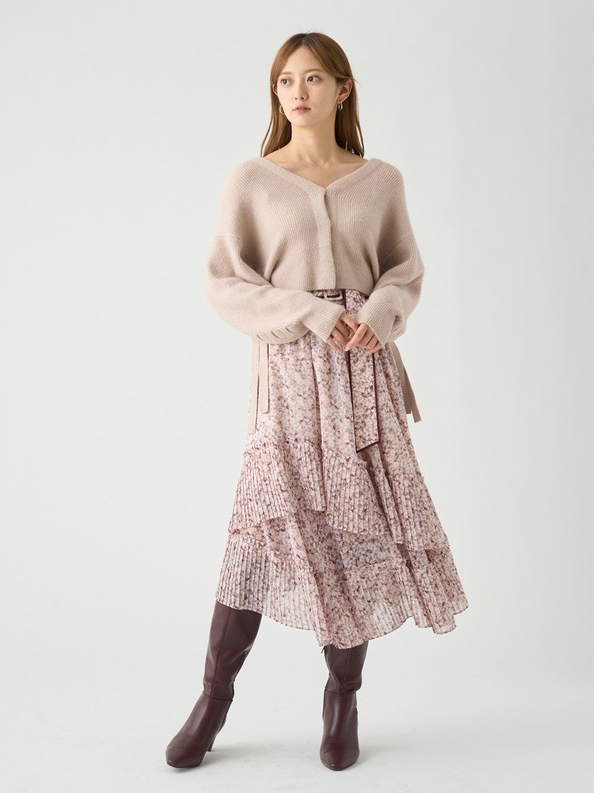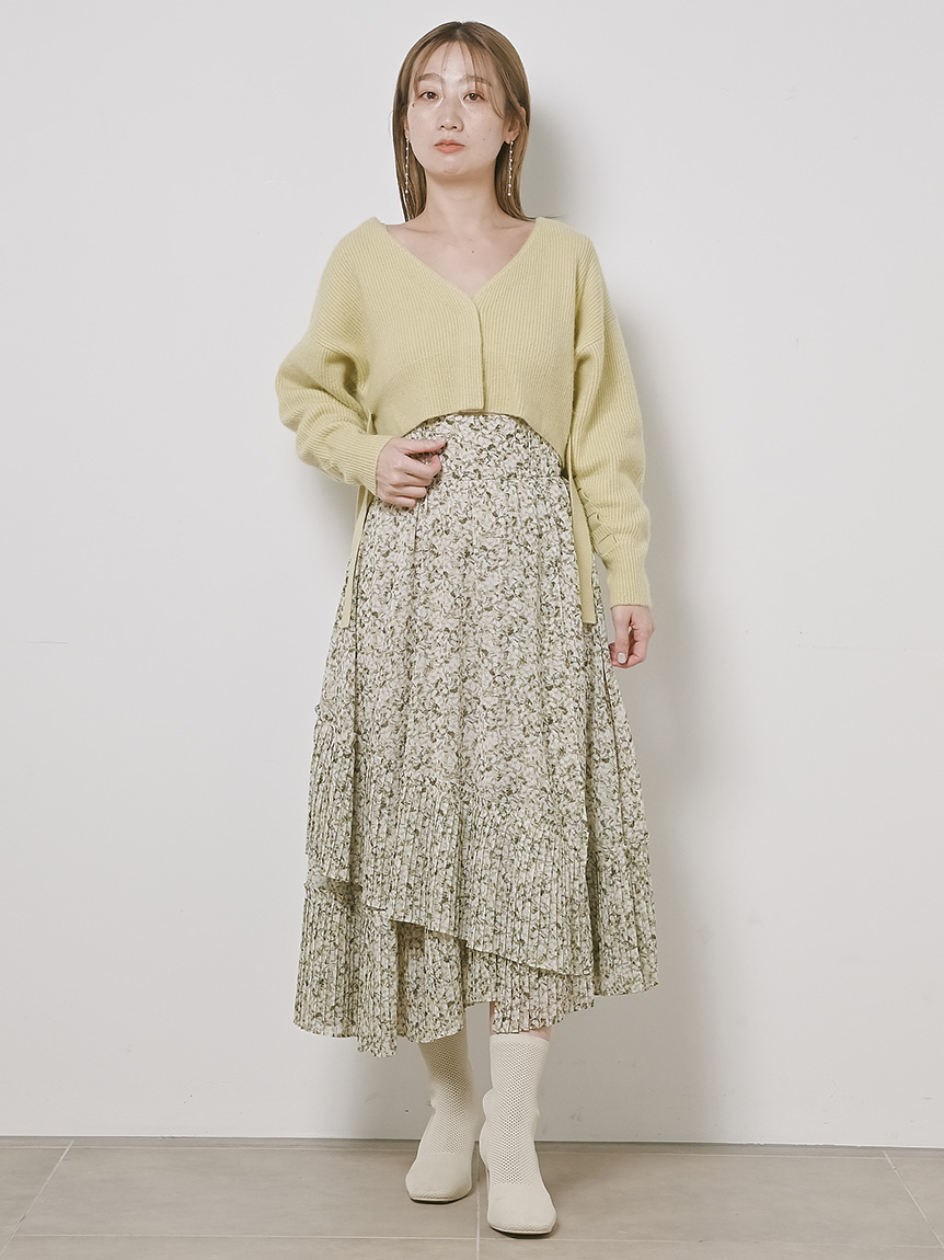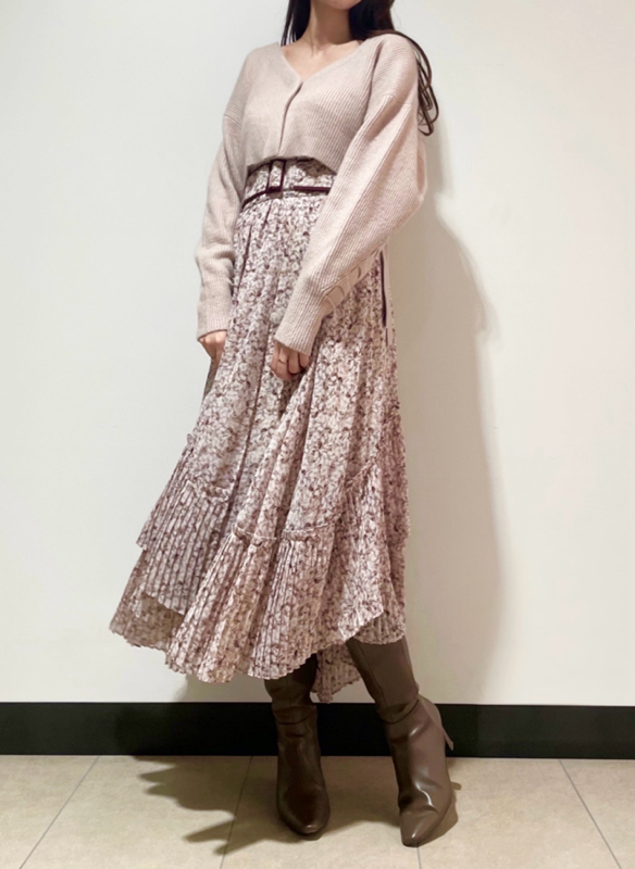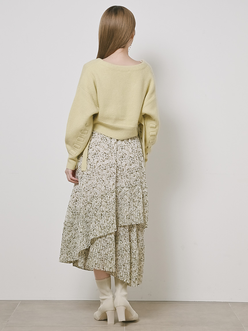 一面に浮かべたオリジナルのフラワープリントが印象的な、春らしいムードを感じさせるスカート。裾にプリーツをふんだんに施したイレギュラーヘムが歩くたびになびき、女性らしく軽やかな表情を演出しています。パイピングでアクセントを付けた同素材のベルトでウエストマークすれば引き締まった印象に。トップスはウエストにインしてすっきりとまとめるのがスタイルアップの秘訣です。