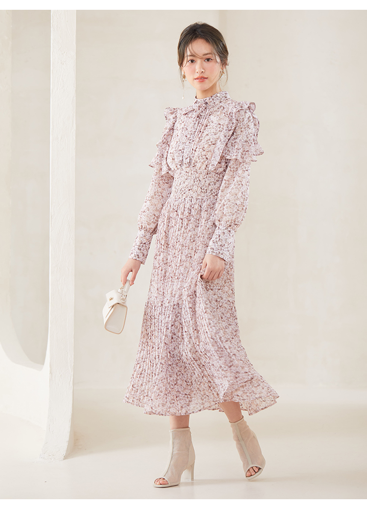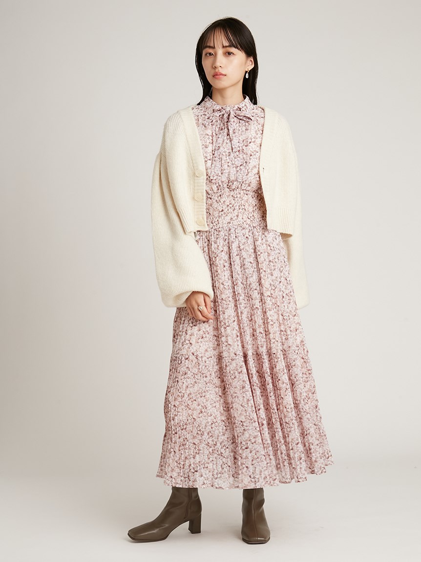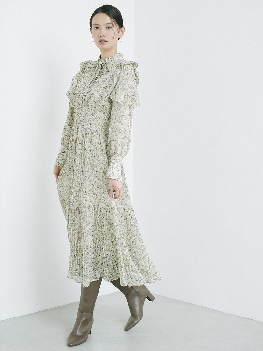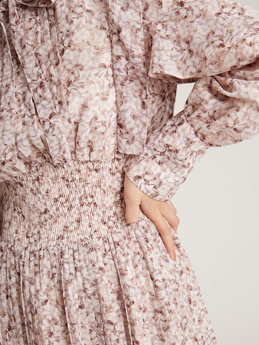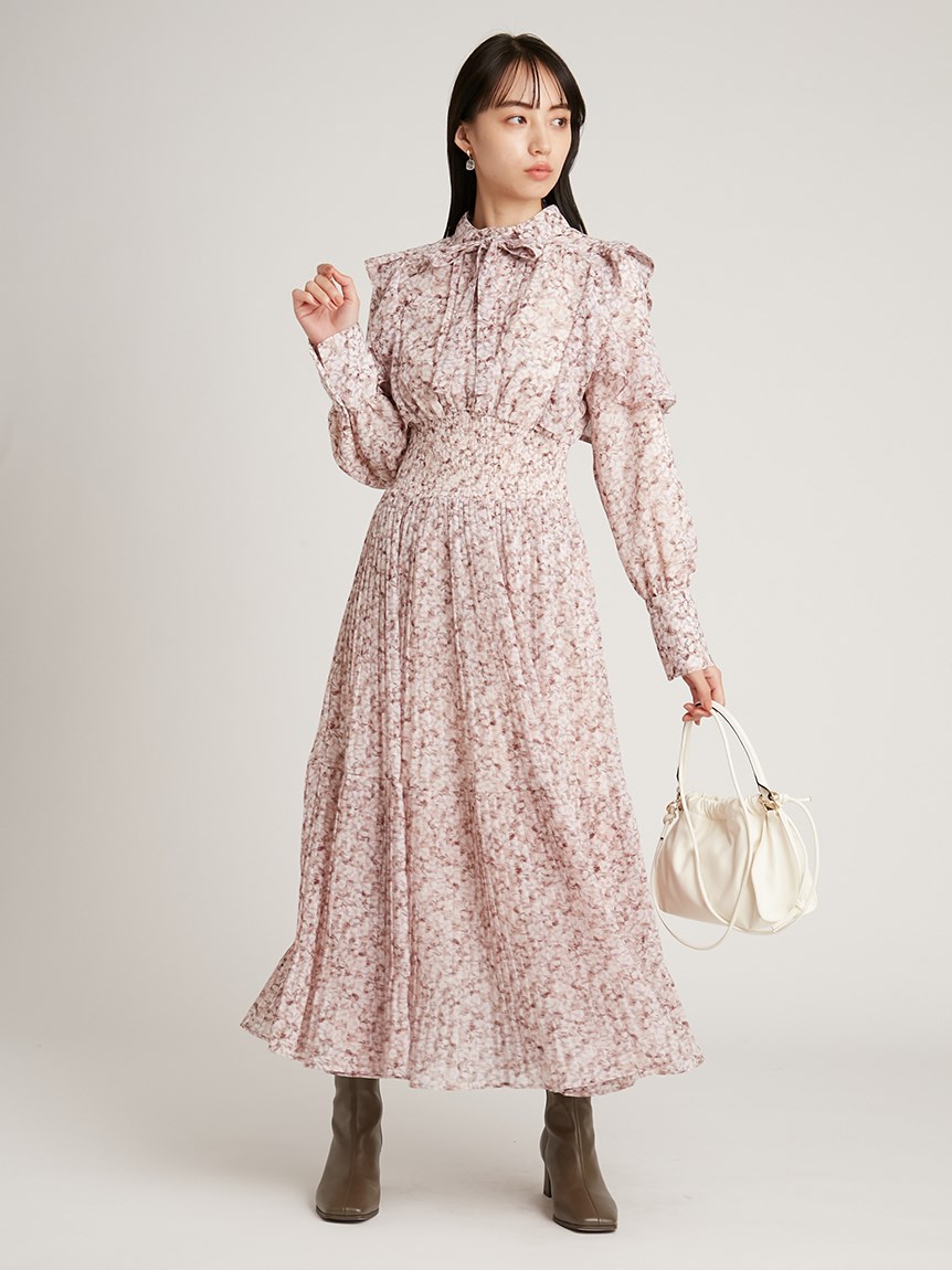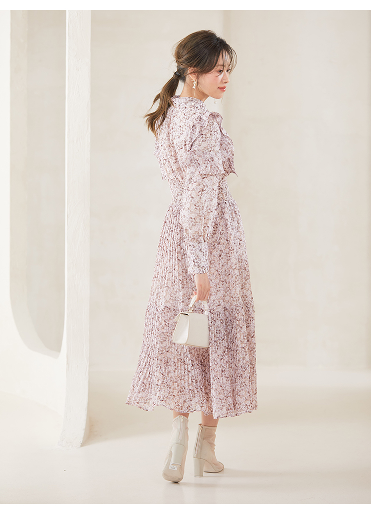一面に浮かべたオリジナルのフラワープリントが印象的な、春らしいムードを感じさせるスワンピース。細やかなプリーツをふんだんに施したフレアラインが歩くたびになびき、女性らしく軽やかな表情を演出しています。トップ部分にはフリルやリボンをあしらい、どこまでも女性らしい仕上がりに。袖も裏地付きなので長袖インナーとの併用ができ、まだ寒い時期から着られるので、ロングシーズン活躍してくれるアイテムです。