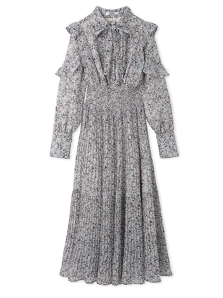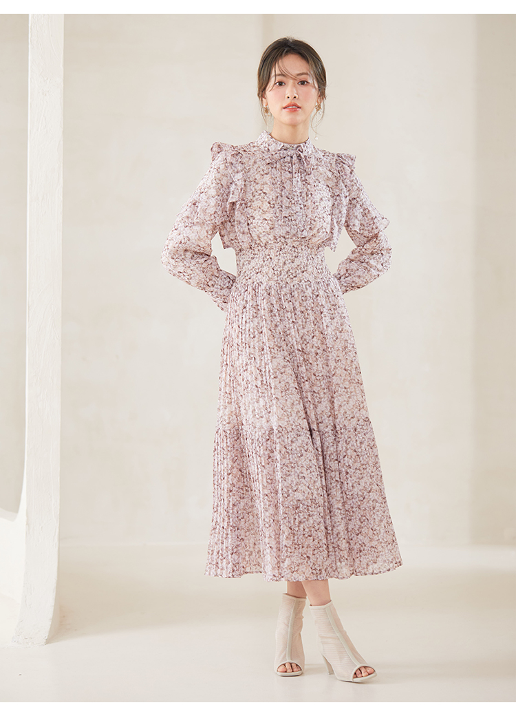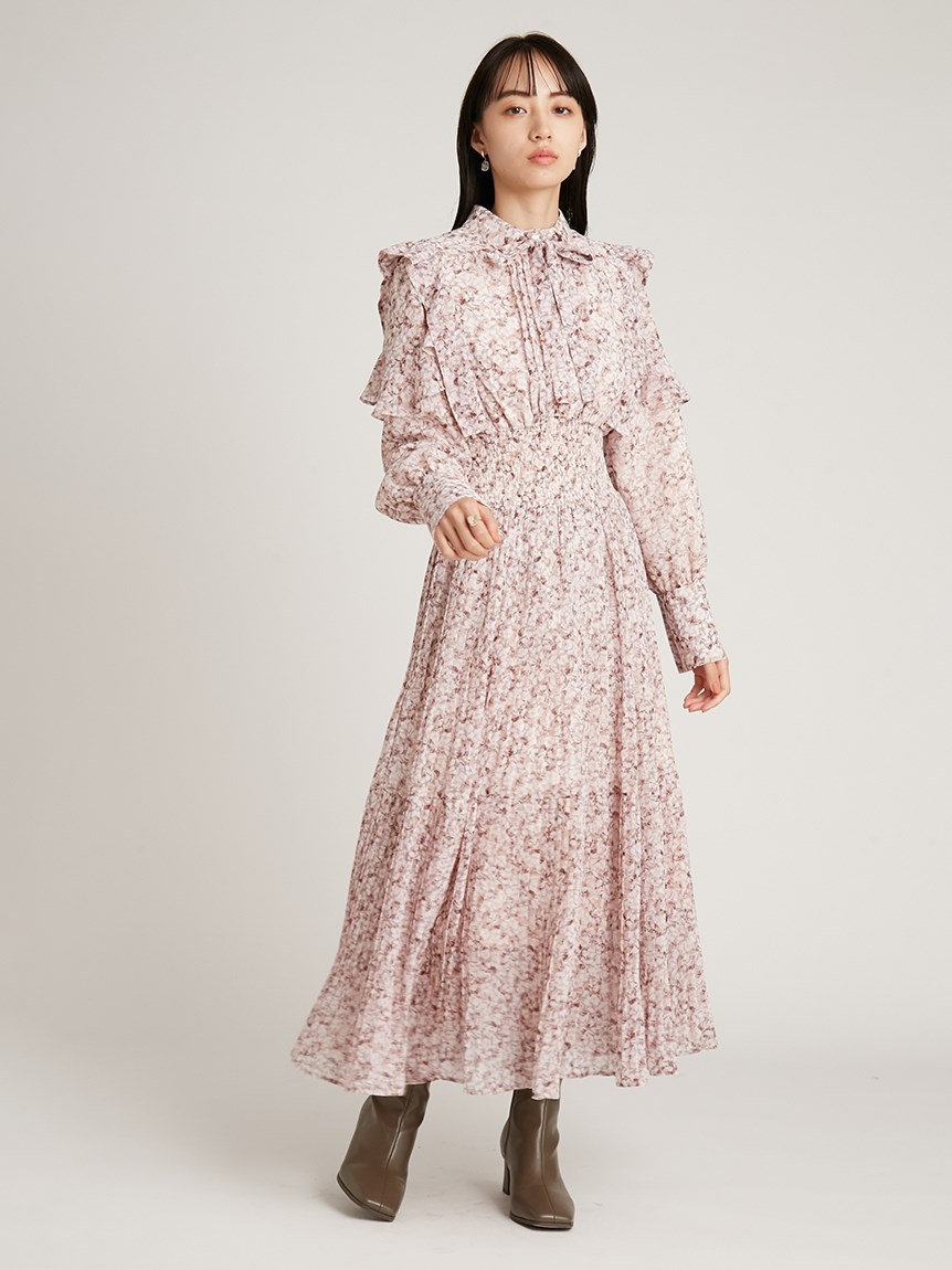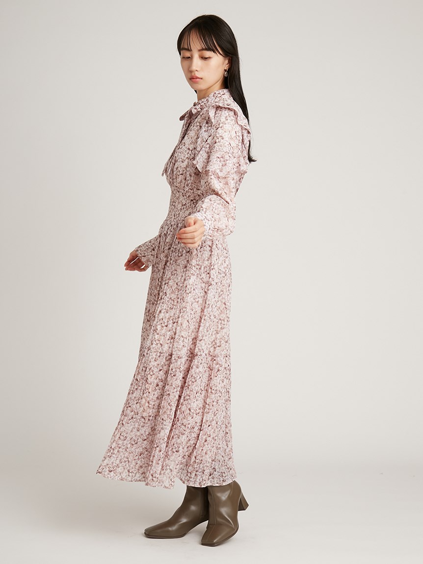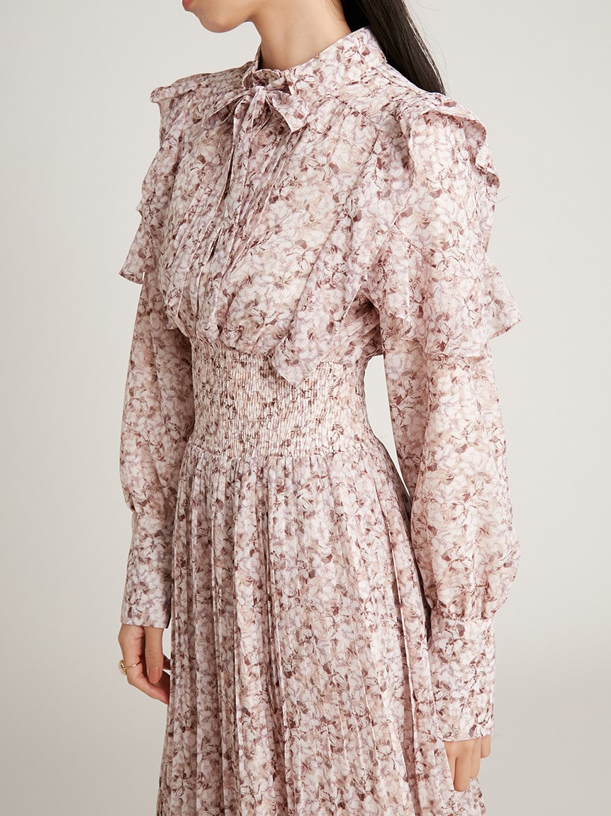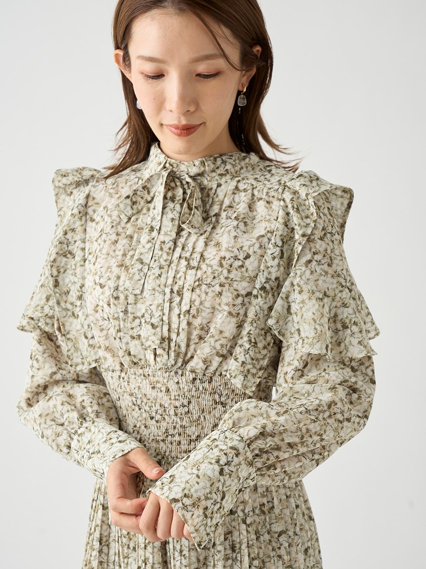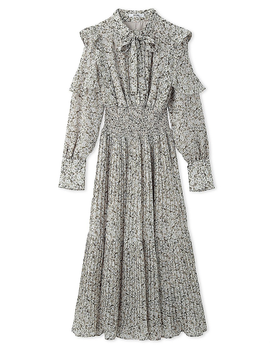 一面に浮かべたオリジナルのフラワープリントが印象的な、春らしいムードを感じさせるスワンピース。細やかなプリーツをふんだんに施したフレアラインが歩くたびになびき、女性らしく軽やかな表情を演出しています。トップ部分にはフリルやリボンをあしらい、どこまでも女性らしい仕上がりに。袖も裏地付きなので長袖インナーとの併用ができ、まだ寒い時期から着られるので、ロングシーズン活躍してくれるアイテムです。