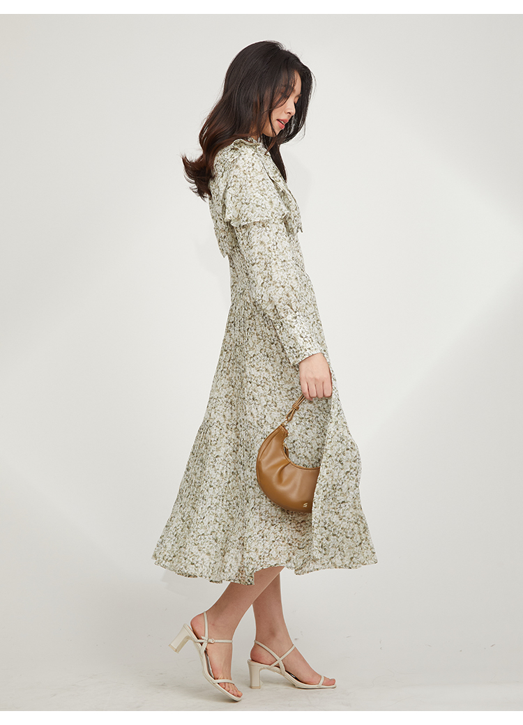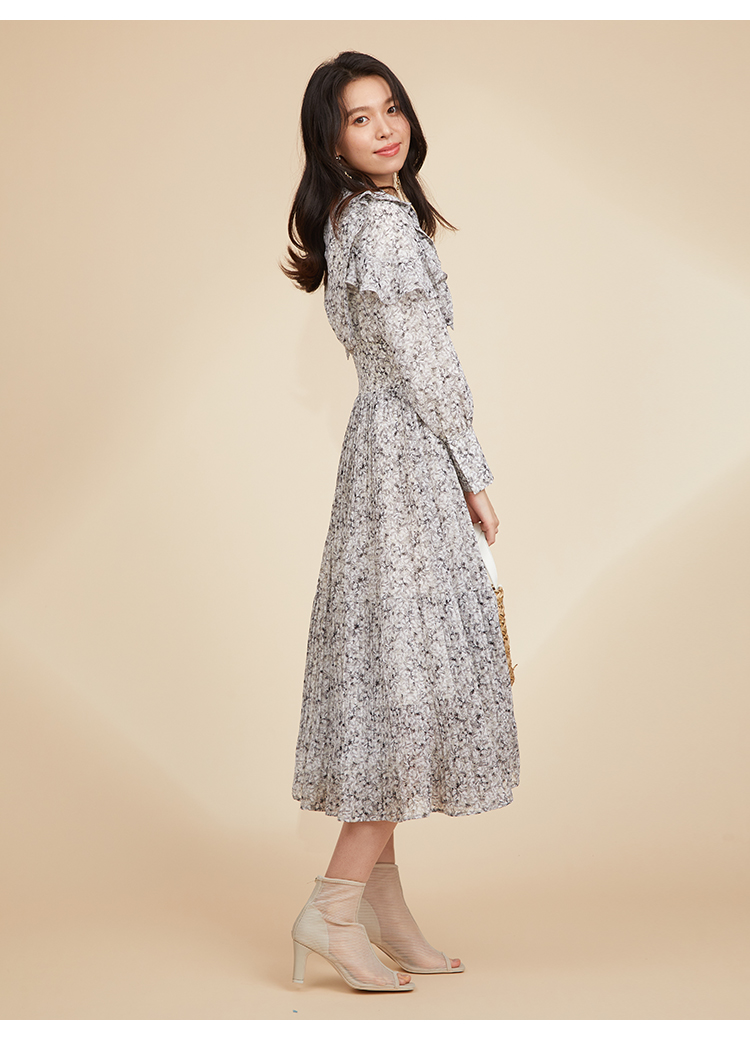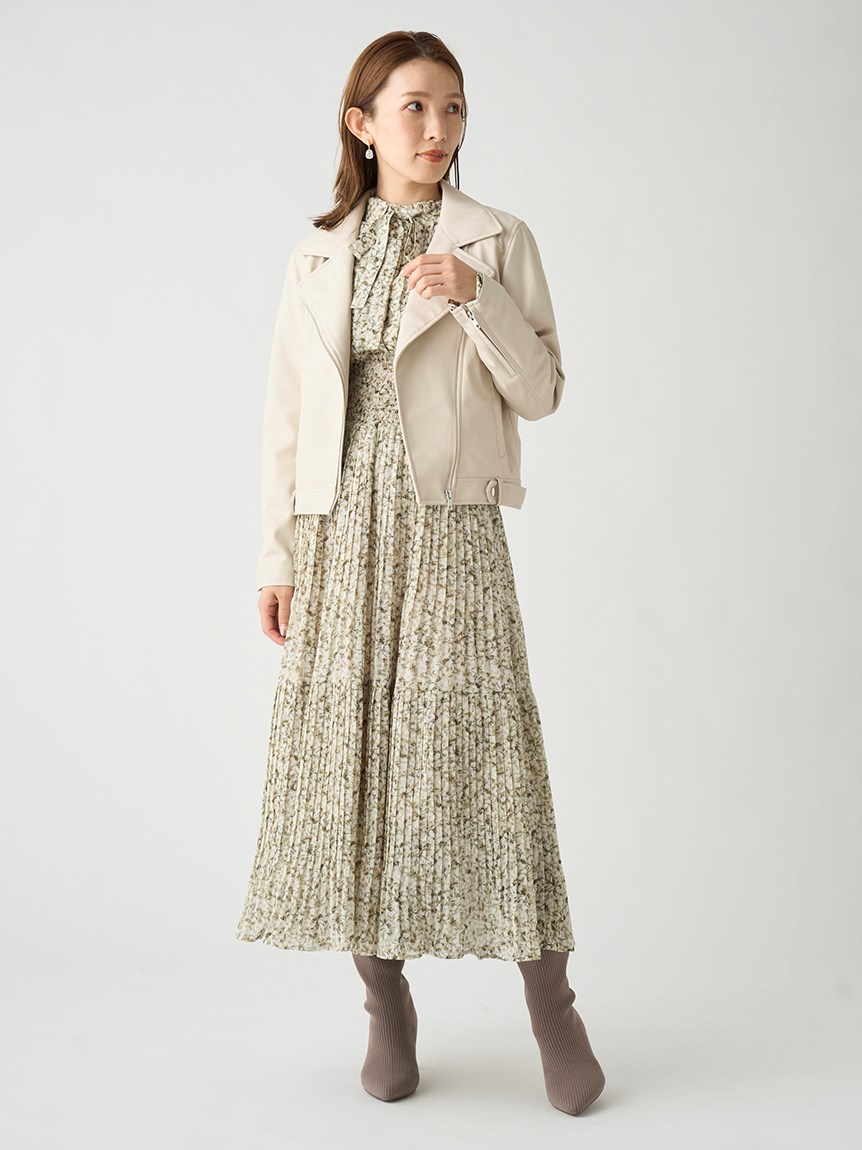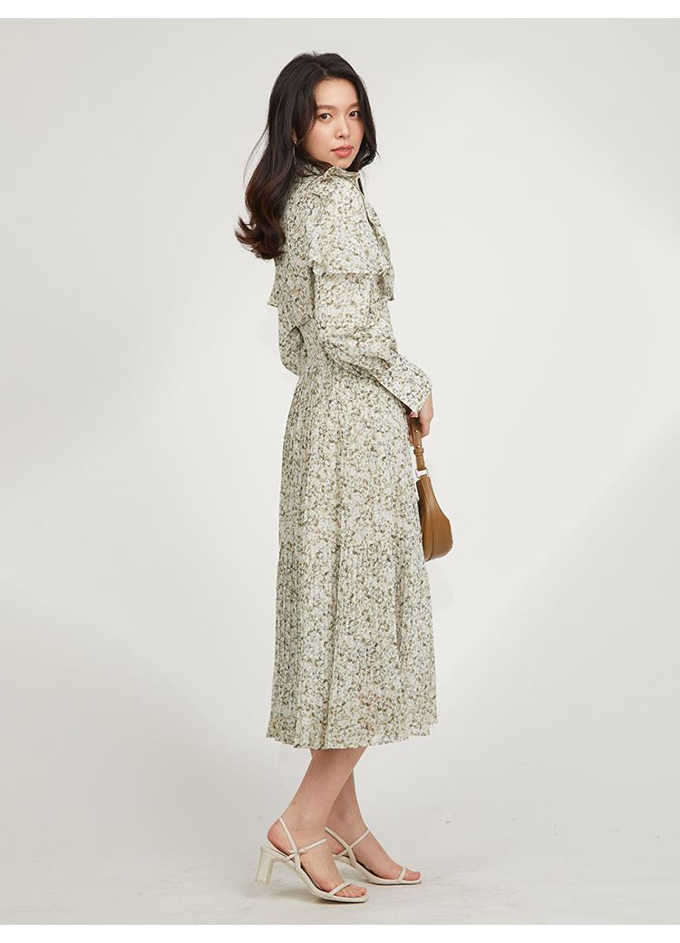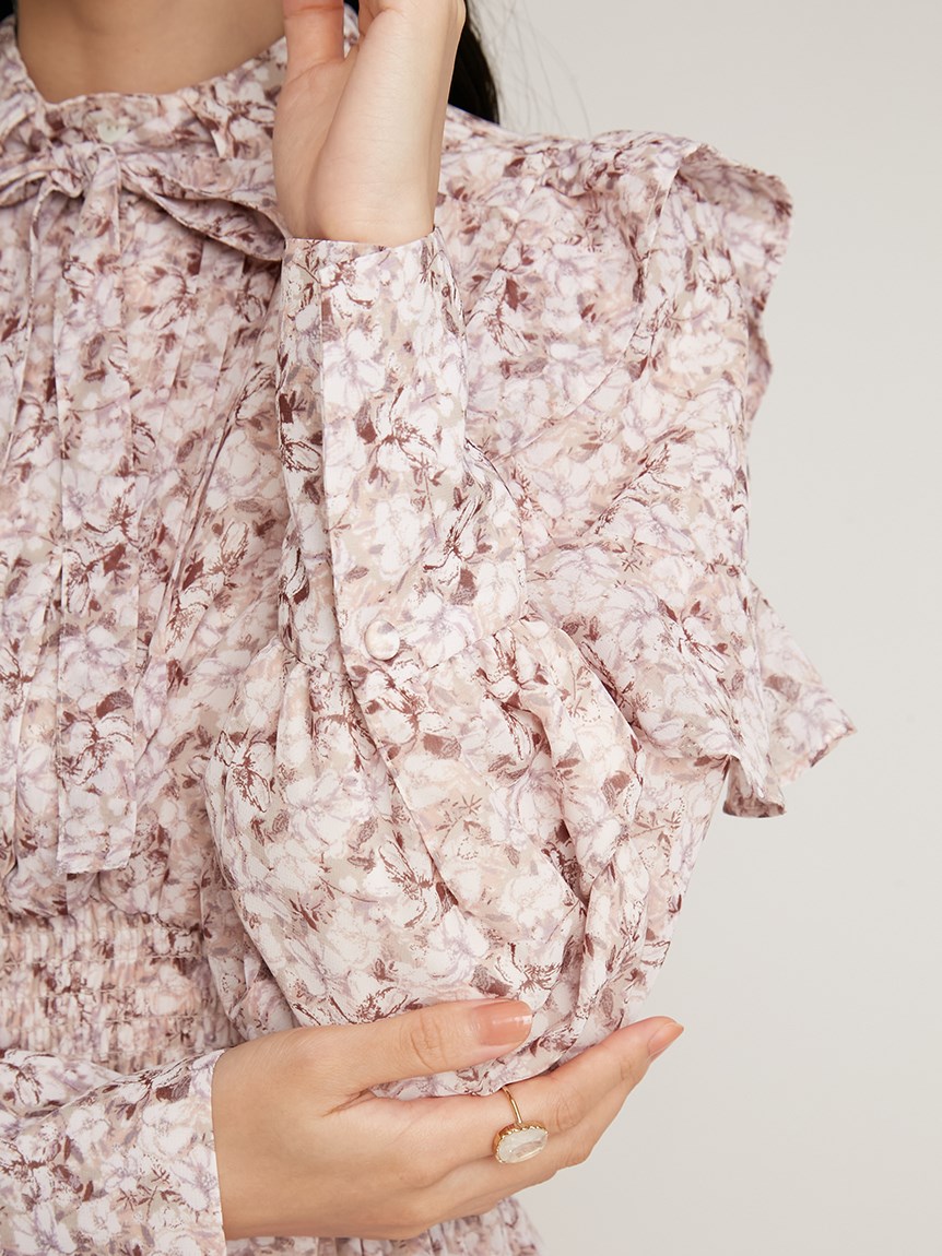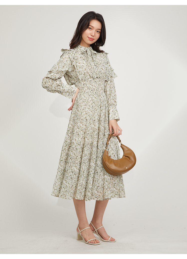一面に浮かべたオリジナルのフラワープリントが印象的な、春らしいムードを感じさせるスワンピース。細やかなプリーツをふんだんに施したフレアラインが歩くたびになびき、女性らしく軽やかな表情を演出しています。トップ部分にはフリルやリボンをあしらい、どこまでも女性らしい仕上がりに。袖も裏地付きなので長袖インナーとの併用ができ、まだ寒い時期から着られるので、ロングシーズン活躍してくれるアイテムです。